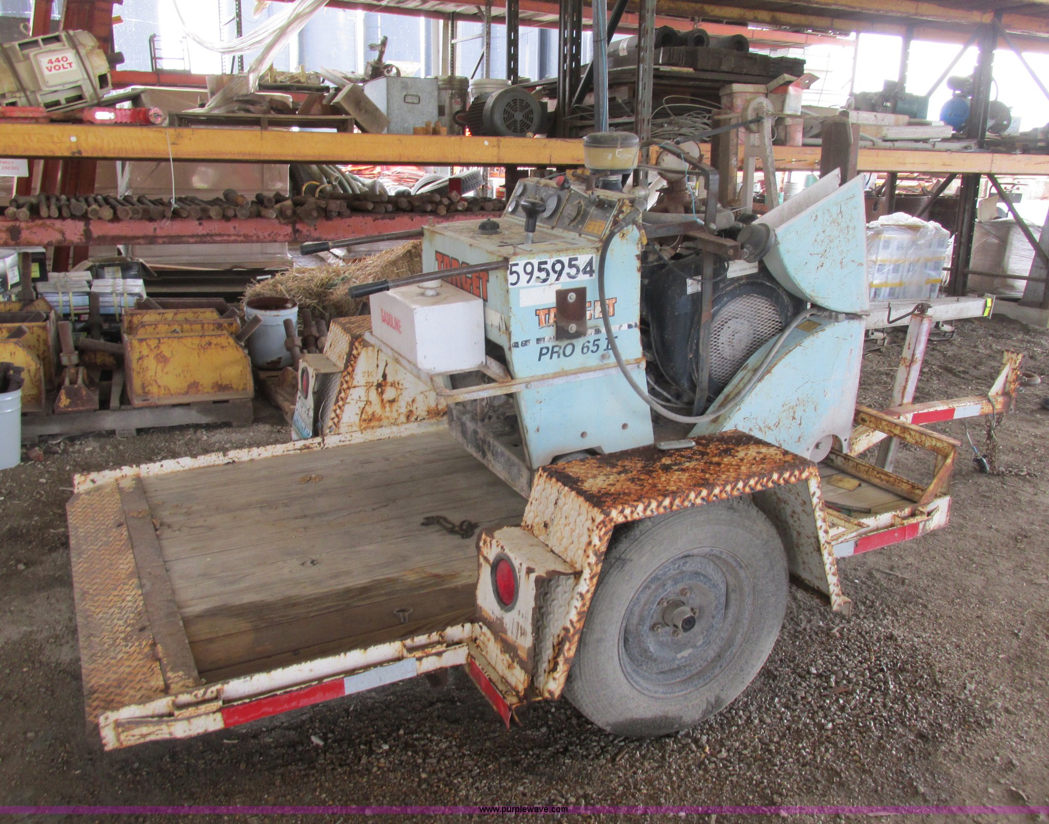 Purple Wave is selling a used Concrete Equip. or Acces. in Missouri. This item is a Target Pro 65II 36 concrete saw with the following: 499 hours on meter, Wisconsin four cylinder gas engine, Blades included, 1995 Midwest tilt deck trailer, 10'L x 5'W wood deck, Pintle hitch, P205/75R15 tires, Serial 219622