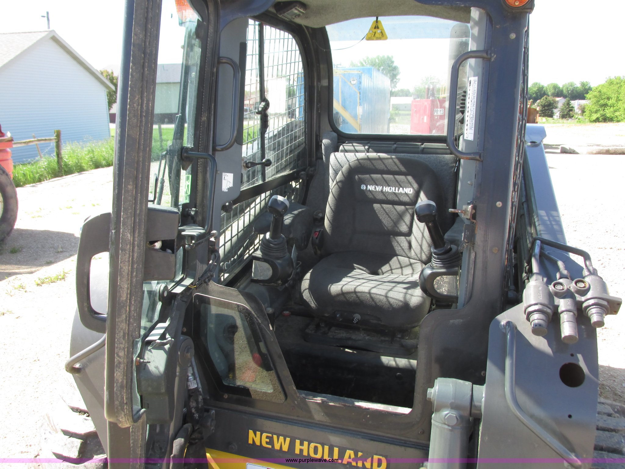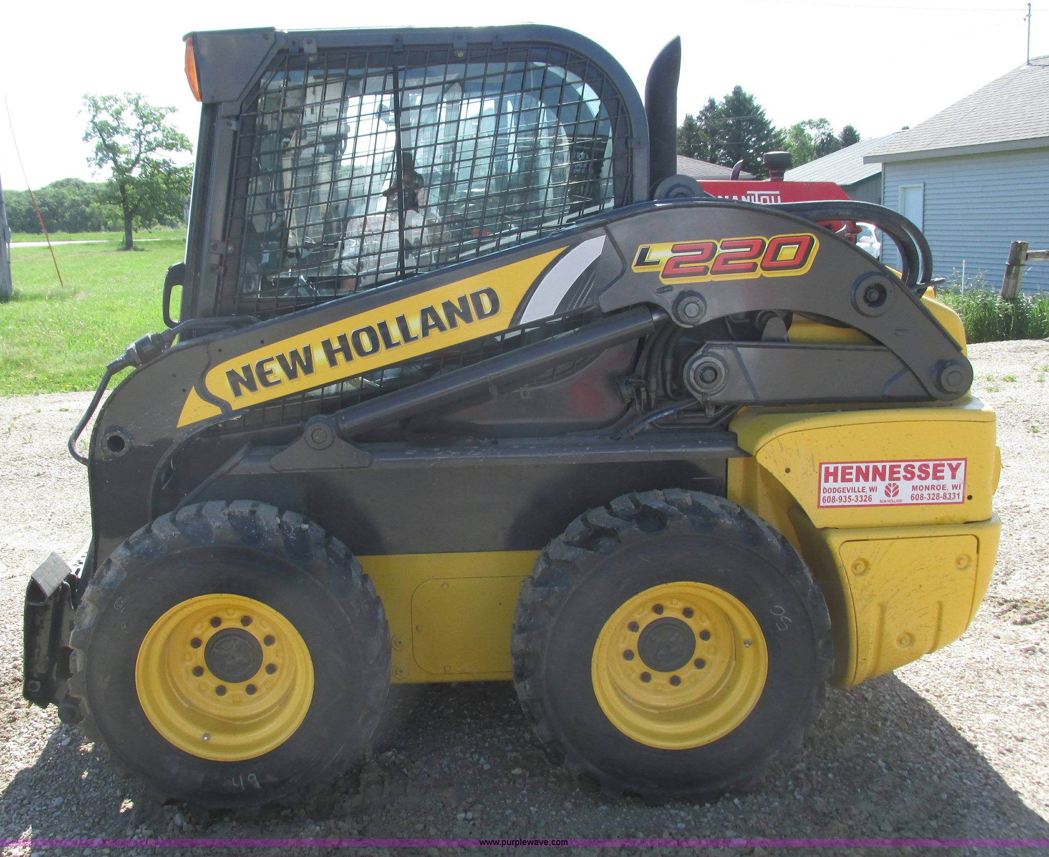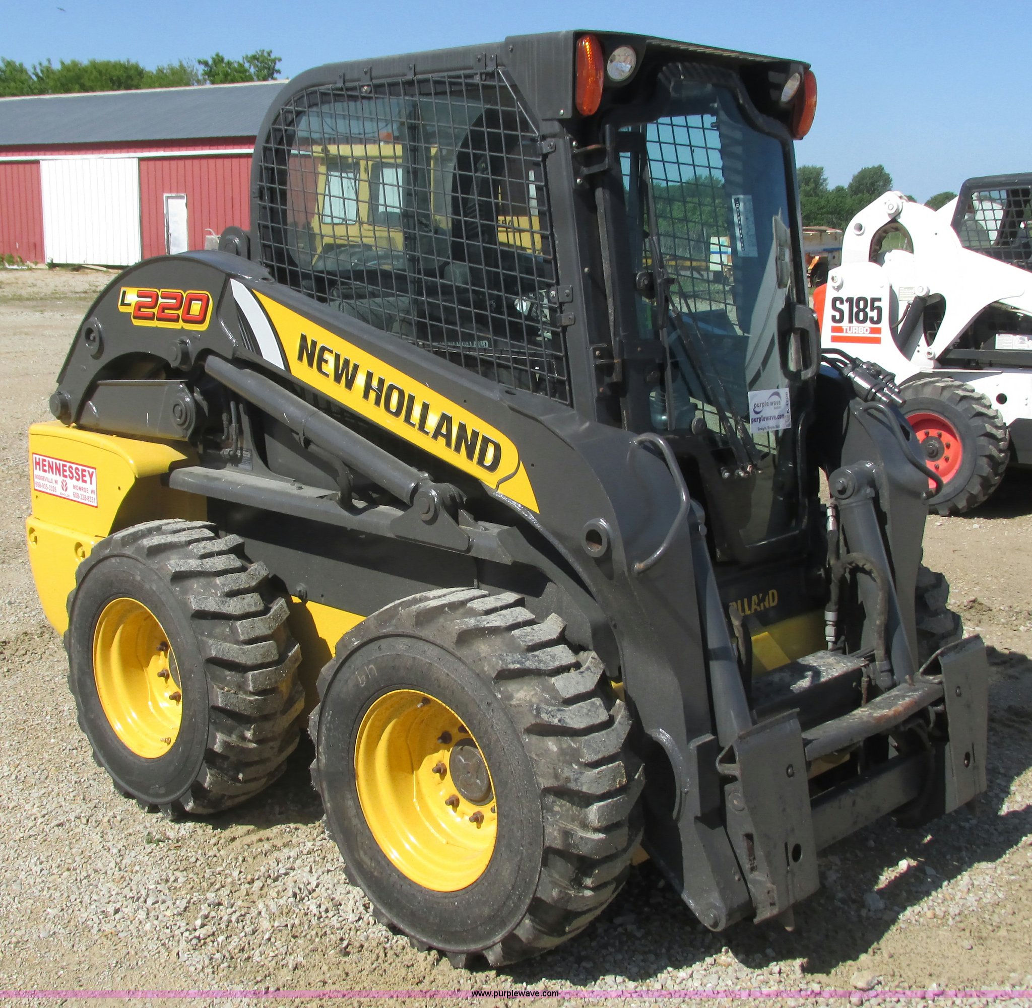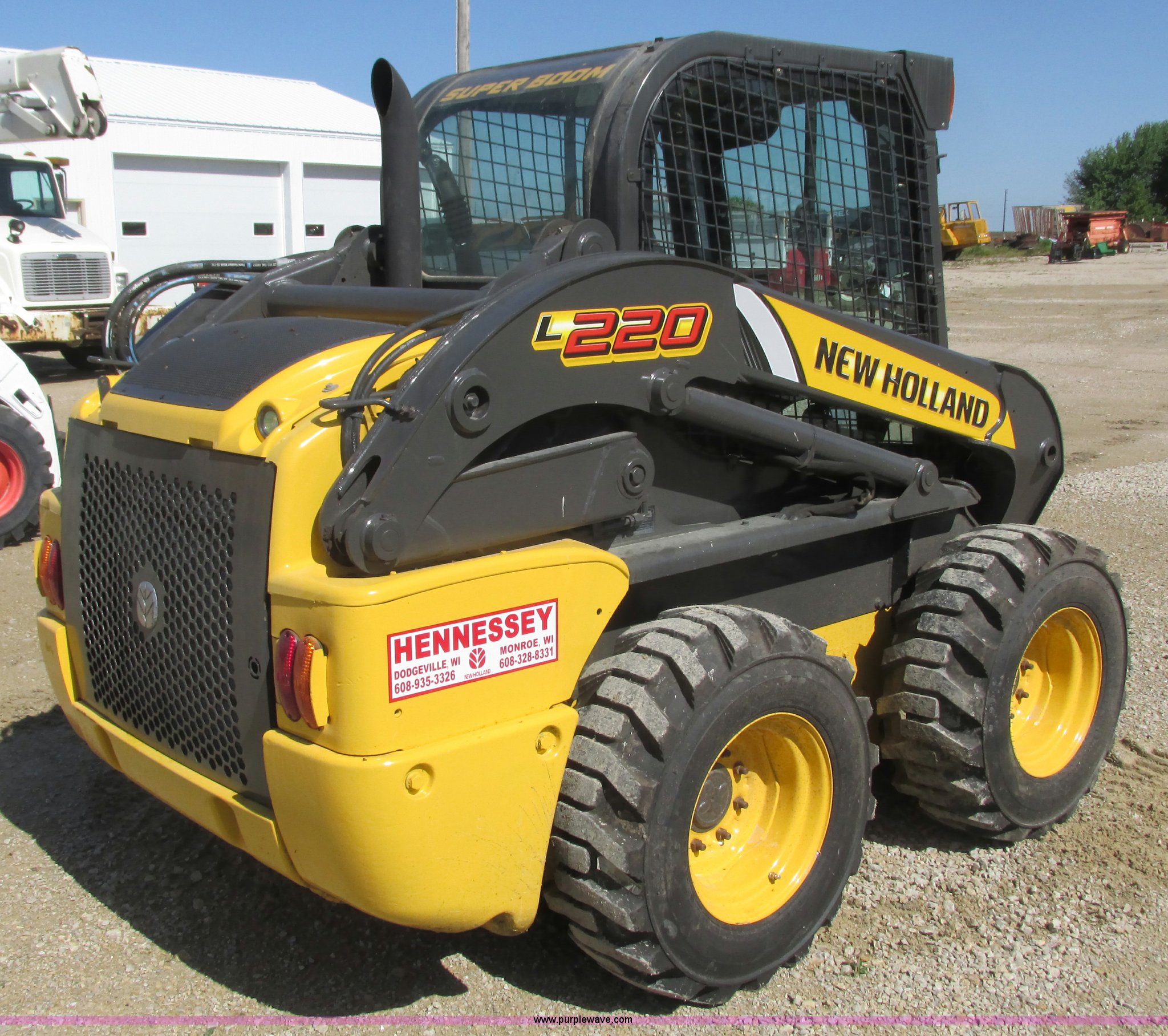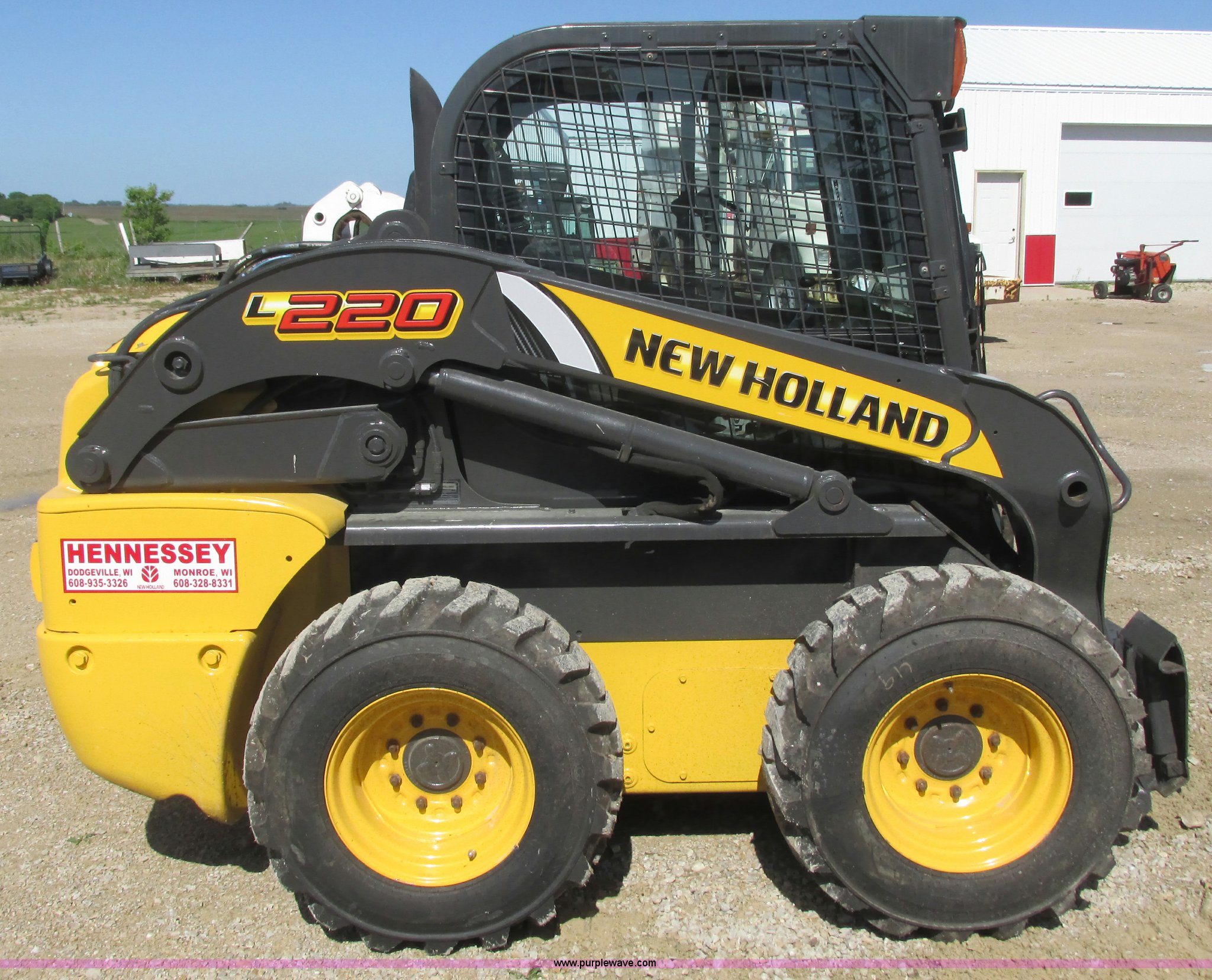 Purple Wave is selling a used Skid Steer Loader in Minnesota. This item is a 2013 New Holland L220 skid steer with the following: 4,686 hours on meter, Four cylinder diesel engine, Two speed hydrostatic transmission, Enclosed cab, AC and heat, AM/FM, Joystick controls, Pattern changer, Air suspension seat, Seat heater, Wipers, Front and rear work lights, Backup alarm, Auxiliary hydraulics, 12 x 16.5 tires, Serial JAF0LZZ0PDM775160