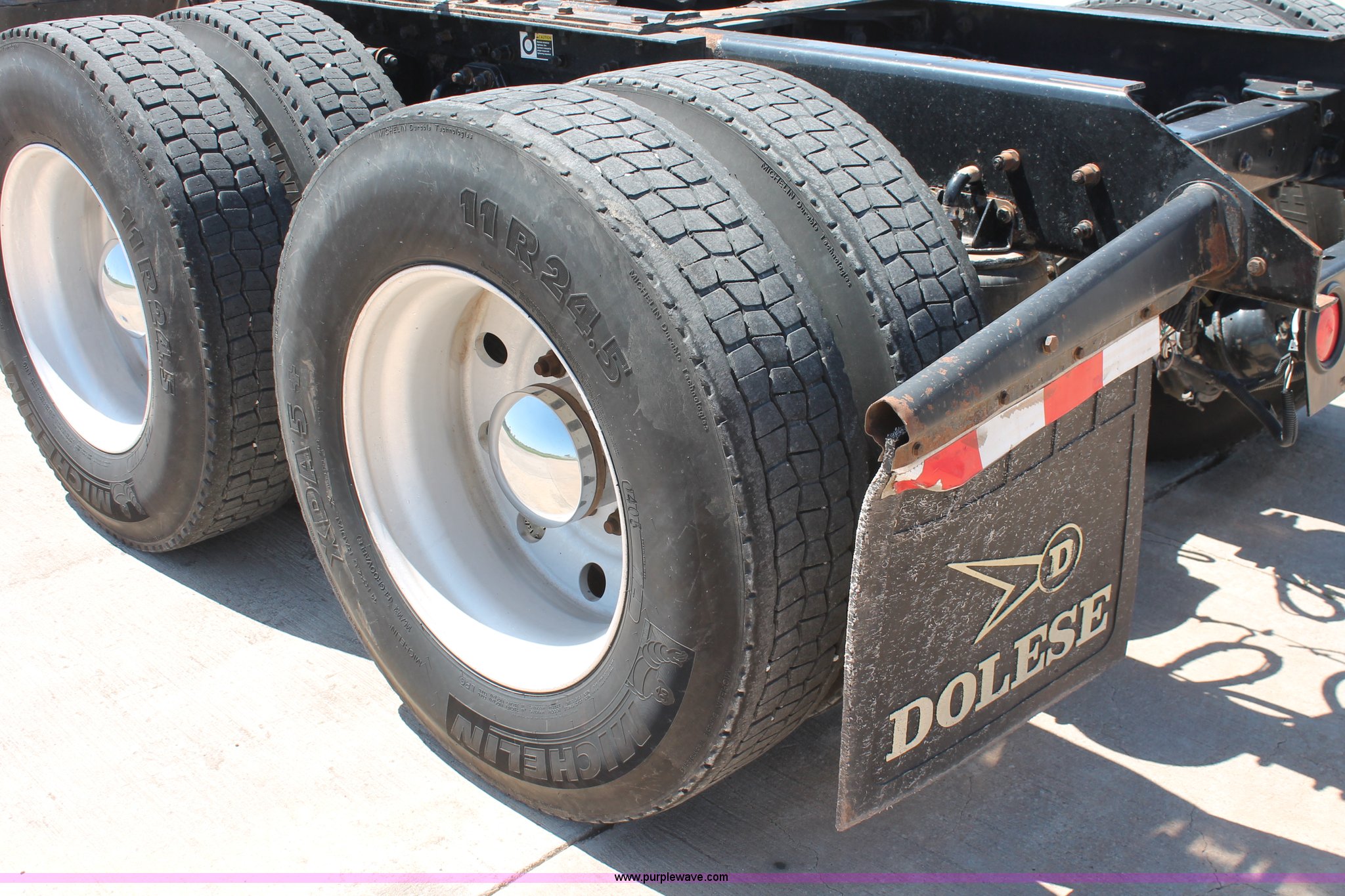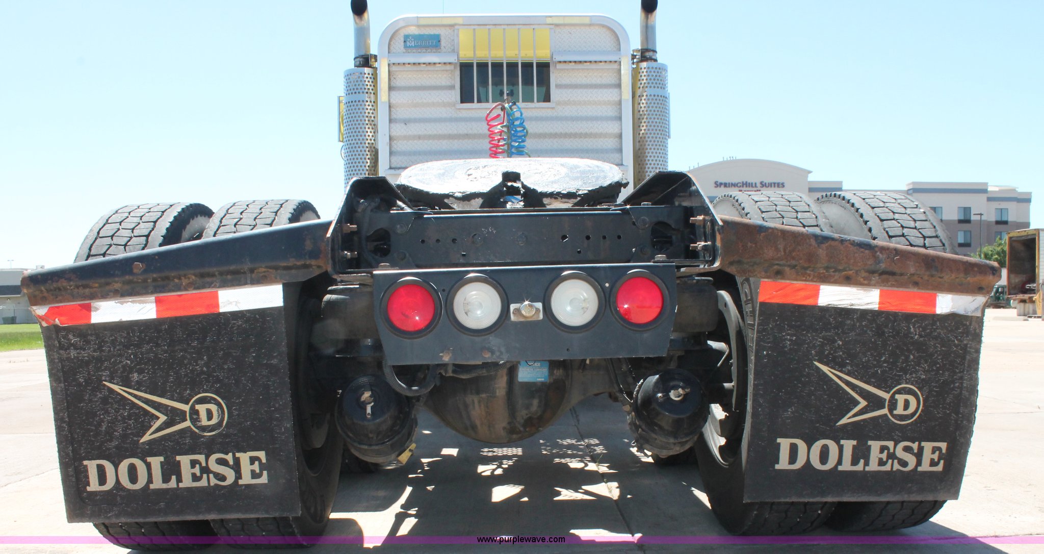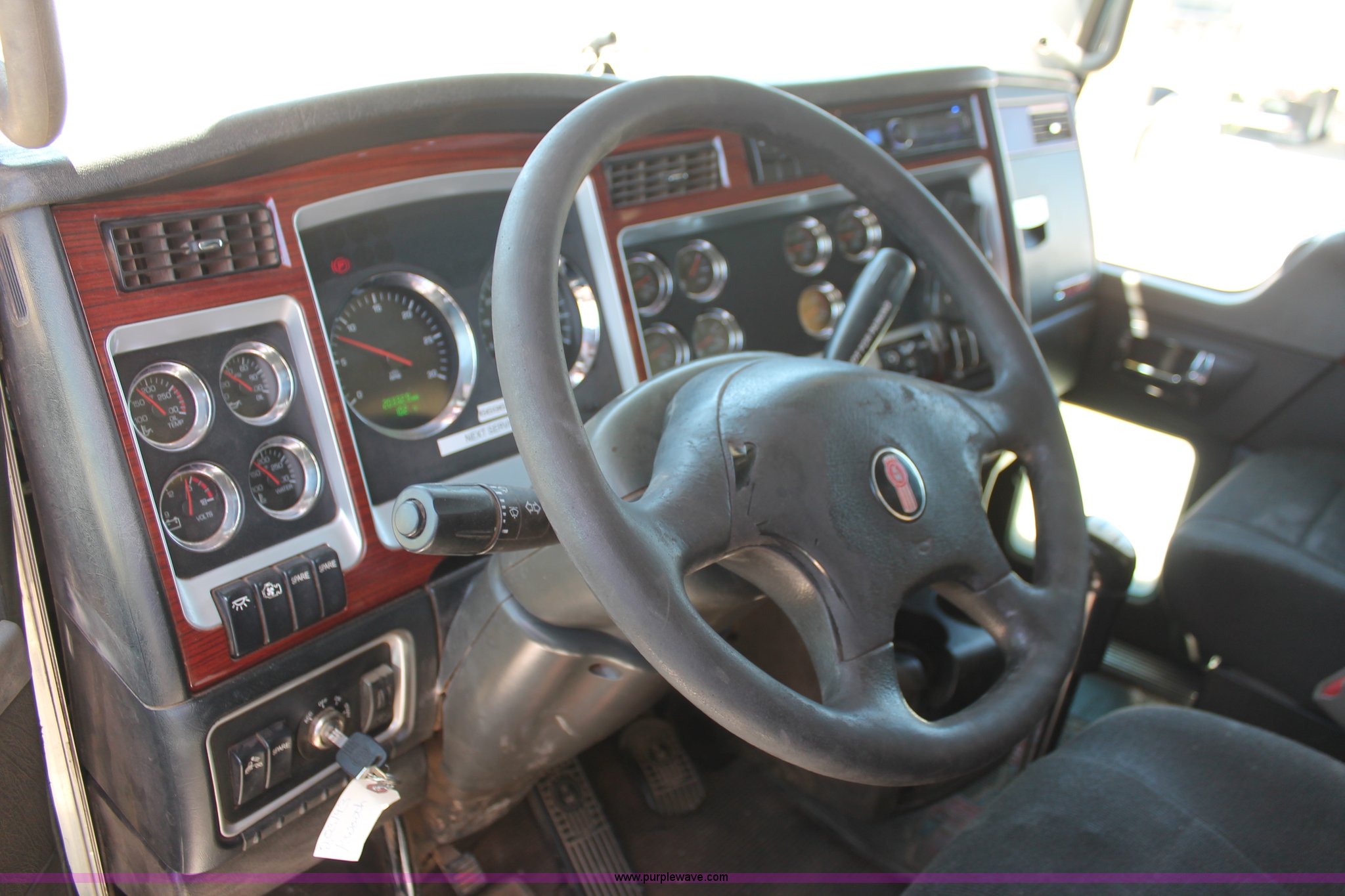 2007 Kenworth T800 semi truck. 572,940 miles on odometer, 20,333 hours on meter, Cummins ISX 450ST 15.0L six cylinder turbo diesel engine 450 HP, Serial 79196972, Eaton Fuller 10 speed manual transmission, Tandem axle, AC and heat, Tilt, Cruise, AM/FM/CD, Power and heated mirrors, Air ride cab, Spotlight, Block heater, Exterior visor, Aluminum headache rack Chain hanger, Storage, Aluminum deck plate, Air operated sliding fifth wheel plate, Dual rear exhaust stacks, Dual fuel tanks, Stainless steel quarter fenders, Mud flaps, Air suspension, Air brakes, 11R24.5 tires, GVWR 52,000 lbs, FAWR 12,000 lbs, IAWR 20,000 ls, RAWR 20,000 lbs, Unit# 203143. Oklahoma title. 2XKDD49X77M193729. Dolese Bros. Co.. 5600 W. Reno Avenue. Oklahoma City, OK 73127