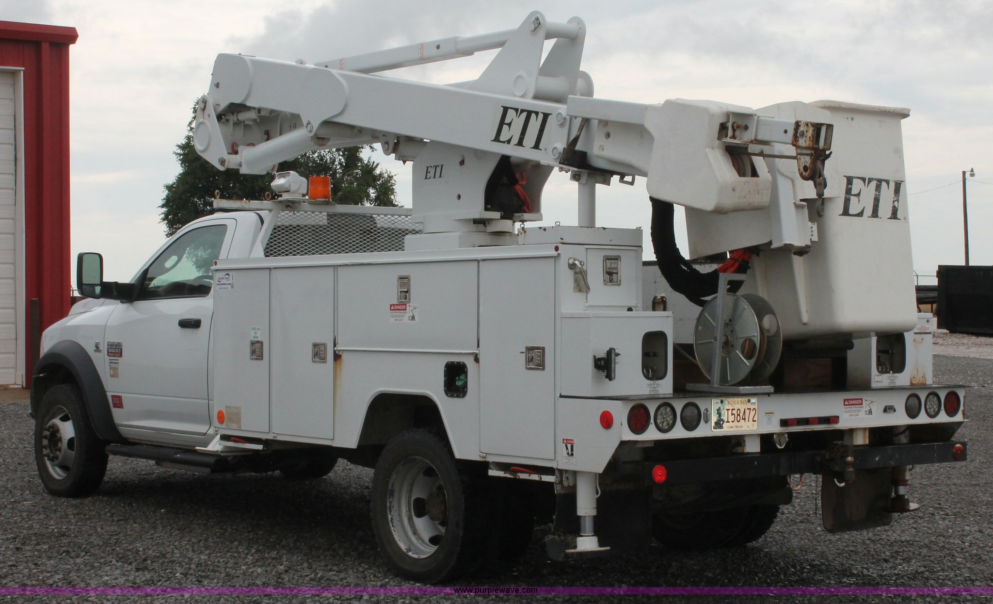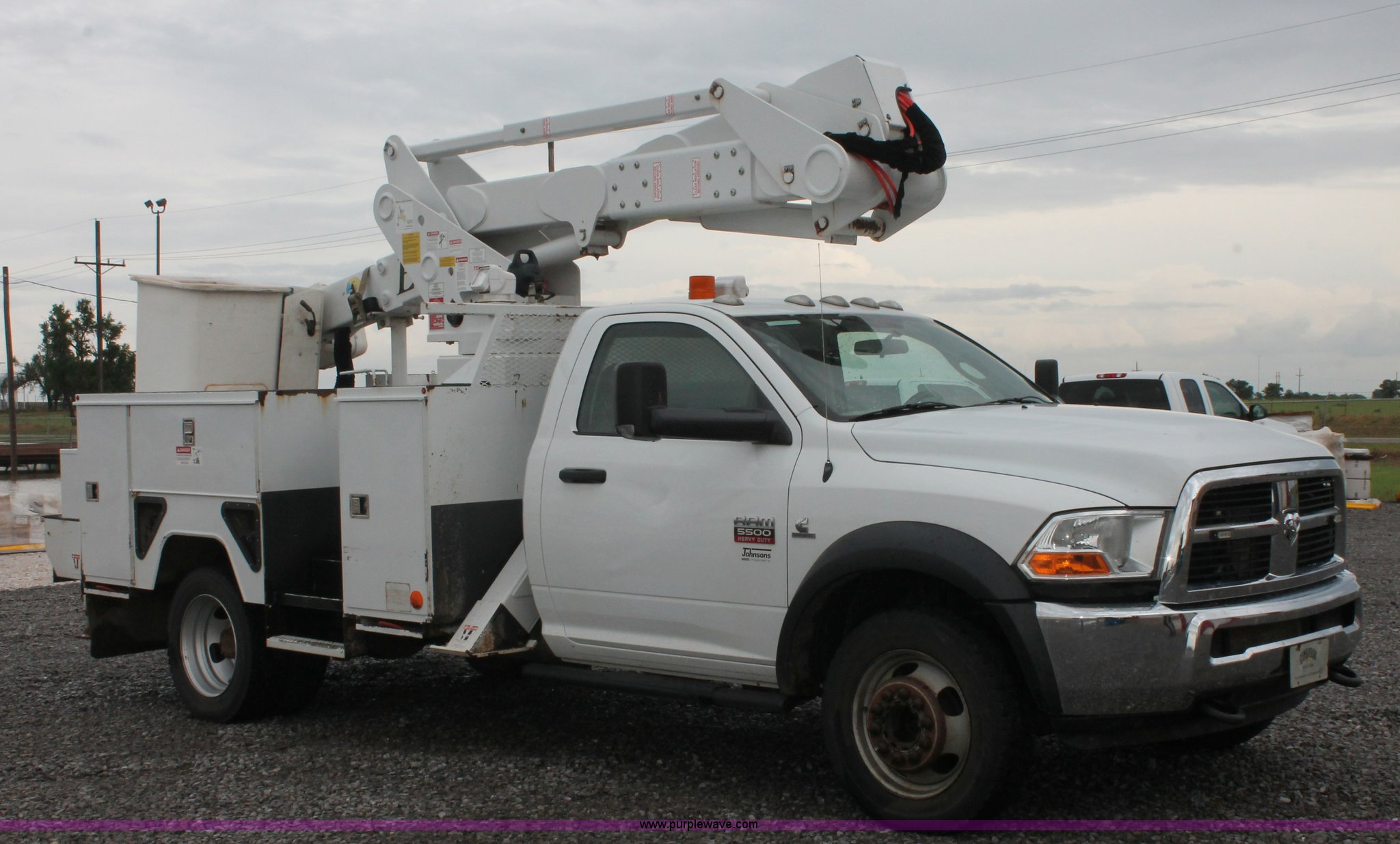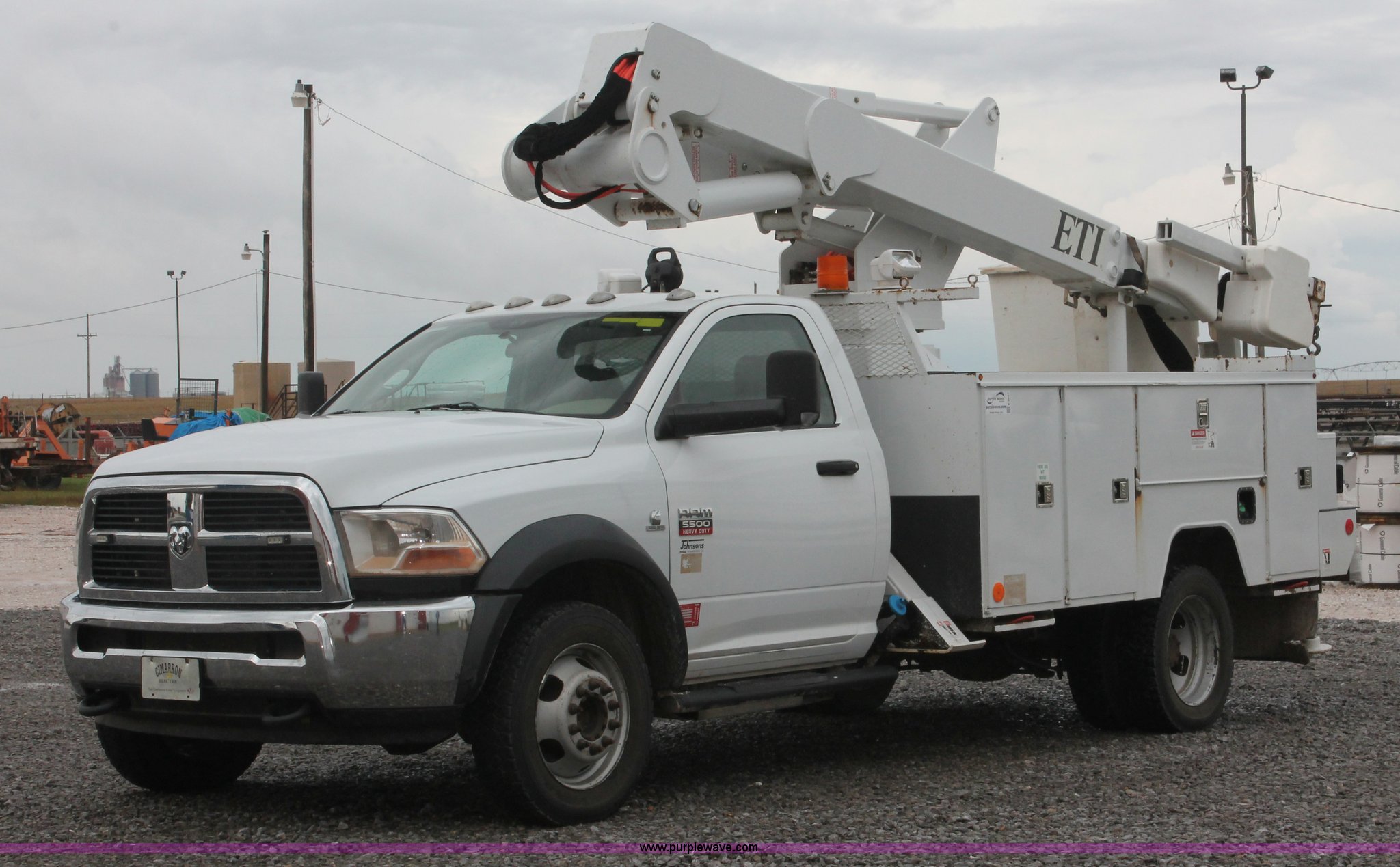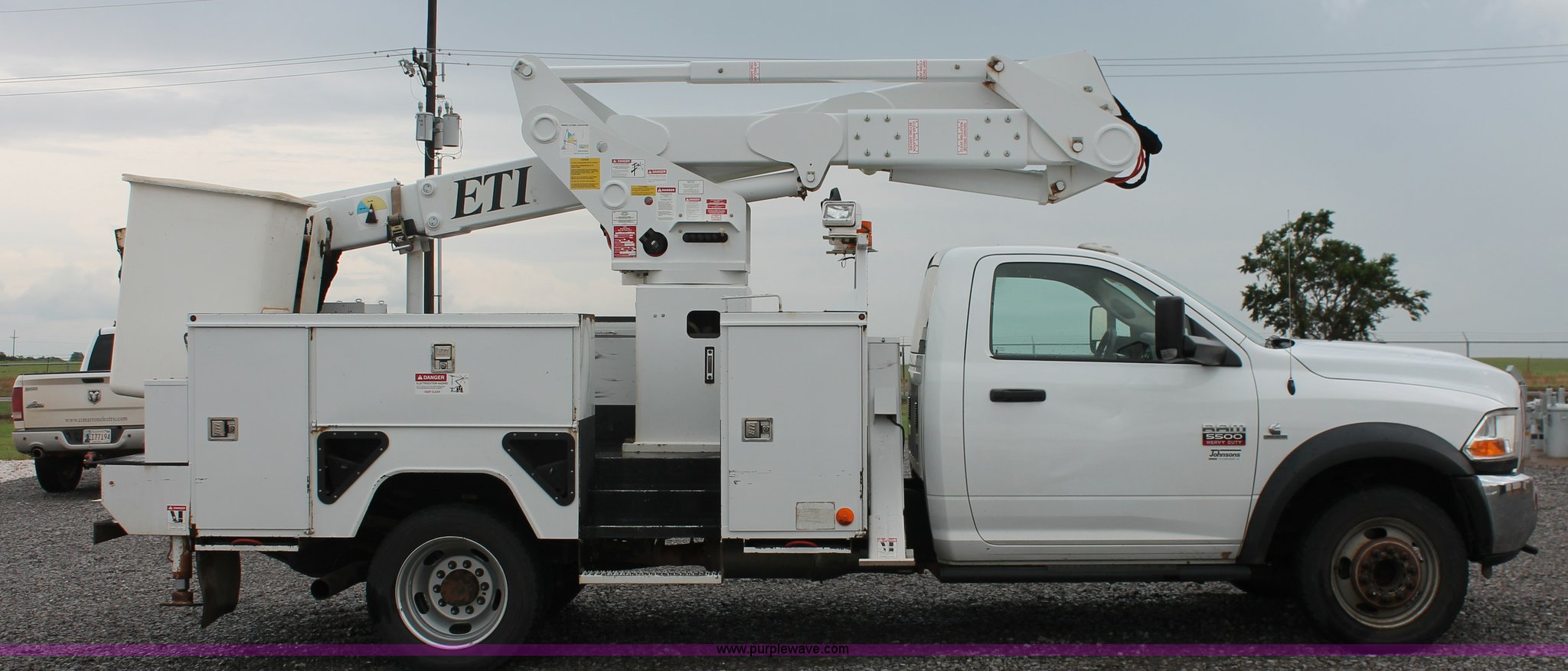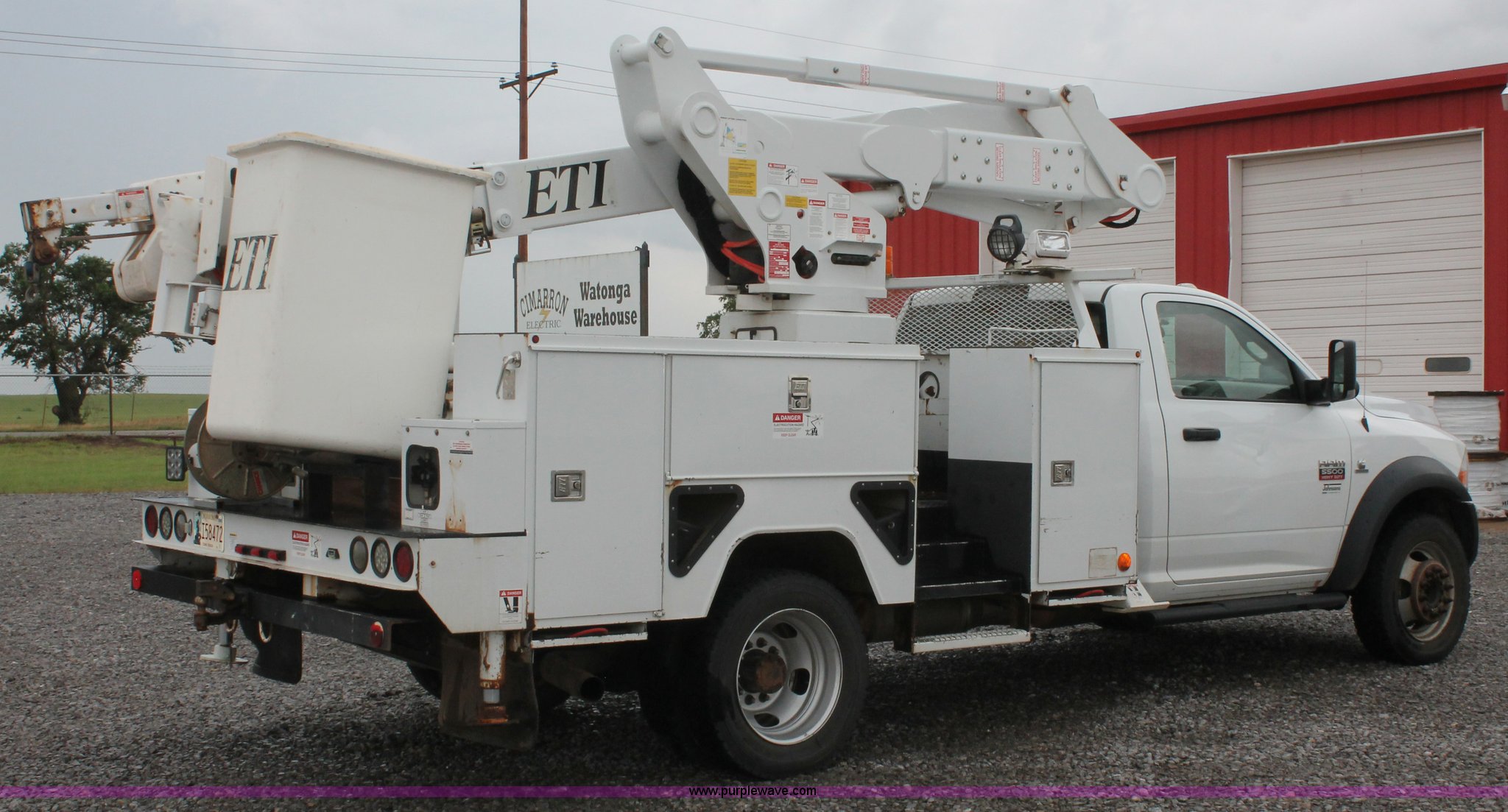 Purple Wave is selling a used Bucket Truck in Oklahoma. This item is a 2012 Dodge Ram 5500 HD bucket truck with the following: 134,656 miles on odometer, Cummins 6.7L L6 OHV 24V turbo diesel engine, Automatic transmission, Four wheel drive, AC and heat, Cruise, AM/FM/CD, Power mirrors, Auxiliary controls, Brake controller, Backup alarm, Front tow hooks, Beacon light, PTO, ETI service bed, 12'L, Shelving, Slide-out drawers, Work lights, 2012 ETI ETCMH37IH boom, 400 lbs max lift capacity, 42' max lift height, Ground and platform controls, Boom rotation, 1,000 lbs material handler, Remote control, Telescopic boom, (4) outriggers, Serial 0212CM79136, Single fuel tank, Receiver hitch, Trailer wiring, Spring suspension, Hydraulic brakes, 146" wheelbase, Goodyear 225/70R19.5 tires, Intermittent injector issues