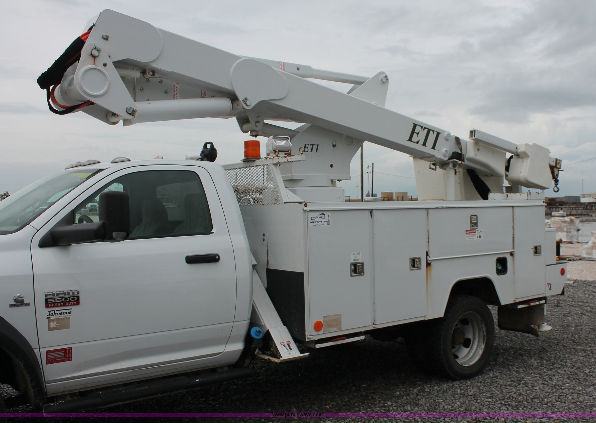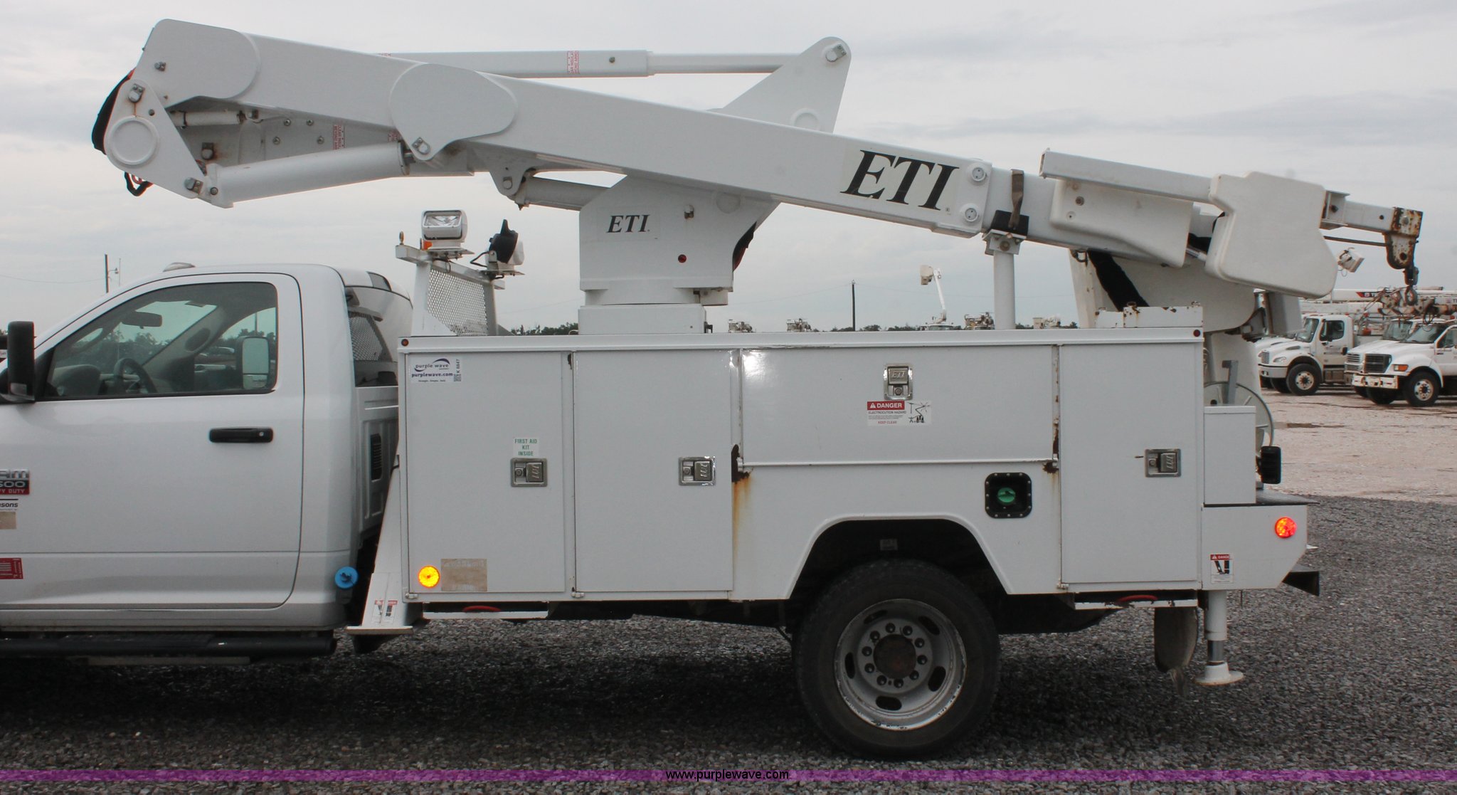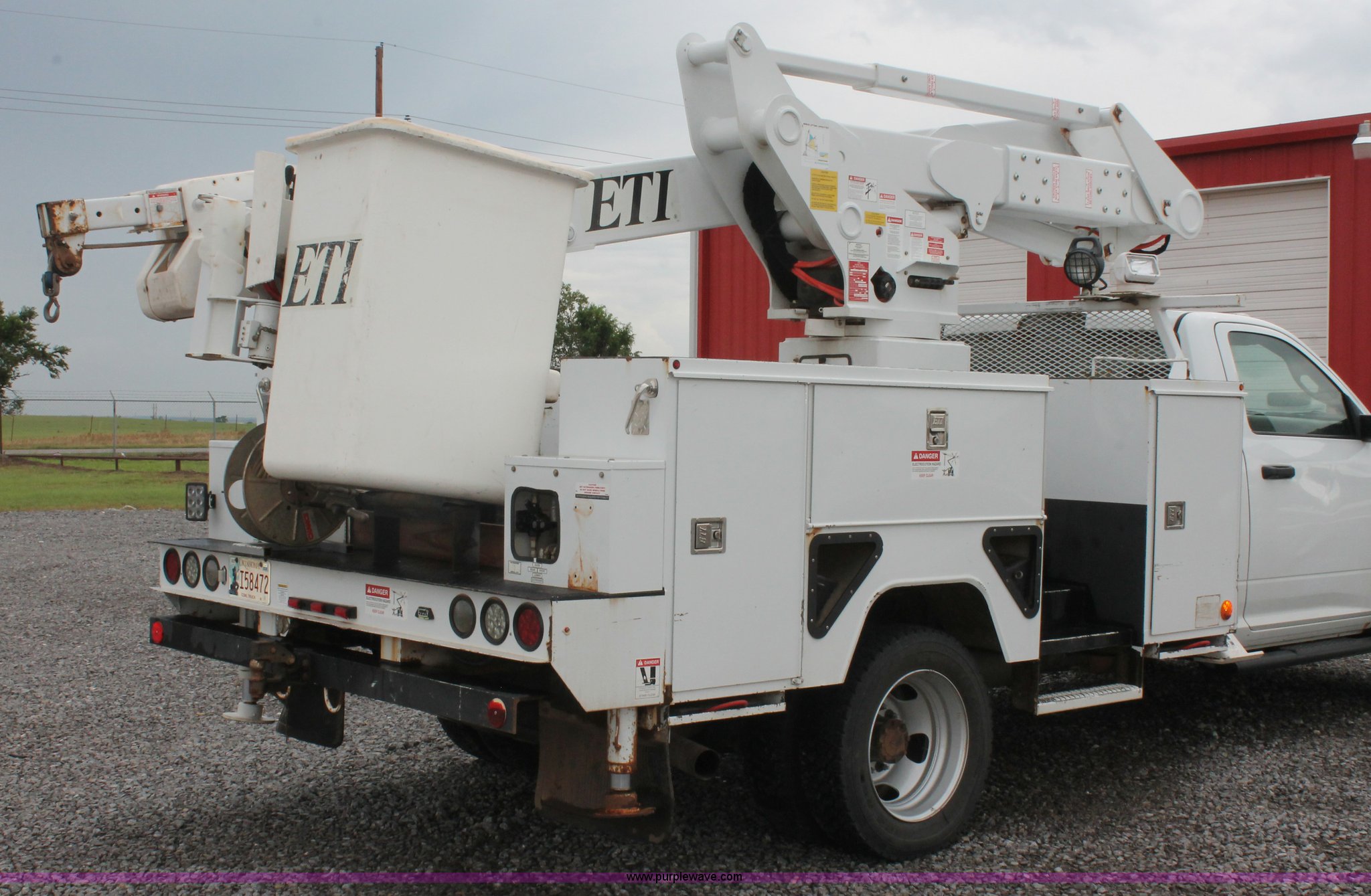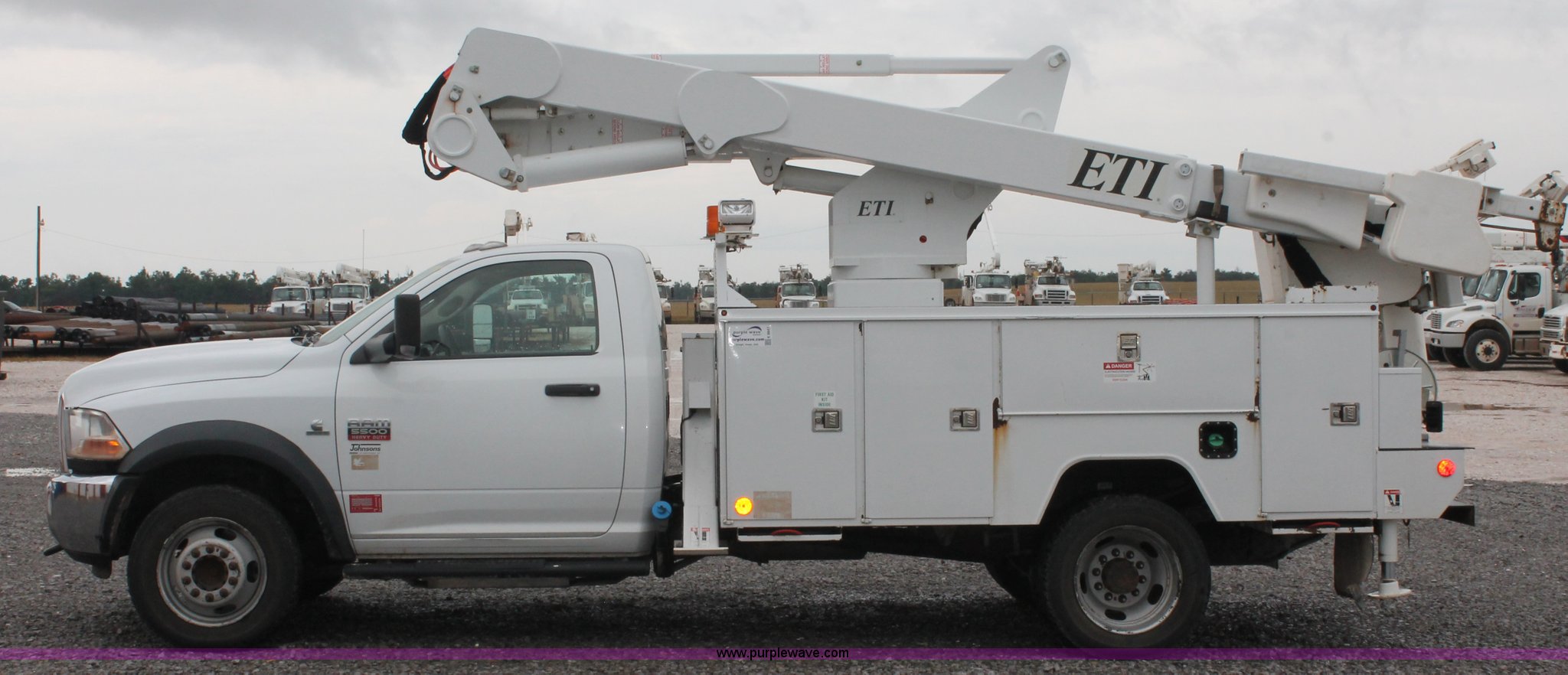 Purple Wave is selling a used Bucket Truck in Oklahoma. This item is a 2012 Dodge Ram 5500 HD bucket truck with the following: 134,656 miles on odometer, Cummins 6.7L L6 OHV 24V turbo diesel engine, Automatic transmission, Four wheel drive, AC and heat, Cruise, AM/FM/CD, Power mirrors, Auxiliary controls, Brake controller, Backup alarm, Front tow hooks, Beacon light, PTO, ETI service bed, 12'L, Shelving, Slide-out drawers, Work lights, 2012 ETI ETCMH37IH boom, 400 lbs max lift capacity, 42' max lift height, Ground and platform controls, Boom rotation, 1,000 lbs material handler, Remote control, Telescopic boom, (4) outriggers, Serial 0212CM79136, Single fuel tank, Receiver hitch, Trailer wiring, Spring suspension, Hydraulic brakes, 146" wheelbase, Goodyear 225/70R19.5 tires, Intermittent injector issues