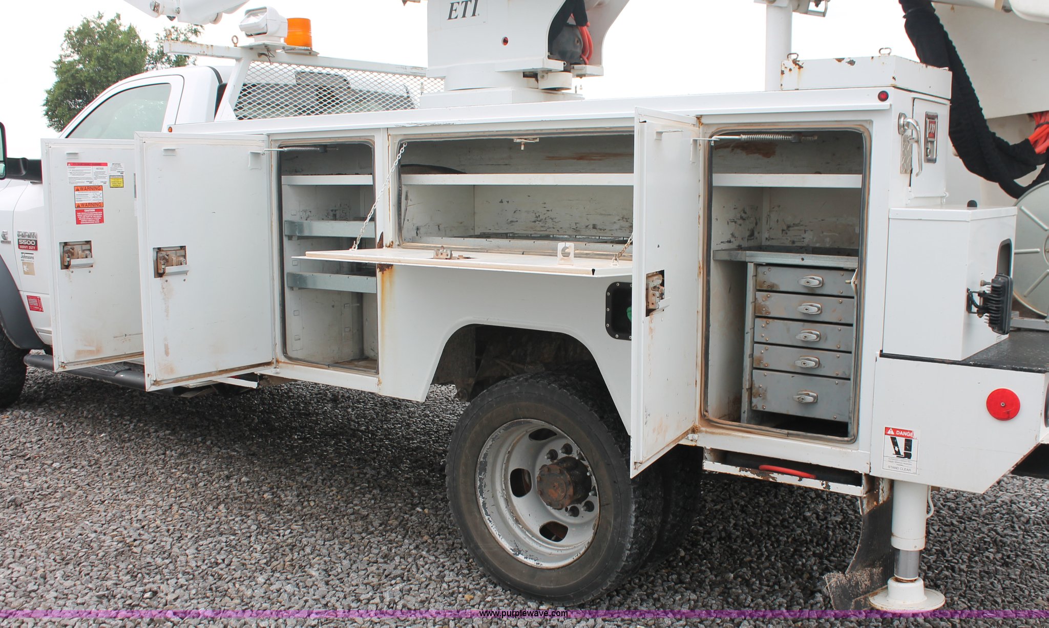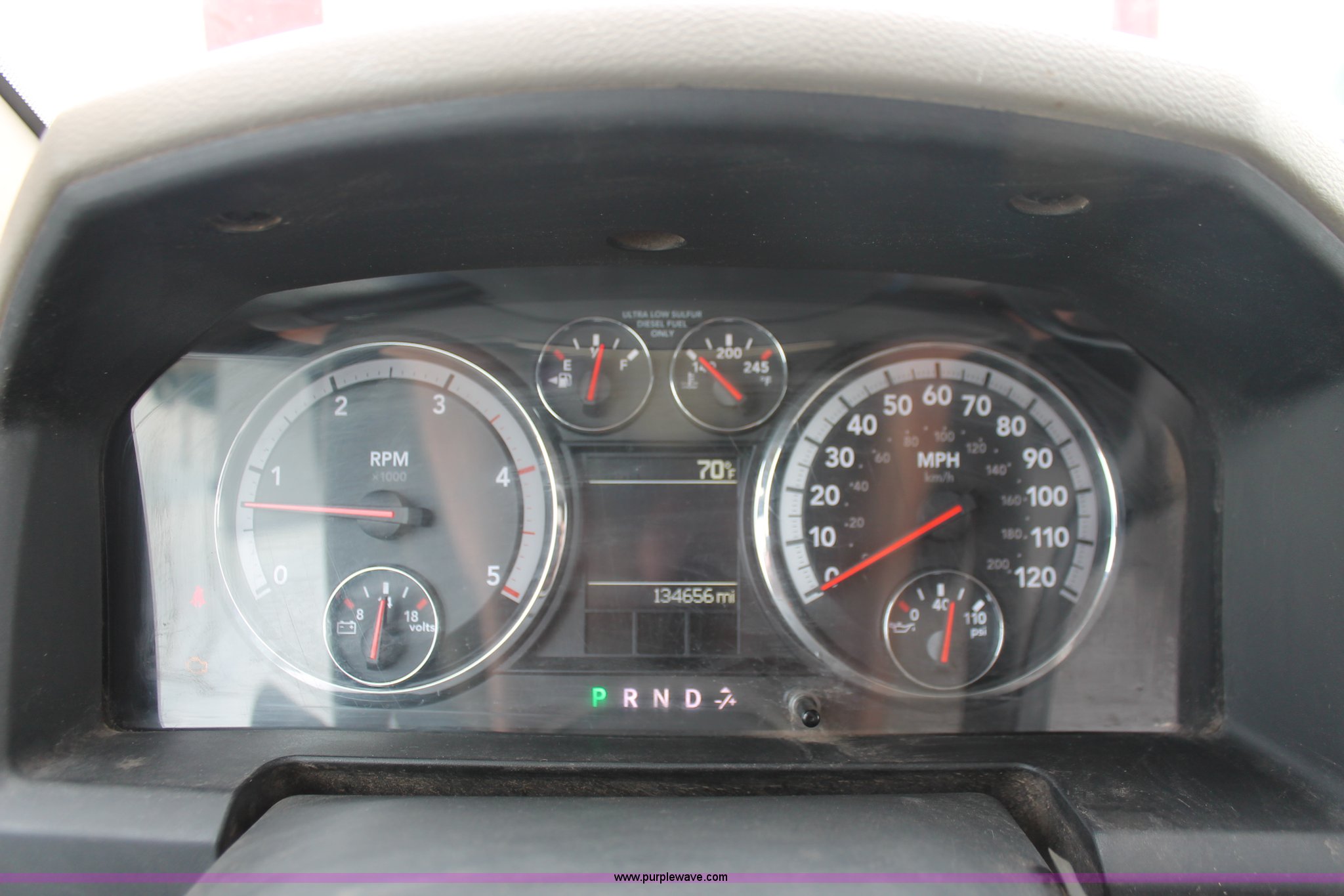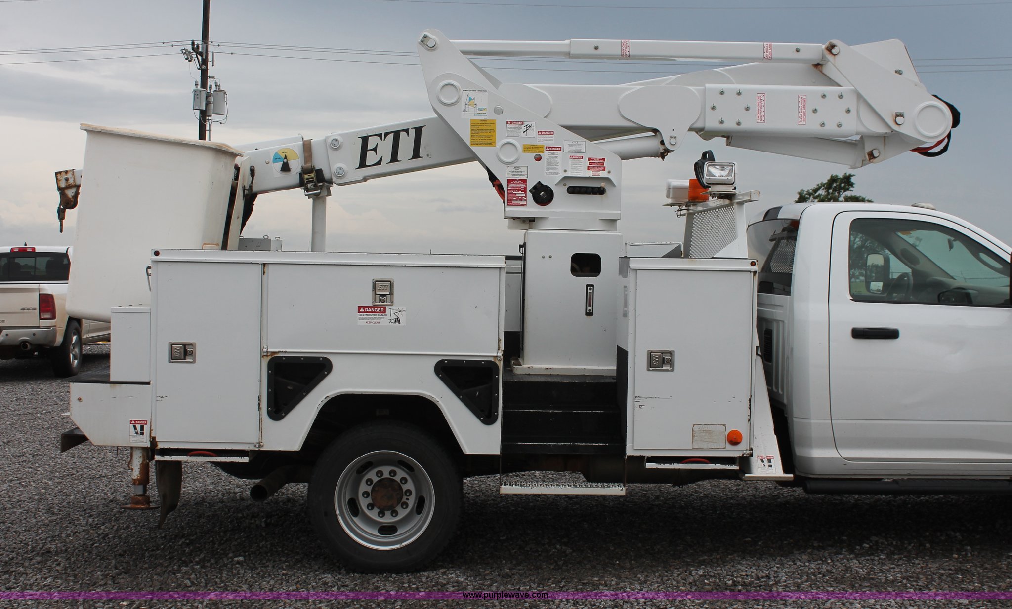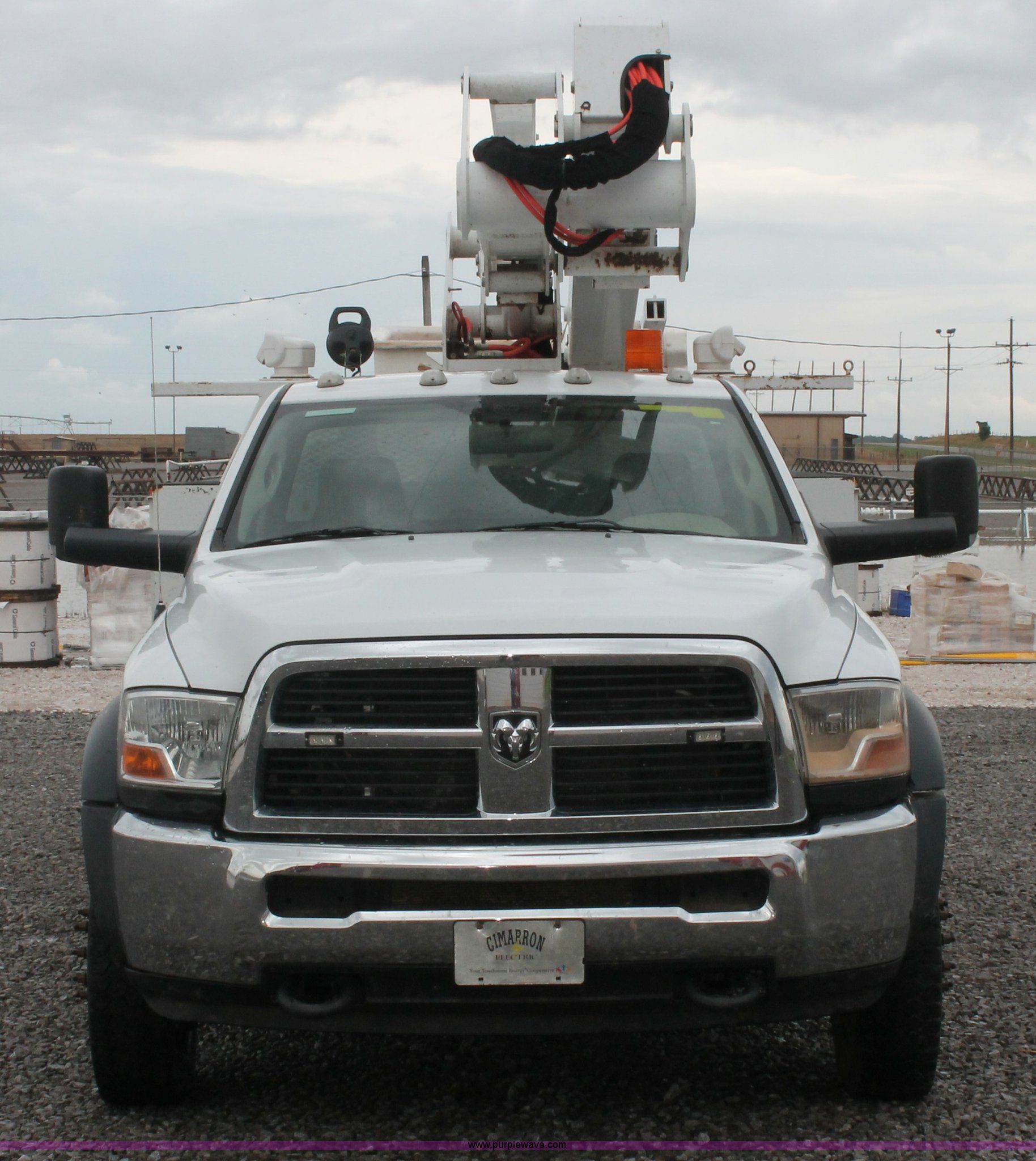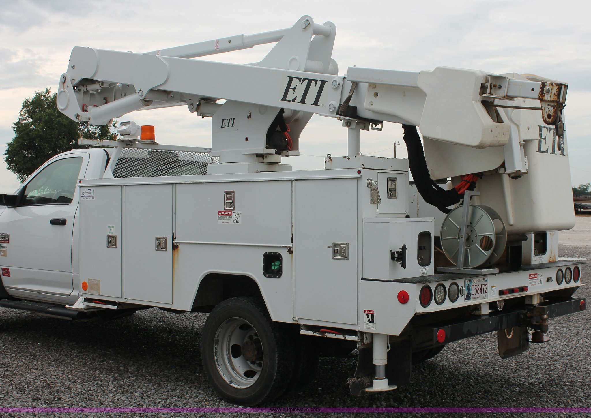 Purple Wave is selling a used Bucket Truck in Oklahoma. This item is a 2012 Dodge Ram 5500 HD bucket truck with the following: 134,656 miles on odometer, Cummins 6.7L L6 OHV 24V turbo diesel engine, Automatic transmission, Four wheel drive, AC and heat, Cruise, AM/FM/CD, Power mirrors, Auxiliary controls, Brake controller, Backup alarm, Front tow hooks, Beacon light, PTO, ETI service bed, 12'L, Shelving, Slide-out drawers, Work lights, 2012 ETI ETCMH37IH boom, 400 lbs max lift capacity, 42' max lift height, Ground and platform controls, Boom rotation, 1,000 lbs material handler, Remote control, Telescopic boom, (4) outriggers, Serial 0212CM79136, Single fuel tank, Receiver hitch, Trailer wiring, Spring suspension, Hydraulic brakes, 146" wheelbase, Goodyear 225/70R19.5 tires, Intermittent injector issues
