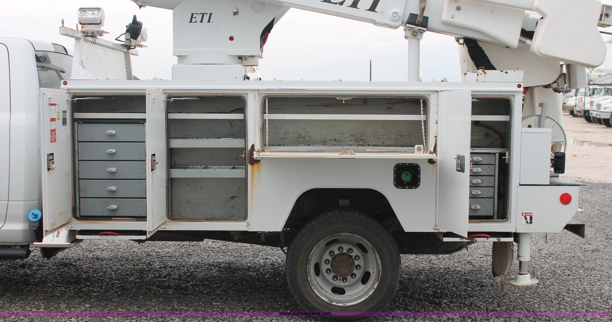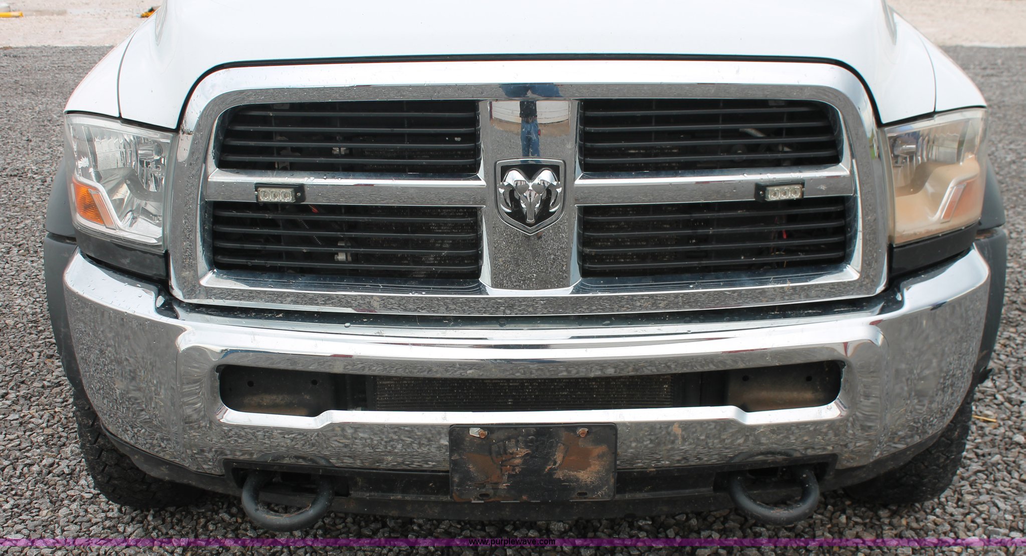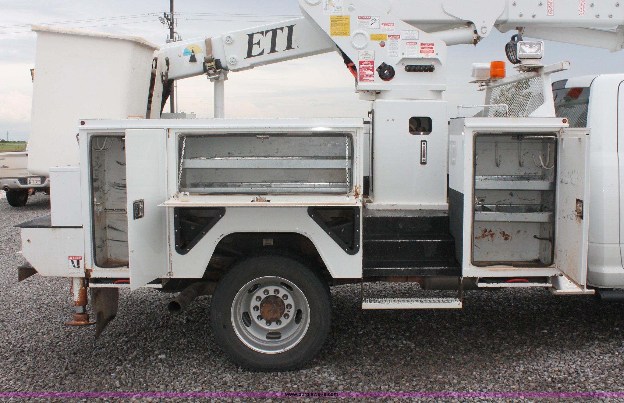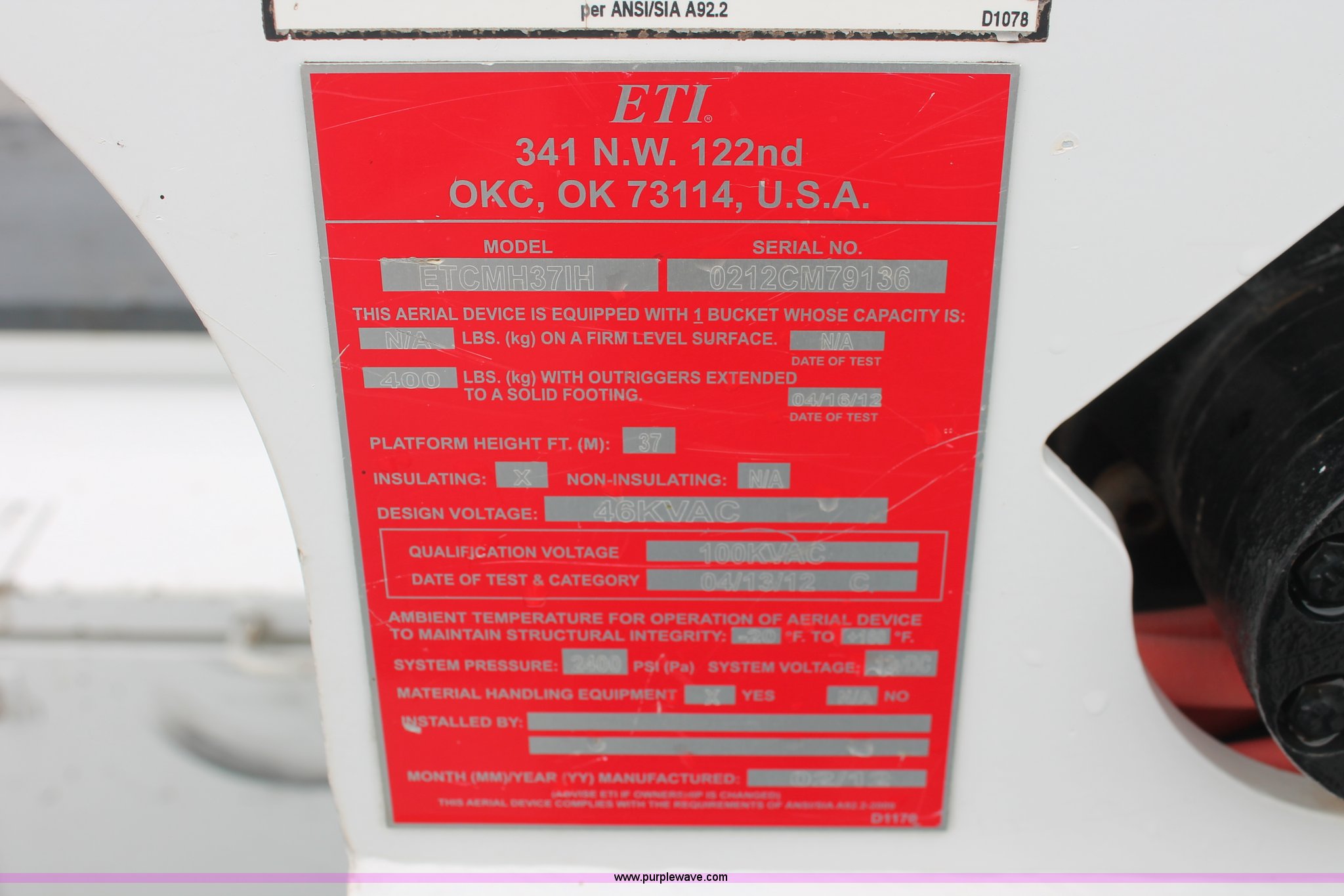 Purple Wave is selling a used Bucket Truck in Oklahoma. This item is a 2012 Dodge Ram 5500 HD bucket truck with the following: 134,656 miles on odometer, Cummins 6.7L L6 OHV 24V turbo diesel engine, Automatic transmission, Four wheel drive, AC and heat, Cruise, AM/FM/CD, Power mirrors, Auxiliary controls, Brake controller, Backup alarm, Front tow hooks, Beacon light, PTO, ETI service bed, 12'L, Shelving, Slide-out drawers, Work lights, 2012 ETI ETCMH37IH boom, 400 lbs max lift capacity, 42' max lift height, Ground and platform controls, Boom rotation, 1,000 lbs material handler, Remote control, Telescopic boom, (4) outriggers, Serial 0212CM79136, Single fuel tank, Receiver hitch, Trailer wiring, Spring suspension, Hydraulic brakes, 146" wheelbase, Goodyear 225/70R19.5 tires, Intermittent injector issues