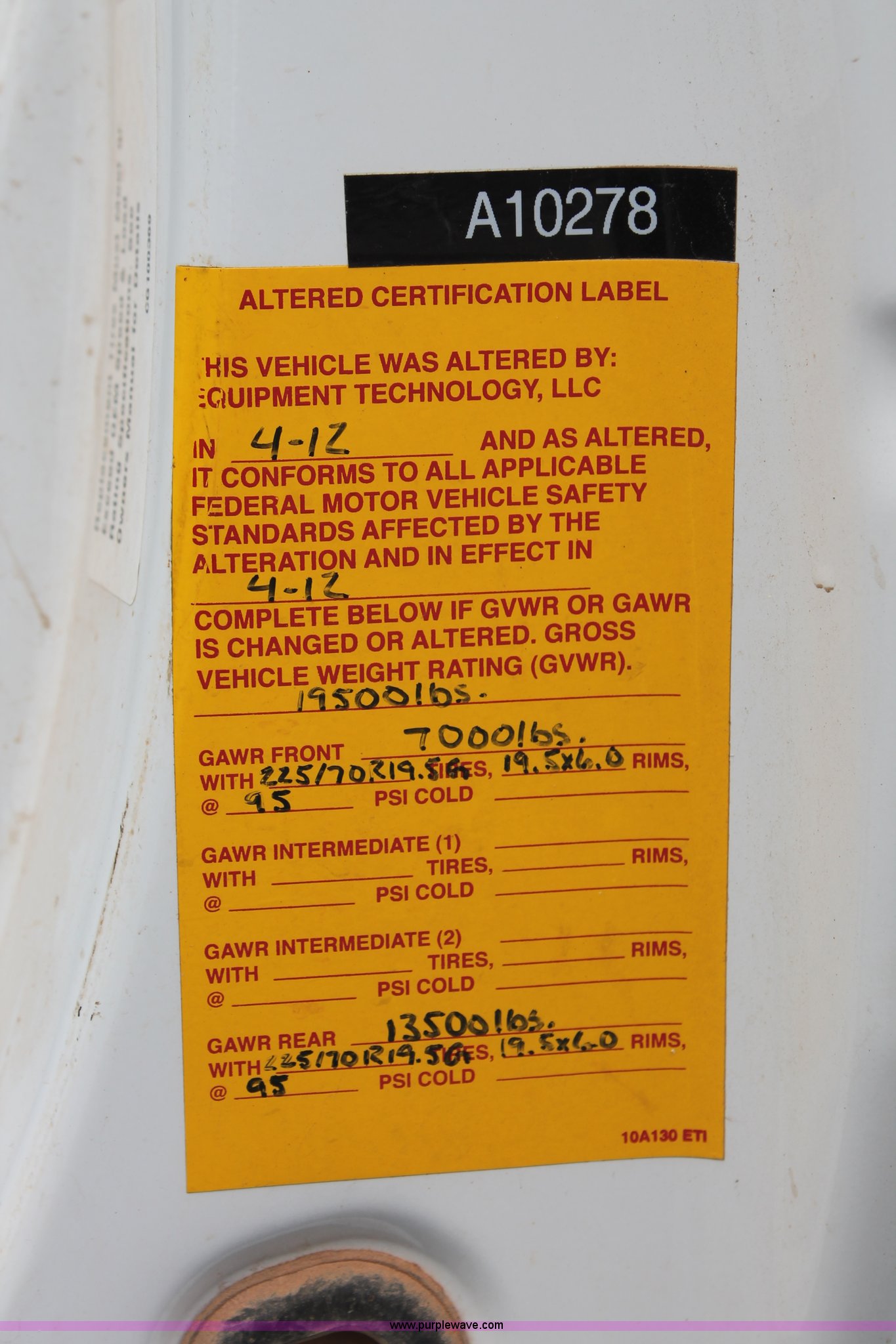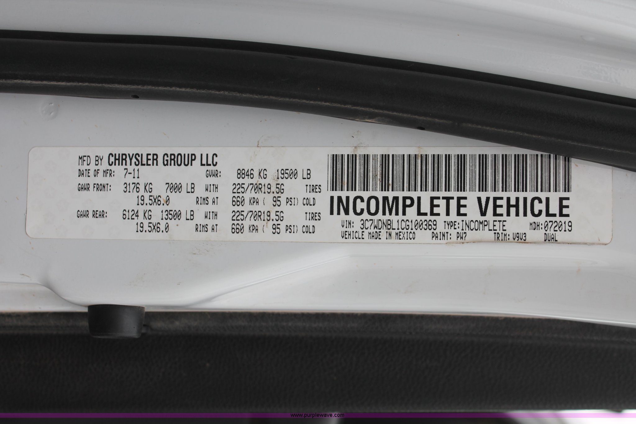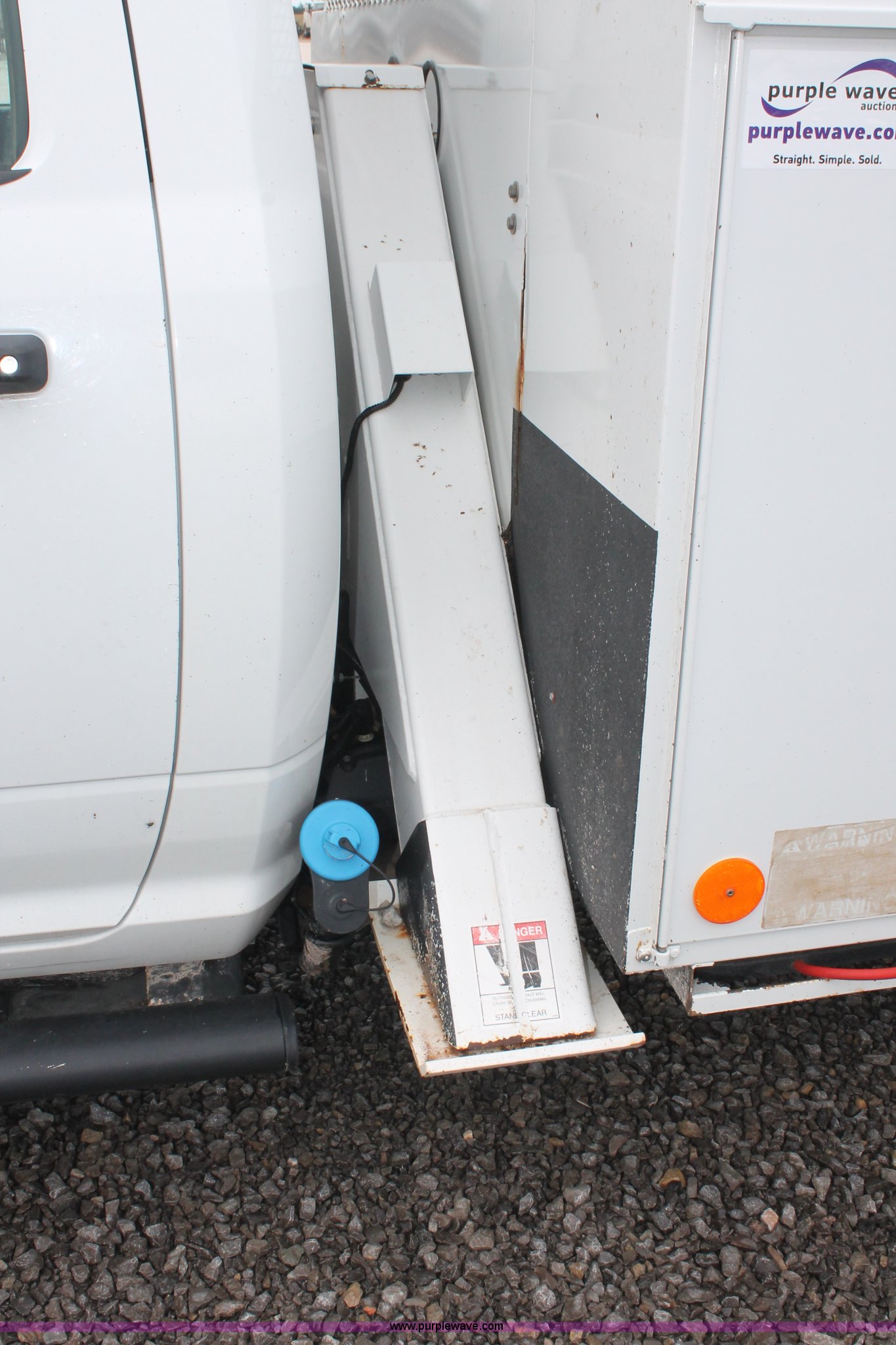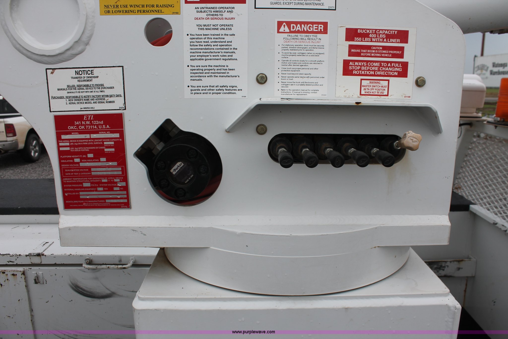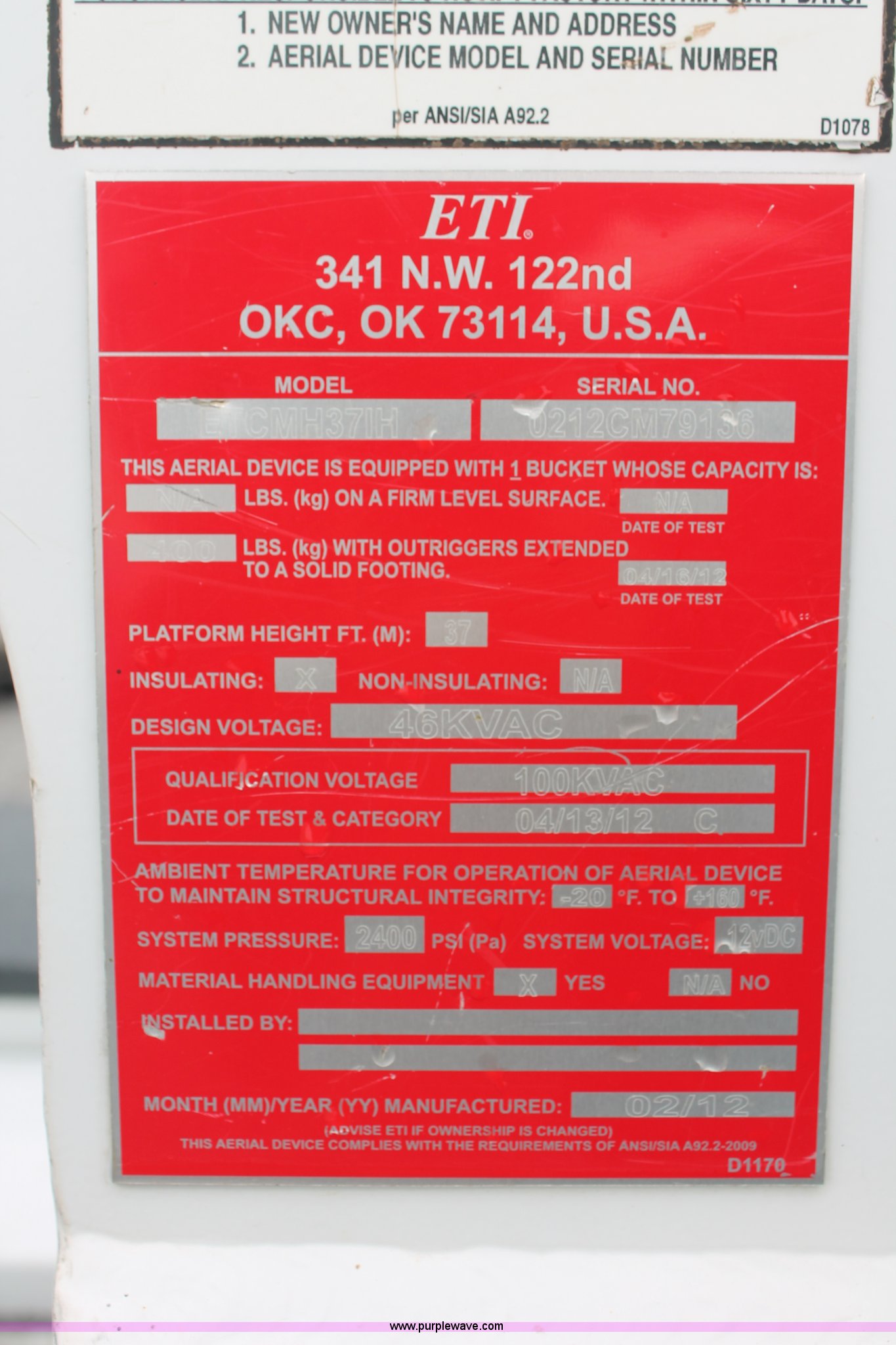 Purple Wave is selling a used Bucket Truck in Oklahoma. This item is a 2012 Dodge Ram 5500 HD bucket truck with the following: 134,656 miles on odometer, Cummins 6.7L L6 OHV 24V turbo diesel engine, Automatic transmission, Four wheel drive, AC and heat, Cruise, AM/FM/CD, Power mirrors, Auxiliary controls, Brake controller, Backup alarm, Front tow hooks, Beacon light, PTO, ETI service bed, 12'L, Shelving, Slide-out drawers, Work lights, 2012 ETI ETCMH37IH boom, 400 lbs max lift capacity, 42' max lift height, Ground and platform controls, Boom rotation, 1,000 lbs material handler, Remote control, Telescopic boom, (4) outriggers, Serial 0212CM79136, Single fuel tank, Receiver hitch, Trailer wiring, Spring suspension, Hydraulic brakes, 146" wheelbase, Goodyear 225/70R19.5 tires, Intermittent injector issues
