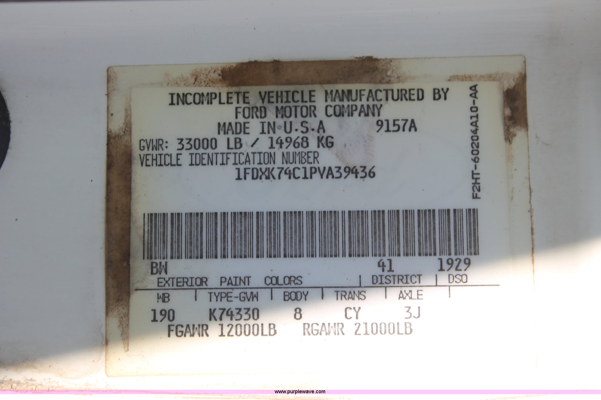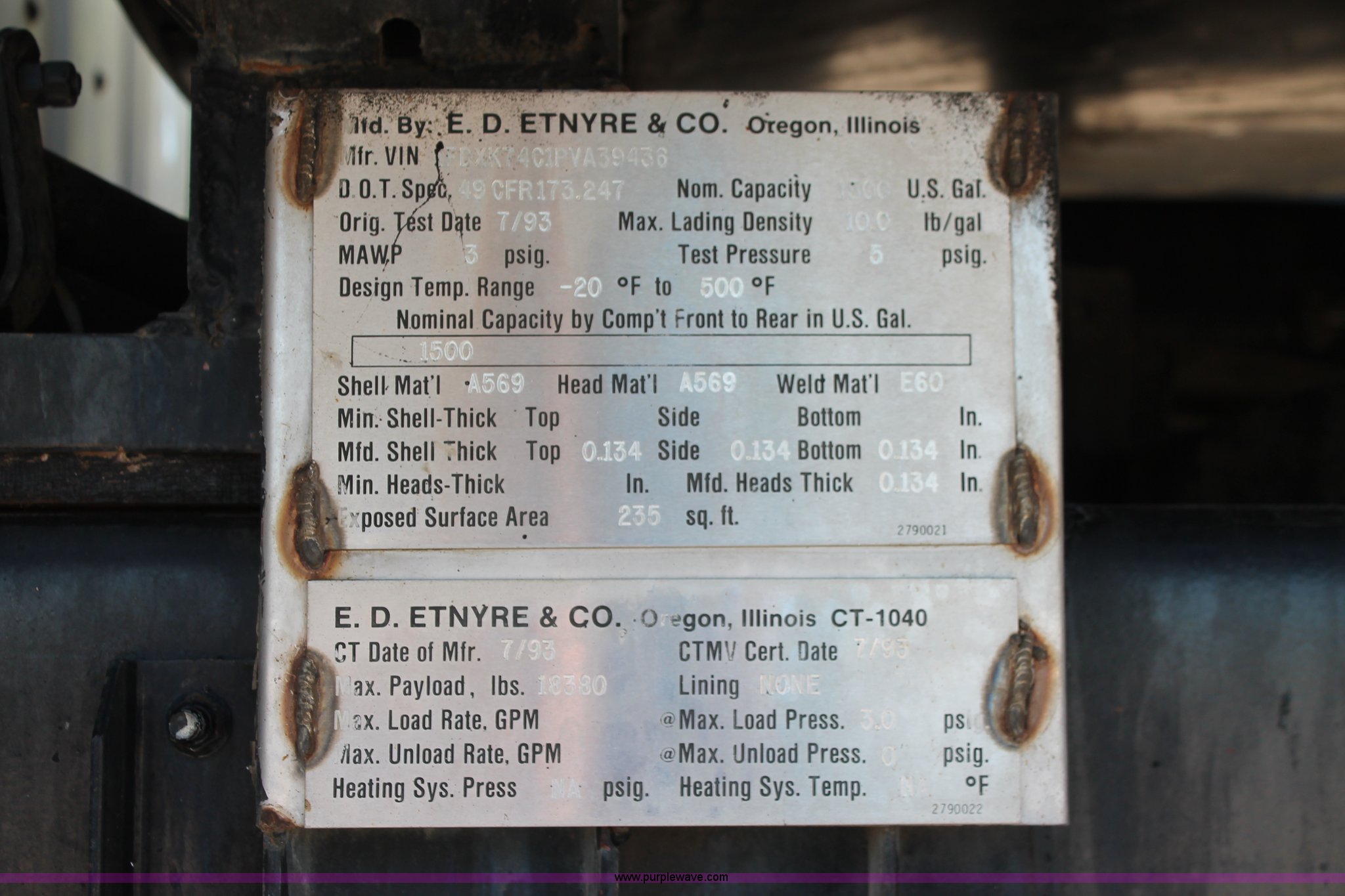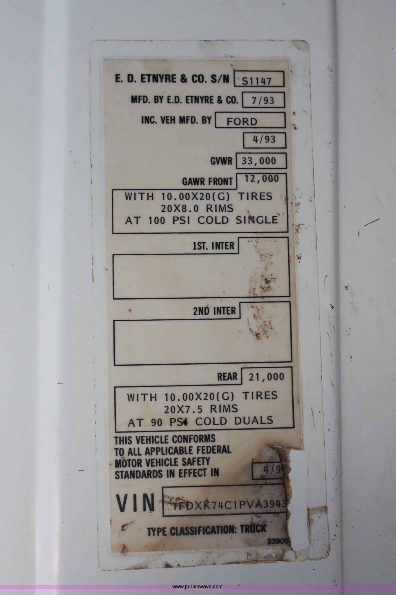 1993 Ford F700 oil distribution truck. 27,666 miles on odometer, Cummins ISB 5.9L L6 turbo diesel engine 190 HP, Serial 44867398, Ford nine speed manual transmission, Single axle, Heat, Front mounted PTO, 1994 Etnyre Black Topper S-2000 bed 17'L, 1,500 gallon capacity, Serial S-1147, Diesel burner Negative 20 degree to 500 degree Fahrenheit heat rating, Spray wand 144" spray boom, Side shift, (36) nozzles, Single fuel tank, 190" wheelbase, Spring suspension, Air brakes, 10.00-20 tires, GVWR 33,000 lbs, Operator's manual. Oklahoma title.. Title distribution may be delayed up to 14 days from verification of funds. 1FDXK74C1PVA39436. G & A Equipment. 2244 U.S. Highway 77 South. Davis, OK 73030