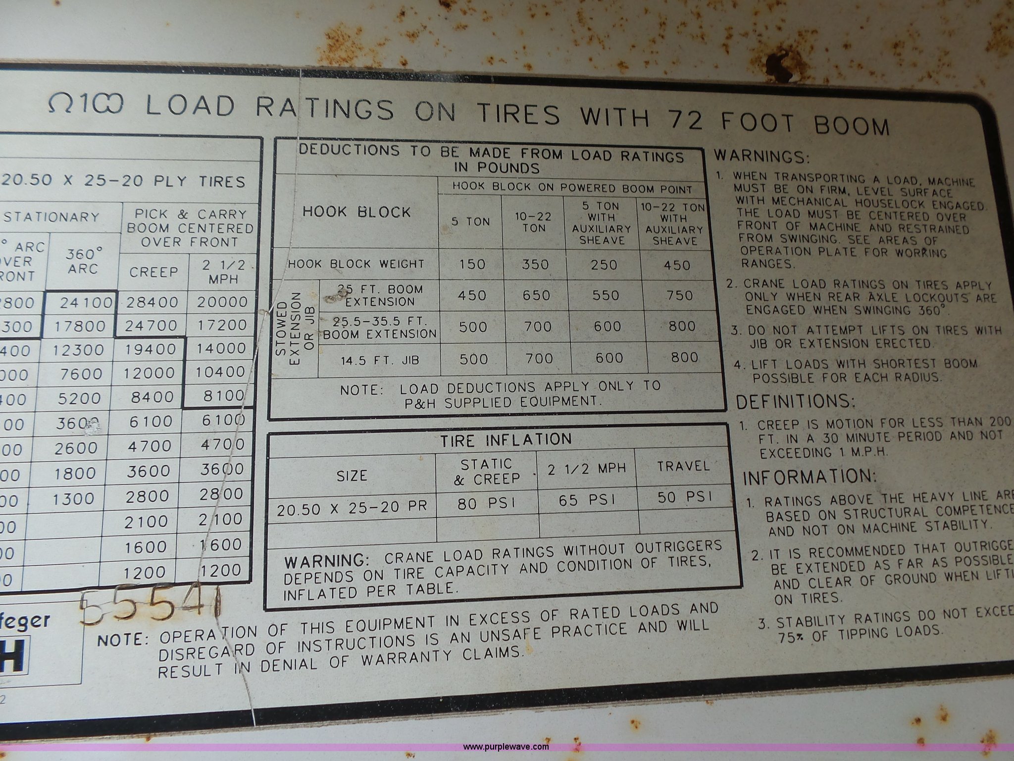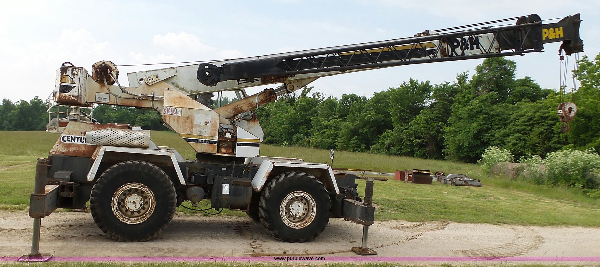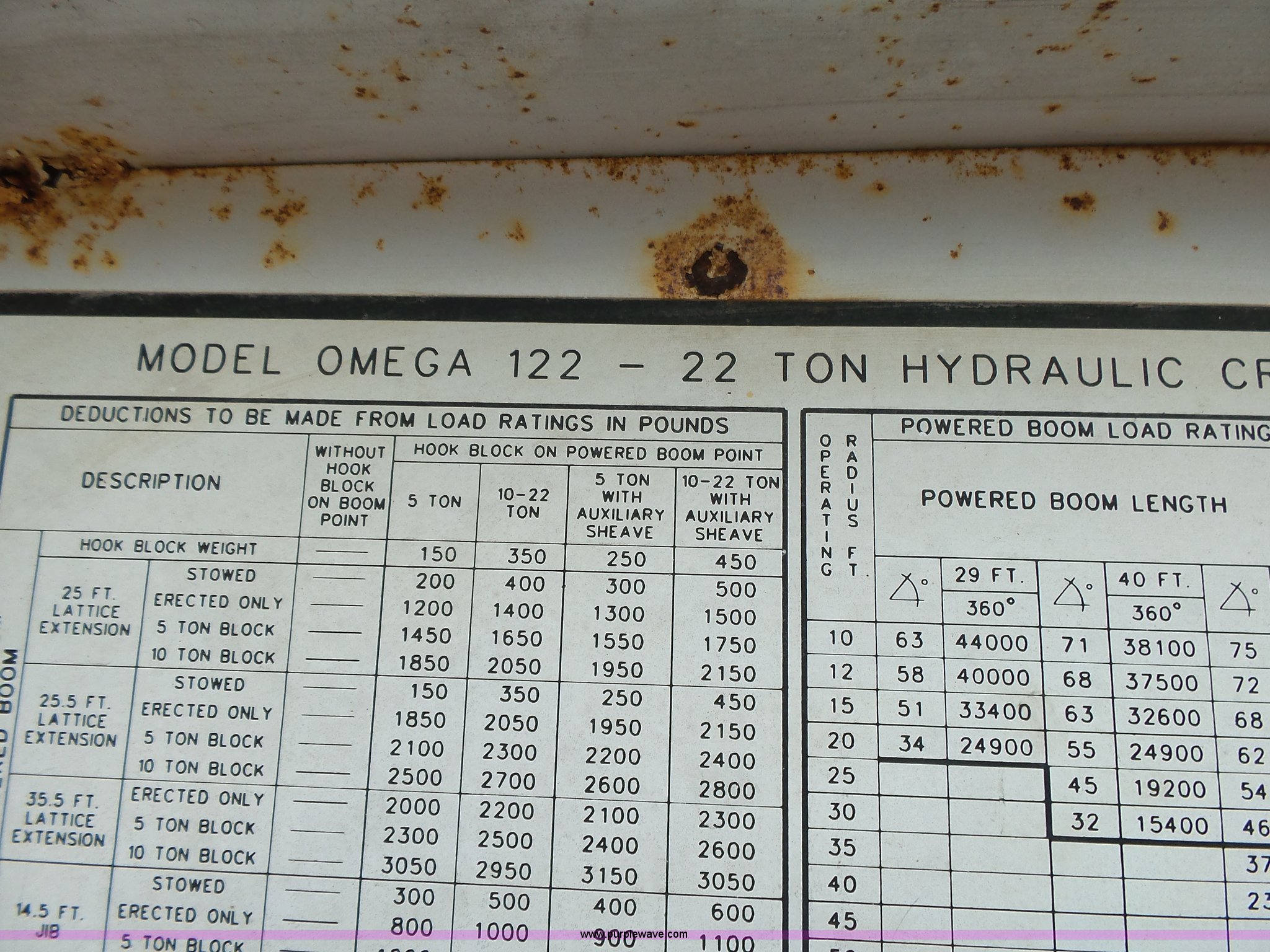 Purple Wave is selling a used Rough or All Terrain Crane in Missouri. This item is a P & H Omega 122 crane with the following: 3,957 hours on meter, Cummins six cylinder turbo diesel engine, Sequential powershift transmission, 6F-3R gears, Four wheel drive, Four wheel steer, Heat, Suspension seat, Stick crane controls, 24V electrical system, Telescopic boom, Three boom sections, 360 degree continuous rotation, 72' boom length, 25' jib, 15' jib extension, 3,500 lbs maximum lift capacity, extended, 44,000 lbs max lift capacity, retracted, 119' maximum tip height, Single winch, In-cab boom controls, Crane block, Three sheaves, Crane and ball hook, (4) hydraulic stabilizers, PCSA class 10-93, Rear counterweight, 20.5-25 tires, Serial 55541