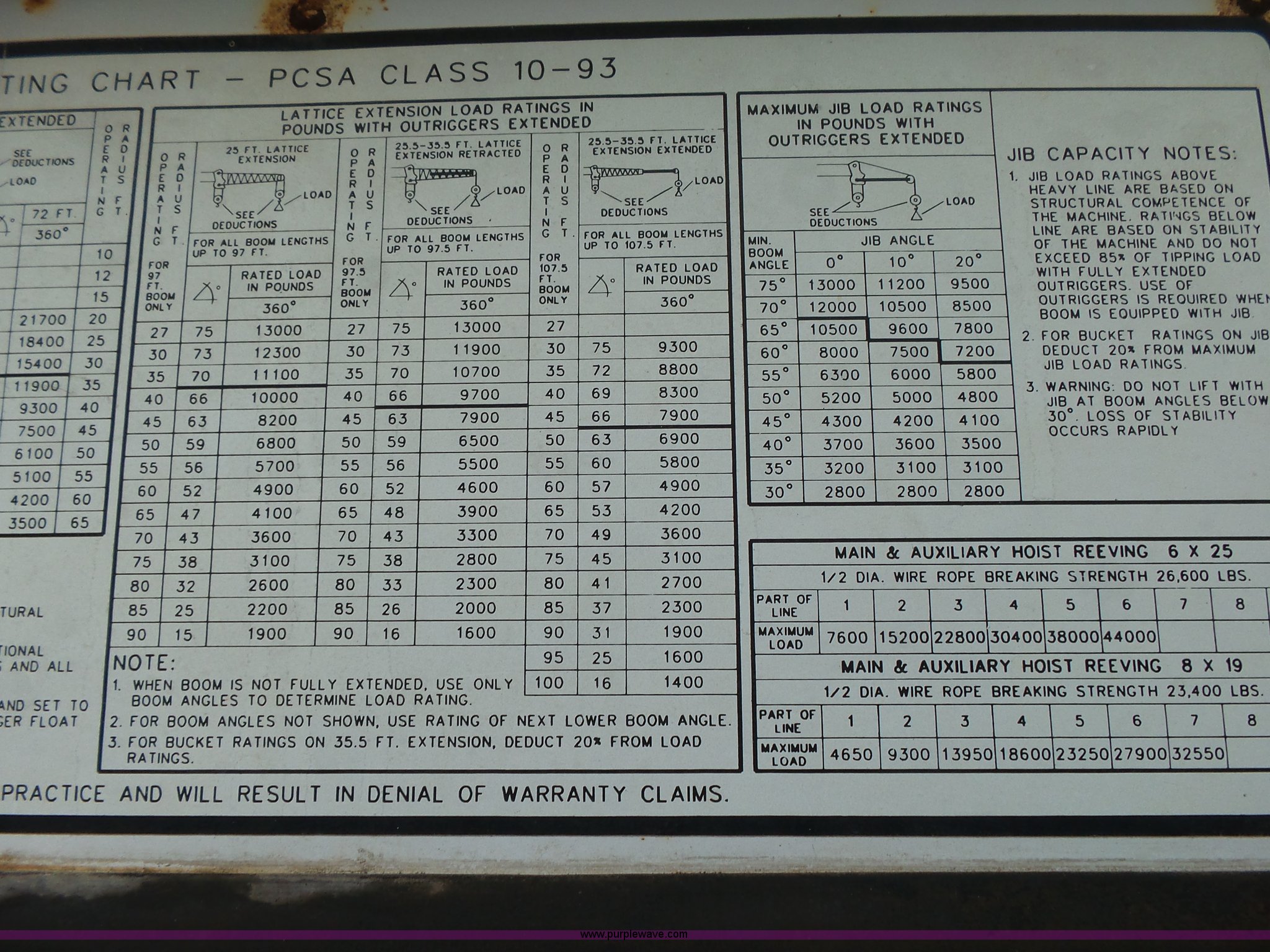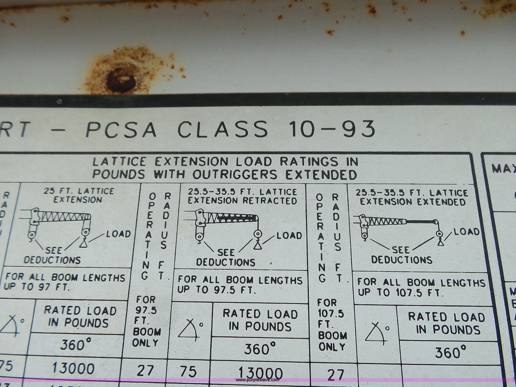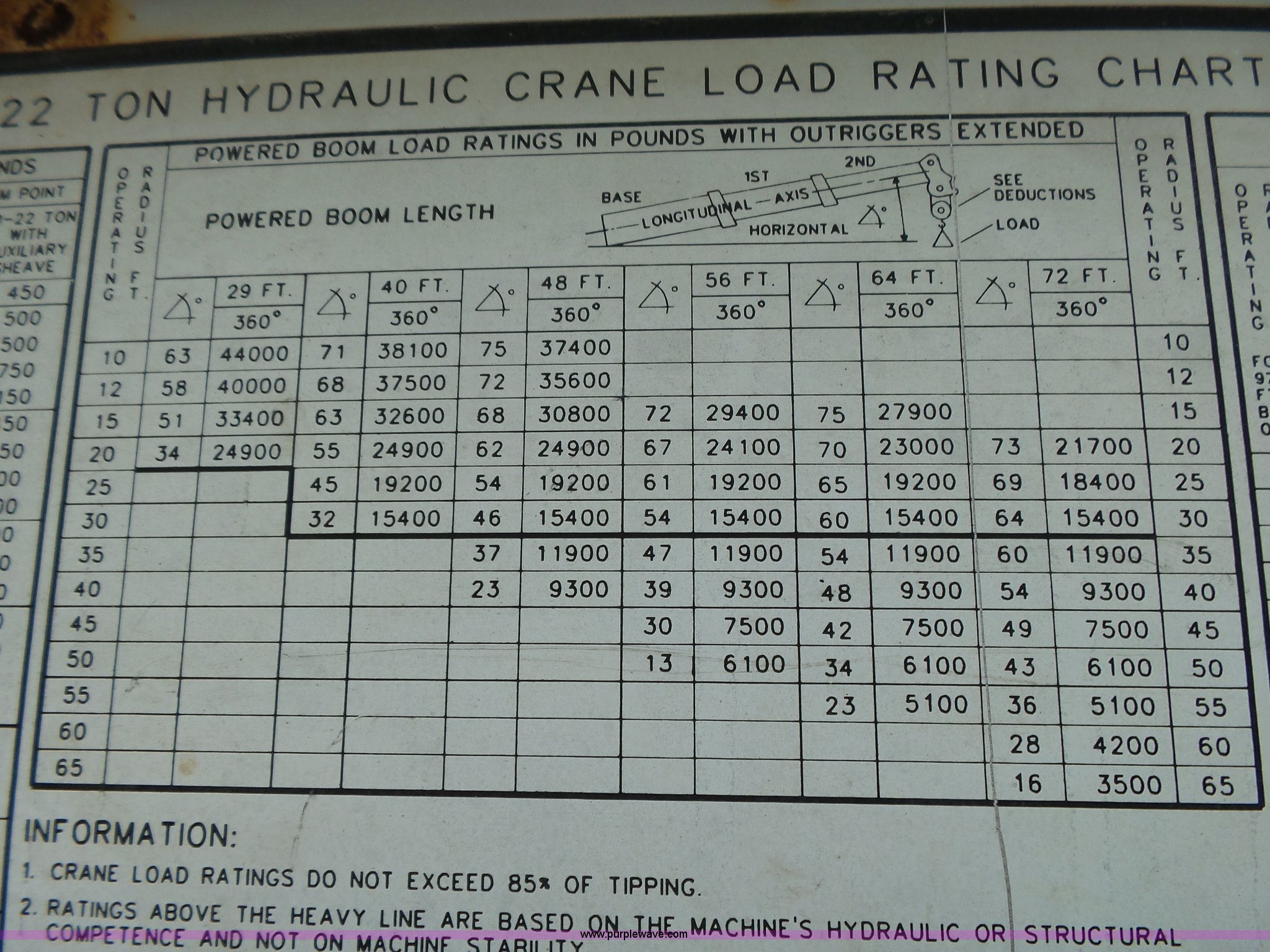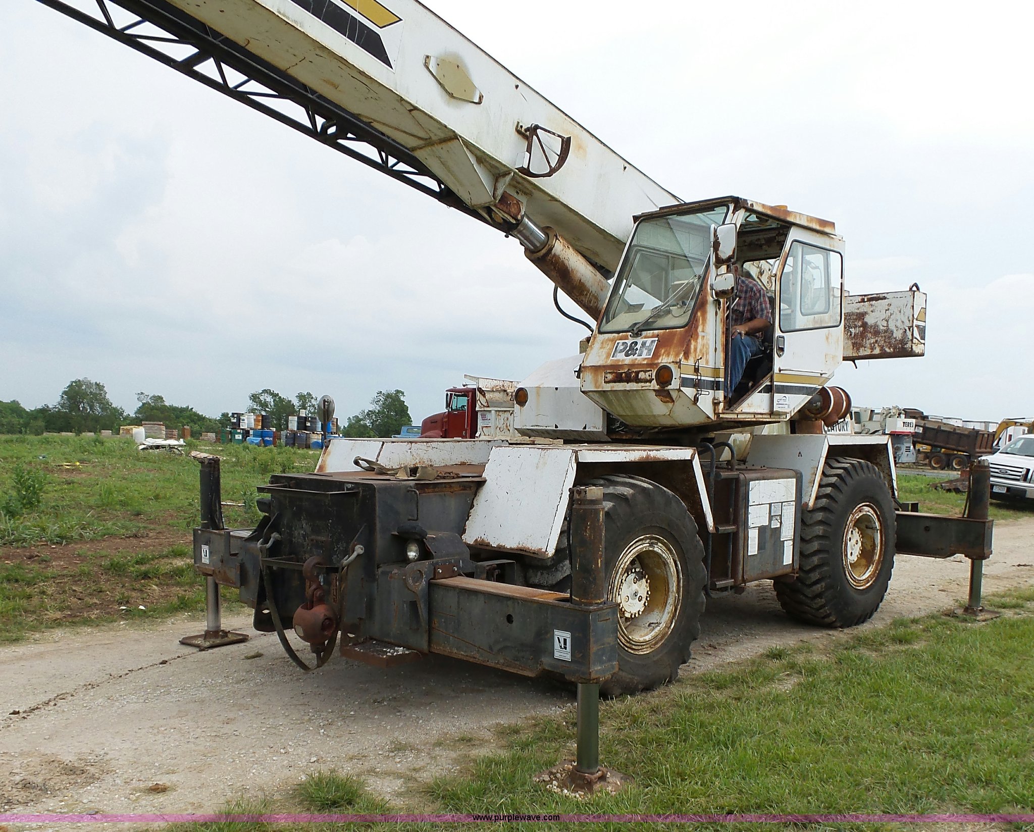 Purple Wave is selling a used Rough or All Terrain Crane in Missouri. This item is a P & H Omega 122 crane with the following: 3,957 hours on meter, Cummins six cylinder turbo diesel engine, Sequential powershift transmission, 6F-3R gears, Four wheel drive, Four wheel steer, Heat, Suspension seat, Stick crane controls, 24V electrical system, Telescopic boom, Three boom sections, 360 degree continuous rotation, 72' boom length, 25' jib, 15' jib extension, 3,500 lbs maximum lift capacity, extended, 44,000 lbs max lift capacity, retracted, 119' maximum tip height, Single winch, In-cab boom controls, Crane block, Three sheaves, Crane and ball hook, (4) hydraulic stabilizers, PCSA class 10-93, Rear counterweight, 20.5-25 tires, Serial 55541