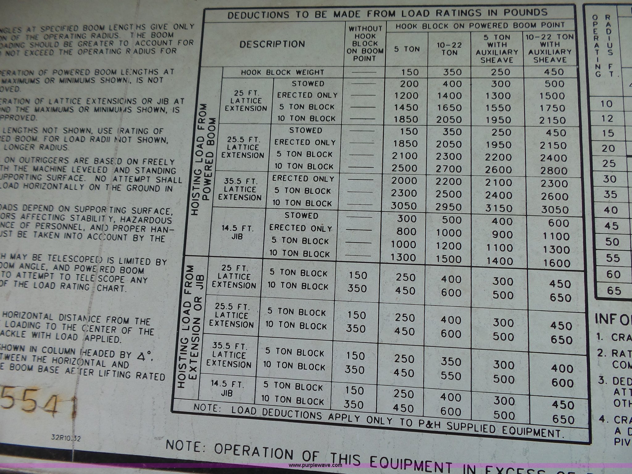 Take a look at this used P & H Omega 122 crane being sold on June 30th, 2016 in the SOLD! June 30 Construction Equipment Auction made by P & H. Take a look at all of the item information below or take a look at similar auctions for Cranes.