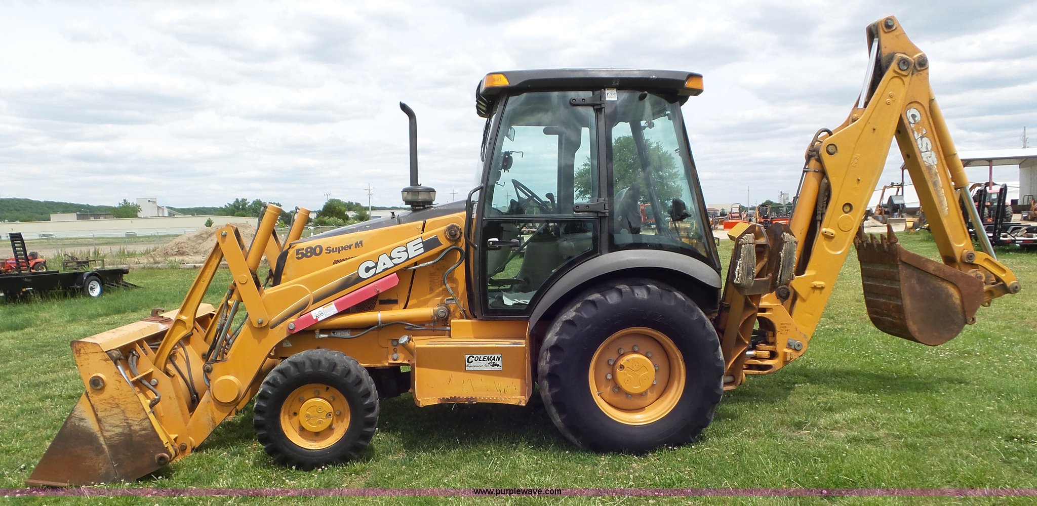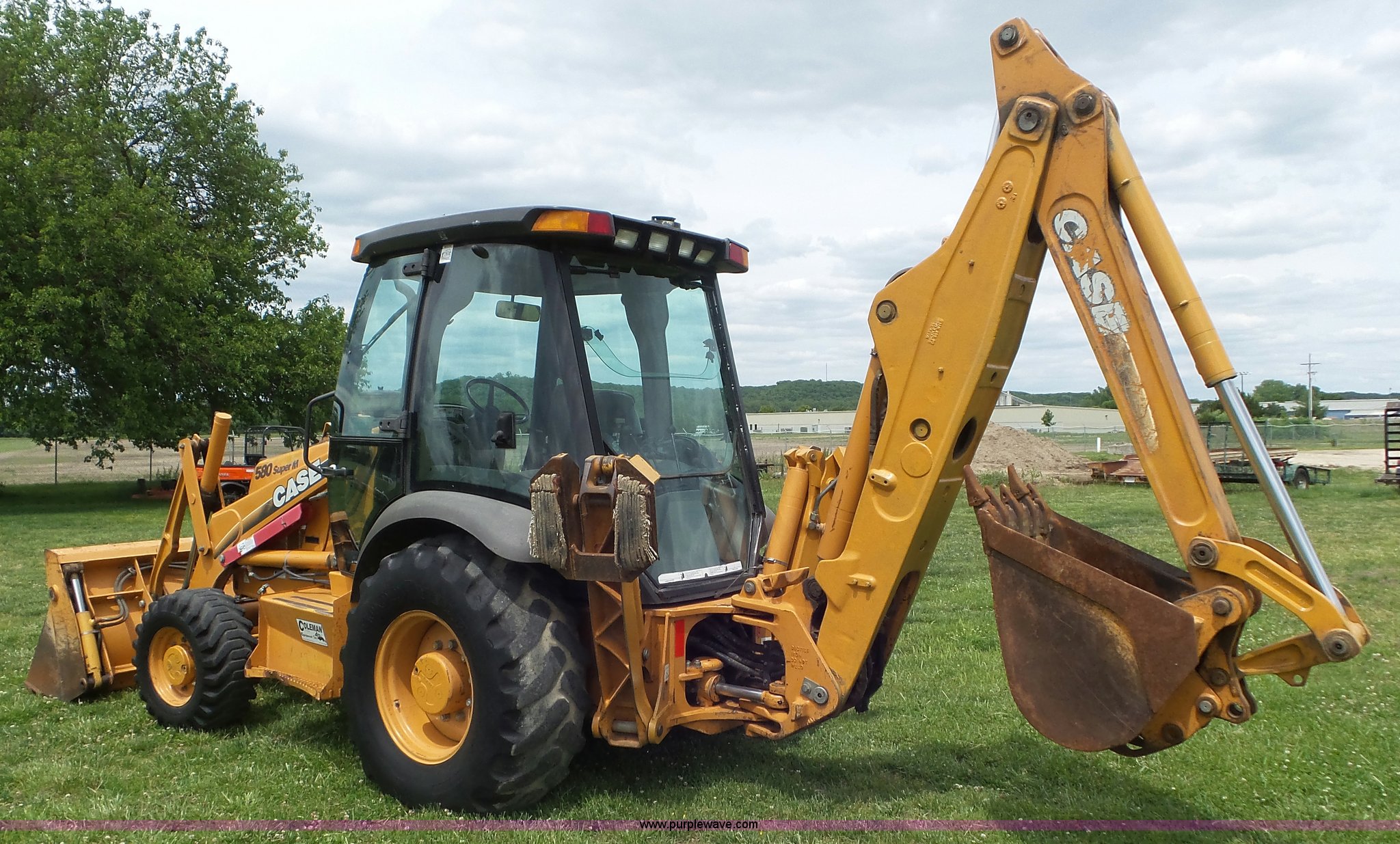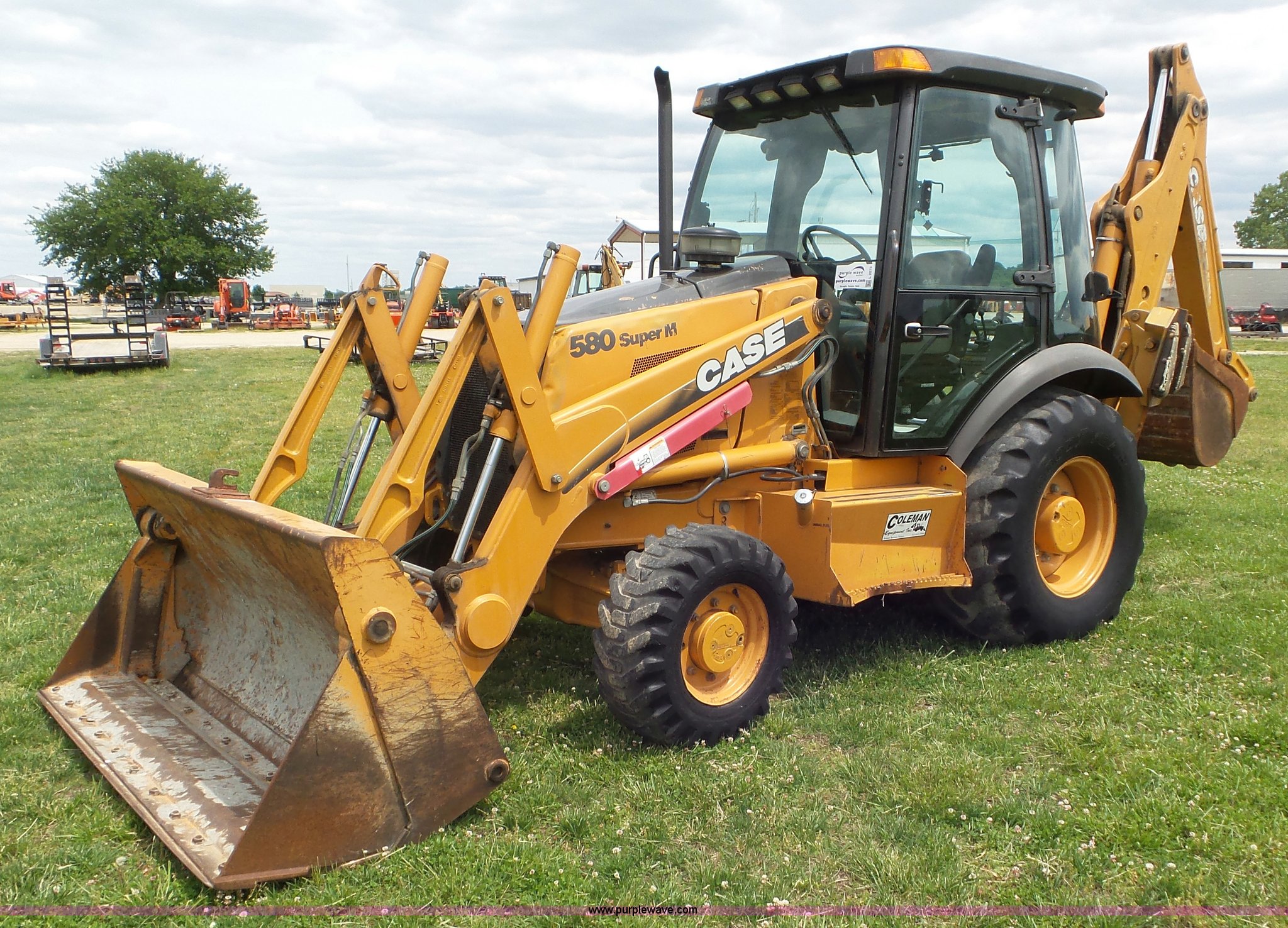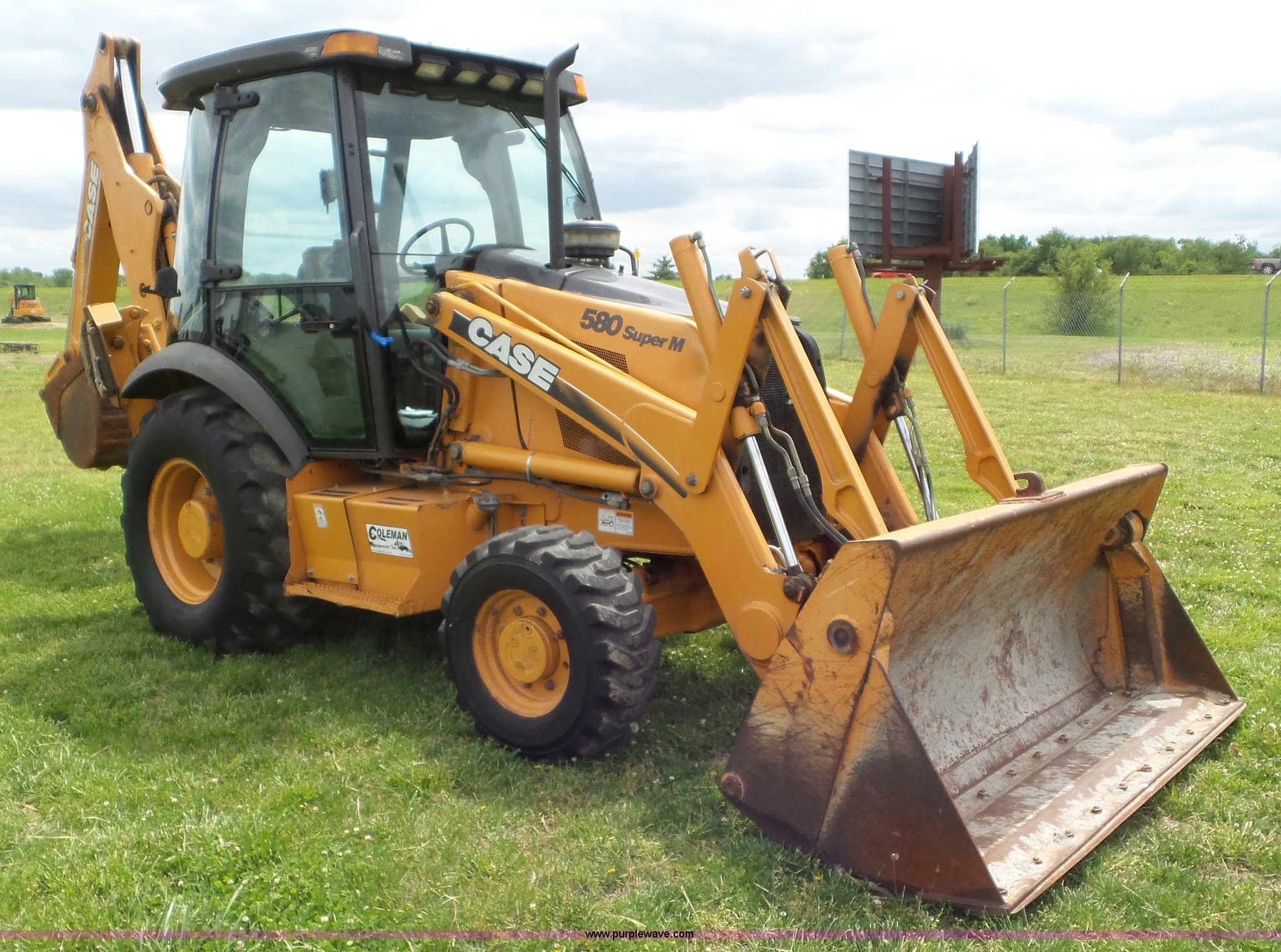 2003 Case 580 Super M backhoe. 4,770 hours on meter, Case New Holland 4T-390 3.9L four cylinder turbo diesel engine, Shuttle shift transmission 4F-4R gears, Four wheel drive, EROPS, Heat, Suspension seat, Wobble stick backhoe controls, Wipers, Front and rear work lights, 81"W loader bucket Bolt-on cutting edge, Four-in-one bucket, Auxiliary hydraulics, 24"W backhoe bucket (5) teeth, Block heater, 12-16.5 front tires, 19.5-24 rear tires, 14,250 lbs. base operating weight, Serial JJG0374429. Coleman Equipment Inc.. 24000 W. 43rd Street. Bonner Springs, KS 66012