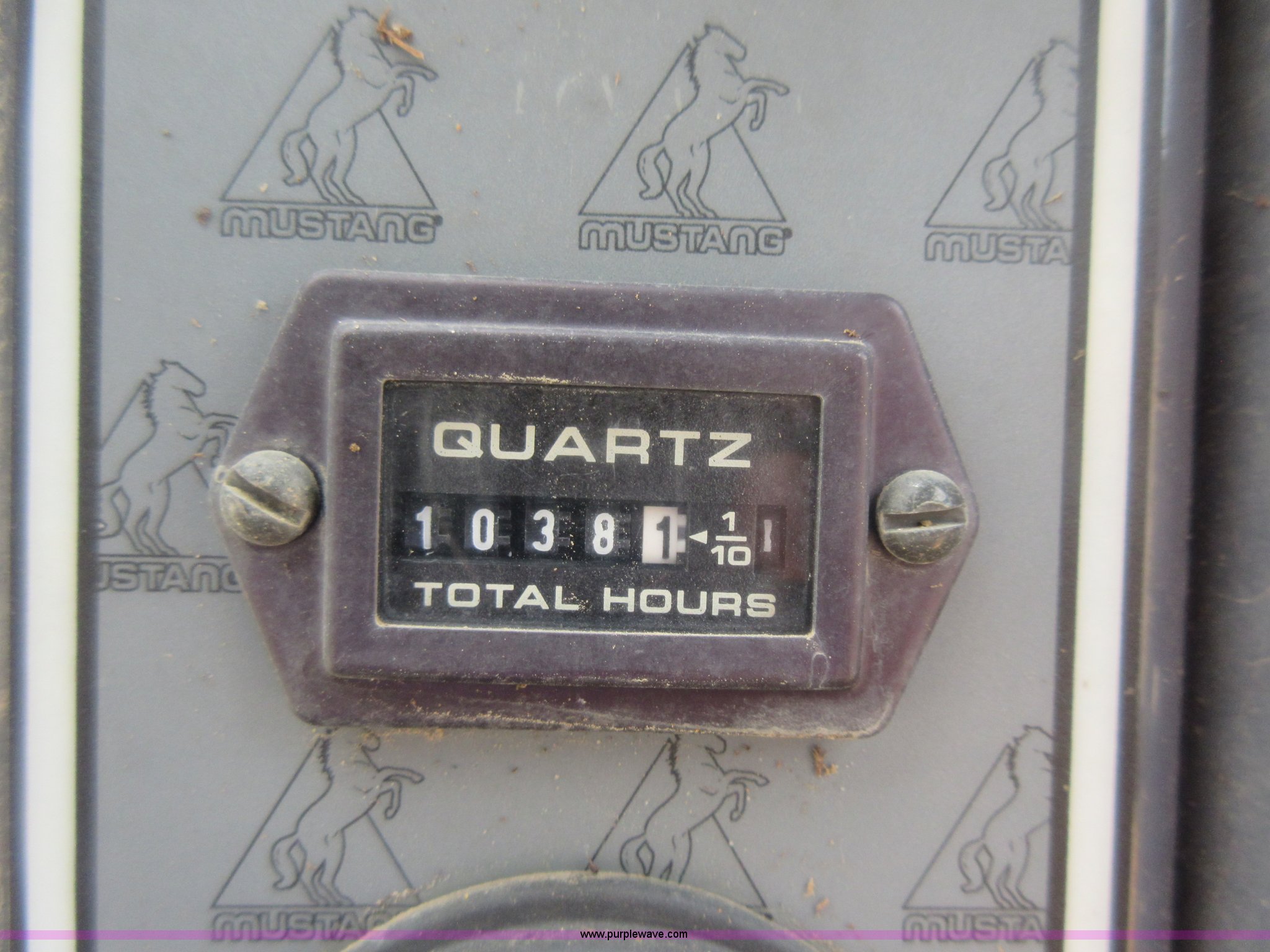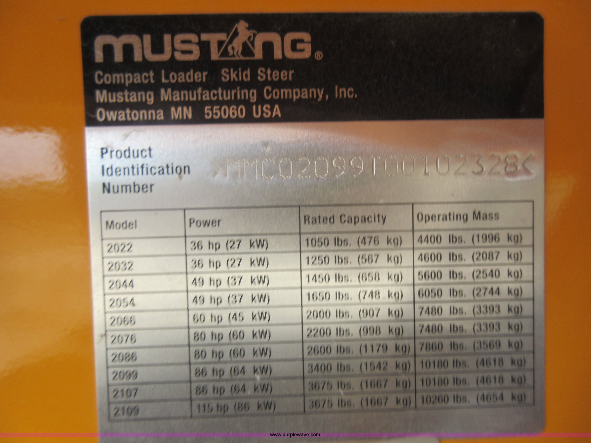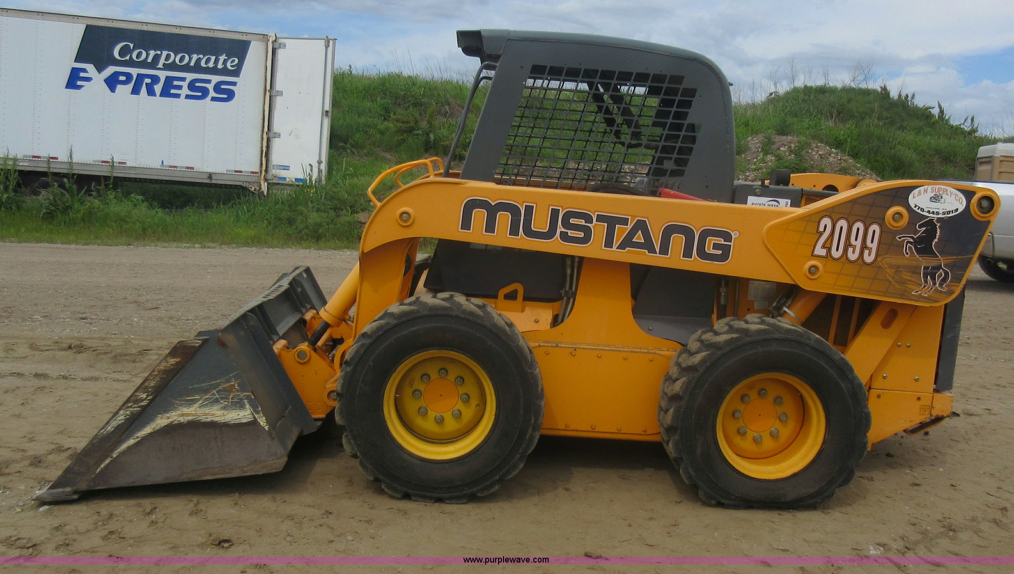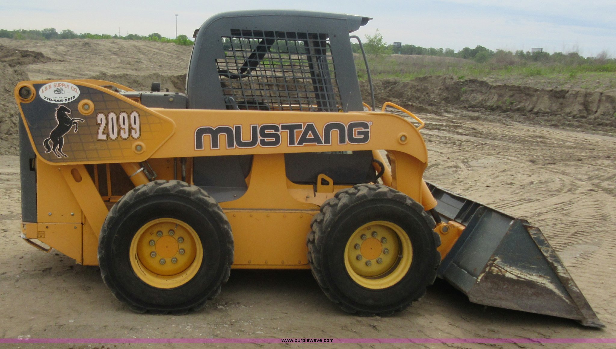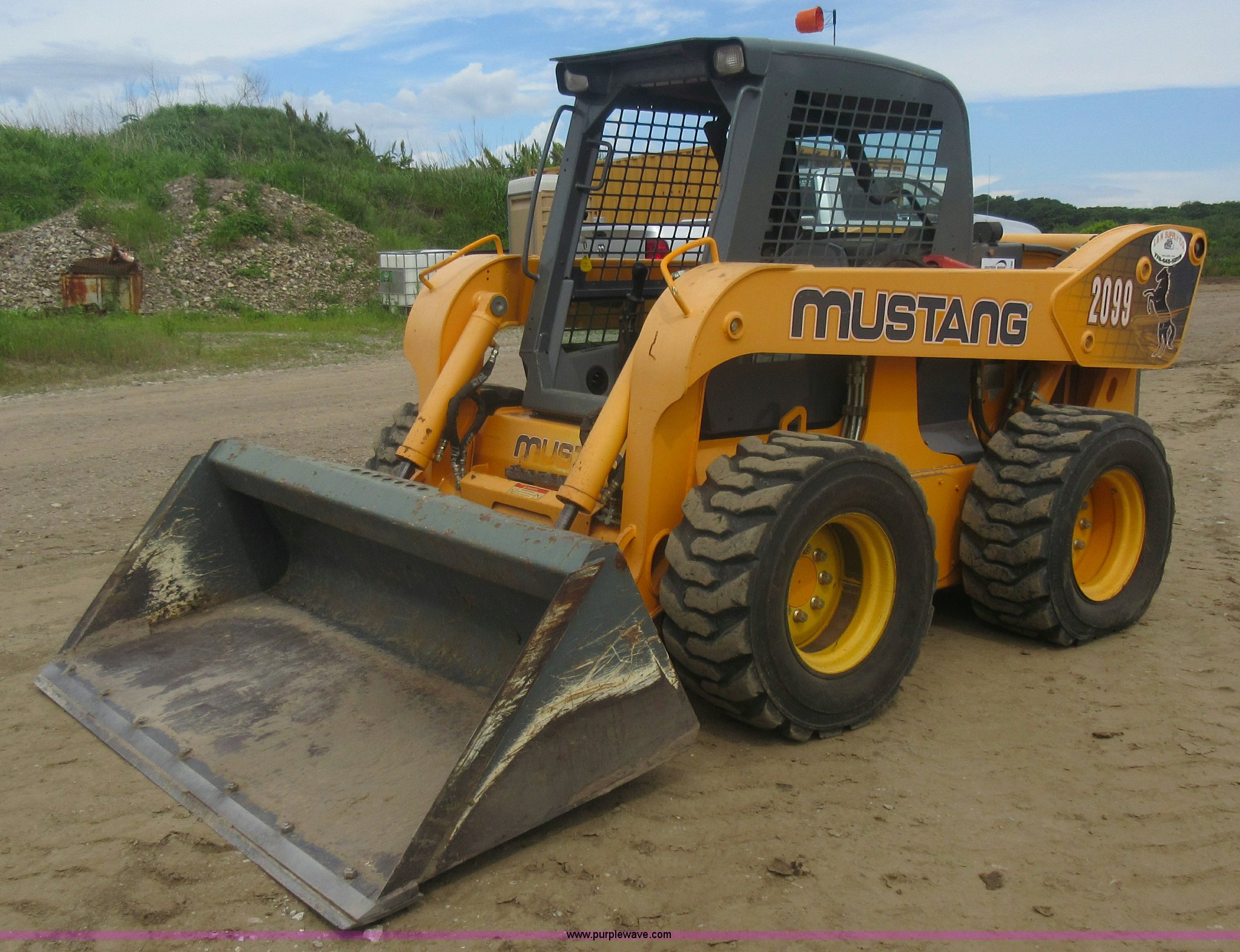 Purple Wave is selling a used Skid Steer Loader in Missouri. This item is a Mustang 2099 skid steer with the following: 1,038 hours on meter, Perkins four cylinder diesel engine, Hydrostatic transmission, Hand and foot controls, 84"W bucket, Bolt-on cutting edge, Auxiliary hydraulics, 14-17.5 tires, 10,180 lbs. base operating weight, Serial MMC02099T00102328