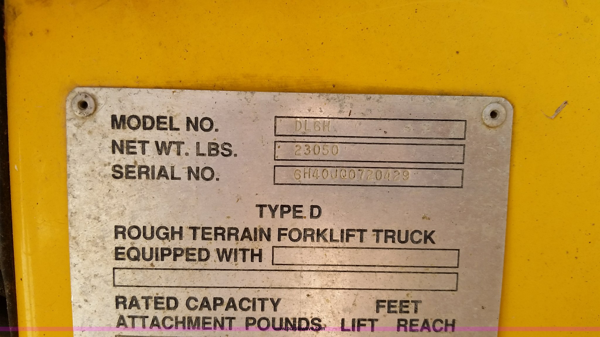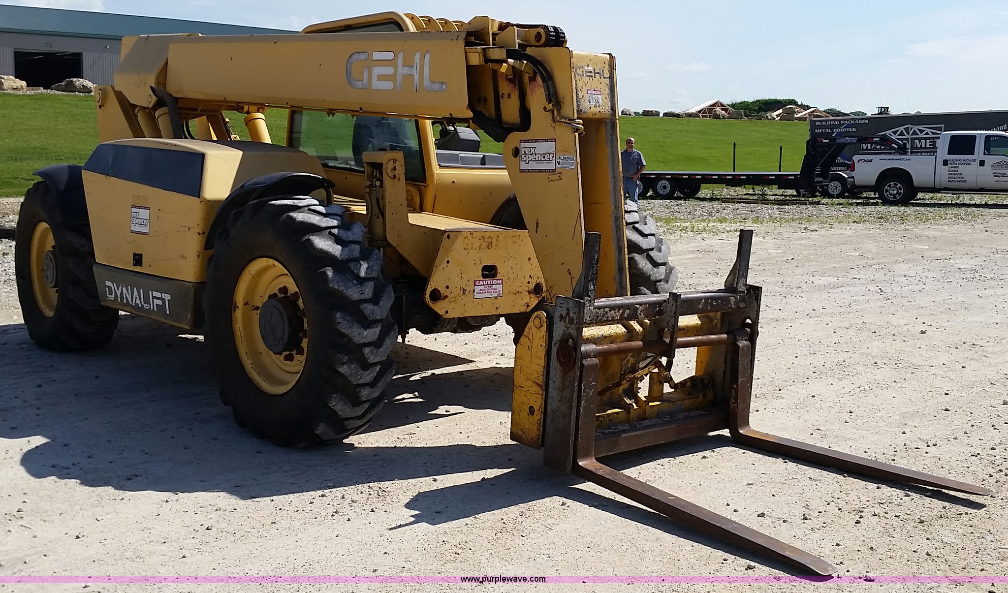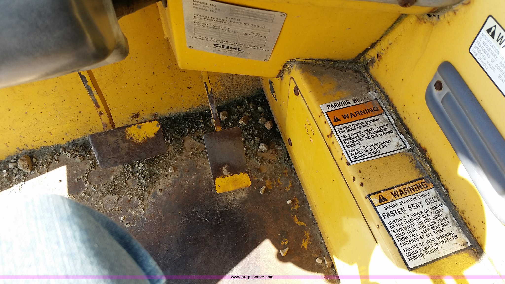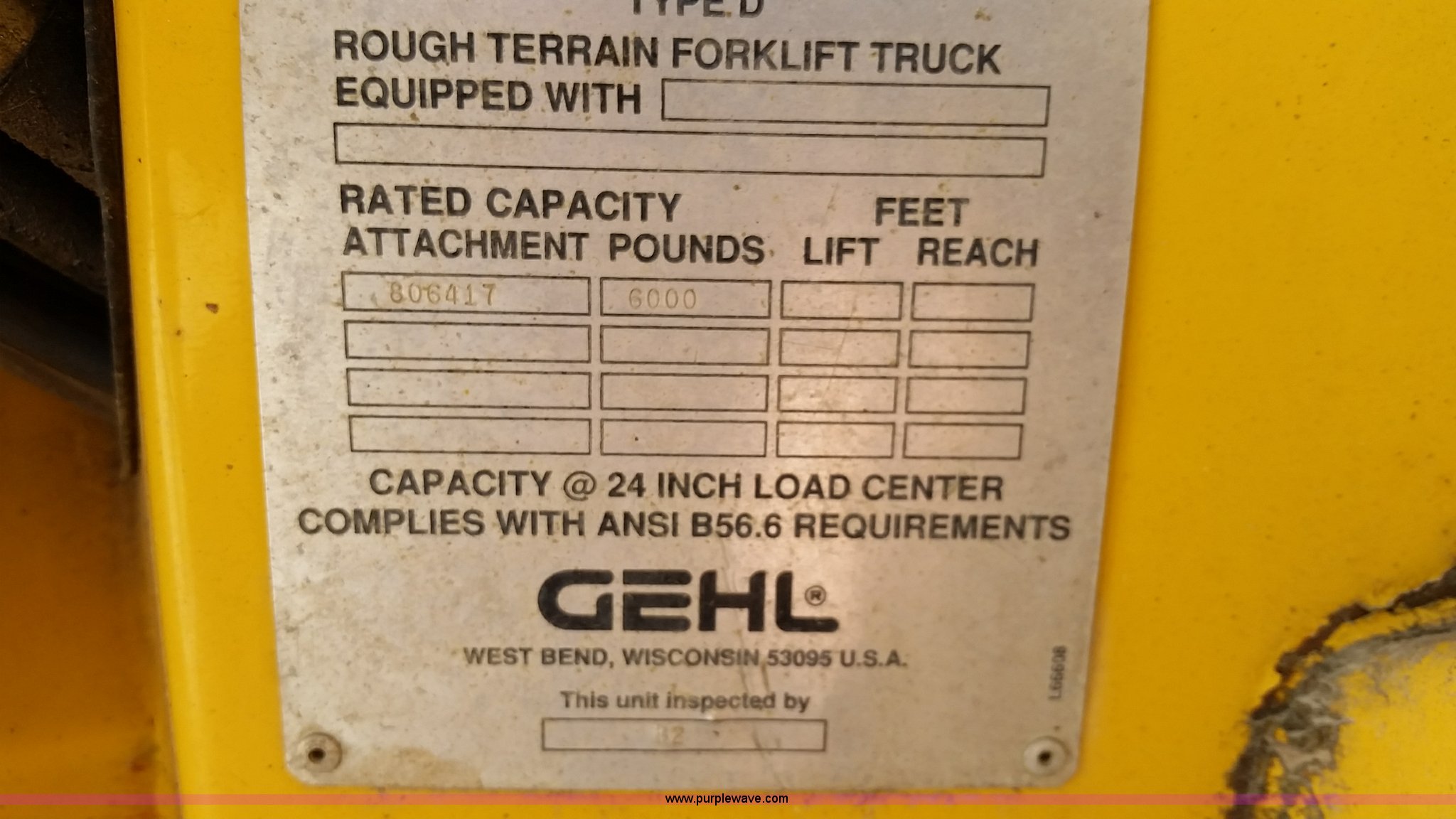 Purple Wave is selling a used Telehandler in Missouri. This item is a 1999 Gehl DL6H40 telehandler with the following: 4,731 hours on meter, John Deere Powertech 4.5L four cylinder diesel engine, Shuttle shift transmission, 4F-4R gears, Four wheel drive, Canopy, Crab steer, Four wheel steer, 6,000 lbs maximum lift capacity, 4'L x 4"W forks, Tilt carriage, 14-24 tires, 23,050 lbs. base operating weight, Maintenance records available upon request, Serial 6H40JQ0720429