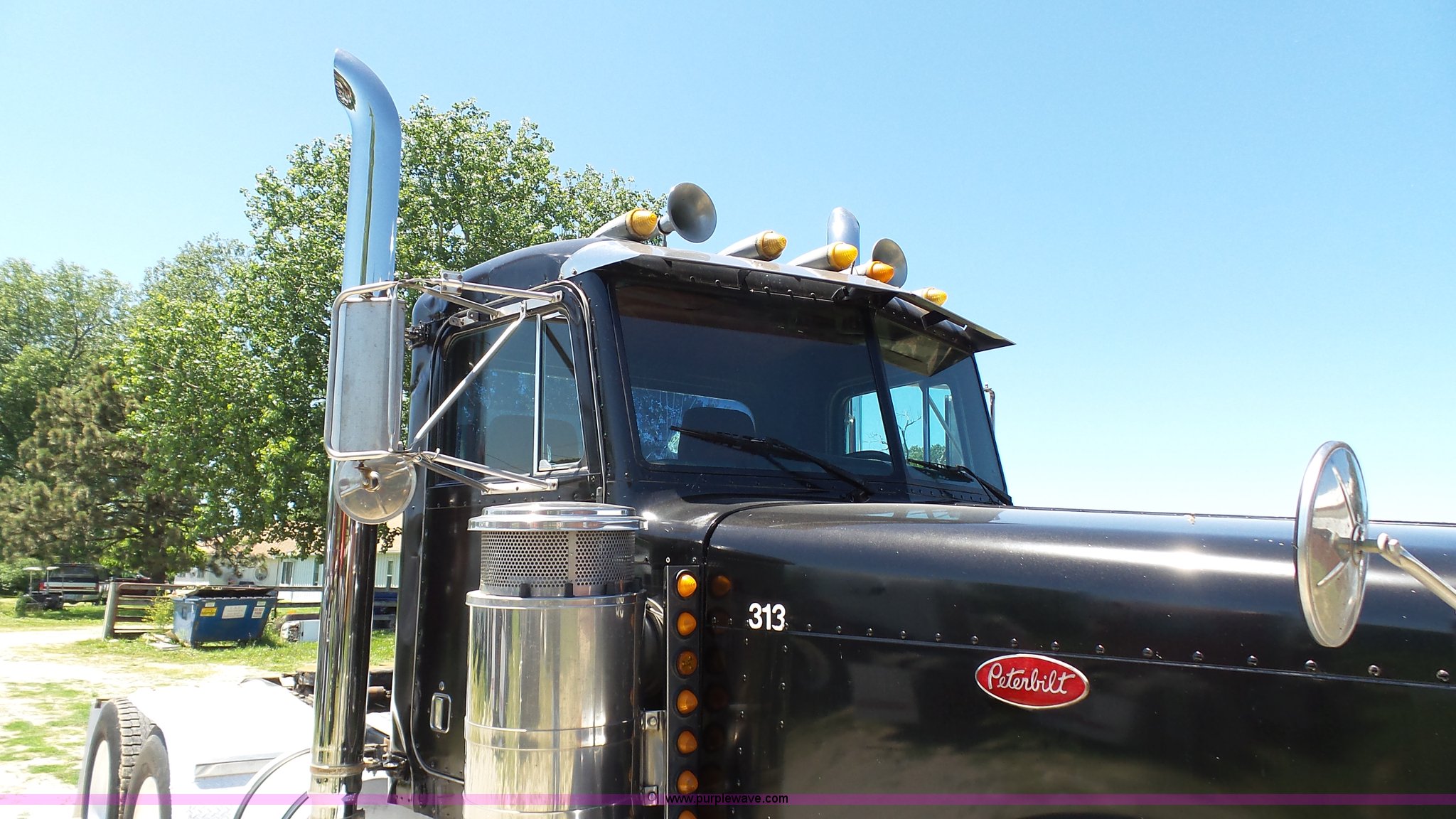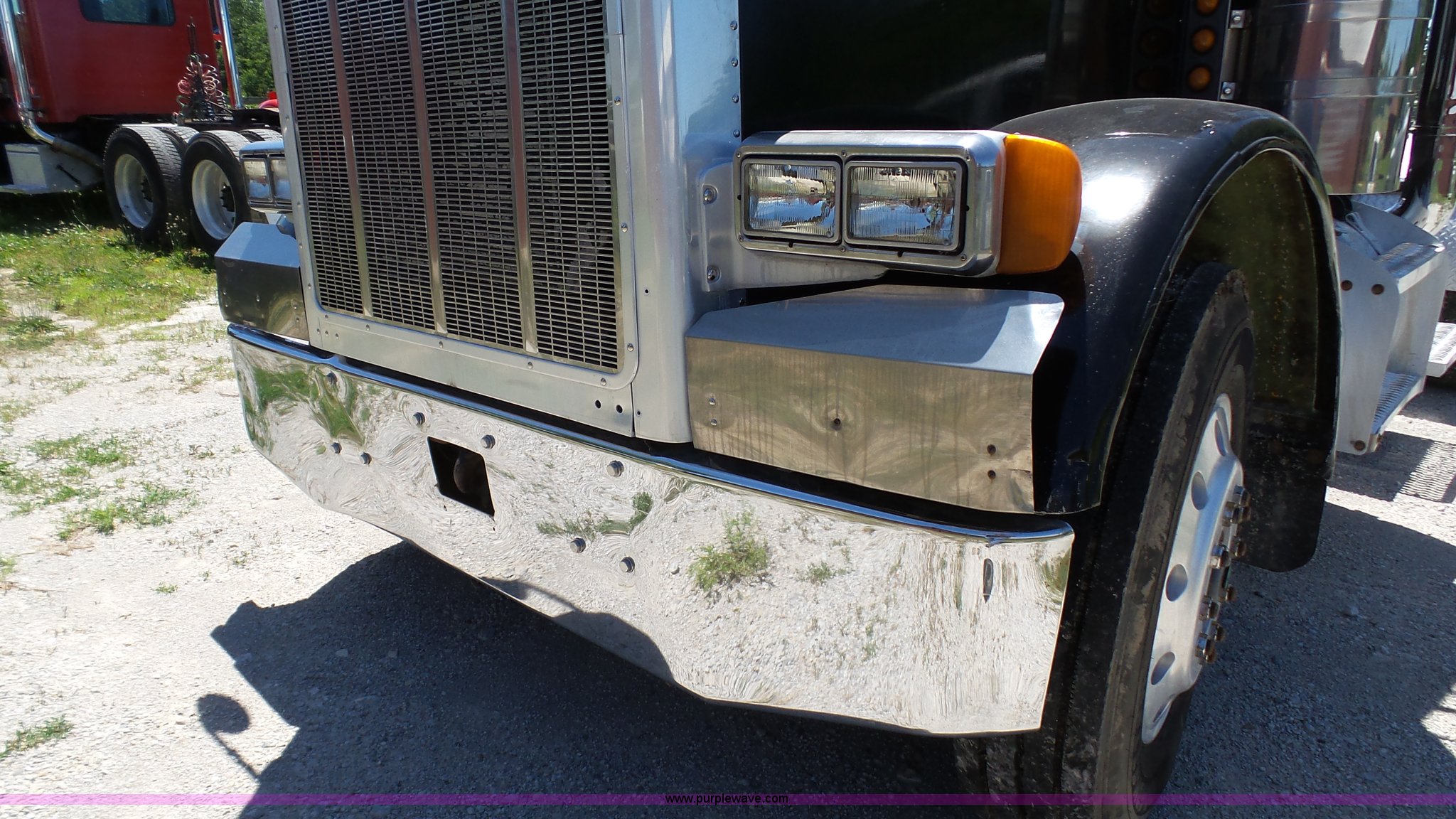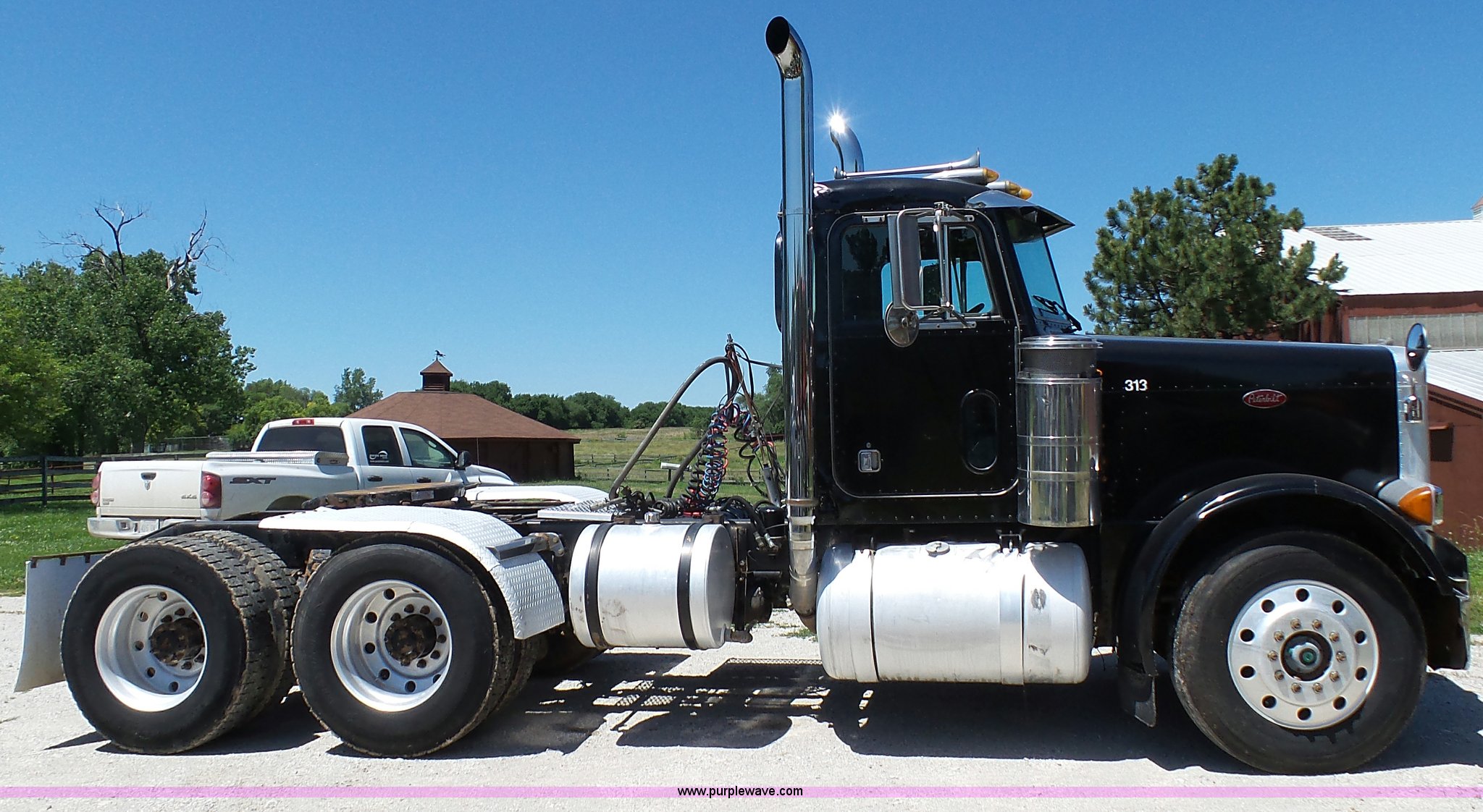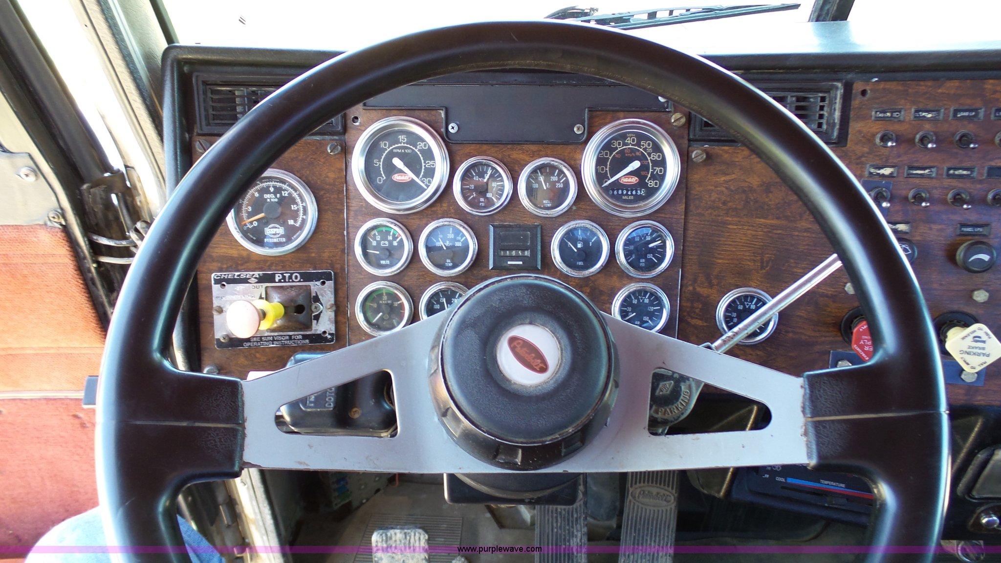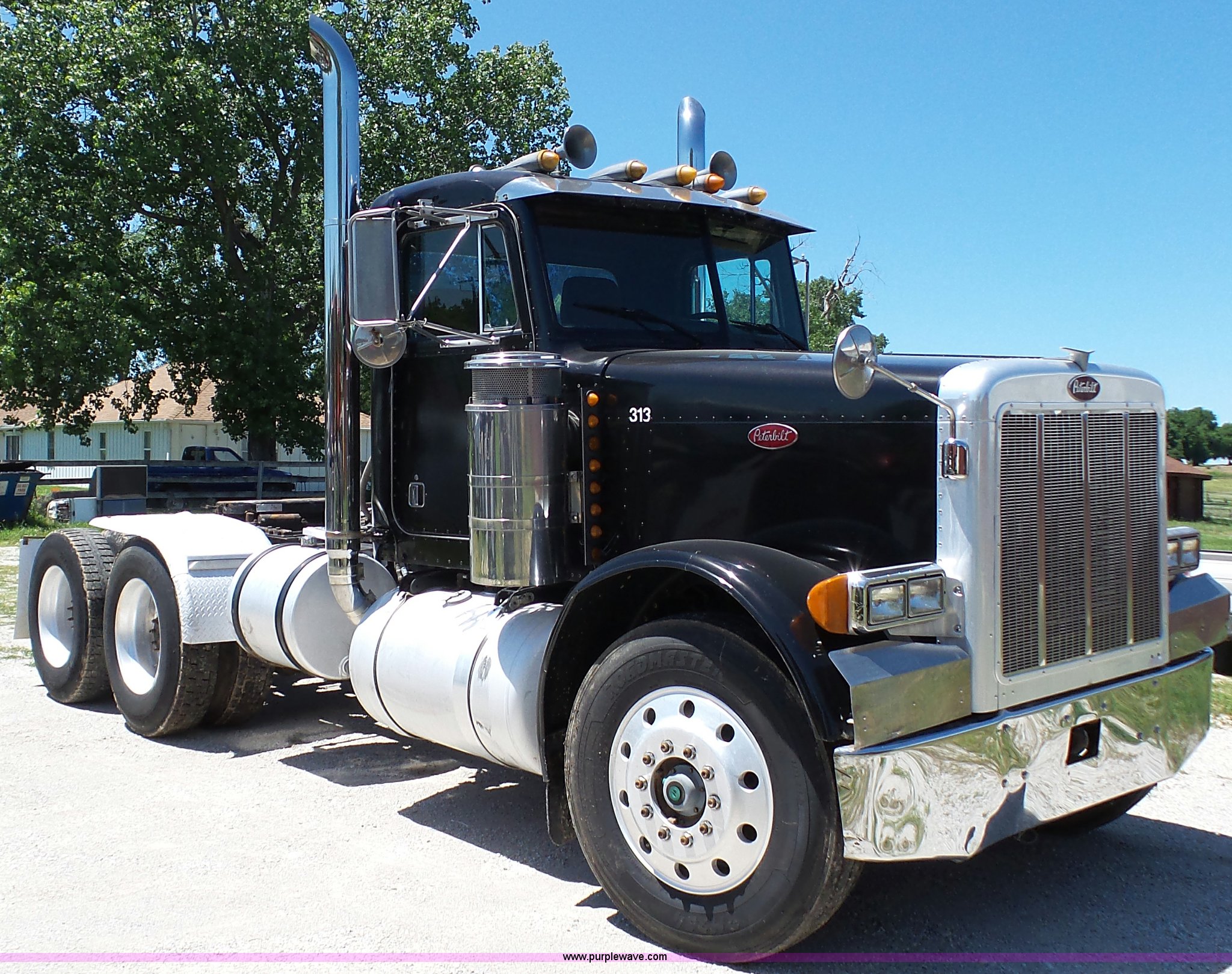 Purple Wave is selling a used Truck Tractor in Kansas. This item is a 1993 Peterbilt 379 semi truck with the following: 689,463 miles on odometer, Caterpillar 3406 14.6L L6 turbo diesel engine, 425 HP, Eaton Fuller 13 speed manual transmission, Tandem axle, Inter-axle differential lock, AC and heat, Tilt, AM, Air suspension seat, Exterior visor, PTO, Wet kit, Dump valves, Aluminum deck plate, Sliding fifth wheel plate, Dual exhaust stacks, Dual fuel tanks, Aluminum half fenders, 3:70 gear ratio, Air suspension, Air brakes, 11R24.5 tires, GVWR 50,000 lbs, FAWR 12,000 lbs, IAWR 19,000 lbs, RAWR 19,000 lbs, Rear glass cracked