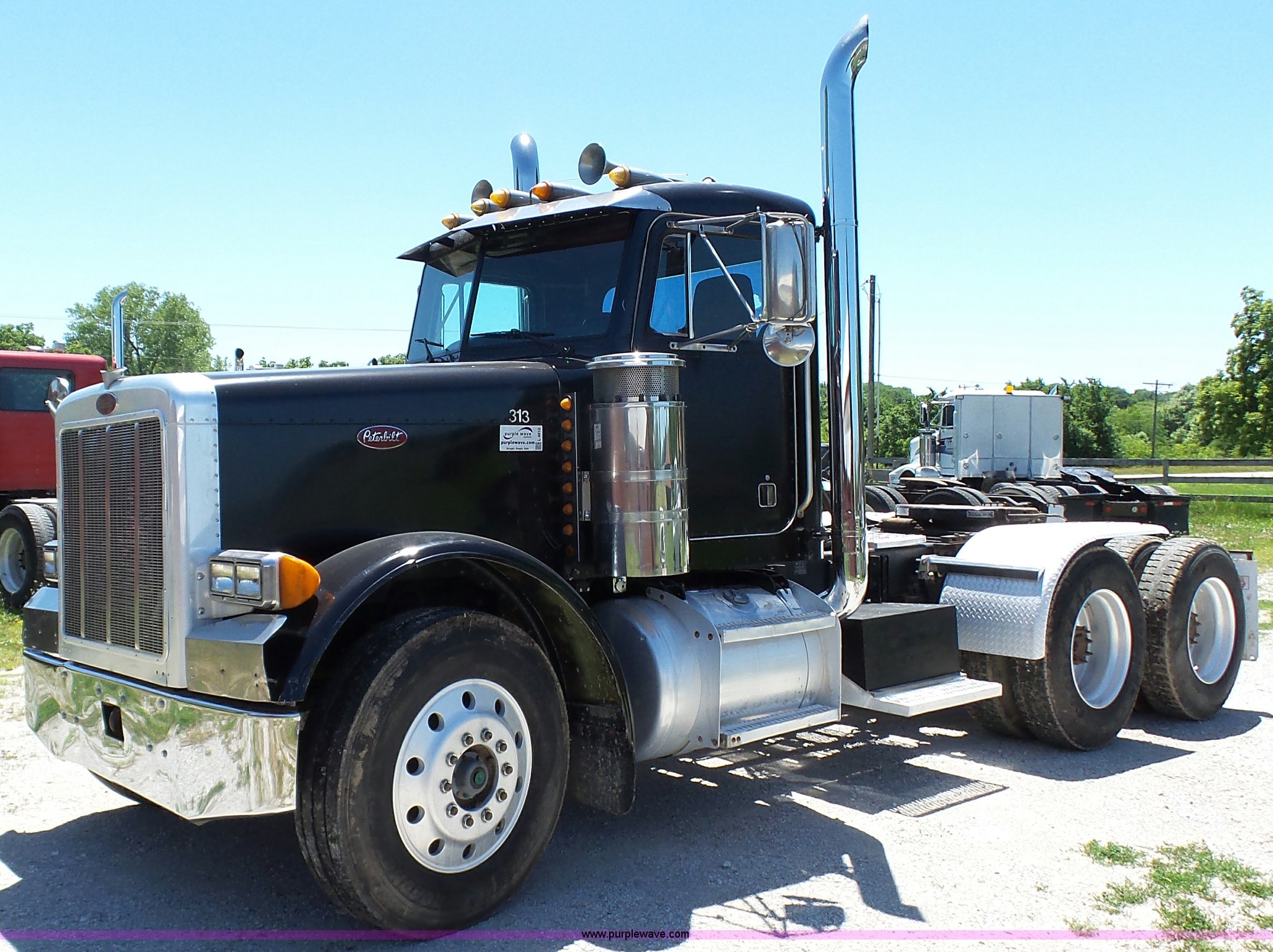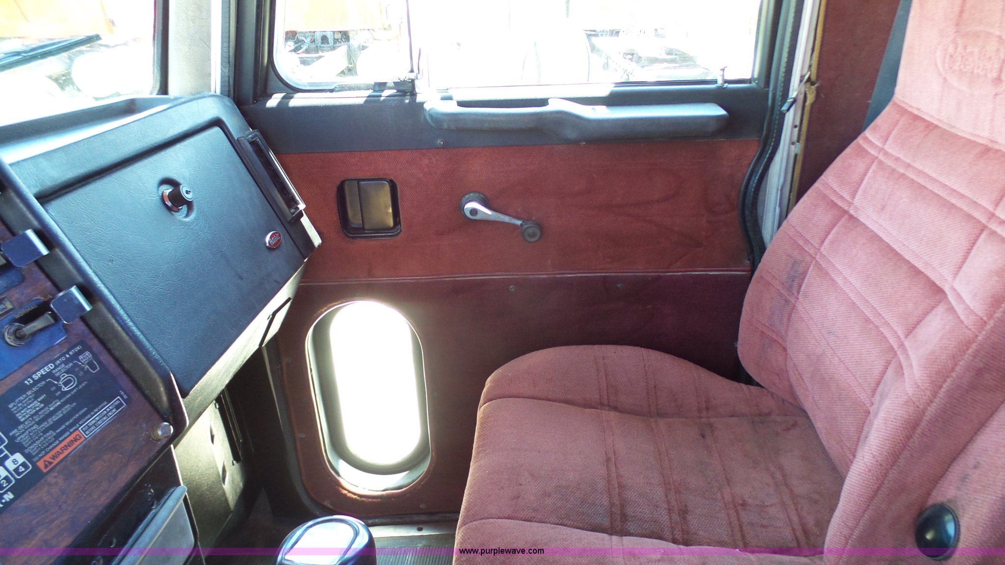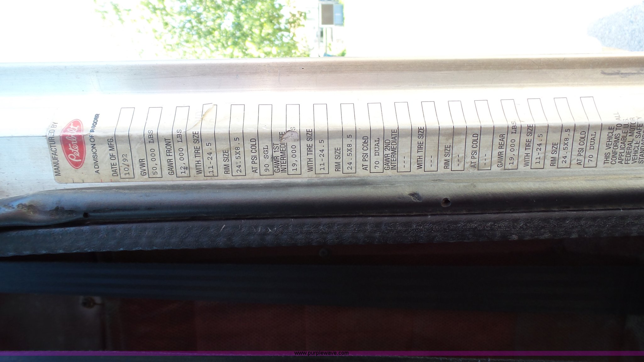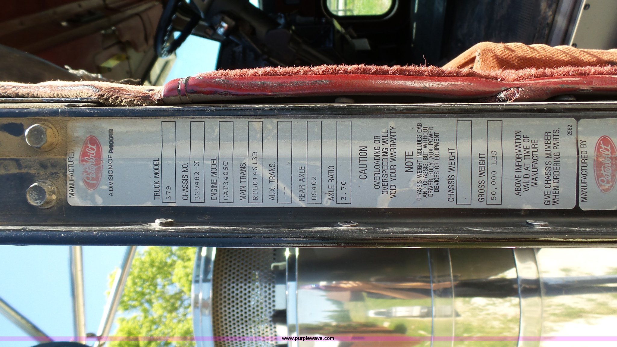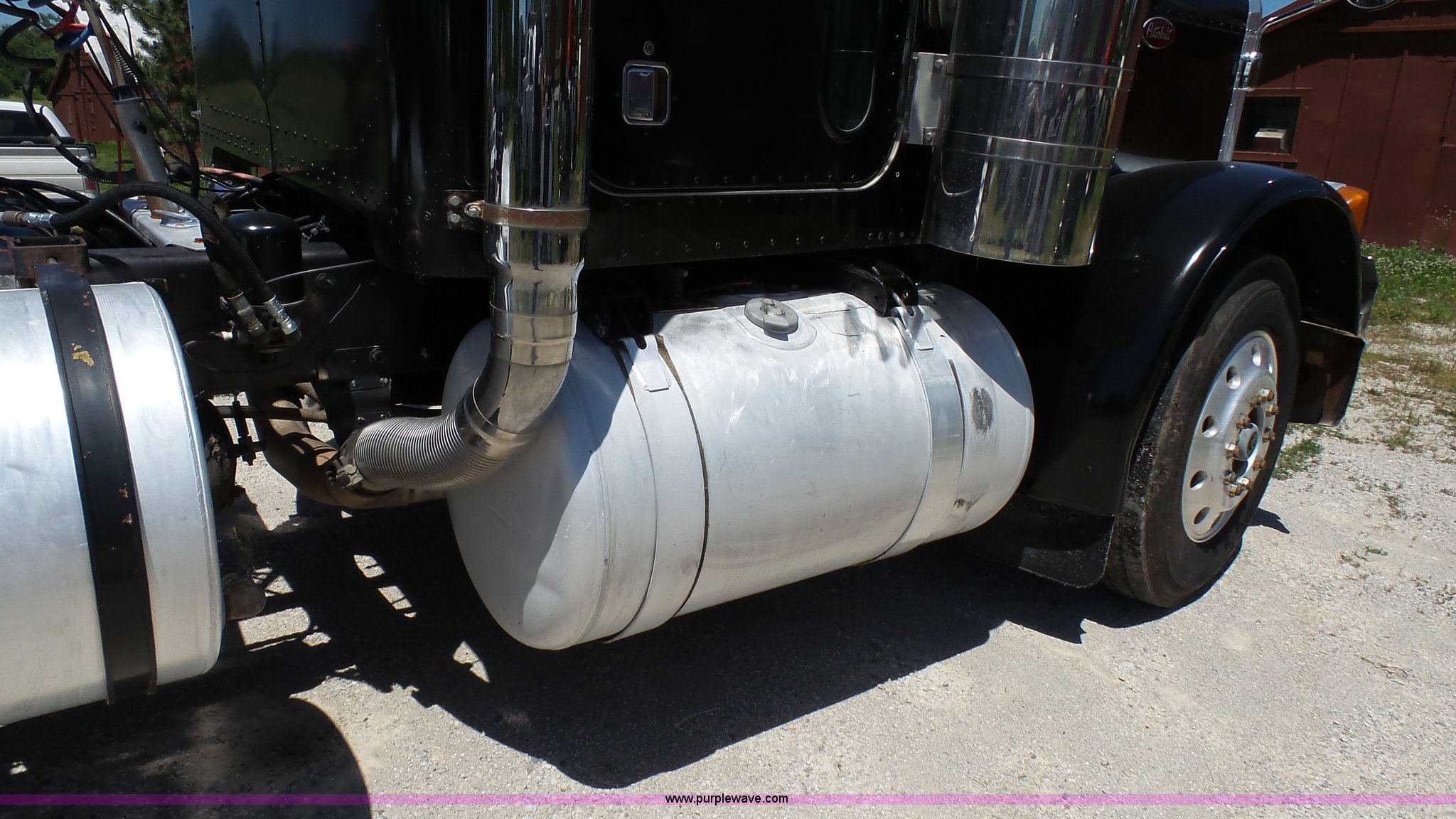 Purple Wave is selling a used Truck Tractor in Kansas. This item is a 1993 Peterbilt 379 semi truck with the following: 689,463 miles on odometer, Caterpillar 3406 14.6L L6 turbo diesel engine, 425 HP, Eaton Fuller 13 speed manual transmission, Tandem axle, Inter-axle differential lock, AC and heat, Tilt, AM, Air suspension seat, Exterior visor, PTO, Wet kit, Dump valves, Aluminum deck plate, Sliding fifth wheel plate, Dual exhaust stacks, Dual fuel tanks, Aluminum half fenders, 3:70 gear ratio, Air suspension, Air brakes, 11R24.5 tires, GVWR 50,000 lbs, FAWR 12,000 lbs, IAWR 19,000 lbs, RAWR 19,000 lbs, Rear glass cracked