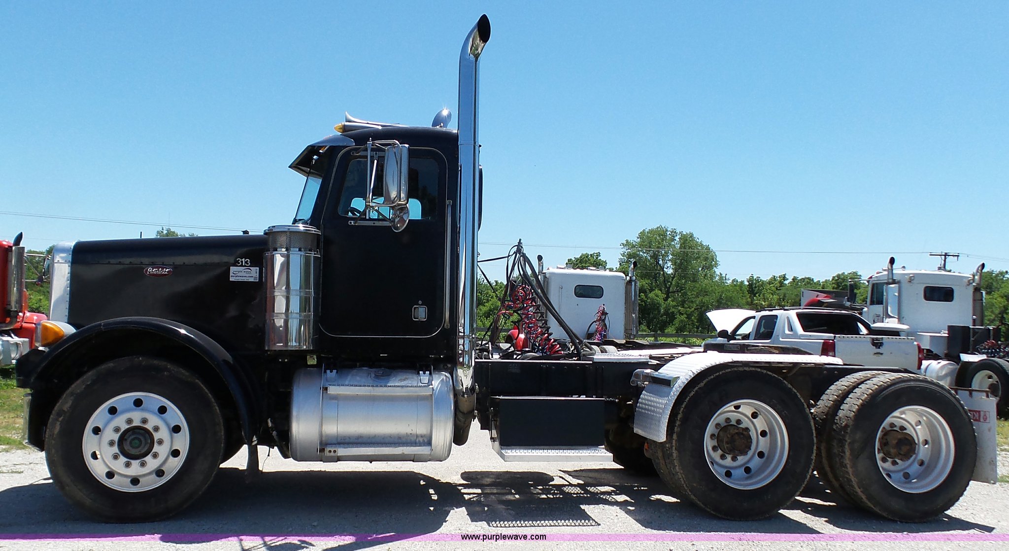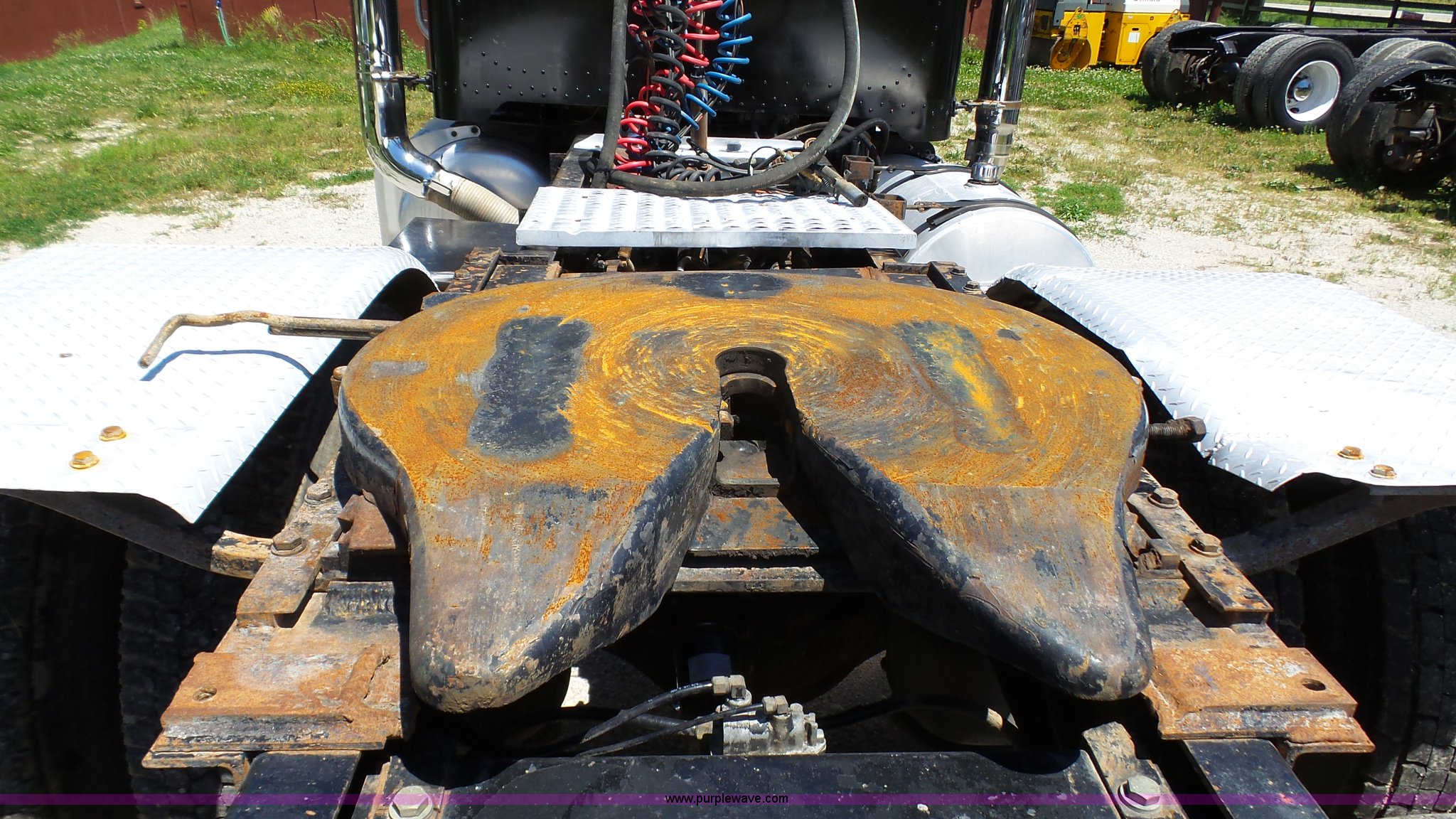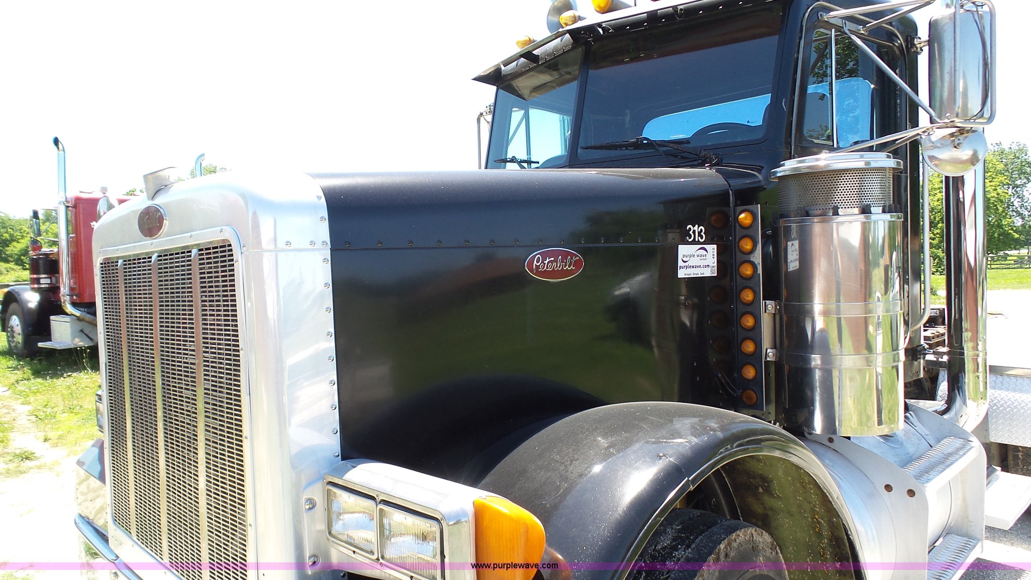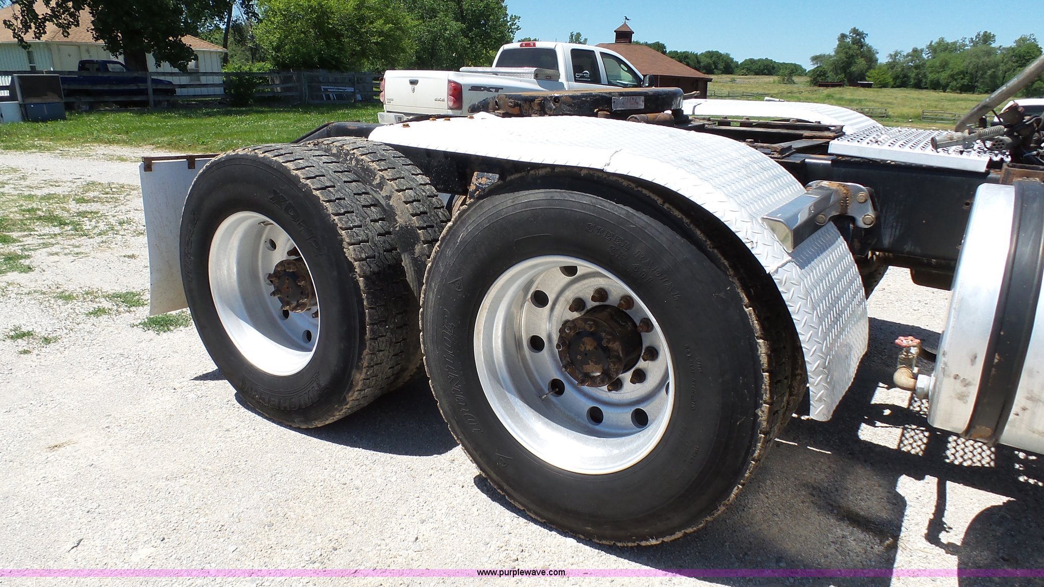 Purple Wave is selling a used Truck Tractor in Kansas. This item is a 1993 Peterbilt 379 semi truck with the following: 689,463 miles on odometer, Caterpillar 3406 14.6L L6 turbo diesel engine, 425 HP, Eaton Fuller 13 speed manual transmission, Tandem axle, Inter-axle differential lock, AC and heat, Tilt, AM, Air suspension seat, Exterior visor, PTO, Wet kit, Dump valves, Aluminum deck plate, Sliding fifth wheel plate, Dual exhaust stacks, Dual fuel tanks, Aluminum half fenders, 3:70 gear ratio, Air suspension, Air brakes, 11R24.5 tires, GVWR 50,000 lbs, FAWR 12,000 lbs, IAWR 19,000 lbs, RAWR 19,000 lbs, Rear glass cracked