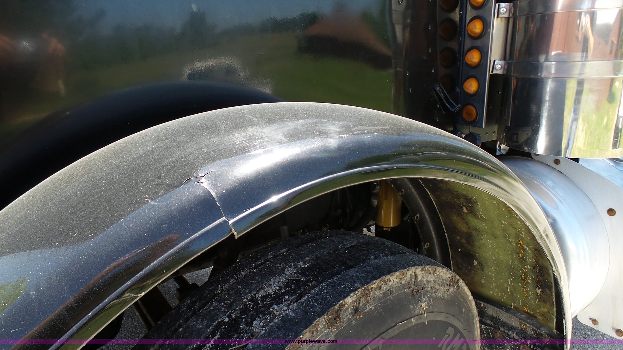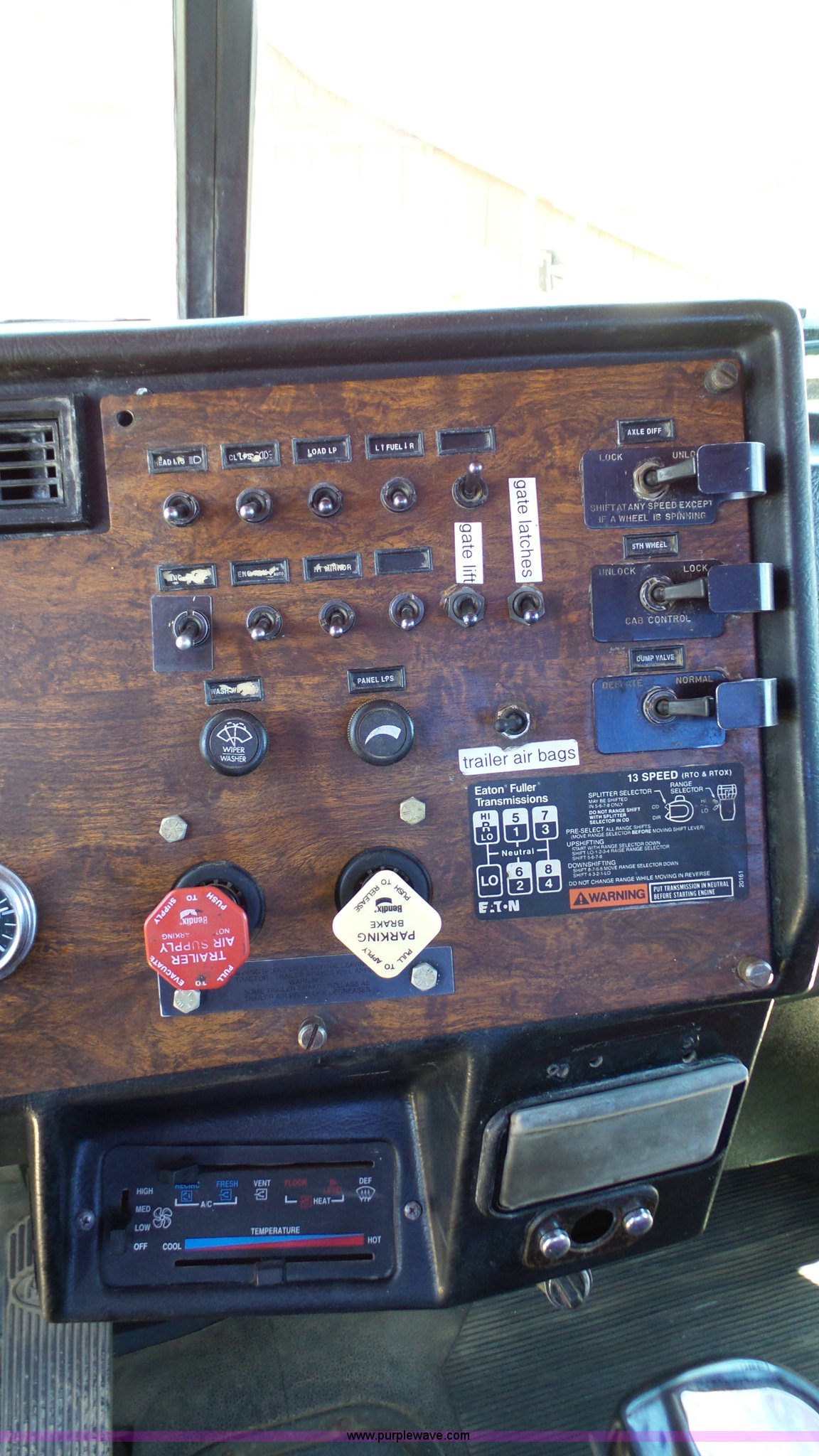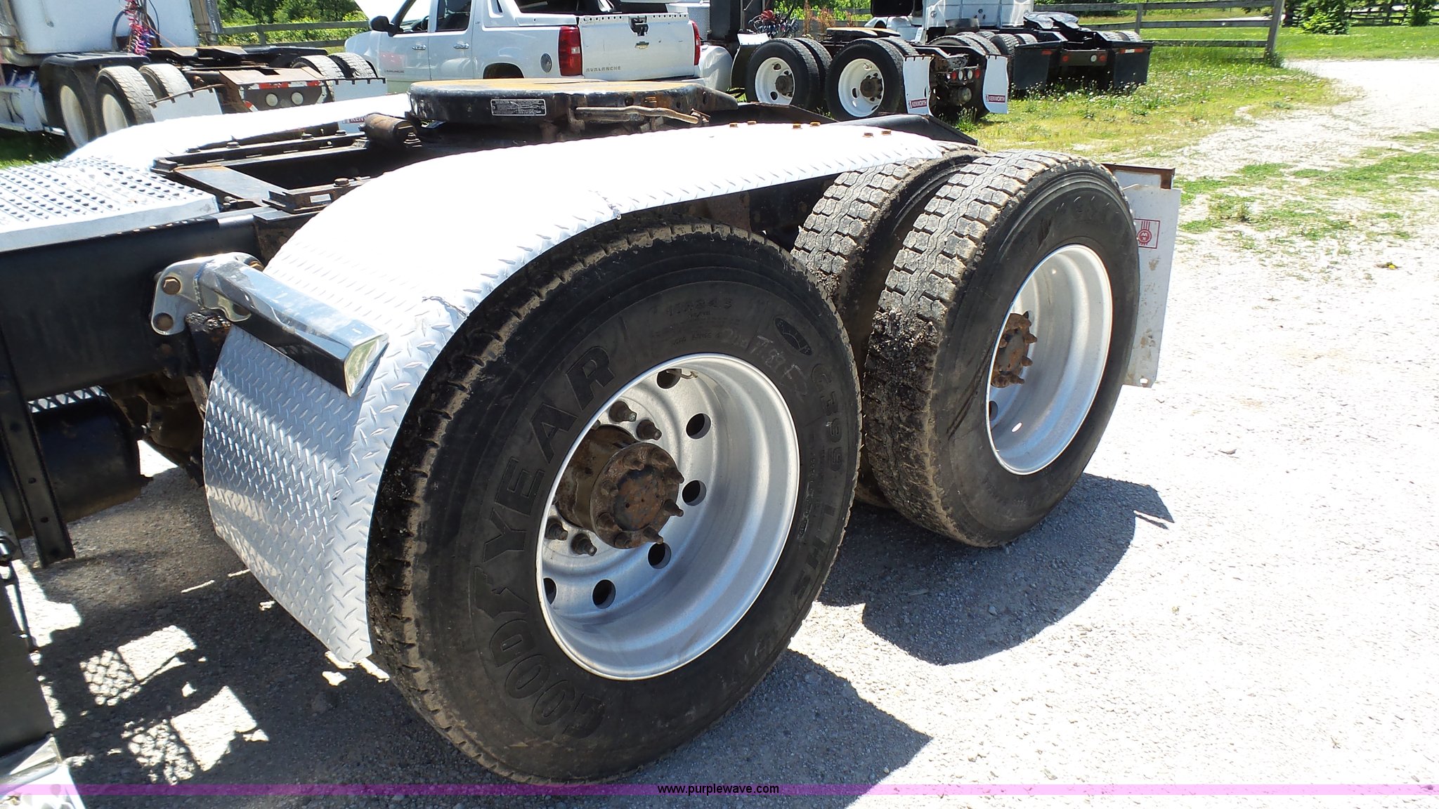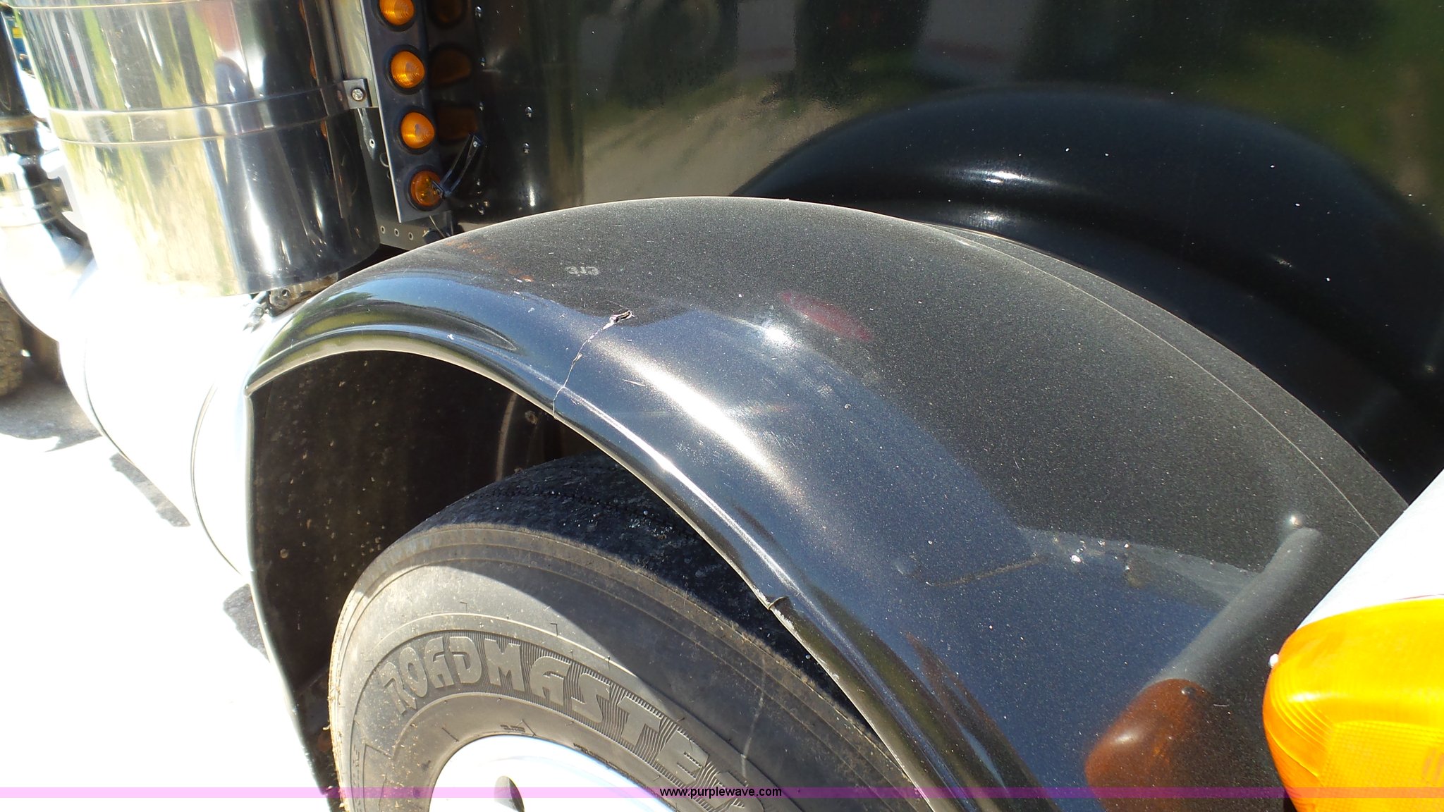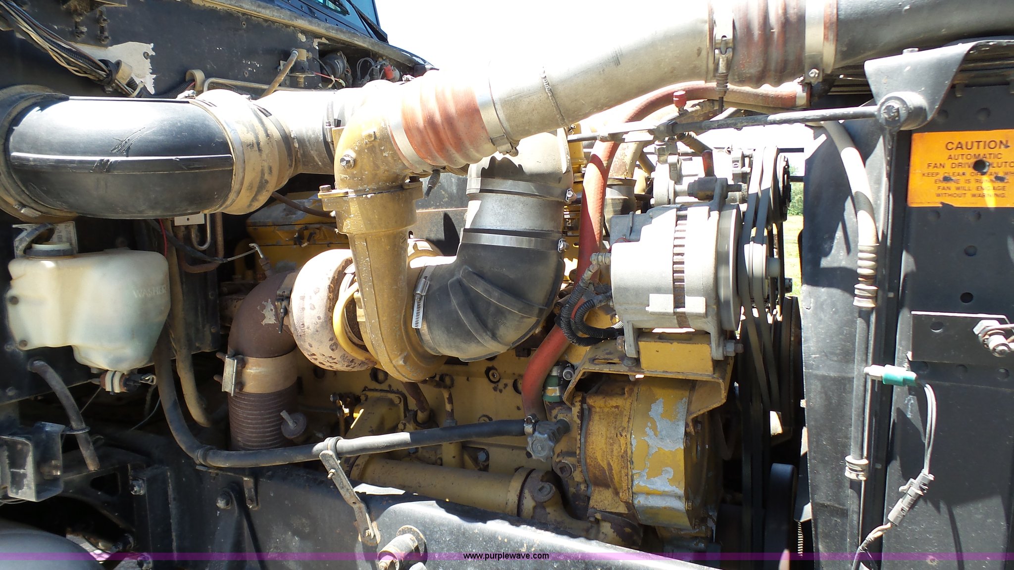 Purple Wave is selling a used Truck Tractor in Kansas. This item is a 1993 Peterbilt 379 semi truck with the following: 689,463 miles on odometer, Caterpillar 3406 14.6L L6 turbo diesel engine, 425 HP, Eaton Fuller 13 speed manual transmission, Tandem axle, Inter-axle differential lock, AC and heat, Tilt, AM, Air suspension seat, Exterior visor, PTO, Wet kit, Dump valves, Aluminum deck plate, Sliding fifth wheel plate, Dual exhaust stacks, Dual fuel tanks, Aluminum half fenders, 3:70 gear ratio, Air suspension, Air brakes, 11R24.5 tires, GVWR 50,000 lbs, FAWR 12,000 lbs, IAWR 19,000 lbs, RAWR 19,000 lbs, Rear glass cracked