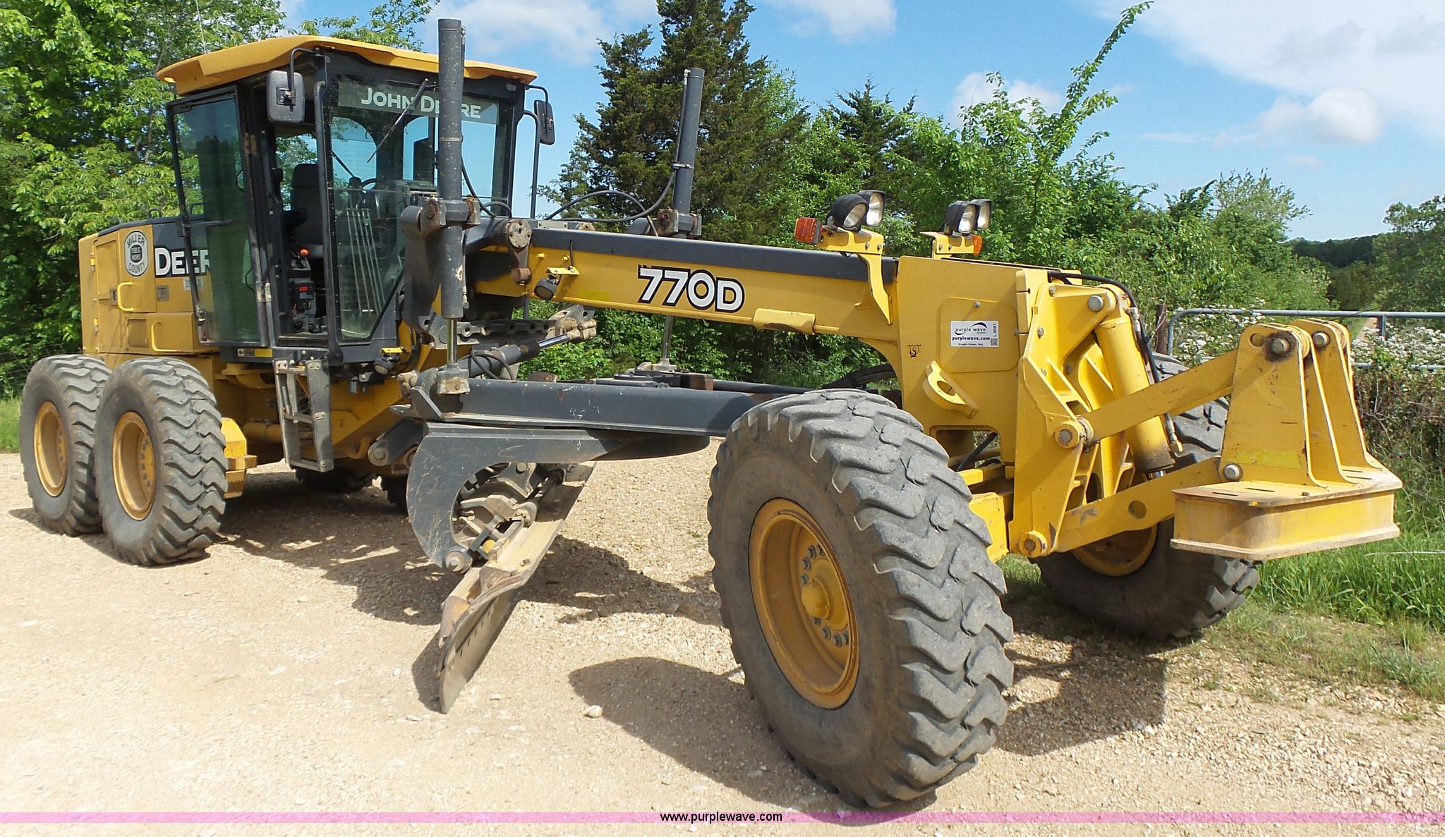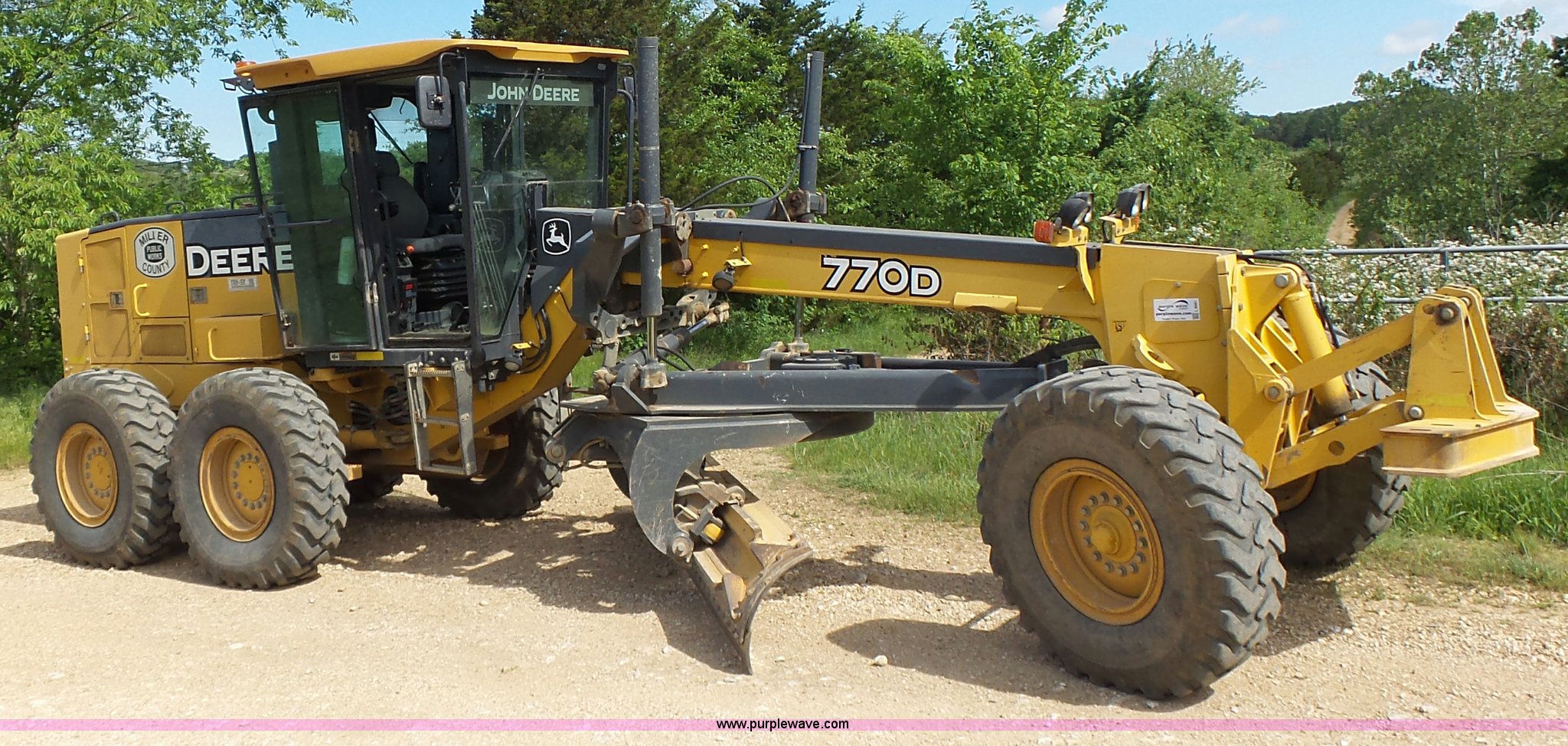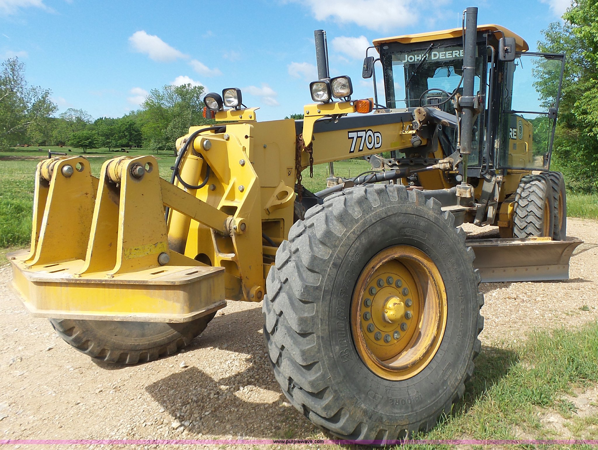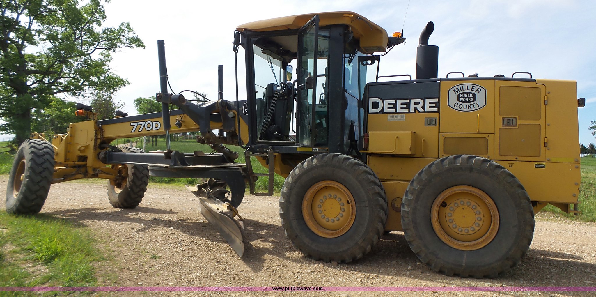Purple Wave is selling a used Motor Grader in Missouri. This item is a 2005 John Deere 770D motor grader with the following: 8,546 hours on meter, Hours may vary, still in use, John Deere six cylinder turbo diesel engine, Re-manufactured engine installed at 6,000 hours, Serial SE6081H390424, 8F-8R gears, Differential lock, Enclosed cab, AC and heat, Suspension seat, Front work lights, 14'W moldboard, Tip control, Side shift, Front mounted scarifier, 14.00-24 tires, 32,670 lbs. base operating weight, Serial DW770DX597779