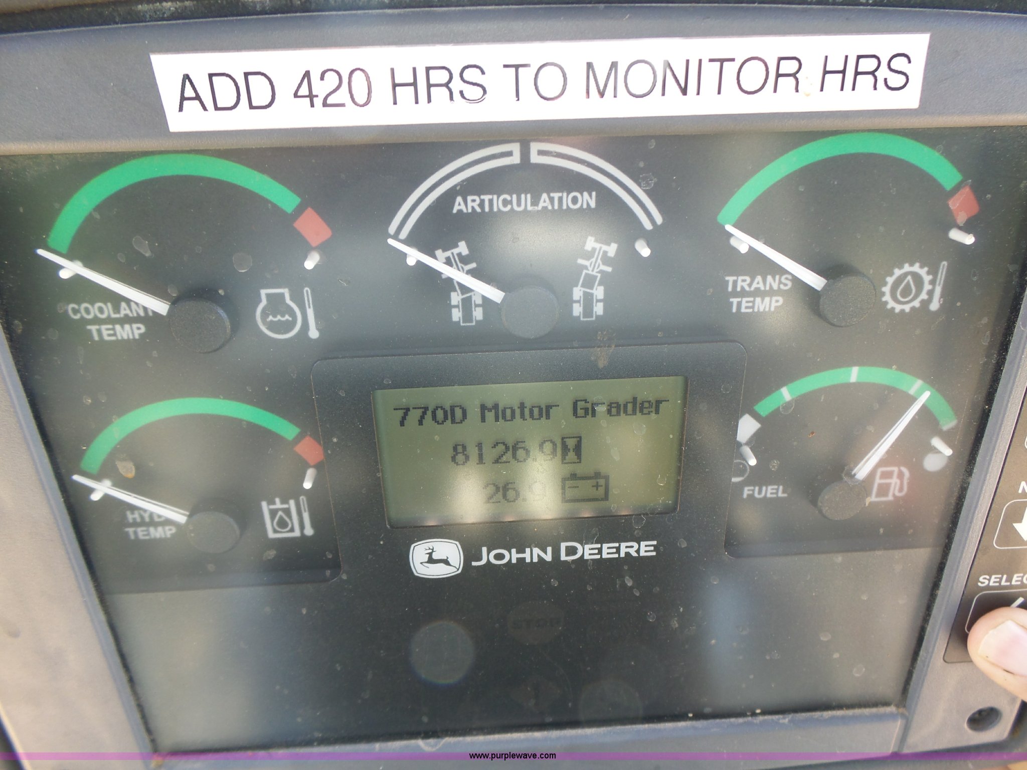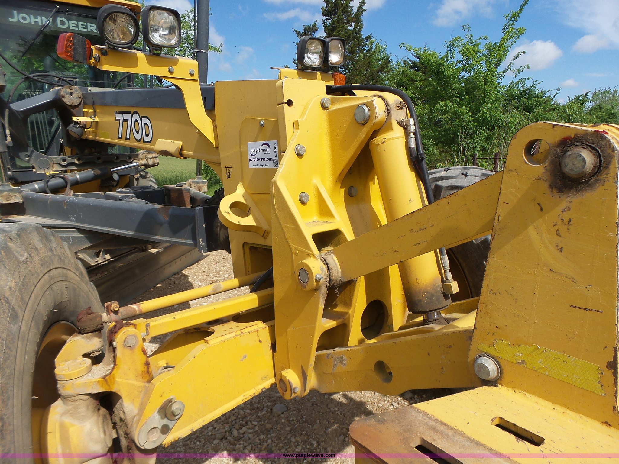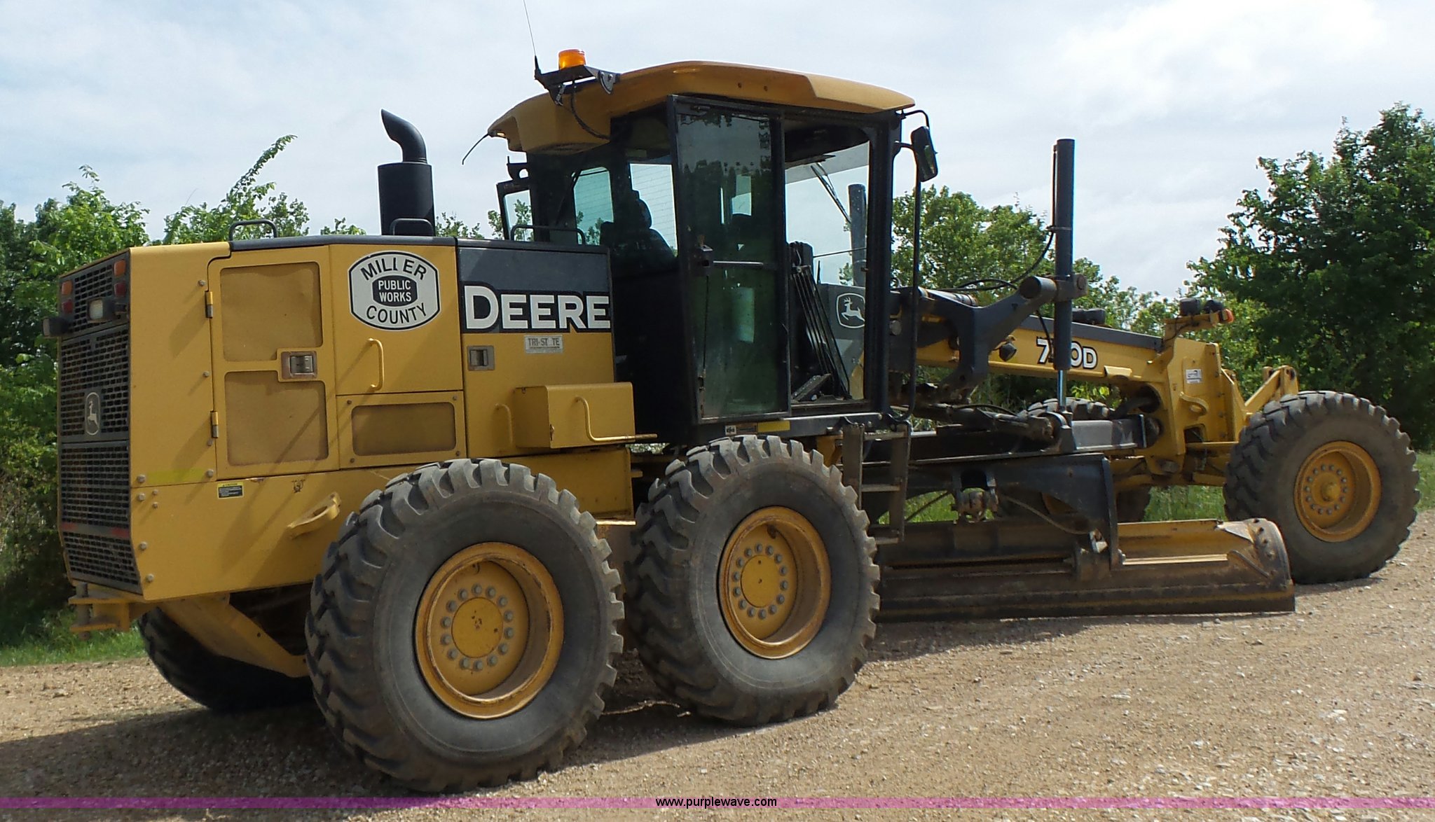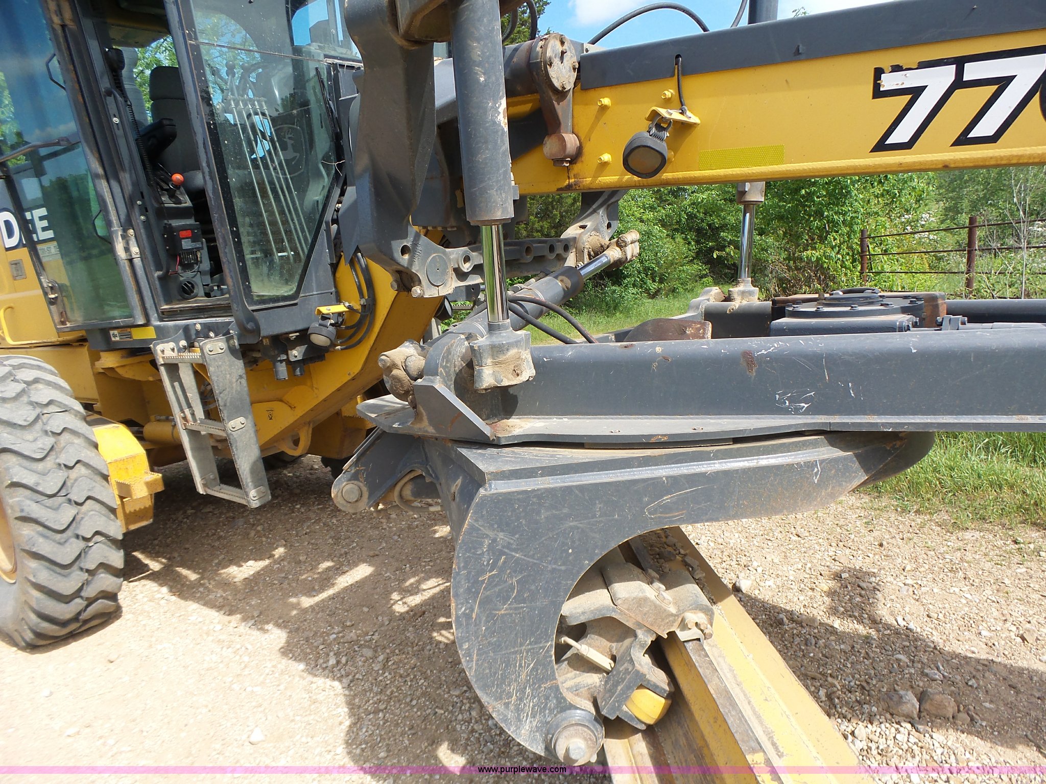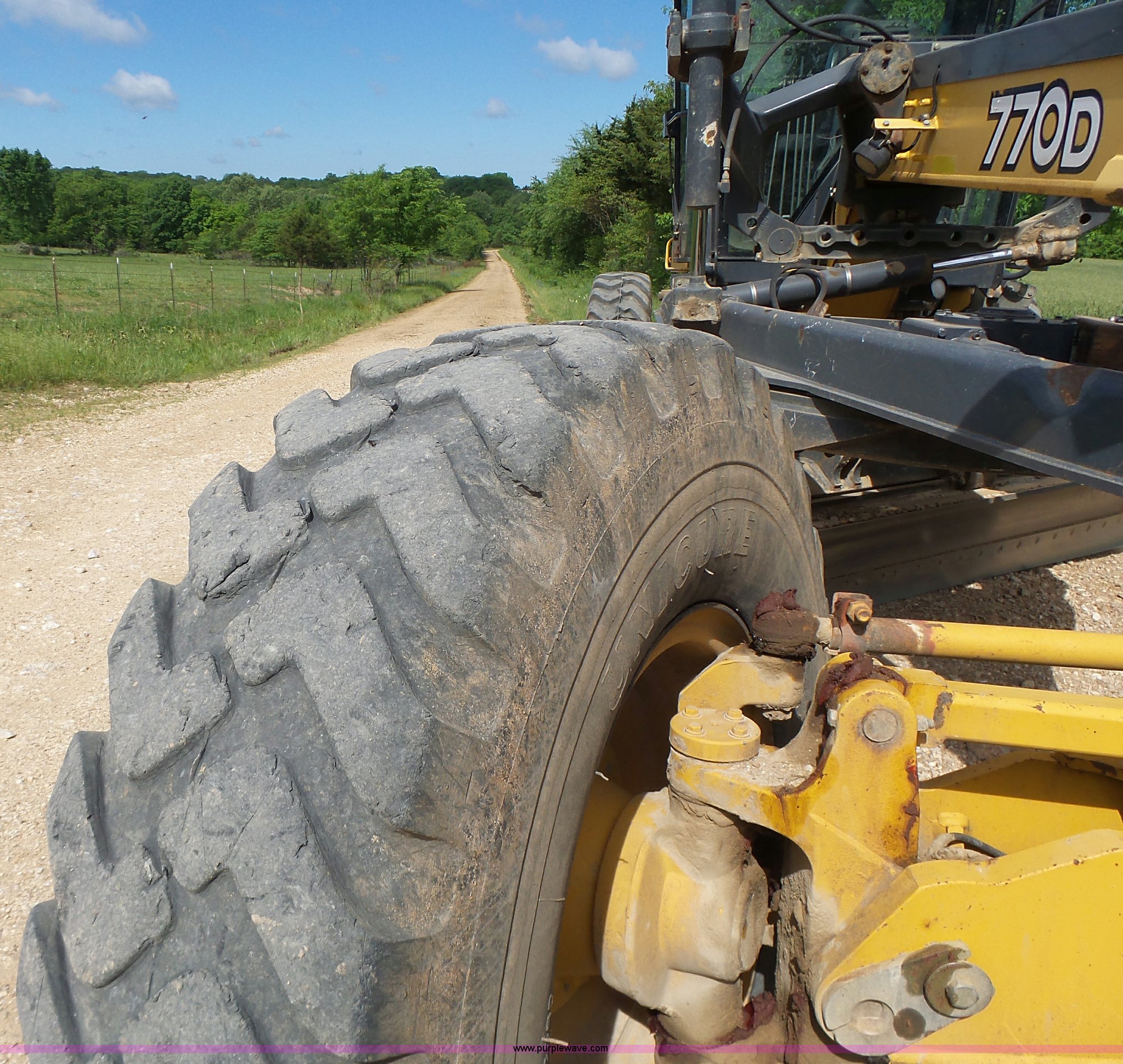 Purple Wave is selling a used Motor Grader in Missouri. This item is a 2005 John Deere 770D motor grader with the following: 8,546 hours on meter, Hours may vary, still in use, John Deere six cylinder turbo diesel engine, Re-manufactured engine installed at 6,000 hours, Serial SE6081H390424, 8F-8R gears, Differential lock, Enclosed cab, AC and heat, Suspension seat, Front work lights, 14'W moldboard, Tip control, Side shift, Front mounted scarifier, 14.00-24 tires, 32,670 lbs. base operating weight, Serial DW770DX597779