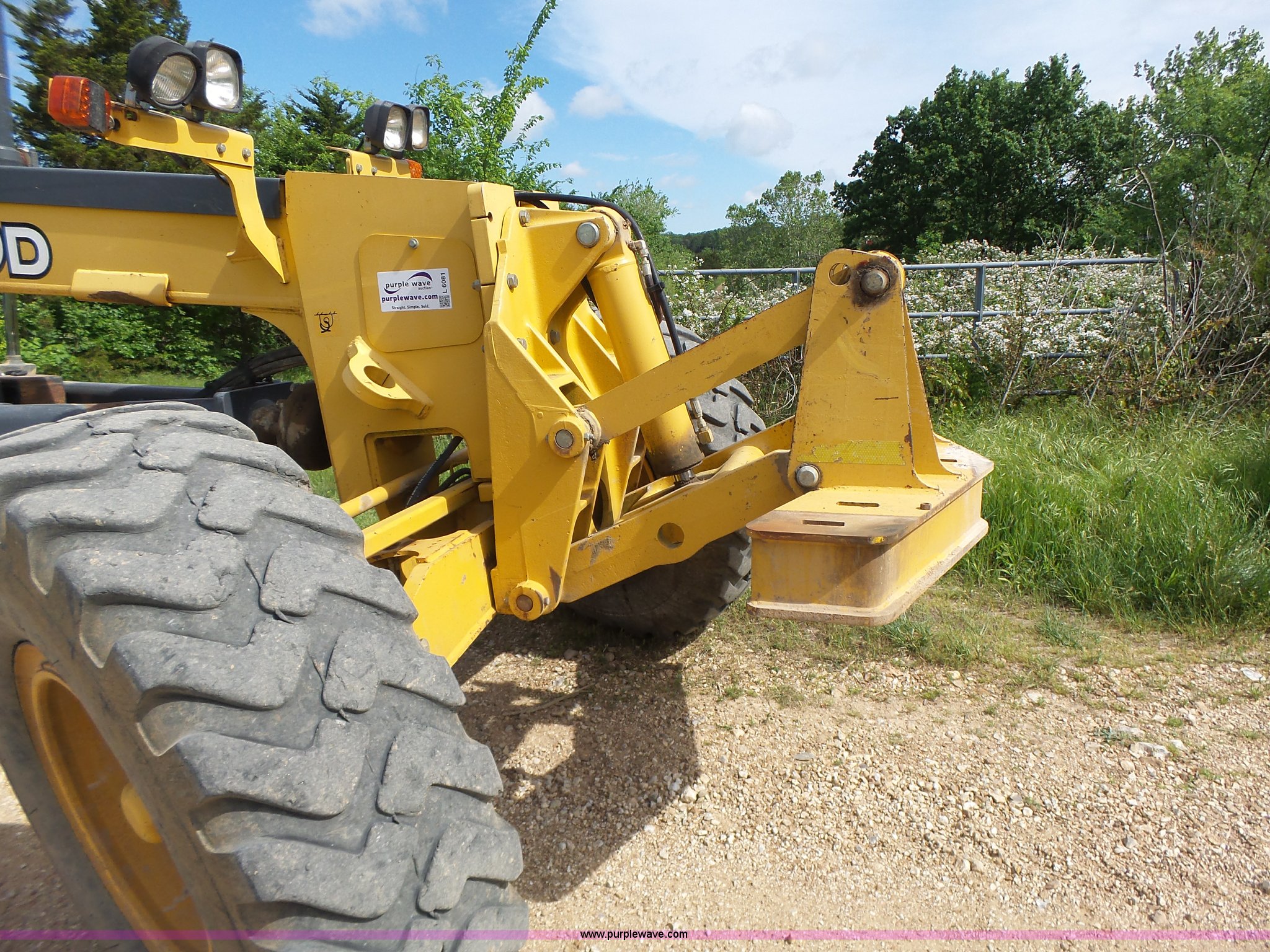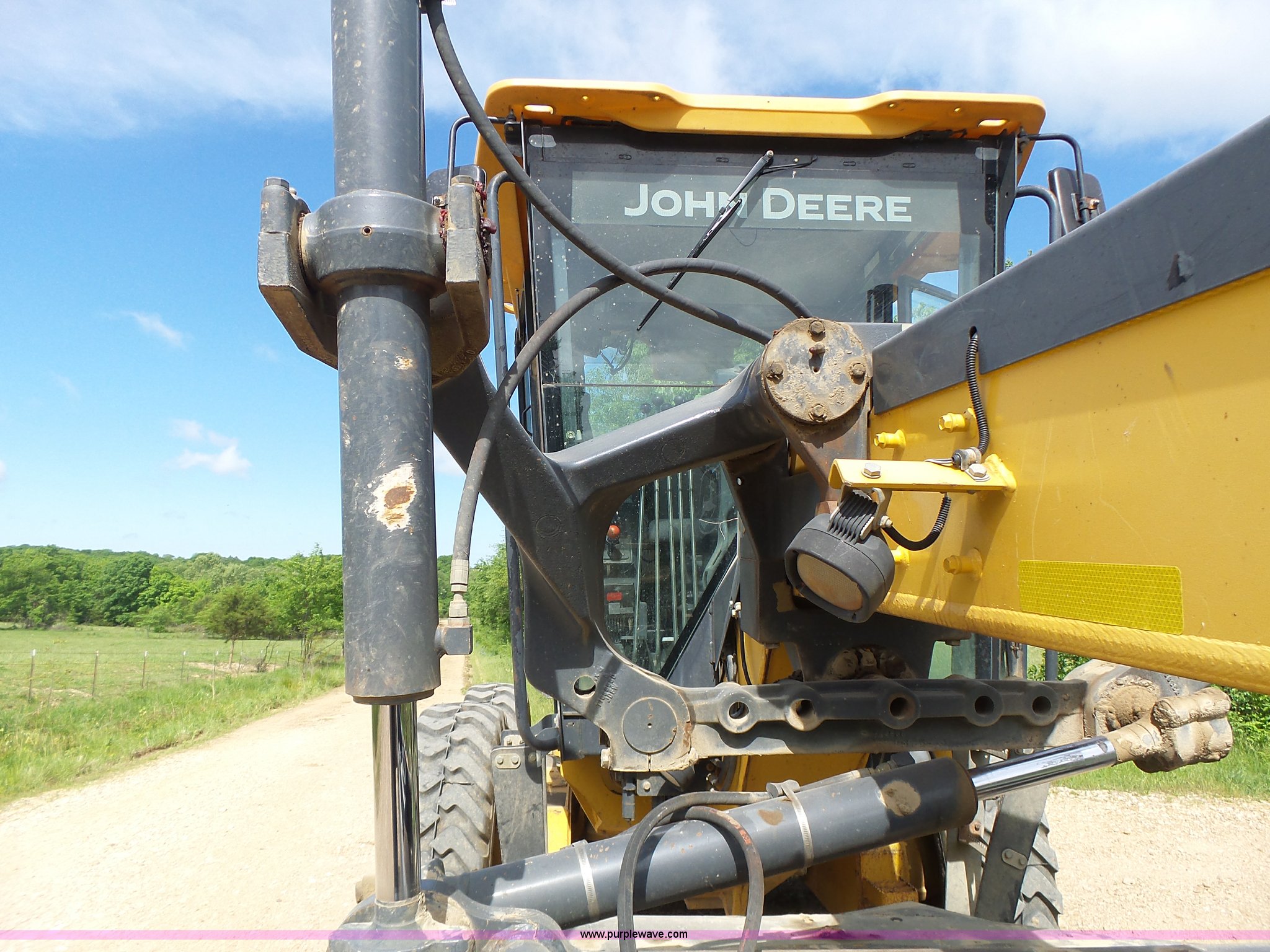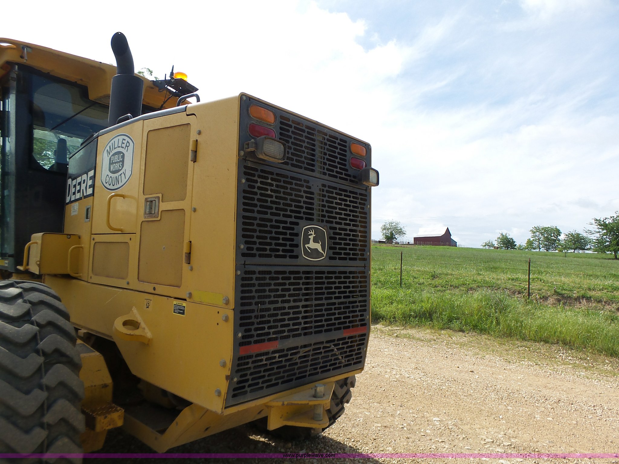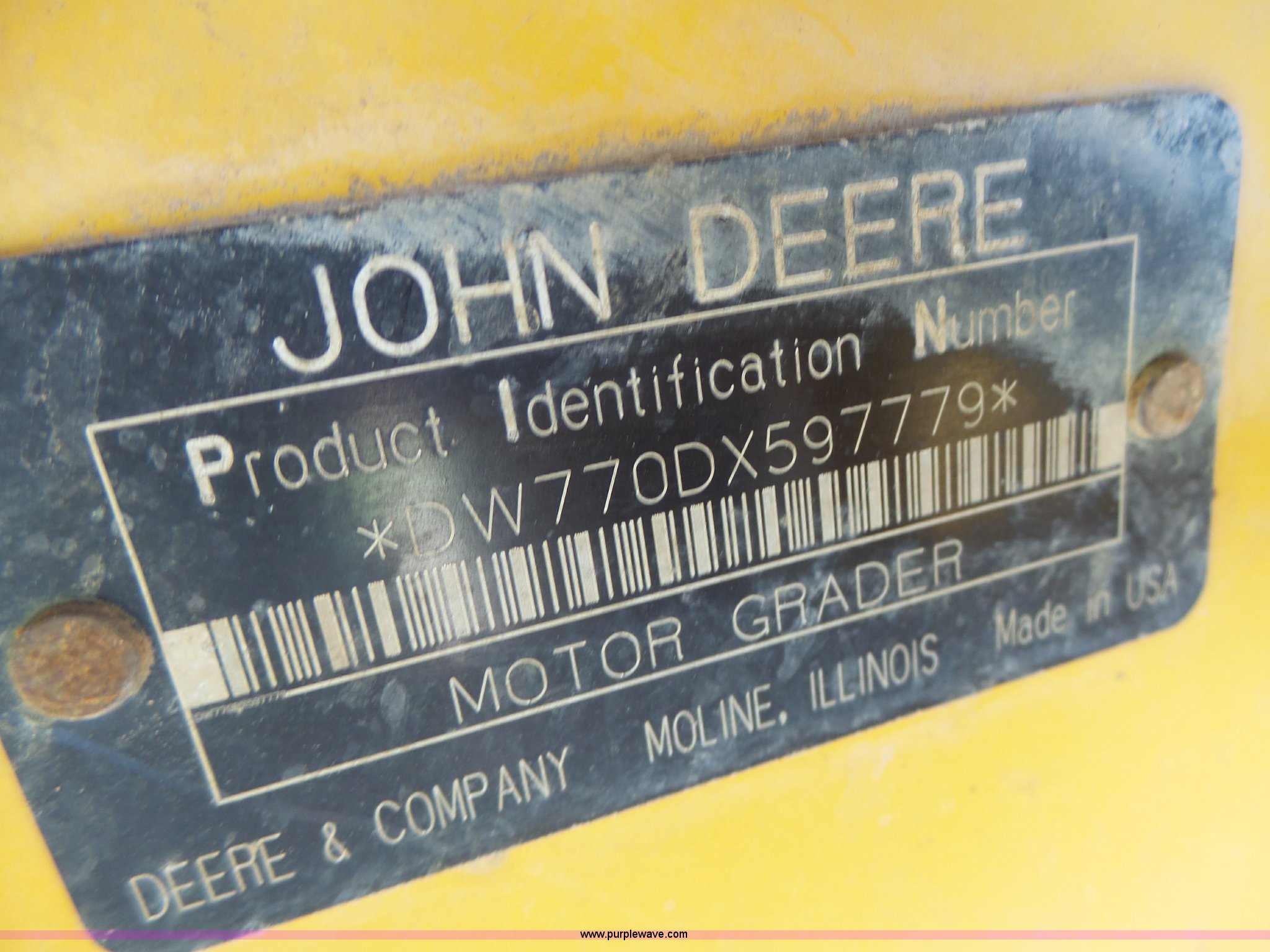 Purple Wave is selling a used Motor Grader in Missouri. This item is a 2005 John Deere 770D motor grader with the following: 8,546 hours on meter, Hours may vary, still in use, John Deere six cylinder turbo diesel engine, Re-manufactured engine installed at 6,000 hours, Serial SE6081H390424, 8F-8R gears, Differential lock, Enclosed cab, AC and heat, Suspension seat, Front work lights, 14'W moldboard, Tip control, Side shift, Front mounted scarifier, 14.00-24 tires, 32,670 lbs. base operating weight, Serial DW770DX597779