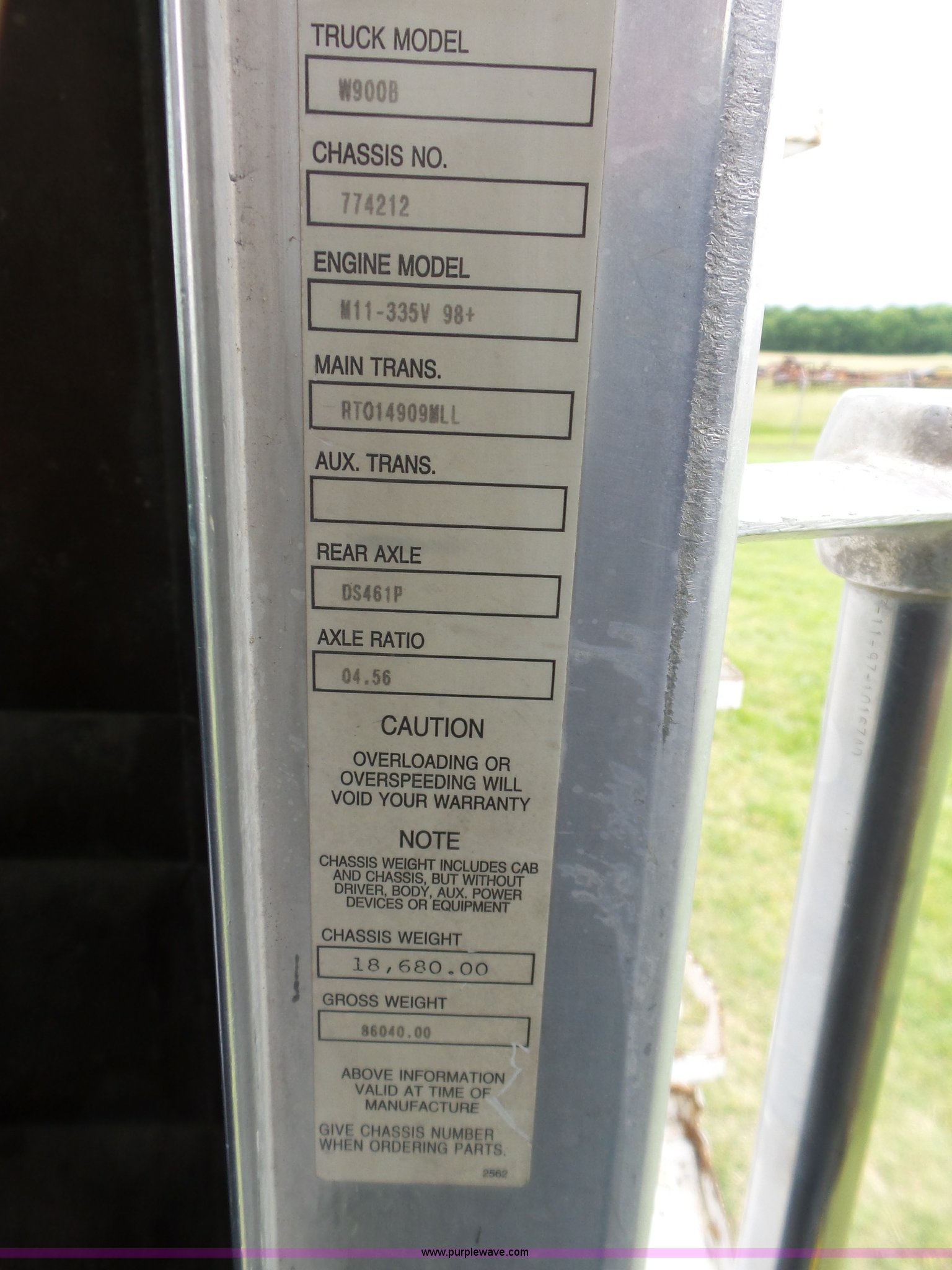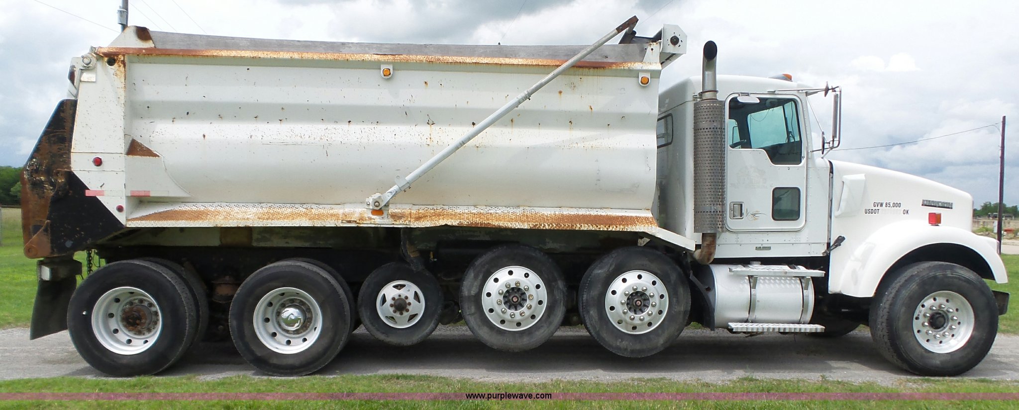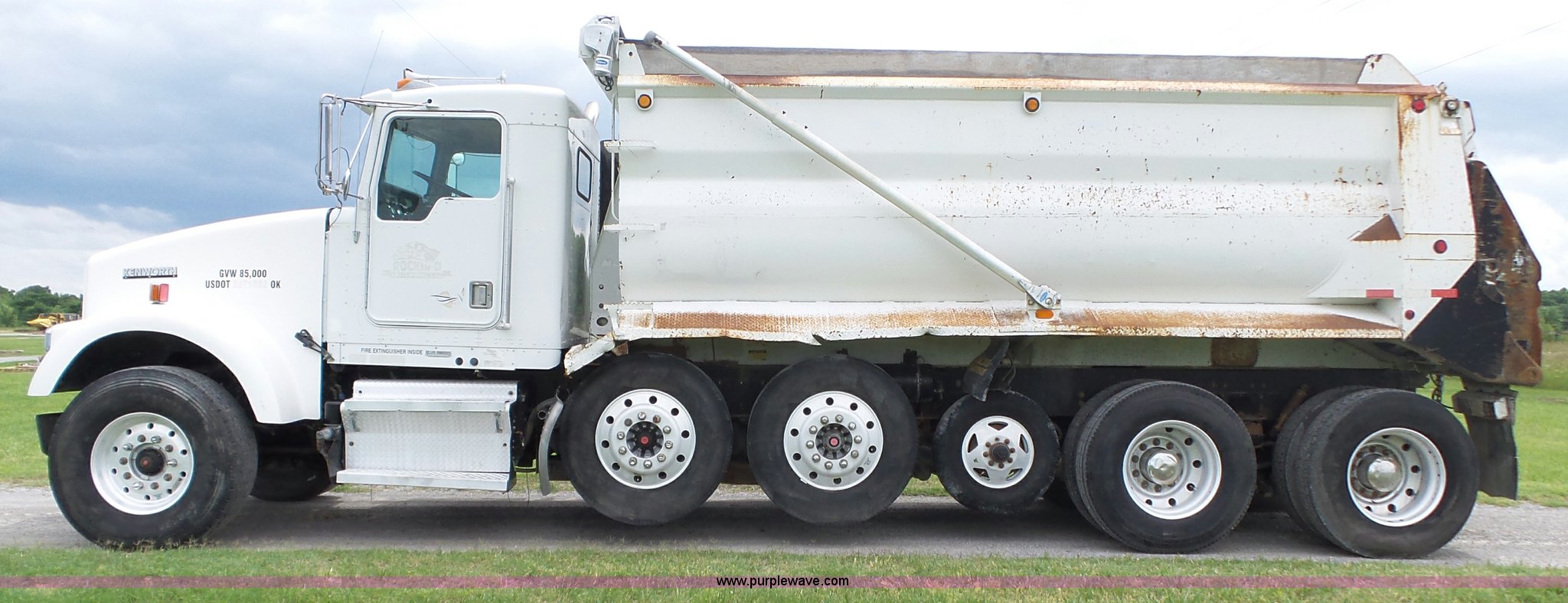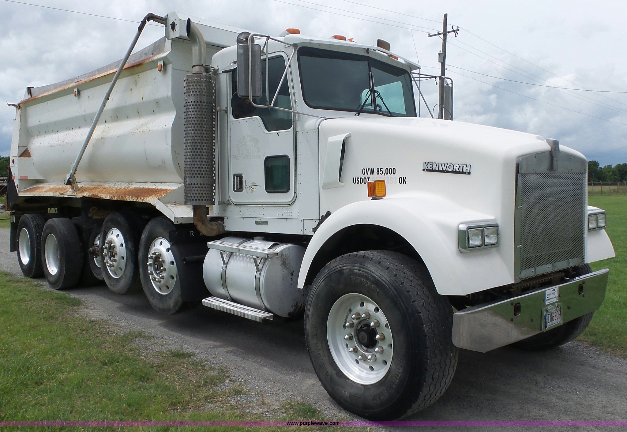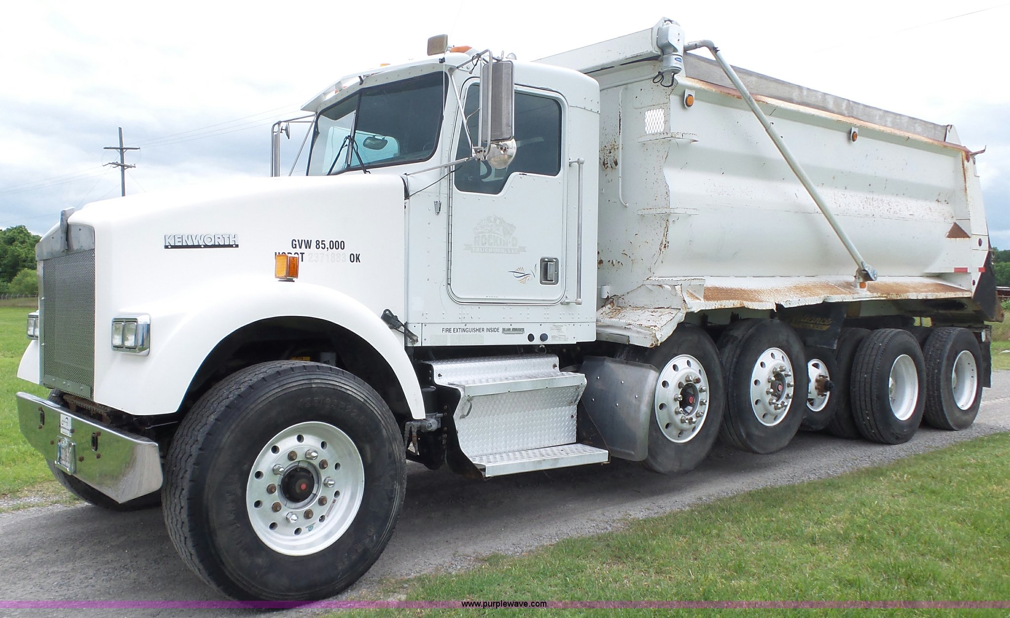 Purple Wave is selling a used Construction Dump Truck in Oklahoma. This item is a 1998 Kenworth W900 dump truck with the following: 764,061 miles on odometer, 2,829 hours on meter, Cummins M11 10.8L L6 turbo diesel engine, 15 speed manual transmission, Five axles, Inter-axle differential lock, AC and heat, Tilt, Telescoping steering wheel, Cruise, AM/FM/weatherband, Exterior visor, PTO, Steel dump bed, 18'L x 8'W, 50" side height, 9" sideboard height, Single ram hoist, Air operated end gate, Electric roll-over tarp, Walking beam suspension, Air brakes, Engine brake, 425/65R22.5 front tires, 11R22.5 rear tires, GVWR 86,040 lbs, FAWR 18,000 lbs, IAWR 23,000 lbs, RAWR 23,000 lbs