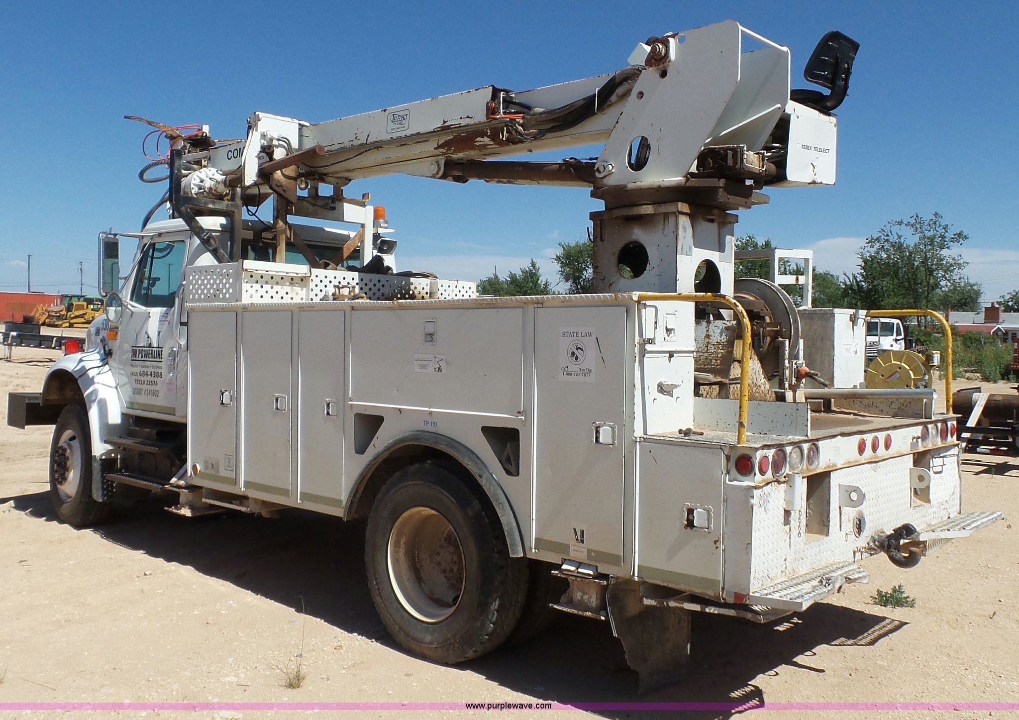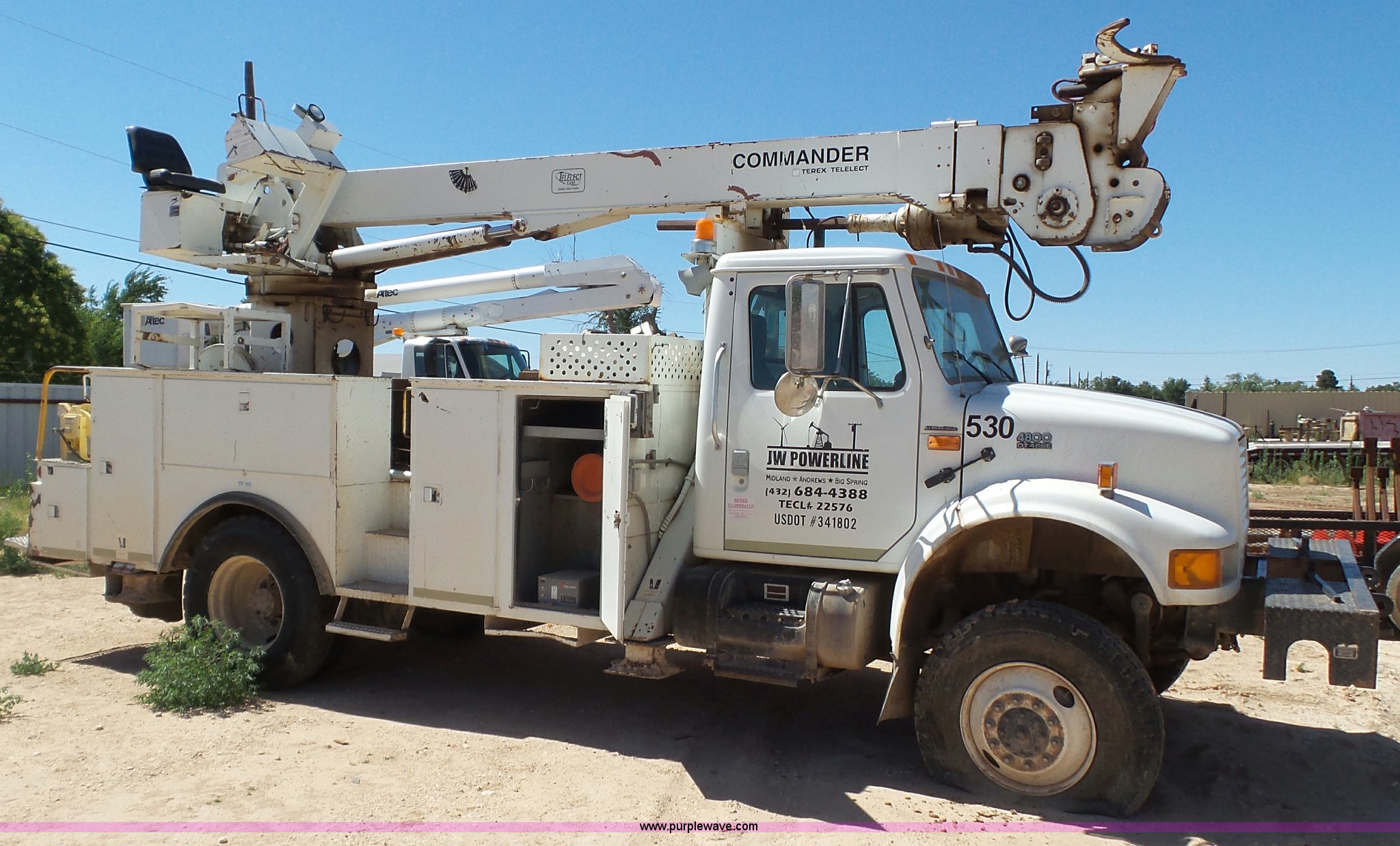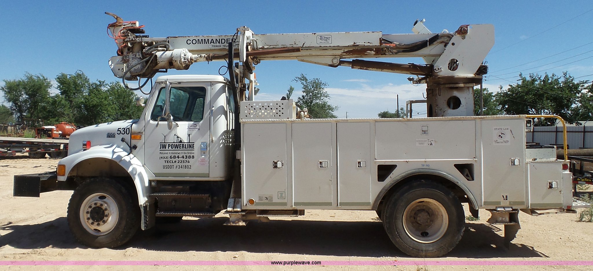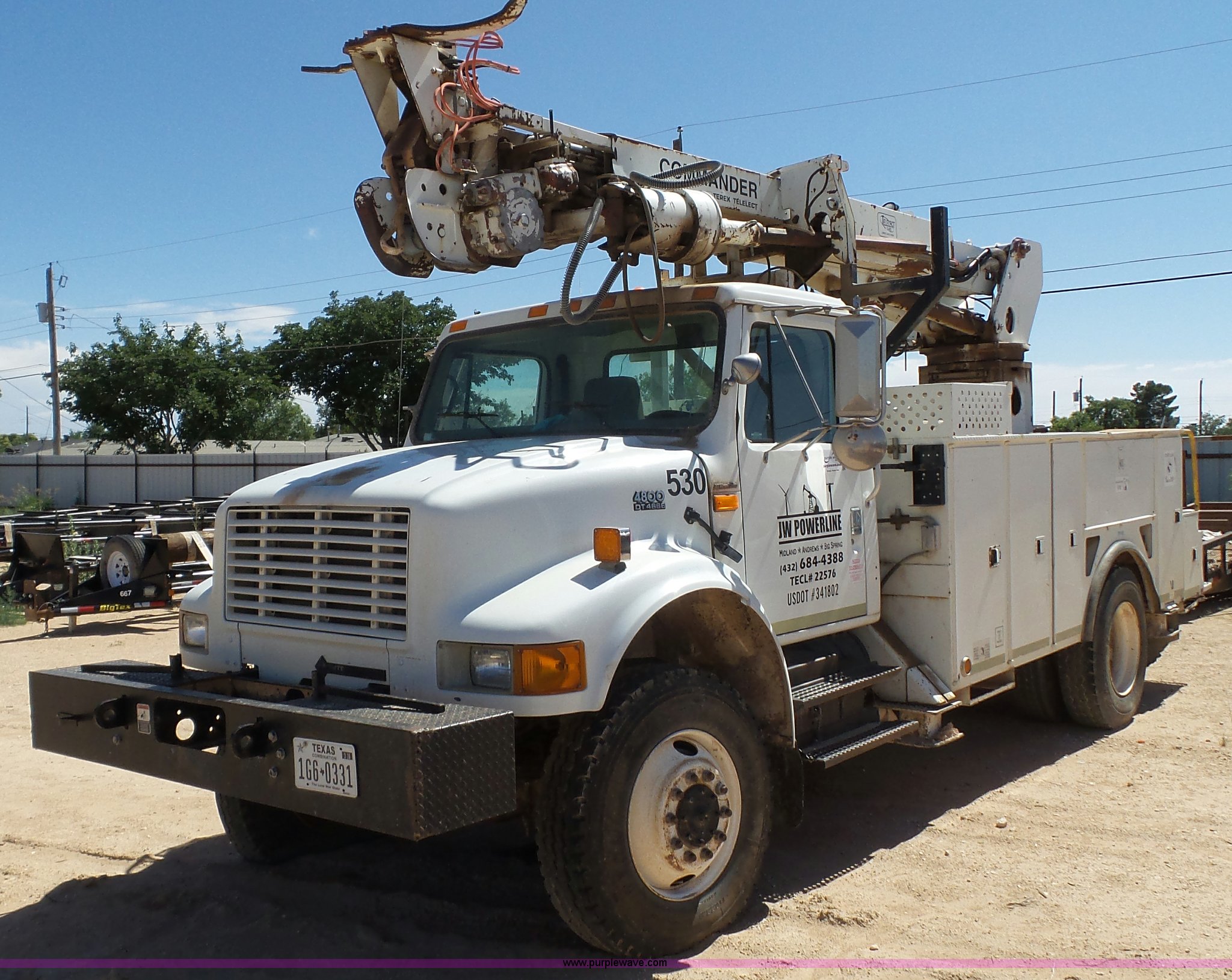 Purple Wave is selling a used Digger Derrick Truck in Texas. This item is a 1999 International 4800 digger derrick truck with the following: 415,196 miles on odometer, International DT466 7.6L L6 turbo diesel engine, Four wheel drive, Single axle, AC and heat, AM/FM, Backup alarm, Front tow hooks, Service bed, Shelving, Utility rack, Pintle hitch, Trailer wiring, Terex Telect boom, Ground boom controls, Boom rotation, Material handler, Telescopic articulating boom, Single fuel tank, Spring suspension, Air brakes, 11R22.5 tires, Unknown operating condition, Unit# 530