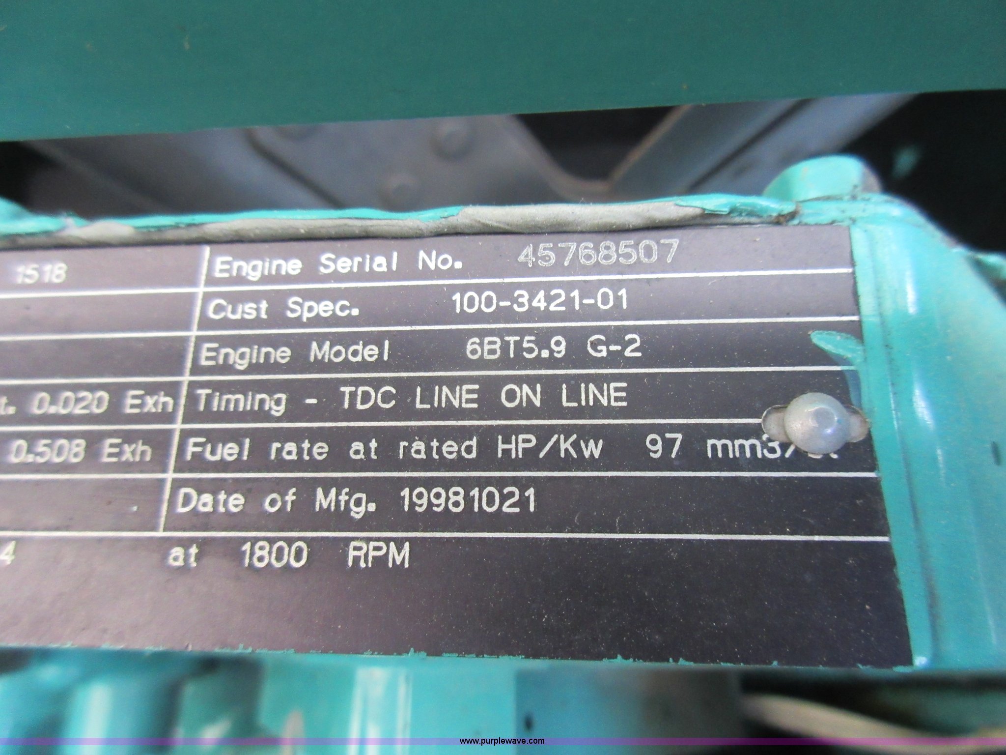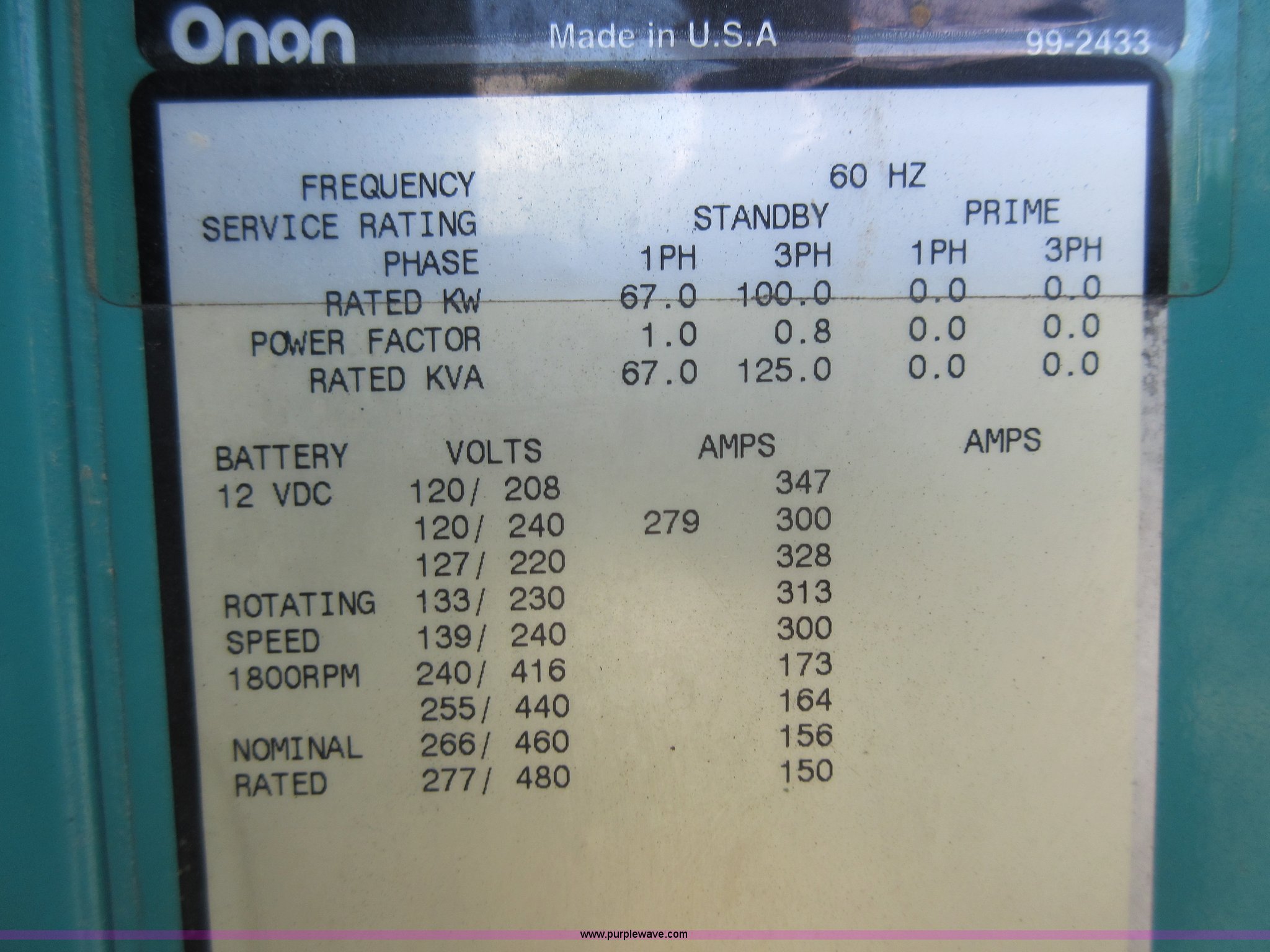 Onan 100DGDB generator. 417 hours on meter, Cummins 5.9L L6 turbo diesel engine Serial 45768507, 100 kW, Currently set up for 277/480V three phase May be reconnected to single phase or other three phase voltage, Standby take-out unit, Unit has been serviced and load bank tested, Serial J980816872. Central Power Systems & Services. 1900 Plumbers Way. Liberty, MO 64068