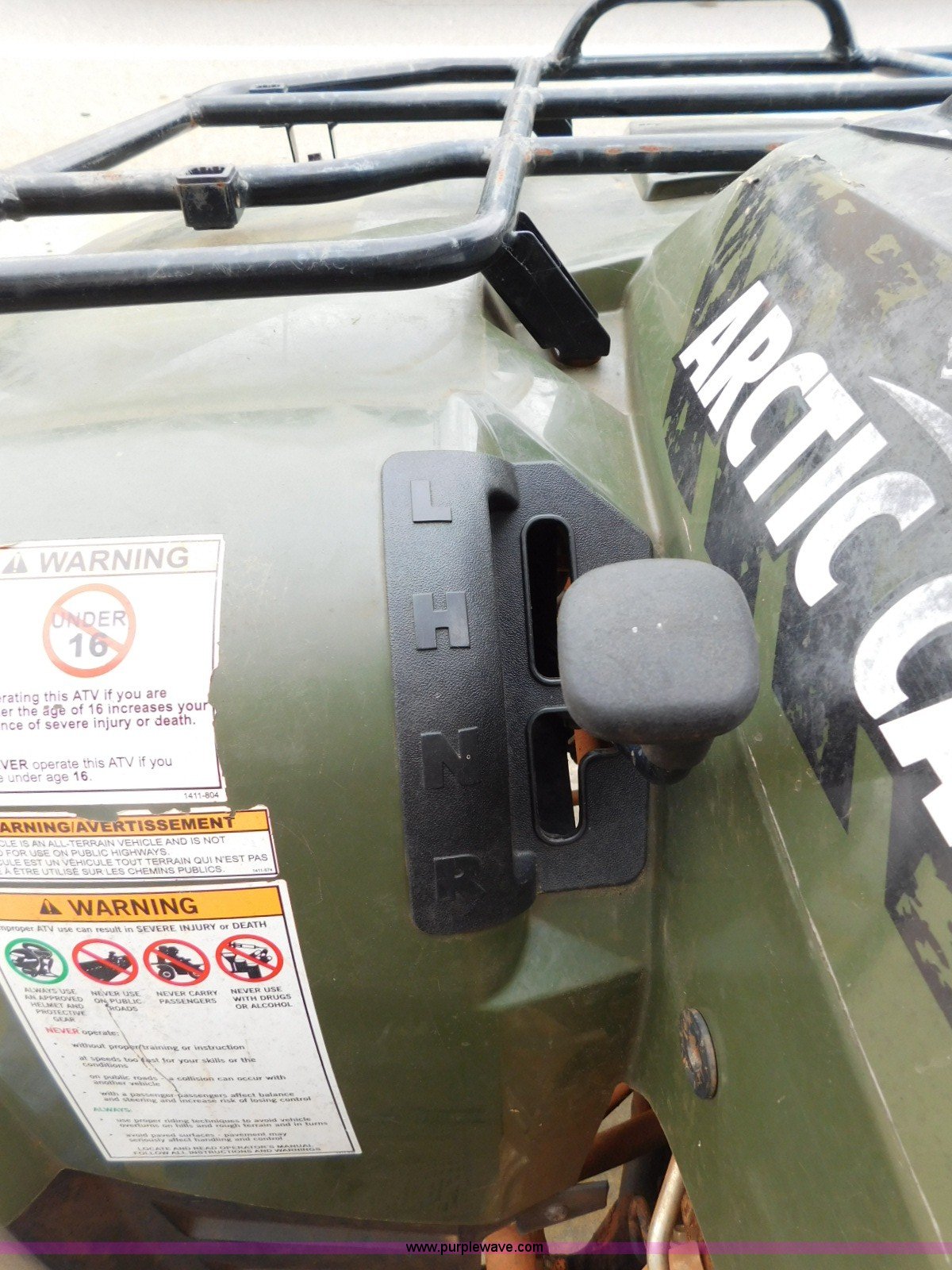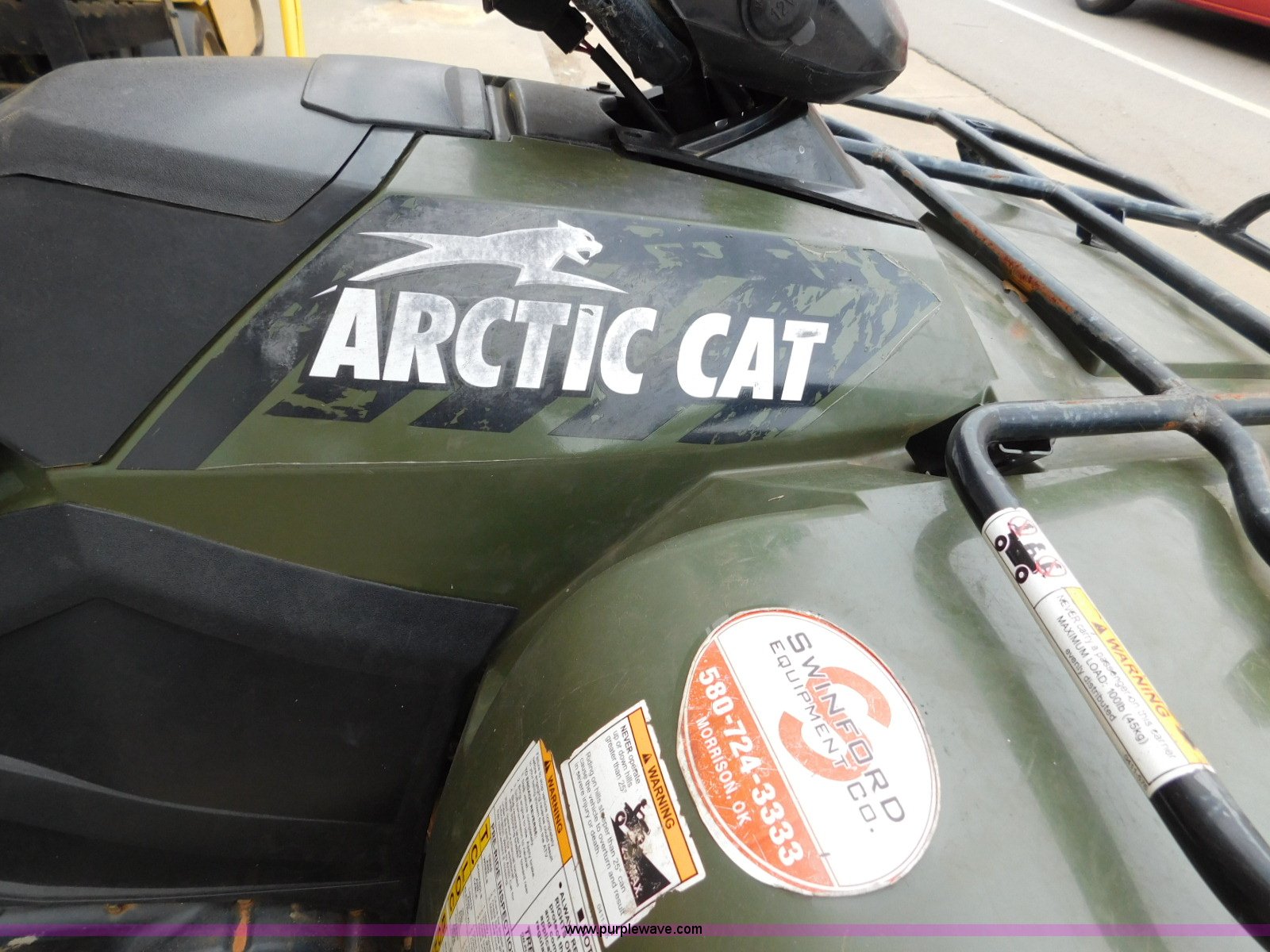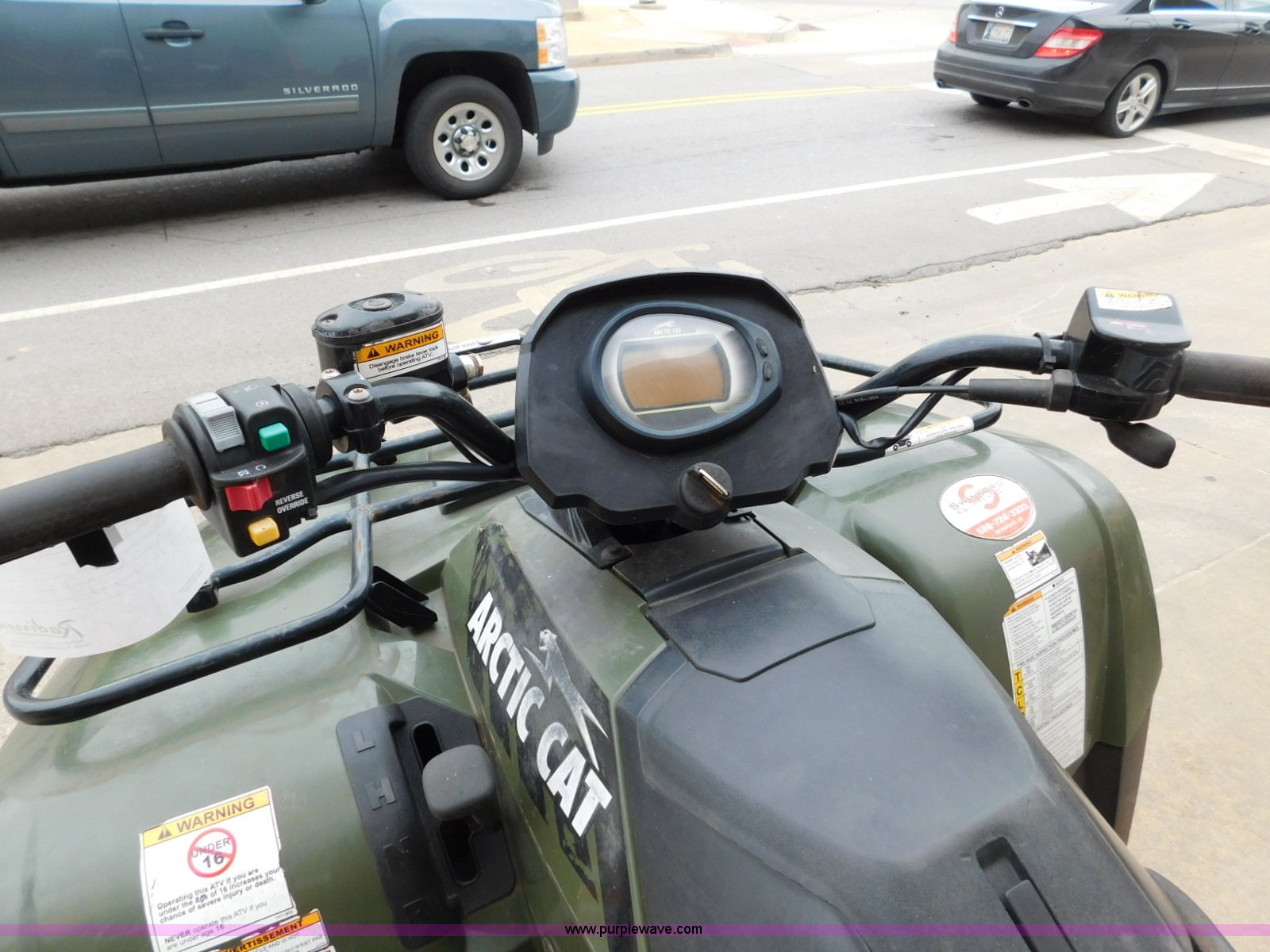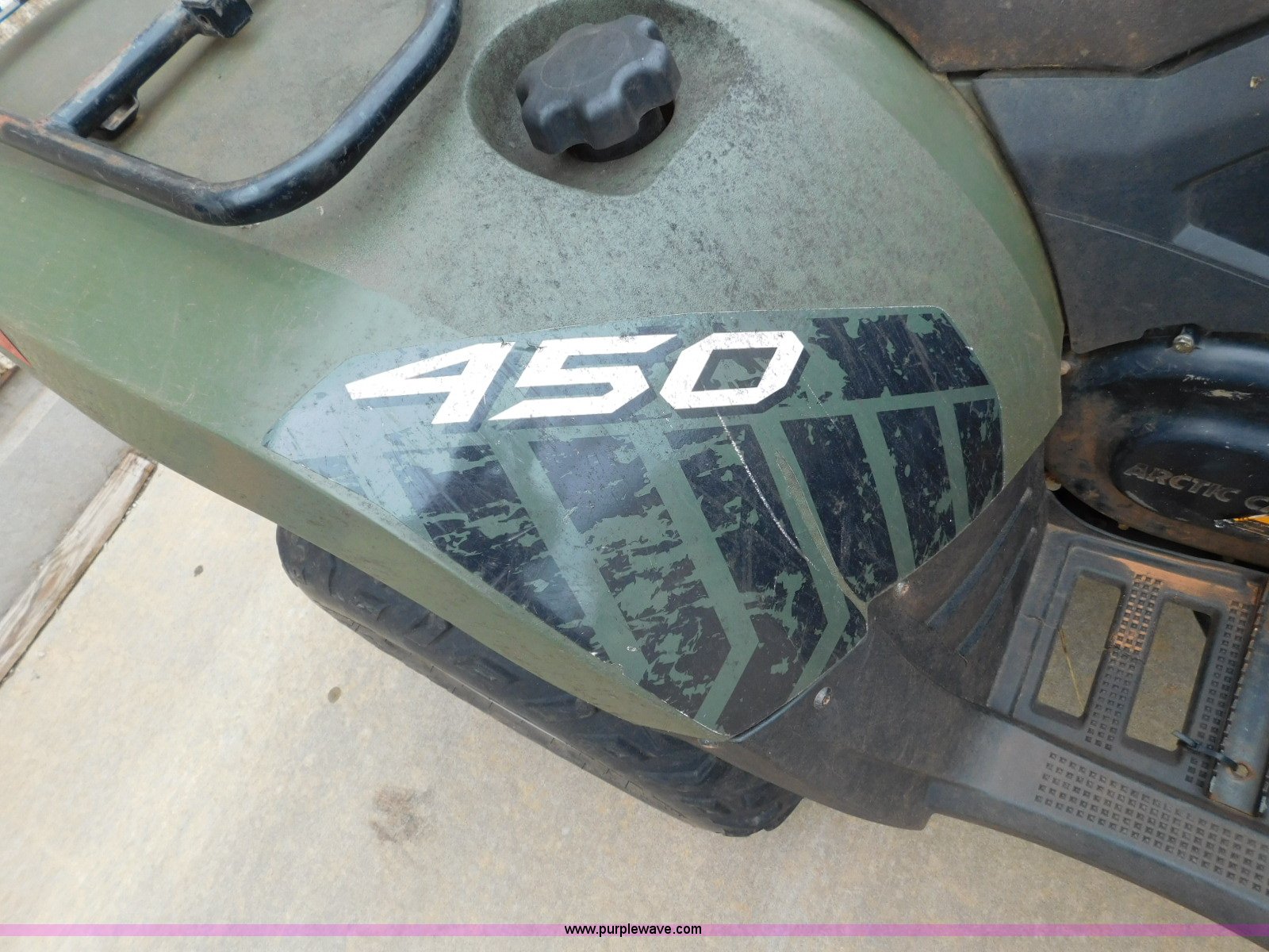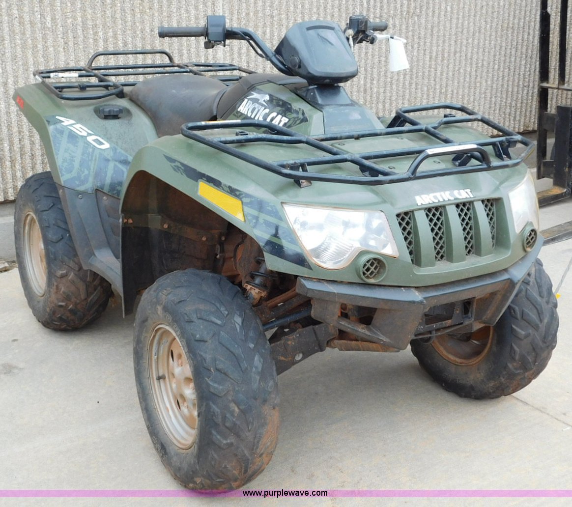 Purple Wave is selling a used ATV in Oklahoma. This item is a 2012 Arctic Cat 450 ATV with the following: Unknown hours on meter, 450cc single cylinder gas engine, Automatic transmission, Four wheel drive, 25x8-12 front tires, 25x10-12 rear tires, Unknown operating condition