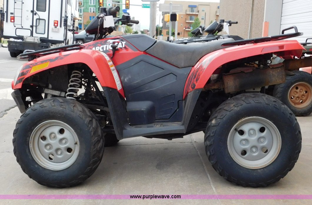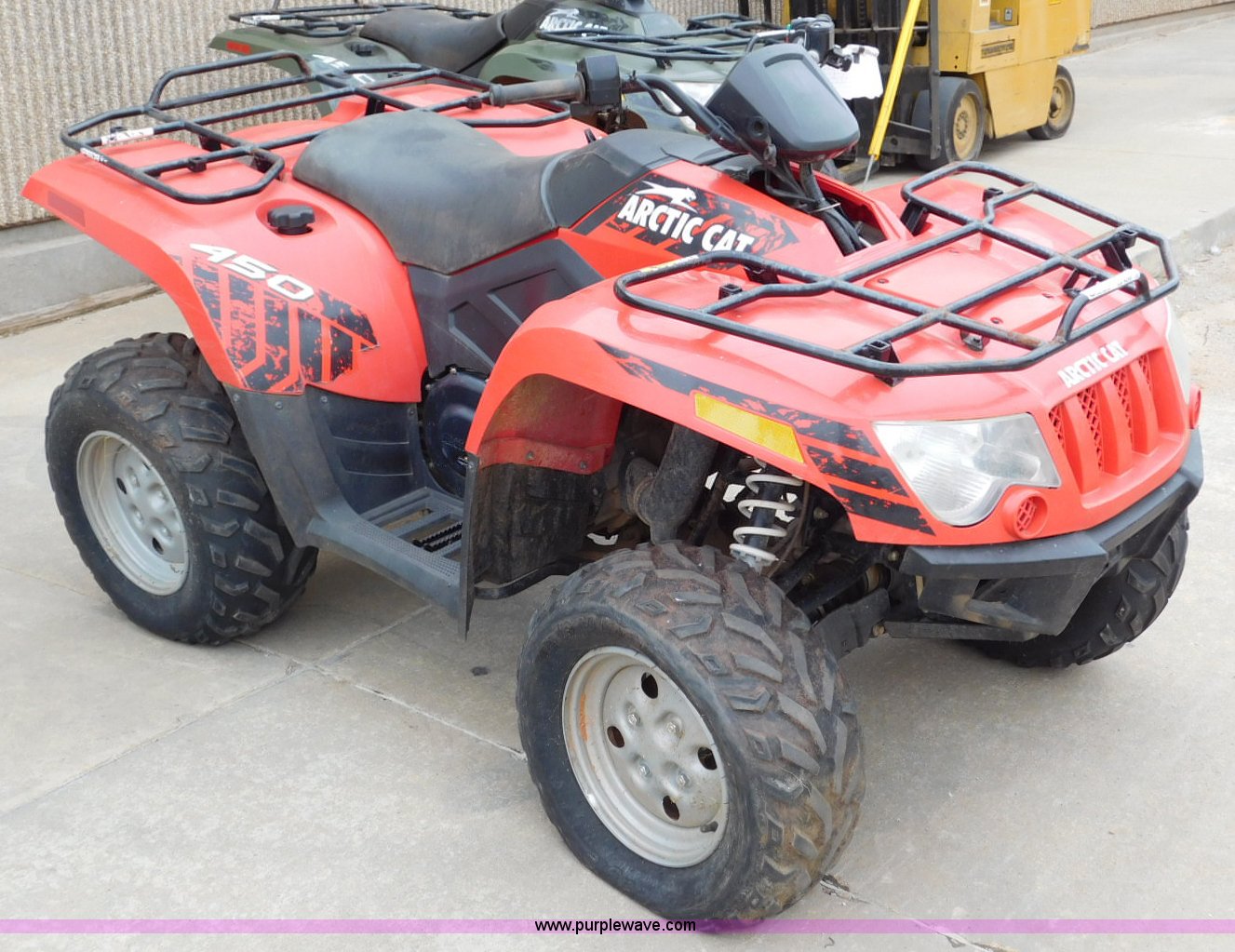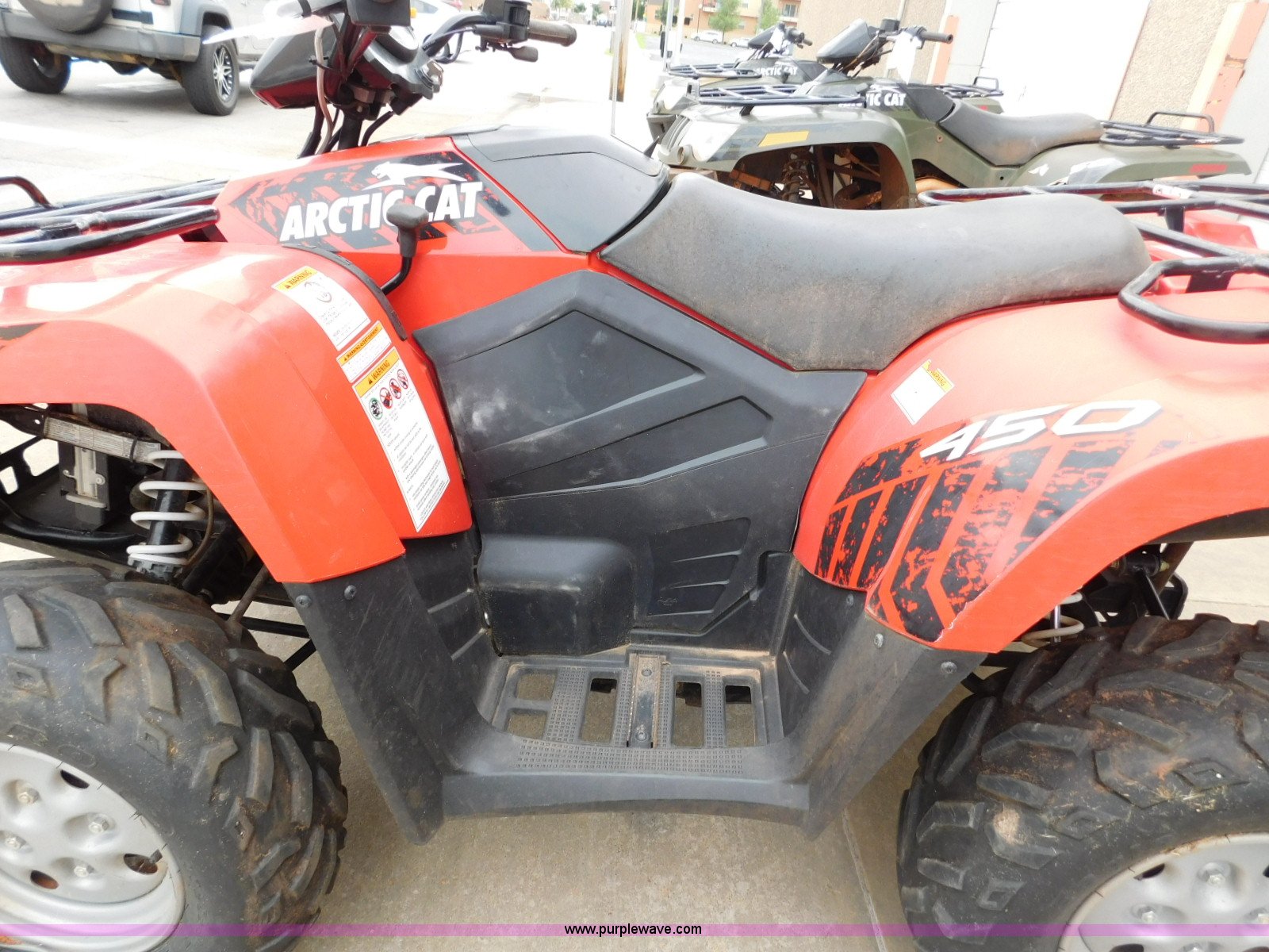 Purple Wave is selling a used ATV in Oklahoma. This item is a 2012 Arctic Cat 450 ATV with the following: Unknown hours on meter, 450cc single cylinder gas engine, Automatic transmission, Four wheel drive, 25x8-12 front tires, 25x10-12 rear tires, Unknown operating condition