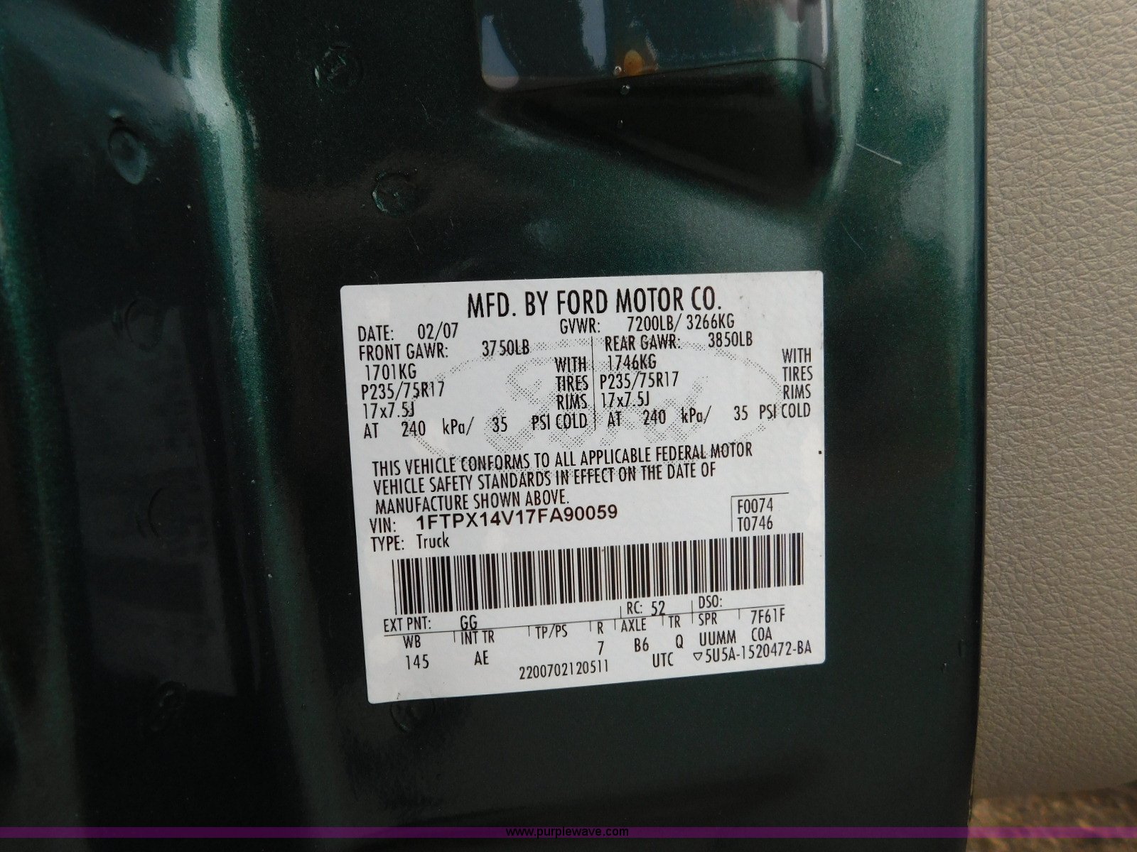 2007 Ford F150 SuperCab pickup truck. 112,998 miles on odometer, 5.4L V8 SOHC 24V FFV gas engine, Automatic transmission, Four wheel drive, AC and heat, Tilt, Cruise, AM/FM, Power windows, locks, and mirrors, Vinyl interior, Receiver hitch, 245/70R17 tires, Exhaust manifold needs replaced. Oklahoma title. Title distribution may be delayed up to 14 days from verification of funds. 1FTPX14V17FA90059. Oklahoma Department of Wildlife Conservation. 2145 NE 36th St. Oklahoma City, OK 73111