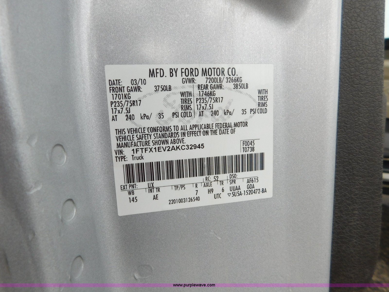 Purple Wave is selling a used 1/2 Ton Pickup or Van in Oklahoma. This item is a 2010 Ford F150 SuperCab pickup truck with the following: 125,985 miles on odometer, 5.4L V8 SOHC 24V FFV gas engine, Automatic transmission, Four wheel drive, AC and heat, Tilt, Cruise, AM/FM, Power windows, locks, and mirrors, Vinyl interior, Receiver hitch, 265/70R17 tires, Vibration in front end