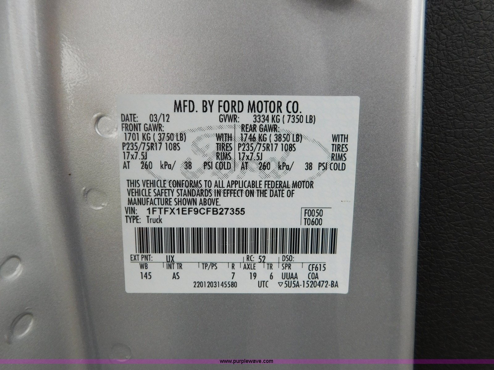 Purple Wave is selling a used 1/2 Ton Pickup or Van in Oklahoma. This item is a 2012 Ford F150 SuperCab pickup truck with the following: 159,140 miles on odometer, 5.0L V8 gas engine, Automatic transmission, Four wheel drive, AC and heat, Tilt, Cruise, AM/FM, Power windows, locks, and mirrors, Vinyl interior, 245/75R17 tires
