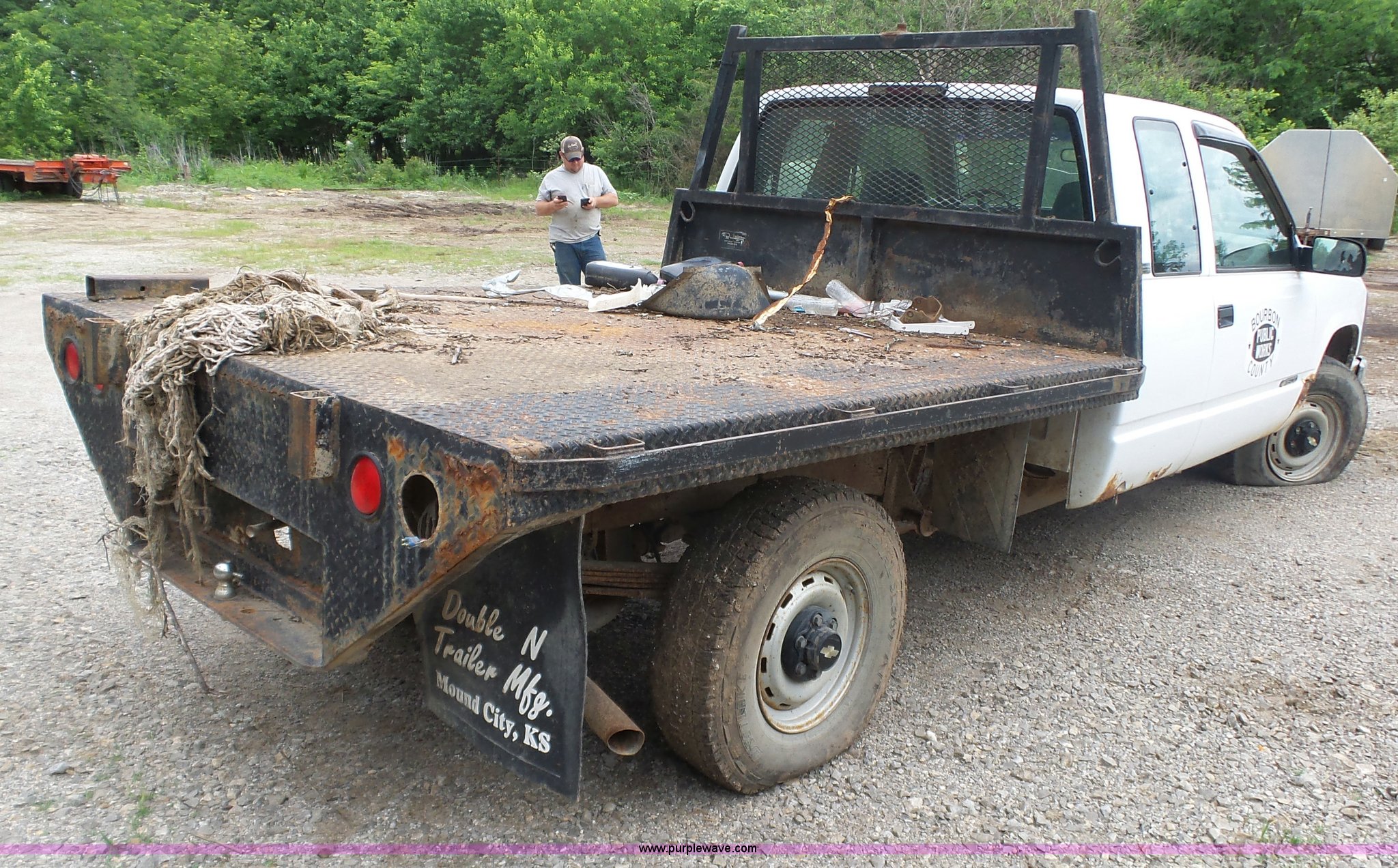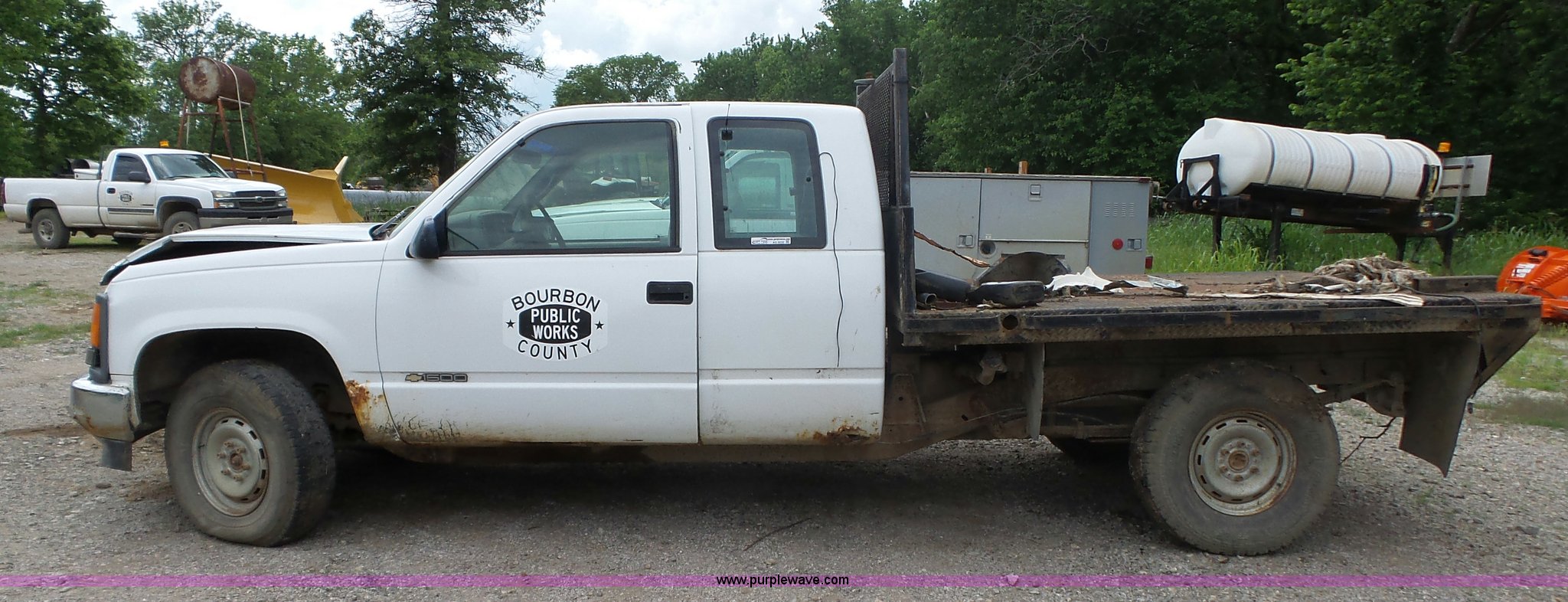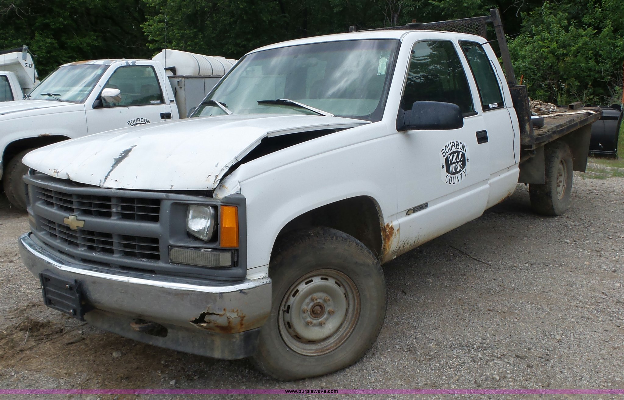 1996 Chevrolet 1500 flatbed pickup truck. 310,303 miles on odometer, 5.7L V8 gas engine, Automatic transmission, AC and heat, AM/FM, Manual windows and locks, Vinyl interior, Trailer wiring, LT235/85R16 tires, Transmission issues, Body damage. Kansas title.. Title distribution may be delayed up to 14 days from verification of funds. 1GCEK19R5TE184964. Bourbon County Public Works. 1427 125th St. Fort Scott, KS 66701