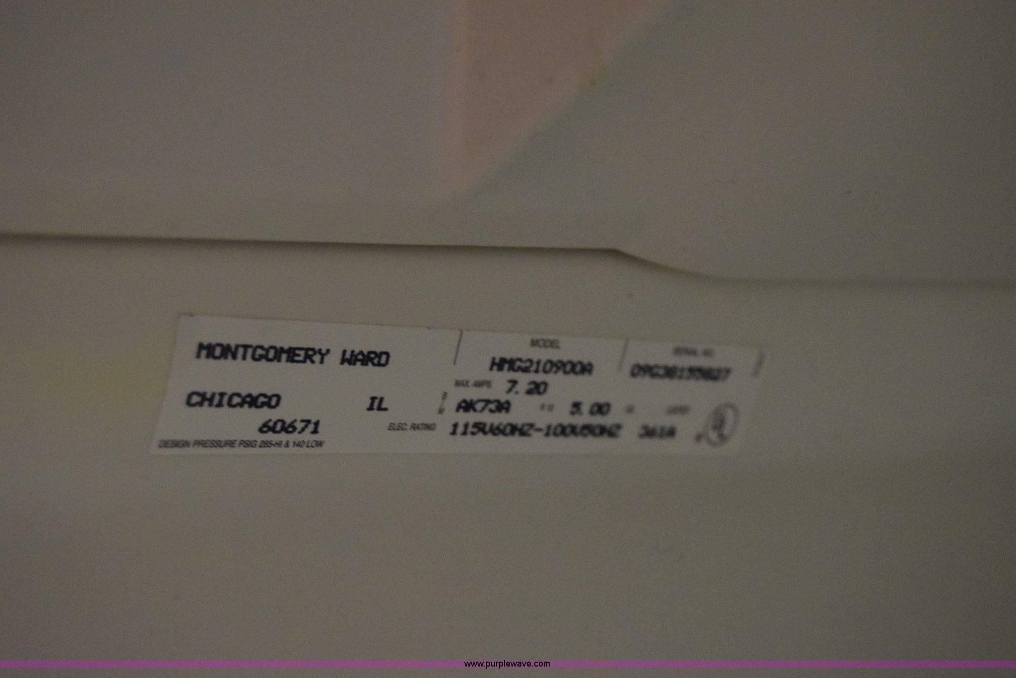Purple Wave is selling a used Appliances in Kansas. This item is a Montgomery Ward refrigerator with the following: Model HMG-21090, 115V