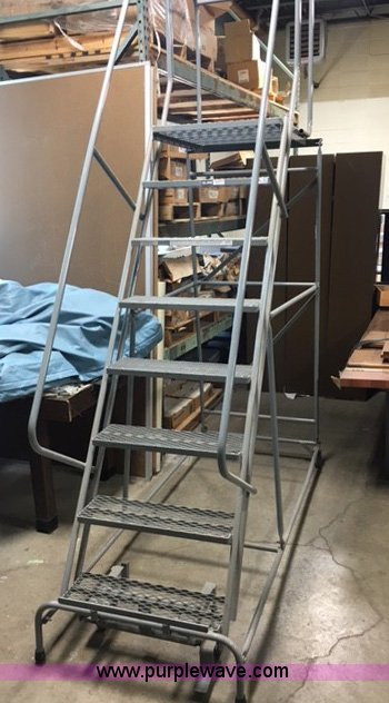 Purple Wave is selling a used Tools in Kansas. This item is a Eight step rolling ladder with the following: 24"W, Approx. 7'H to top of platform