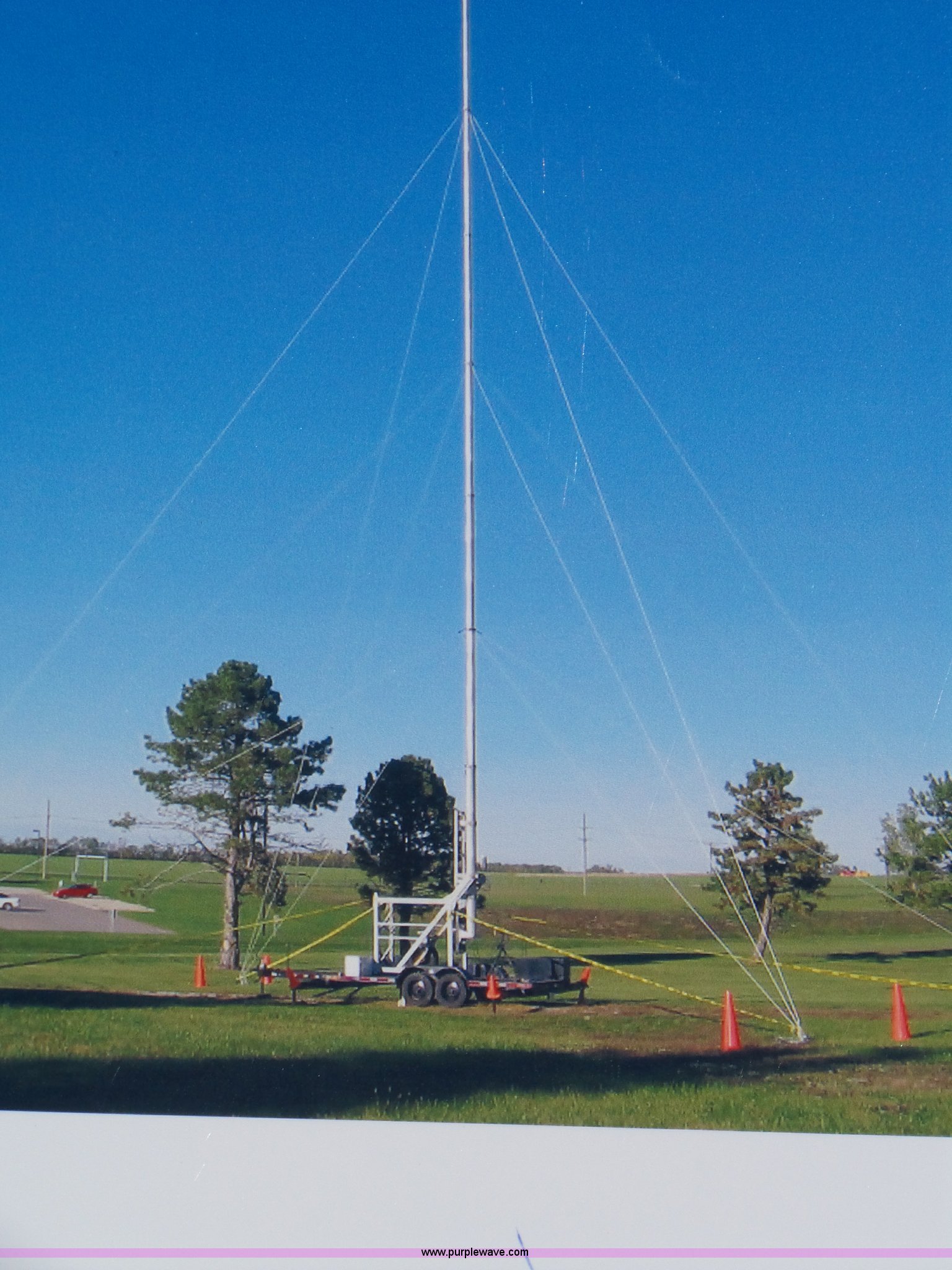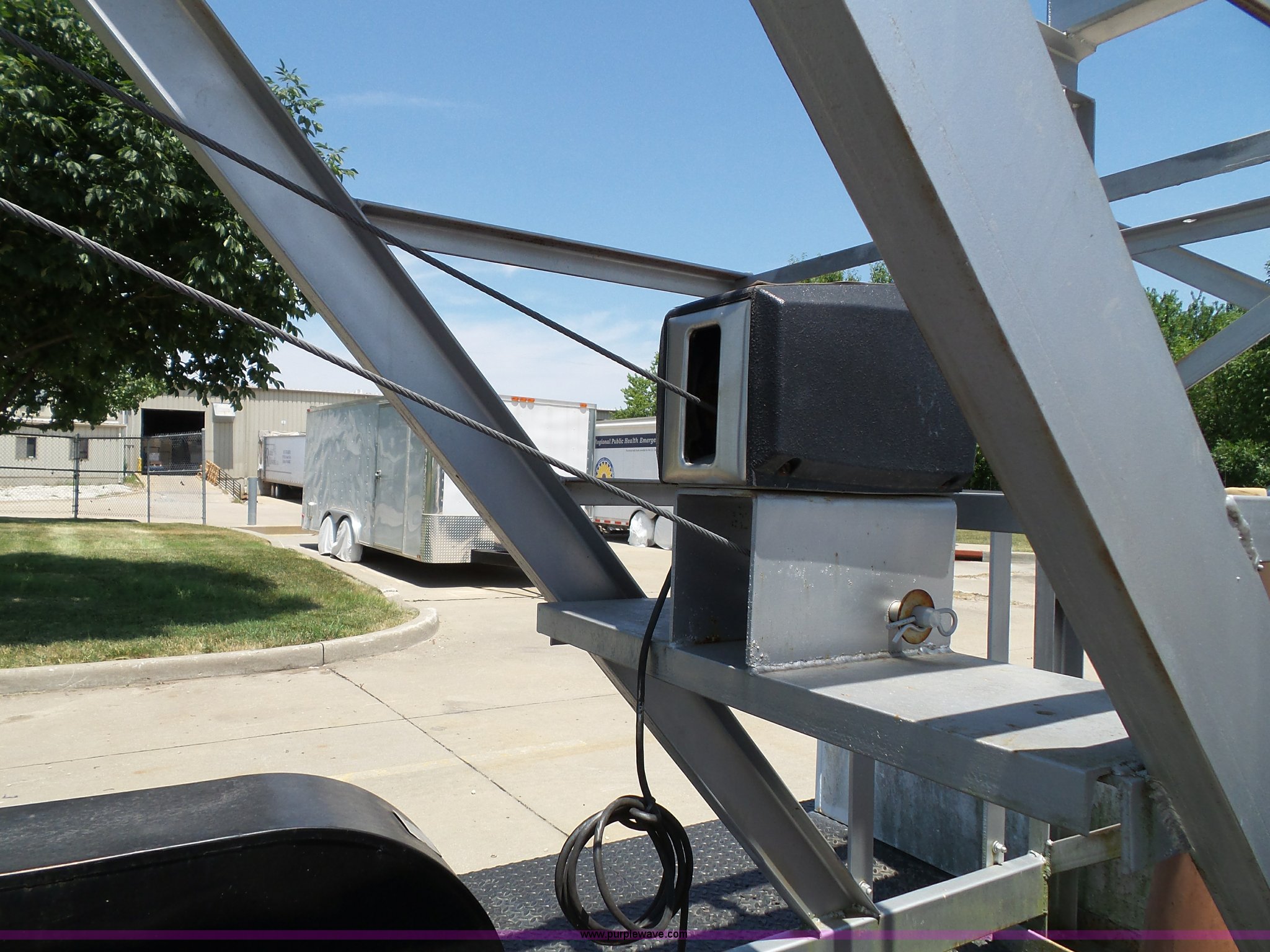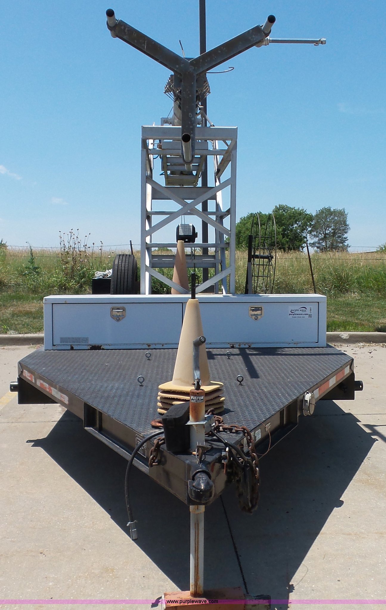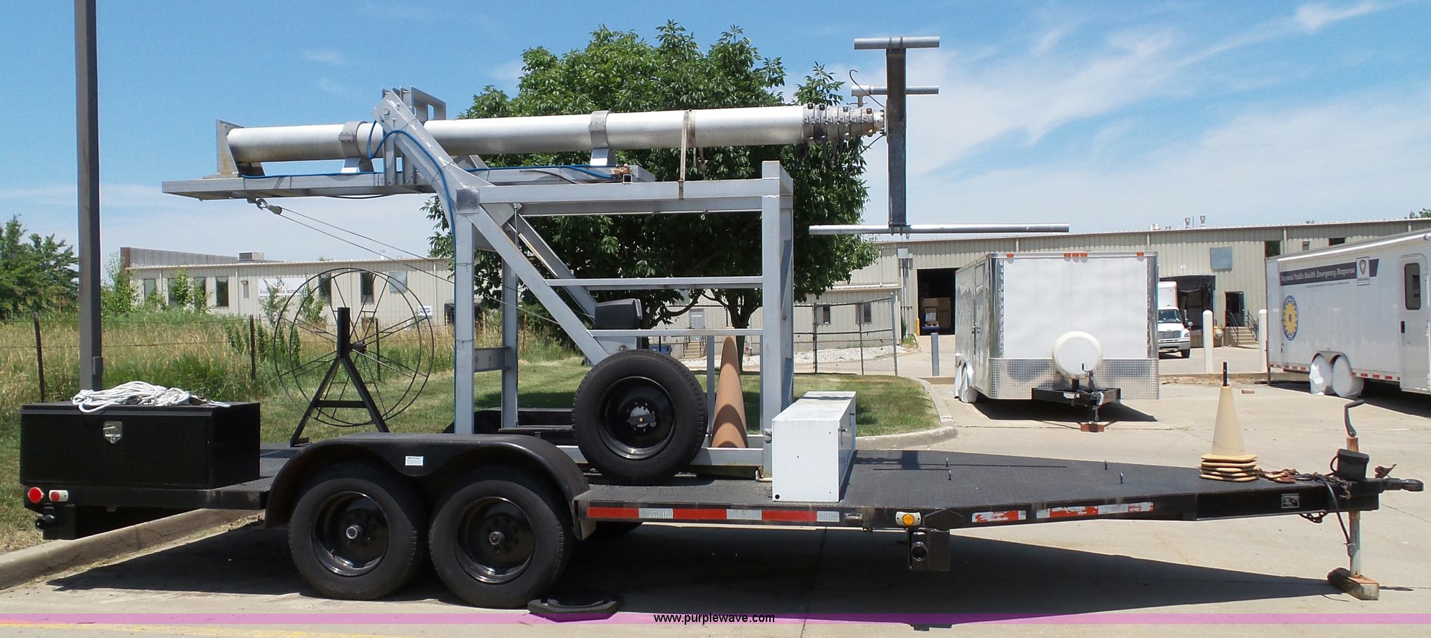 Purple Wave is selling a used Trailer Other in Kansas. This item is a 1997 Mobile power line telescopic tower and trailer with the following: 25'L x 8'W, Antenna/feed line information, 80'H tower, Dayton 4Z3273 electric winch, Front storage boxes, Reel, Storage box with feed lines, Front and rear outriggers, 2 5/16" ball hitch, Safety chains, Lights, Tandem axle, 215/75R17.5 tires, Setup and operator's manuals, Unit# EMC180