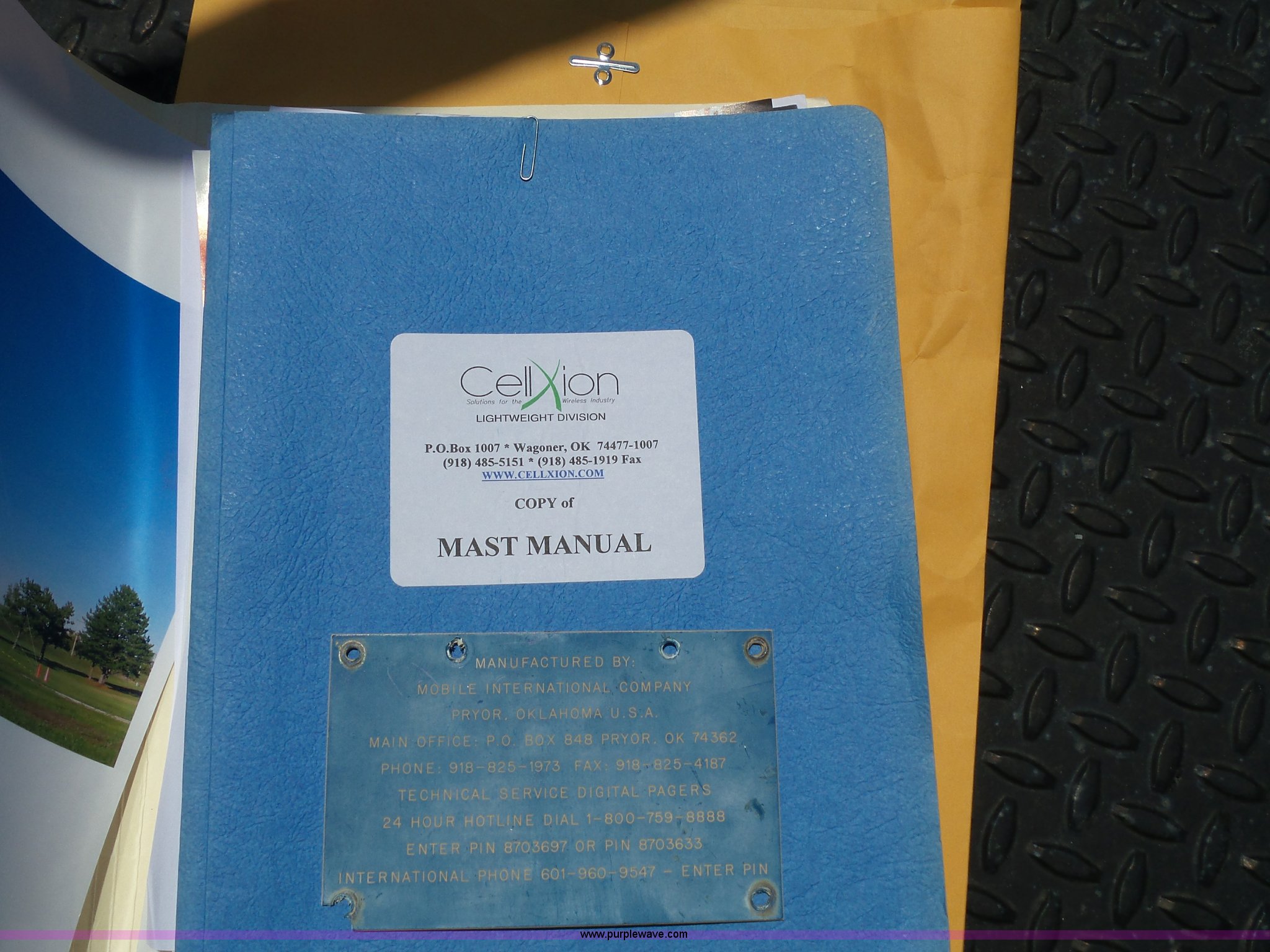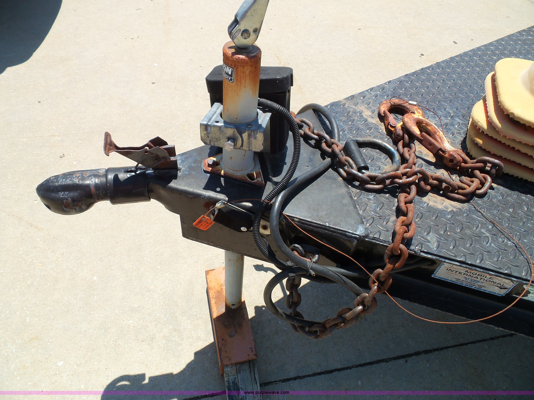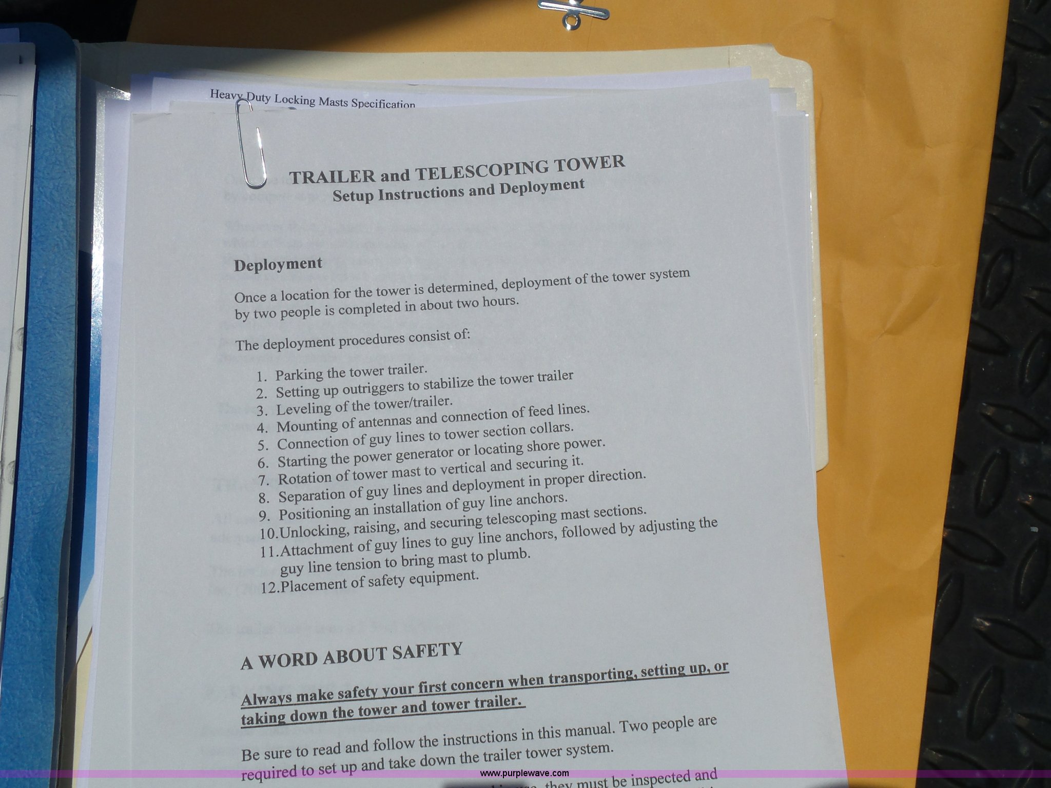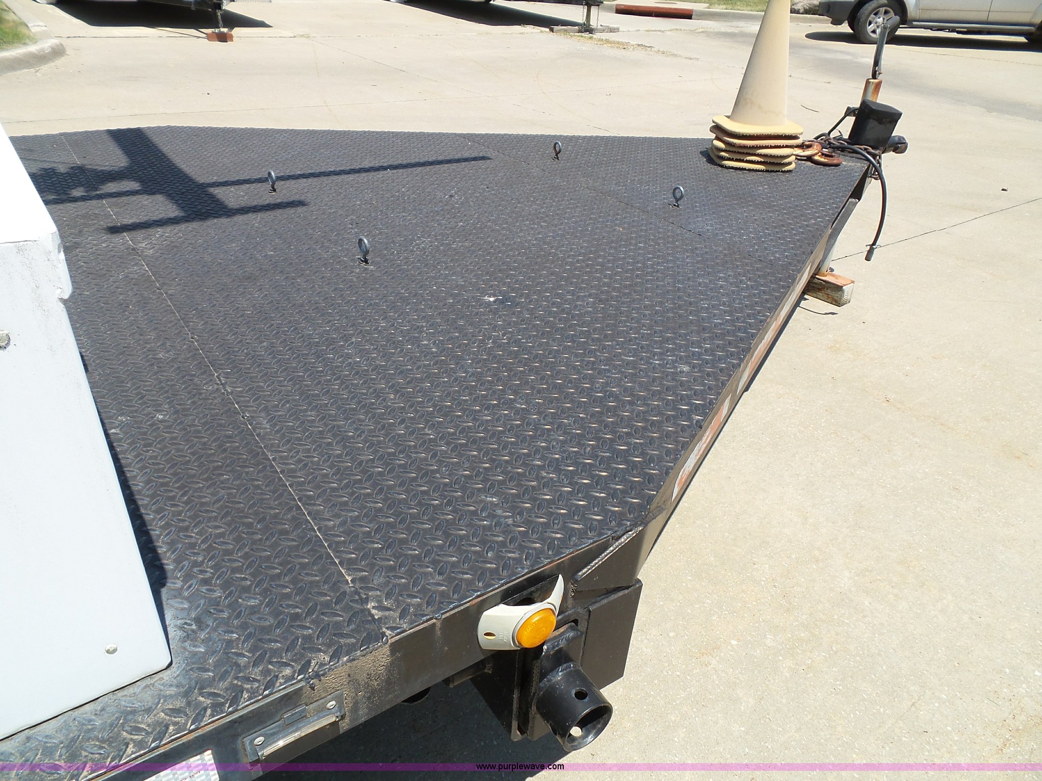 Purple Wave is selling a used Trailer Other in Kansas. This item is a 1997 Mobile power line telescopic tower and trailer with the following: 25'L x 8'W, Antenna/feed line information, 80'H tower, Dayton 4Z3273 electric winch, Front storage boxes, Reel, Storage box with feed lines, Front and rear outriggers, 2 5/16" ball hitch, Safety chains, Lights, Tandem axle, 215/75R17.5 tires, Setup and operator's manuals, Unit# EMC180