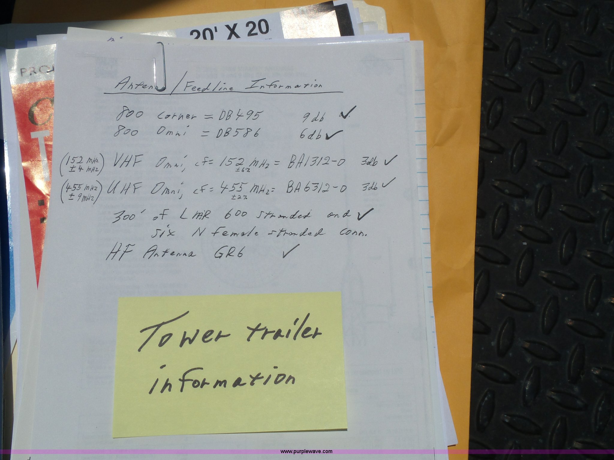 1997 Mobile power line telescopic tower and trailer. 25'L x 8'W, Antenna/feed line information, 80'H tower Dayton 4Z3273 electric winch, Front storage boxes, Reel, Storage box with feed lines, Front and rear outriggers, 2 5/16" ball hitch, Safety chains, Lights, Tandem axle, 215/75R17.5 tires, Setup and operator's manuals, Unit# EMC180. Kansas title. 1M9TS2623V1356623. Johnson County. 19370 W 159th. Olathe, KS 66062