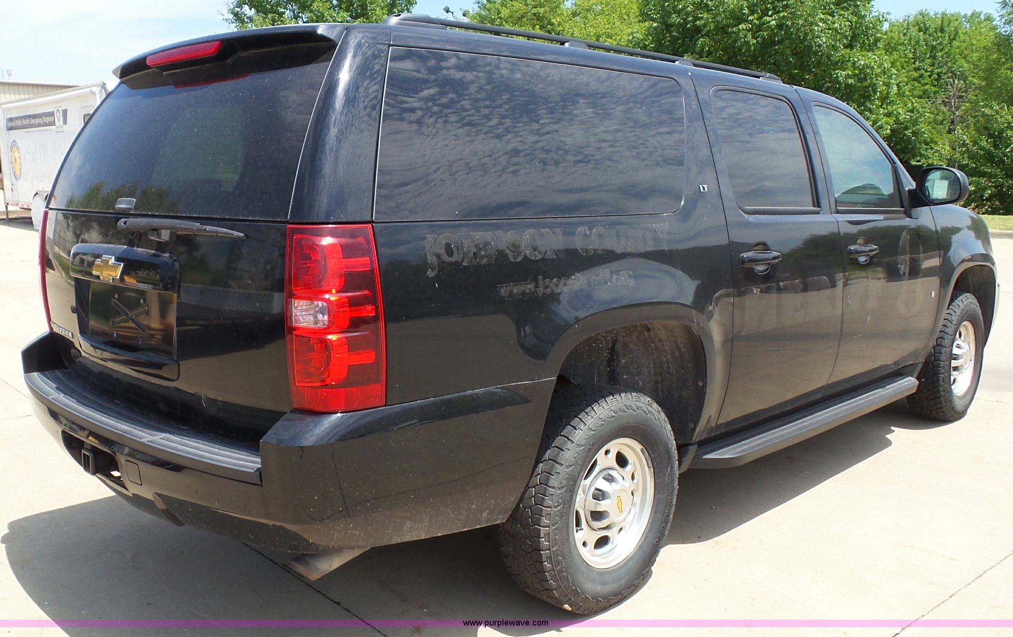 2009 Chevrolet Suburban 2500 SUV. 145,507 miles on odometer, 6.0L V8 OHV 16V gas engine, Automatic transmission, Four wheel drive, AC and heat, Tilt, Cruise, AM/FM/CD, Power windows, locks, mirrors, and seat, Cloth interior, Front tow hooks, Spotlight, Fog lights, Running boards, Luggage rack, Receiver hitch, Trailer wiring, 245/75R16 tires, Decal residue, Center console missing, Water leaks into cab through spotlight, Unit# SHR302. Kansas title. 1GNGK56K59R122013. Johnson County. 19370 W 159th. Olathe, KS 66062
