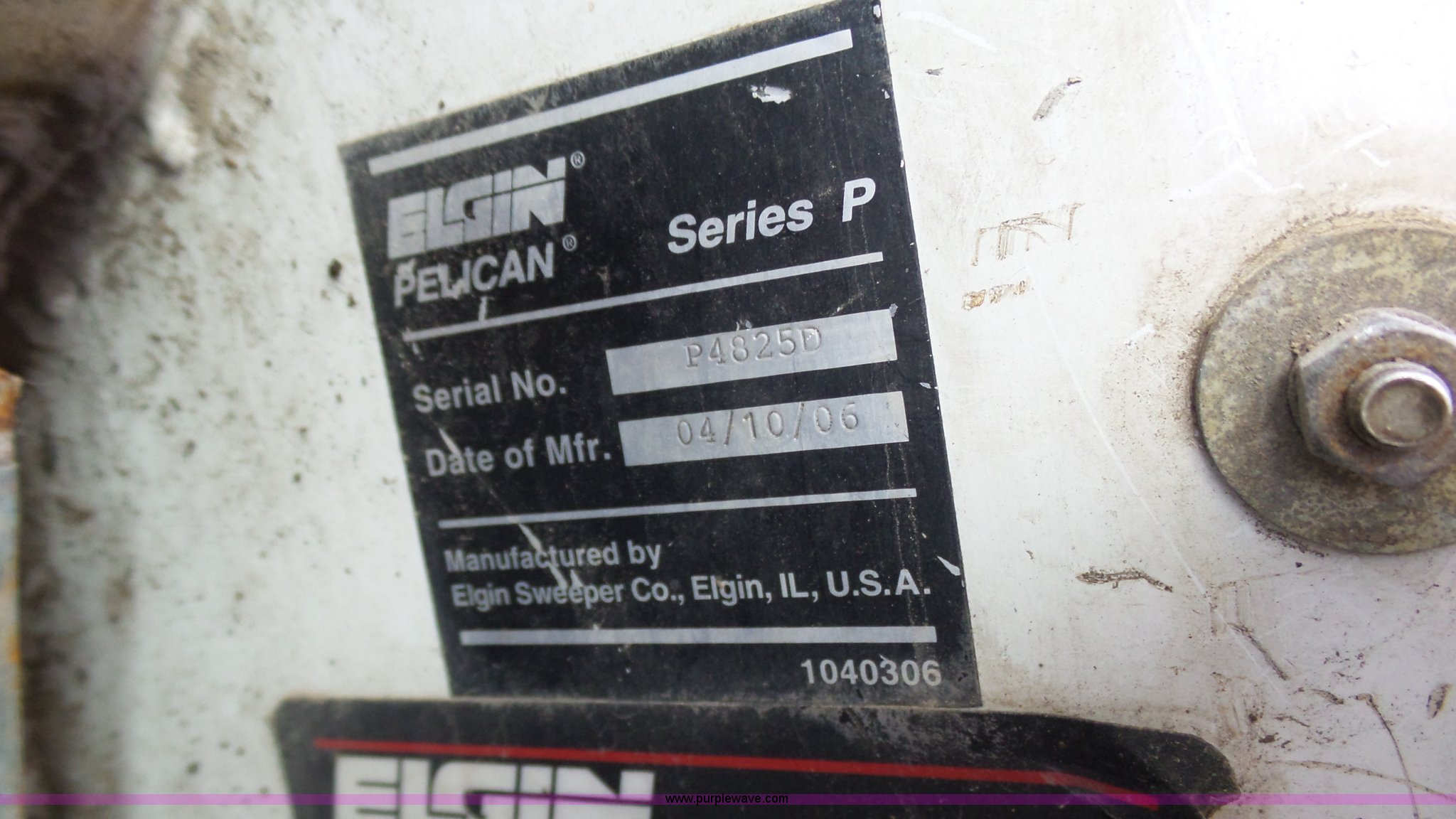 Purple Wave is selling a used Sweeper in Kansas. This item is a 2006 Elgin Pelican Series P street sweeper with the following: 25,804 miles on odometer, 5,484 hours on meter, Four cylinder diesel engine, 10'W sweep, 11R22.5 front tires, 9R17.5 rear tires, Rust, Dead battery, Brakes are tight, Serial P4825D, Unit# A18-2S1