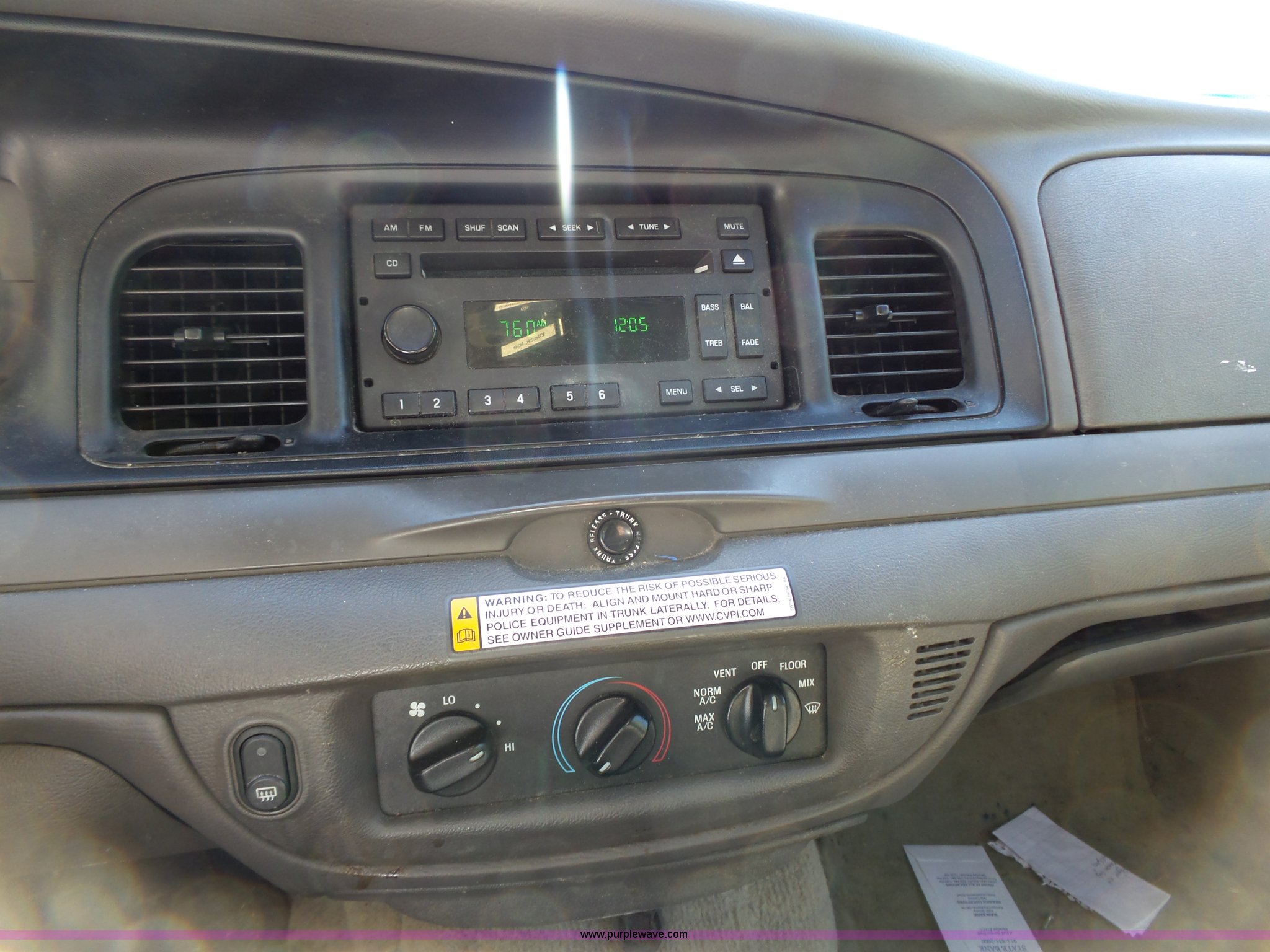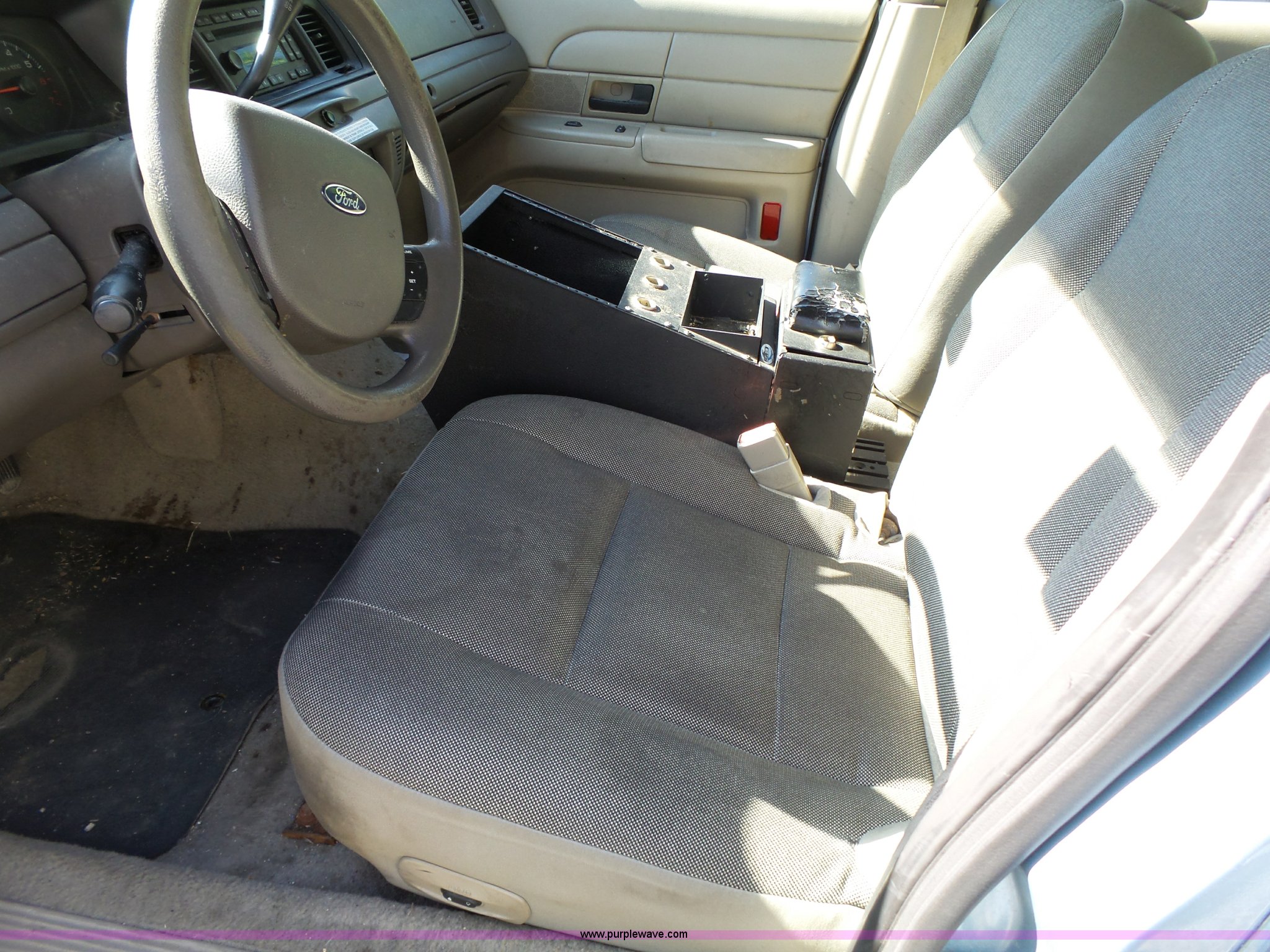 Purple Wave is selling a used Passenger Vehicle in Kansas. This item is a 2008 Ford Crown Victoria Police Interceptor with the following: 167,949 miles on odometer, 4.6L V8 SOHC 16V FFV gas engine, Automatic transmission, AC and heat, Tilt, Cruise, Non-operational, AM/FM/CD, Power windows, locks, and mirrors, Cloth interior, P235/55R17 tires, Dead battery, Dash lights inoperable, Unit# A15-016