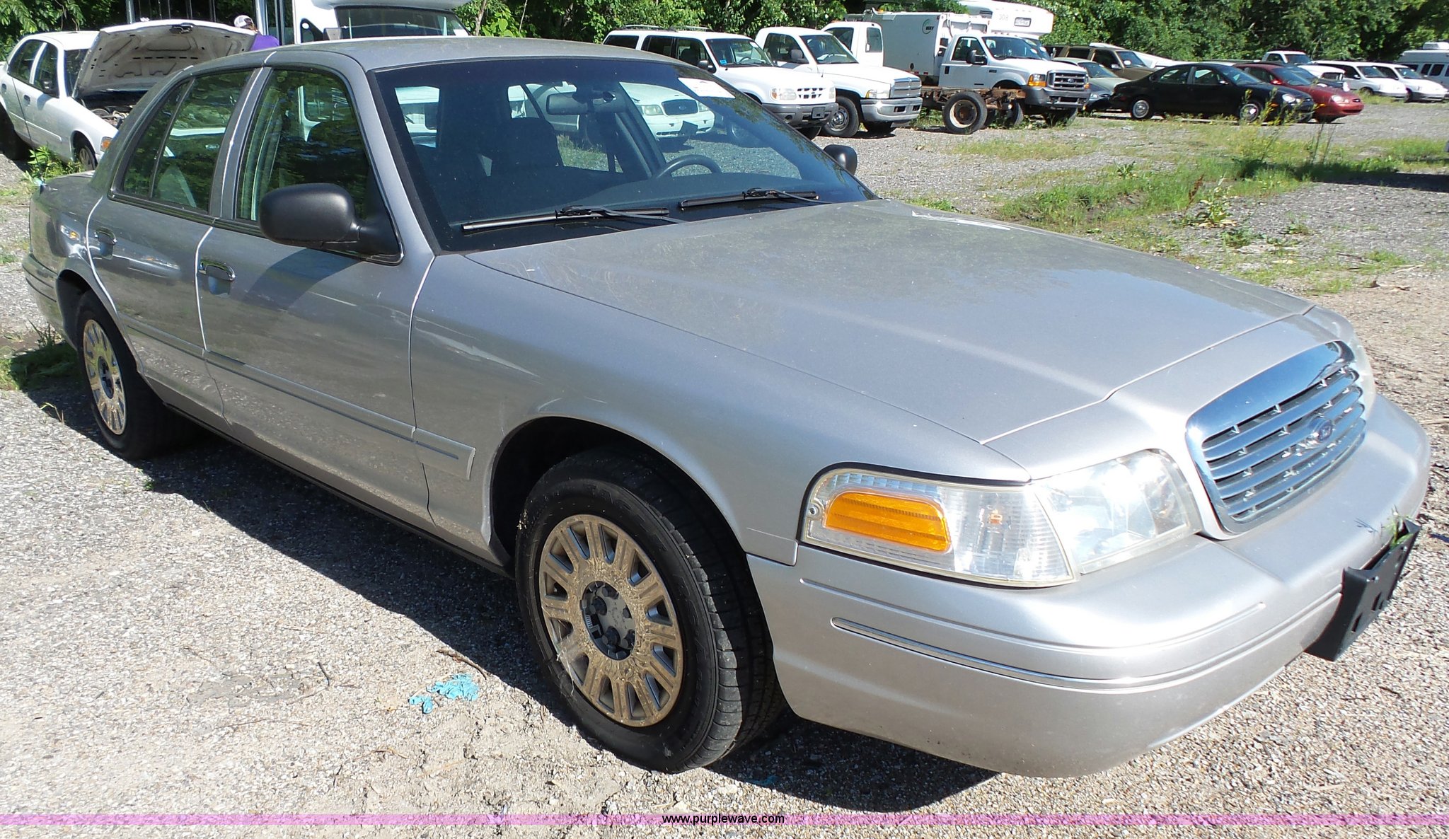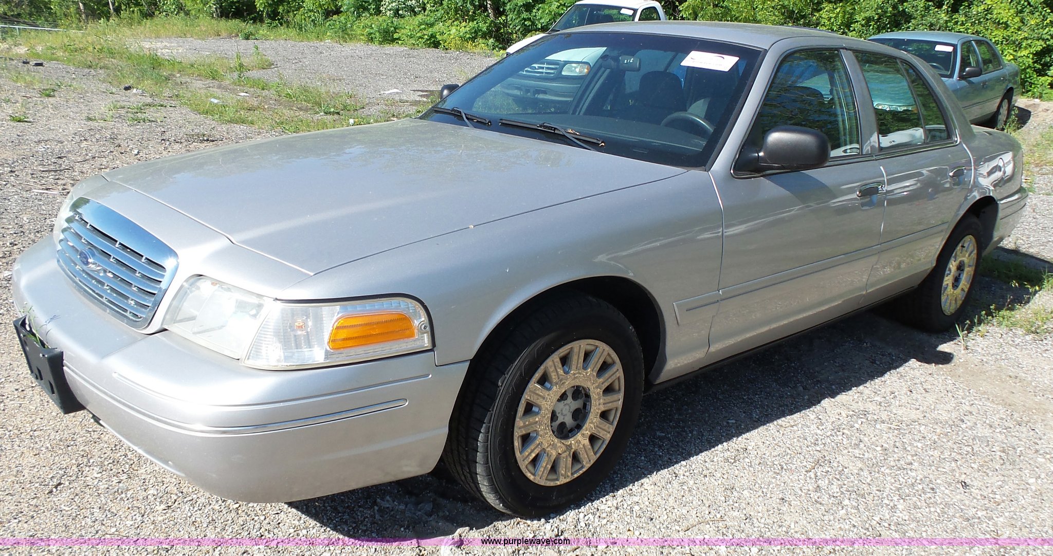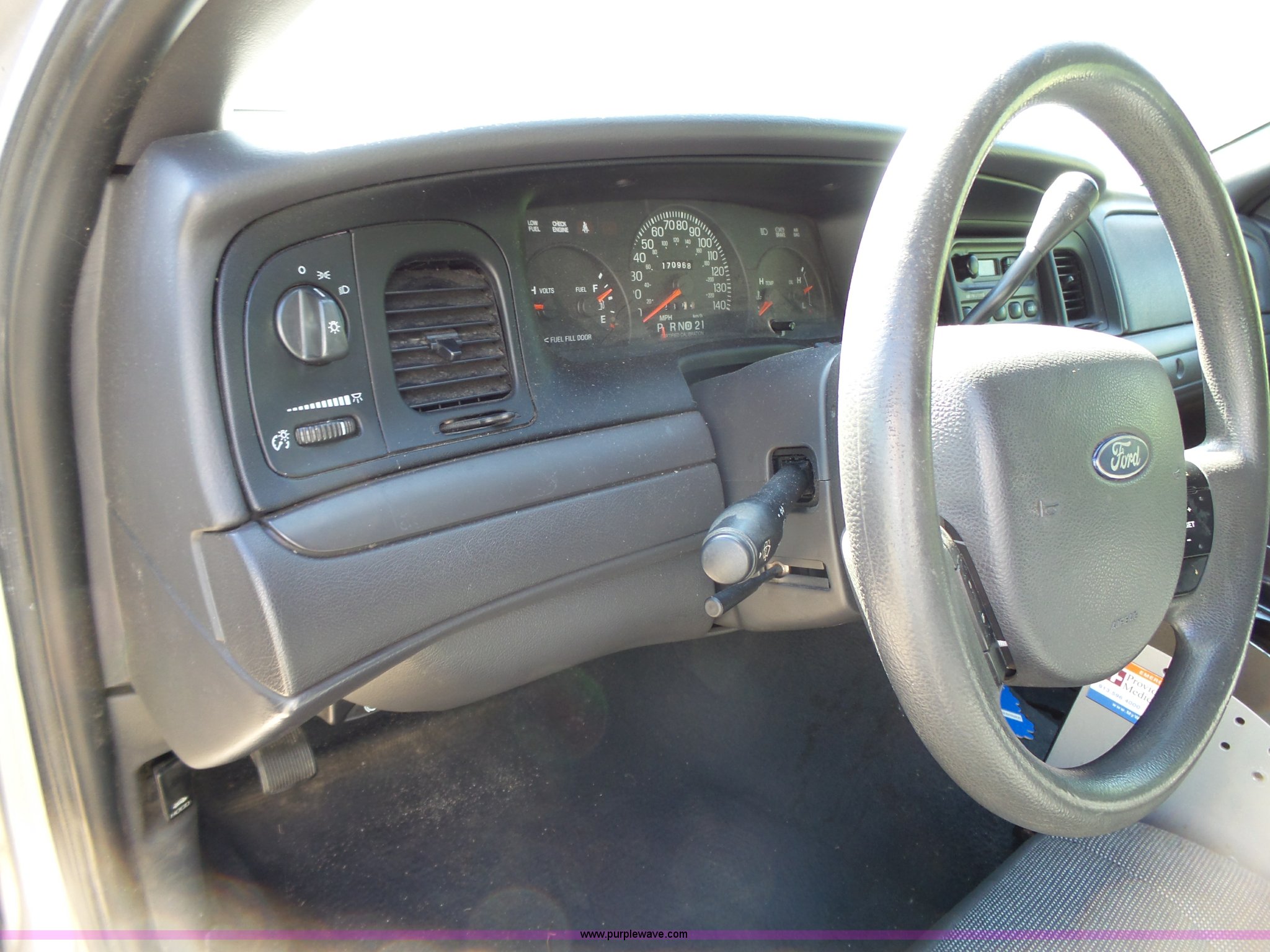 Purple Wave is selling a used Passenger Vehicle in Kansas. This item is a 2005 Ford Crown Victoria Police Interceptor with the following: 170,968 miles on odometer, 4.6L V8 SOHC 16V gas engine, Automatic transmission, AC and heat, Tilt, Cruise, Non-operational, AM/FM, Power windows, locks, and mirrors, Cloth interior, P235/60R16 tires, Dead battery, Dash lights inoperable, Unit# 15-215
