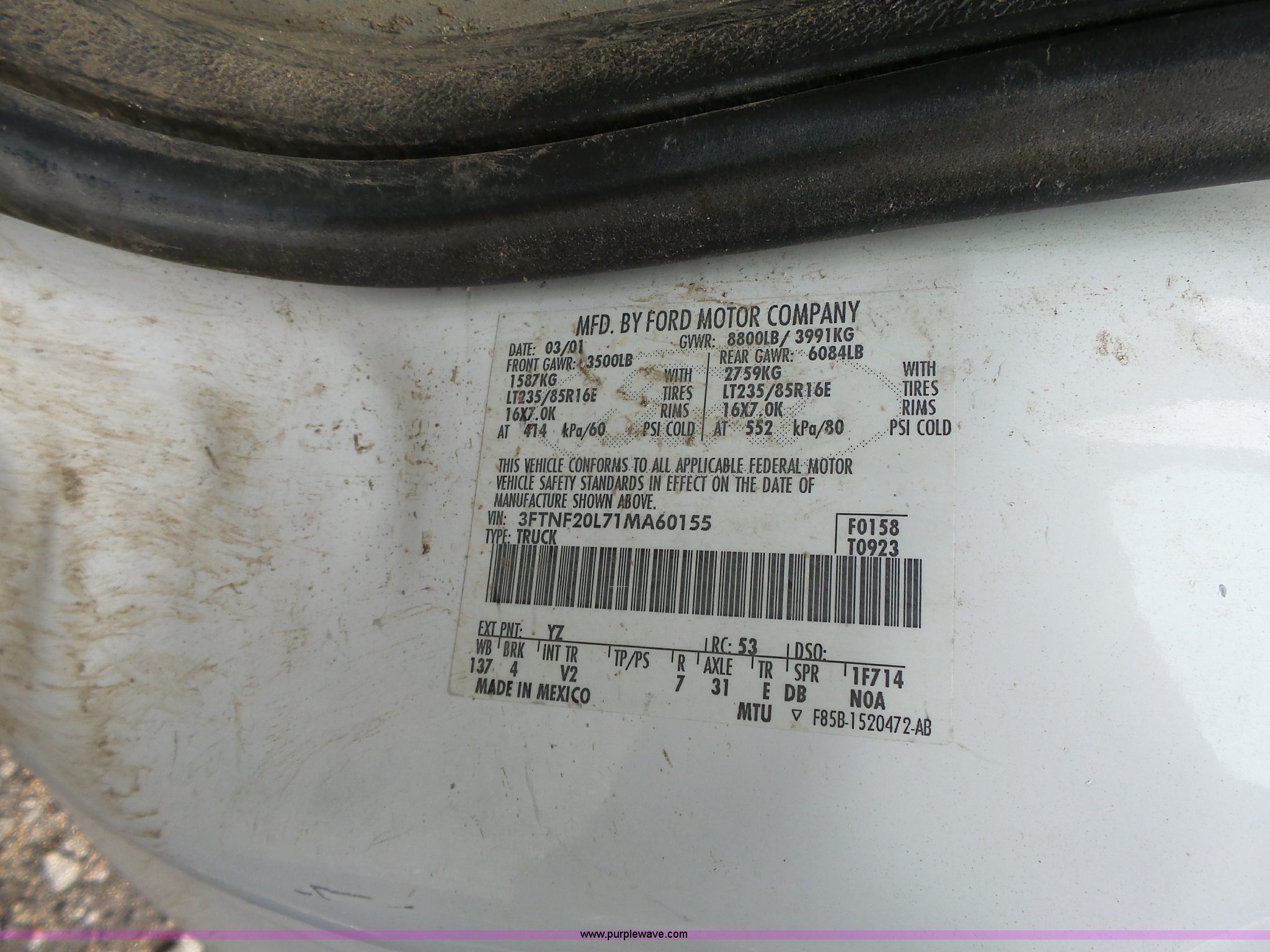 Purple Wave is selling a used 3/4 or 1 Ton Pickup or Van in Kansas. This item is a 2001 Ford F250 Super Duty XL pickup truck with the following: 68,009 miles on odometer, 5.4L V8 gas engine, Automatic transmission, AC and heat, AM/FM, Manual windows and locks, Vinyl interior, Front tow hooks, Receiver hitch, Trailer wiring, 235/85R16 tires, Interior/exterior cosmetic damage, Fuel pump issue, Will start intermittently, Unit must be towed or hauled