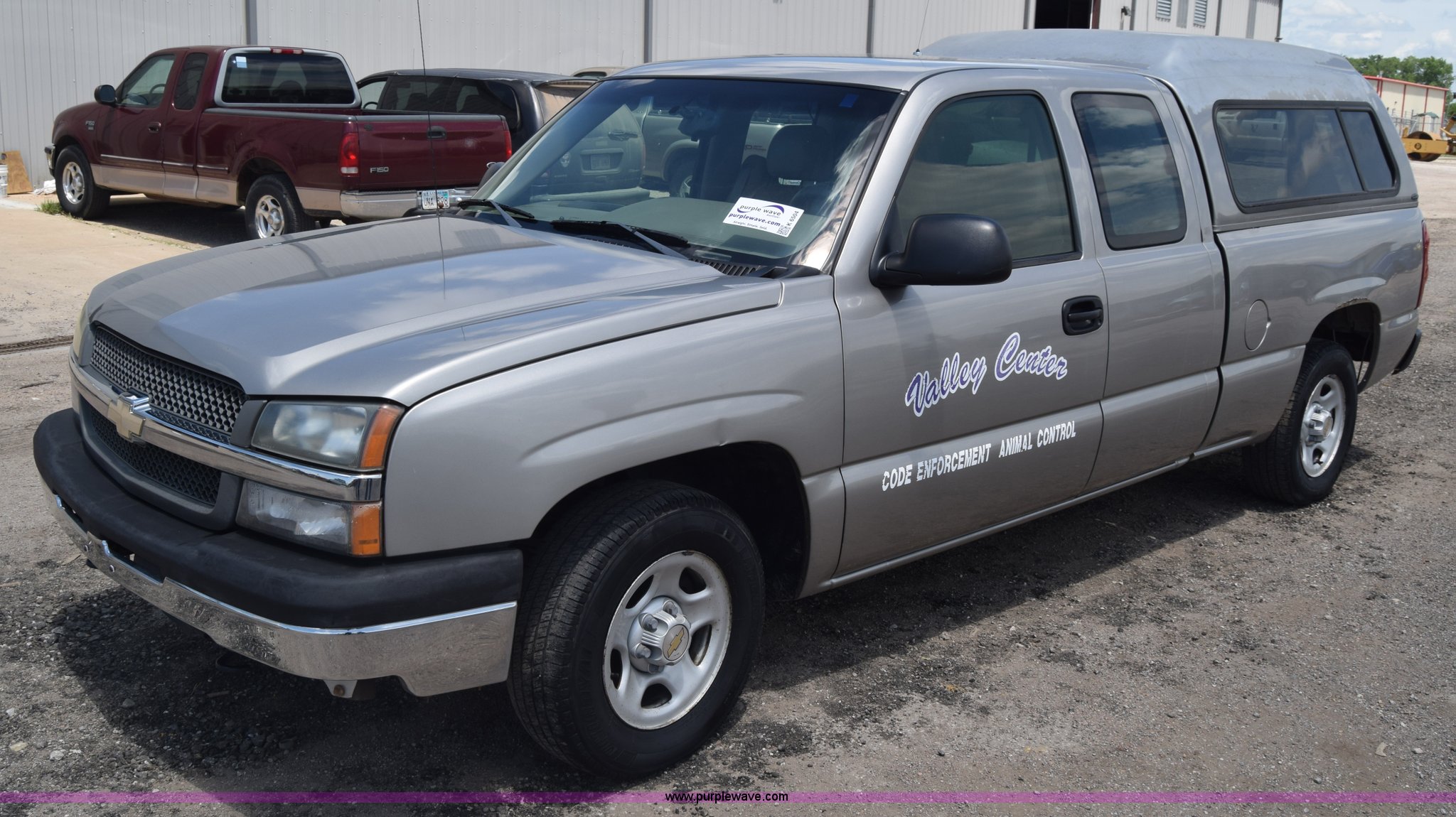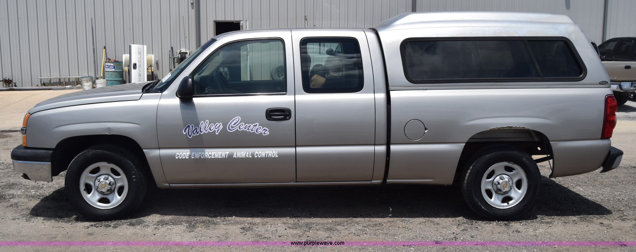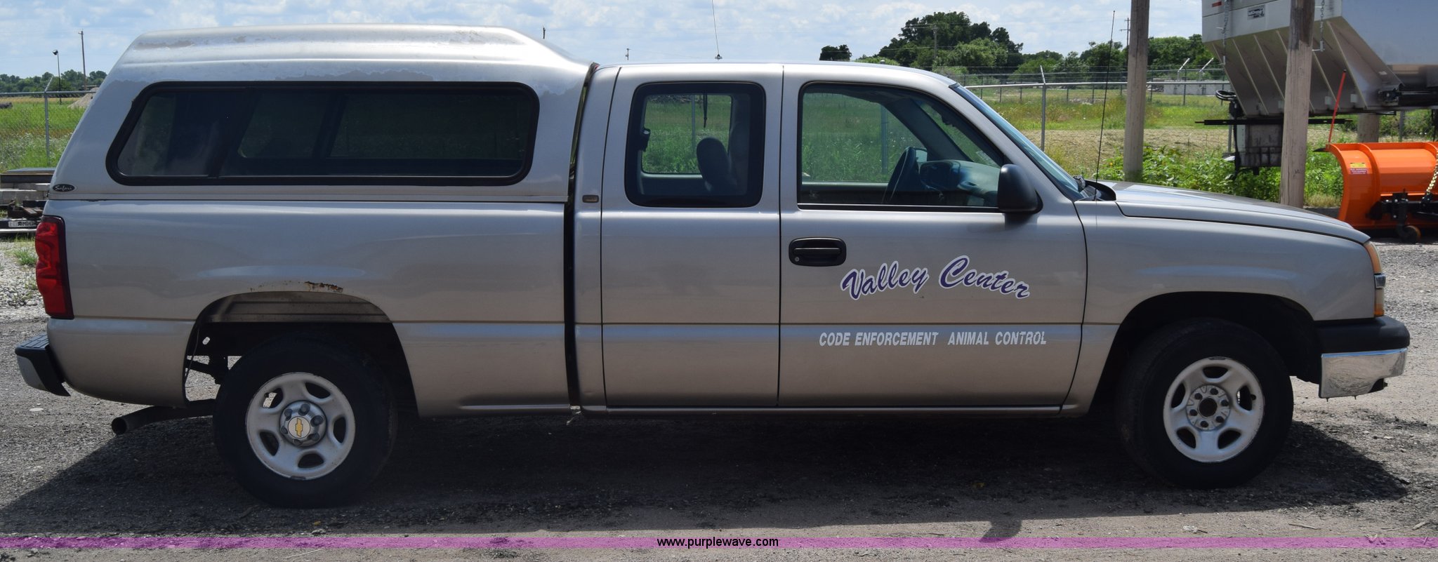 2003 Chevrolet Silverado 1500 Ext. Cab pickup truck. 93,089 miles on odometer, 4.3L V6 OHV 12V gas engine, Automatic transmission, AC and heat, AM/FM, Manual windows and locks, Vinyl interior, Front tow hooks, Line-X bed liner, Safari topper, 235/70R16 tires, Interior/exterior cosmetic damage, Rust. Kansas title. 2GCEC19X631308334. Valley Center Public Works. 545 W Clay. Valley Center, KS 67147