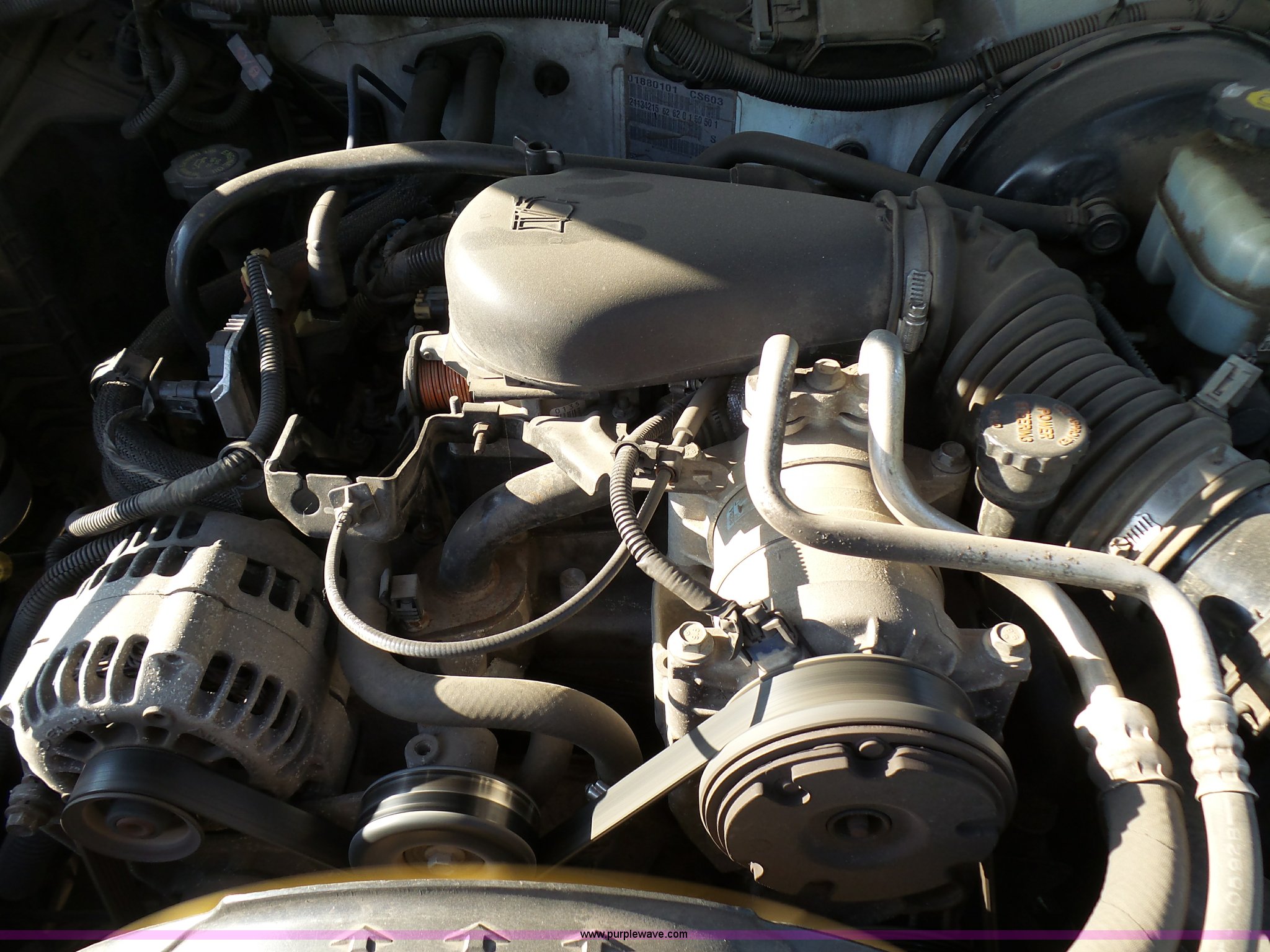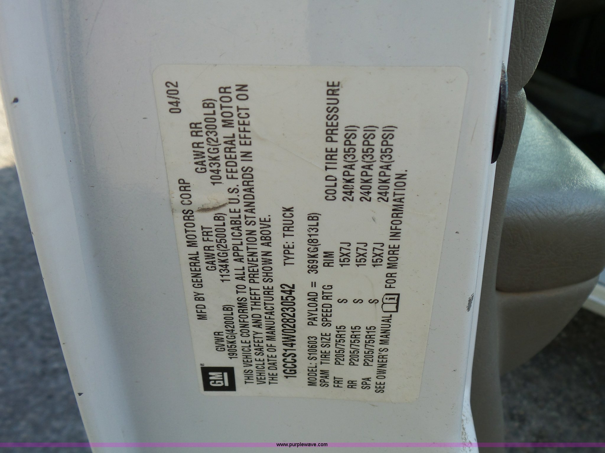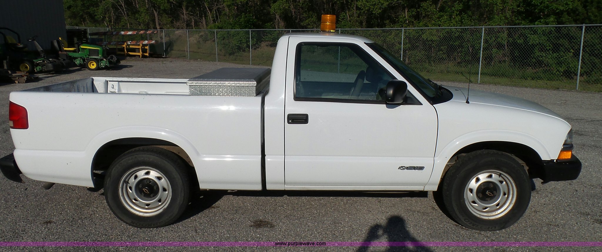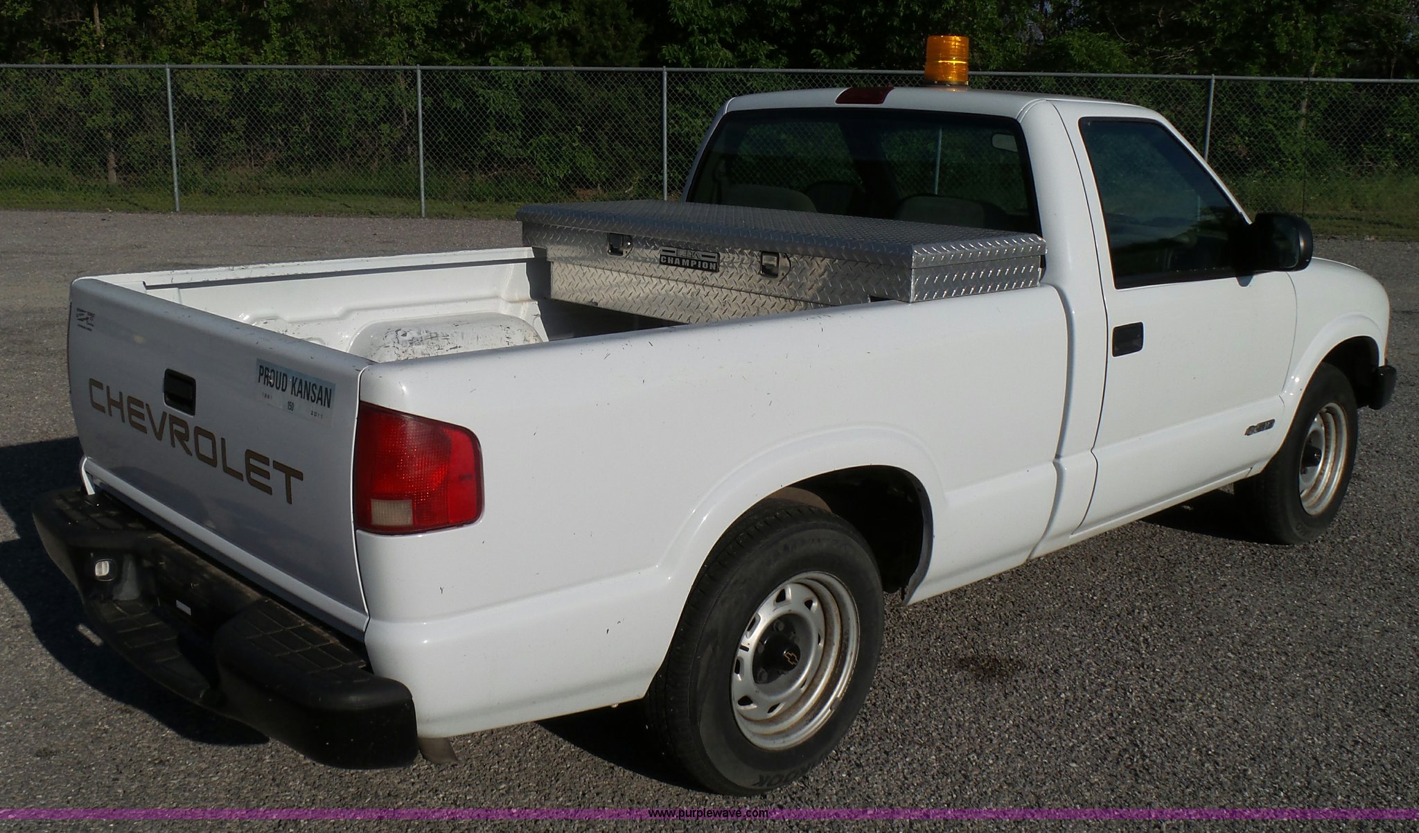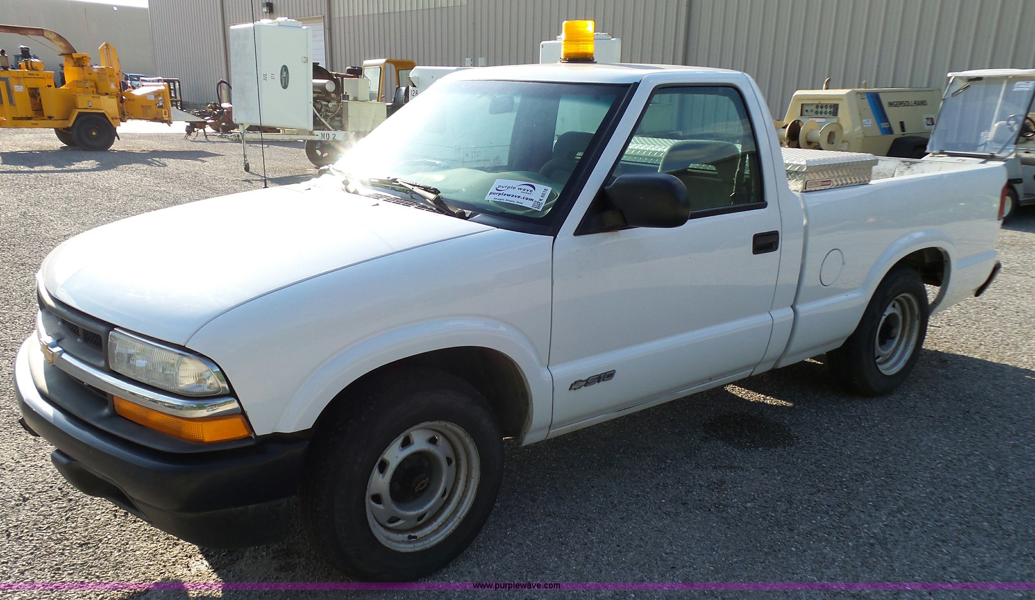 Purple Wave is selling a used Compact Pickup or Van in Kansas. This item is a 2002 Chevrolet S10 pickup truck with the following: 86,541 miles on odometer, 4.3L V6 OHV 12V gas engine, Automatic transmission, AC and heat, AM/FM, Manual windows and locks, Cloth interior, Amber strobe light, Toolbox, P205/75R15 tires, Front bumper plastic damage, Scratches, Dents, Unit# 190