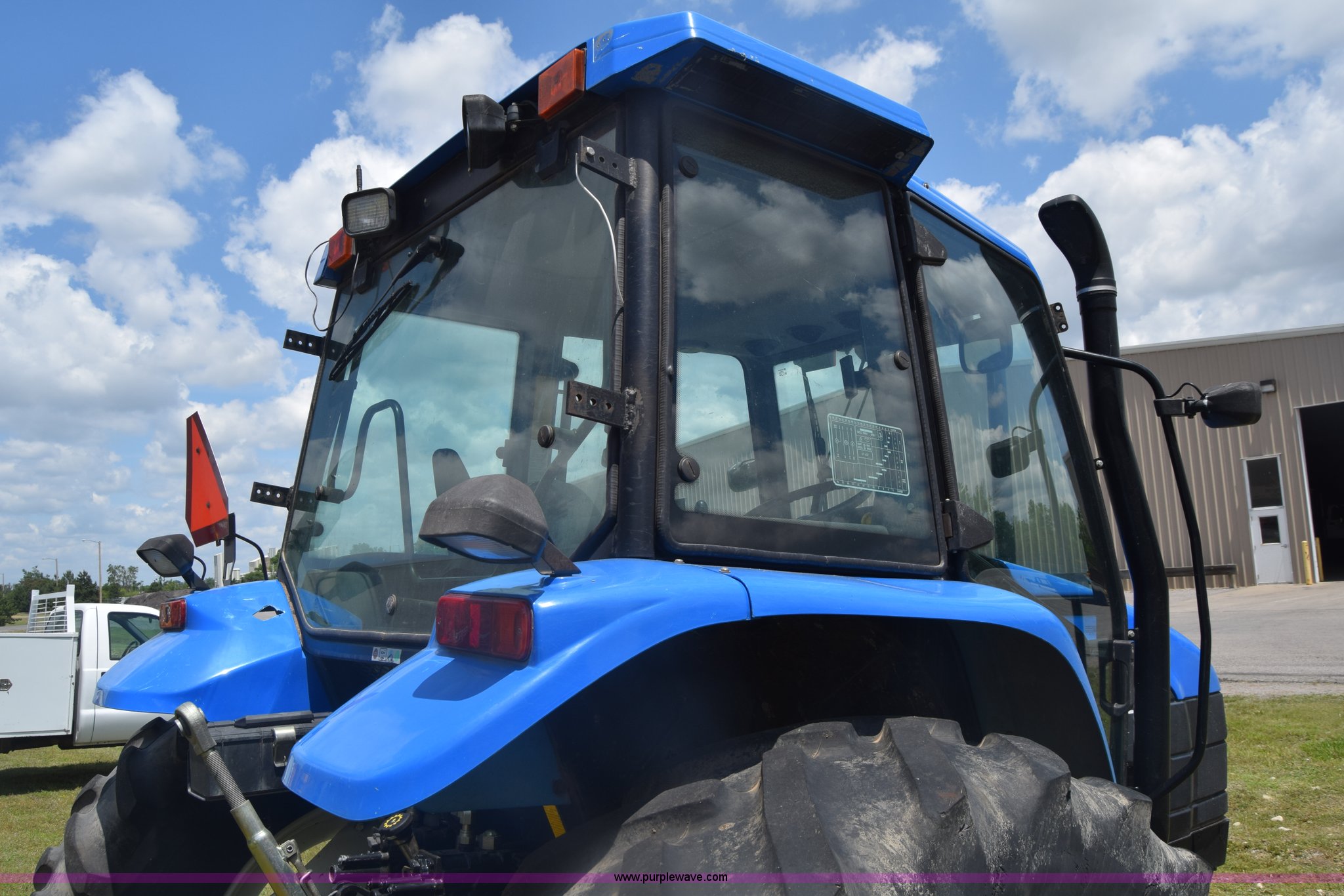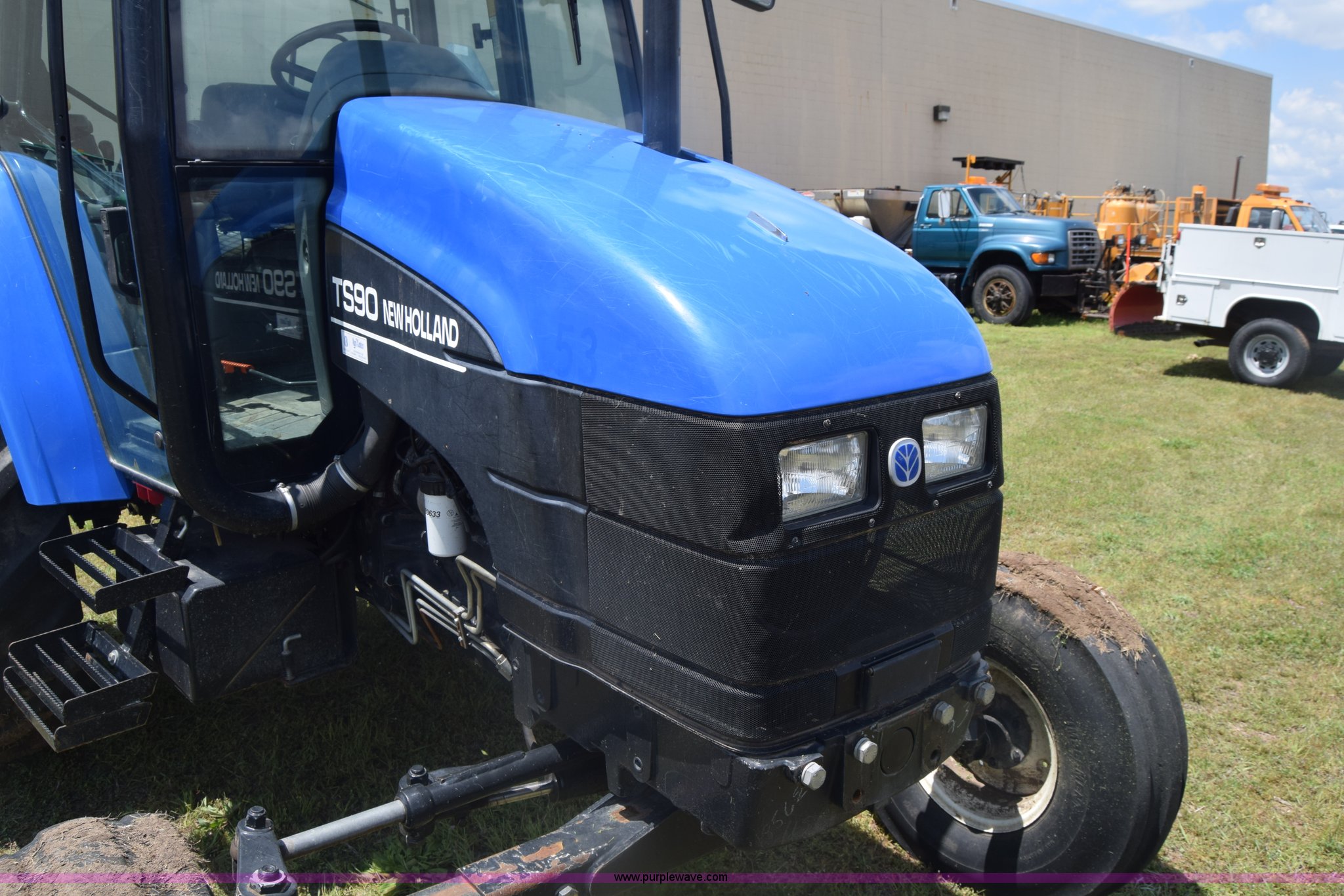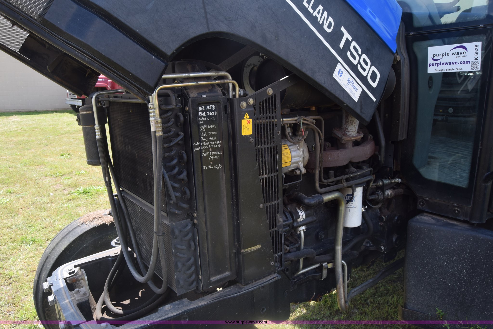 Purple Wave is selling a used Tractor in Kansas. This item is a 2002 New Holland TS90 tractor with the following: 7,113 hours on meter, Case New Holland 450/NE 5.0L four cylinder diesel engine, Serial 17913, Command synchro transmission, 12F-3R gears, AC and heat, Tilt steering wheel, AM/FM, Suspension seat, Shade, Three point, Top link, Seven pin outlet, ISO electrical outlet, 540 PTO, Rear hydraulic remote sets, 10.00-16SL front tires, 18.4R34 rear tires, Serial 185627B