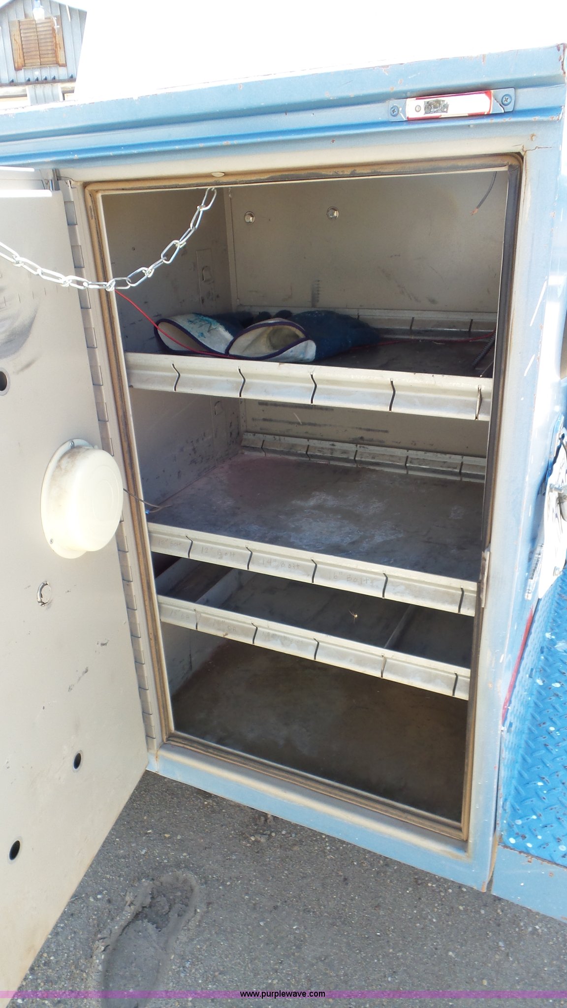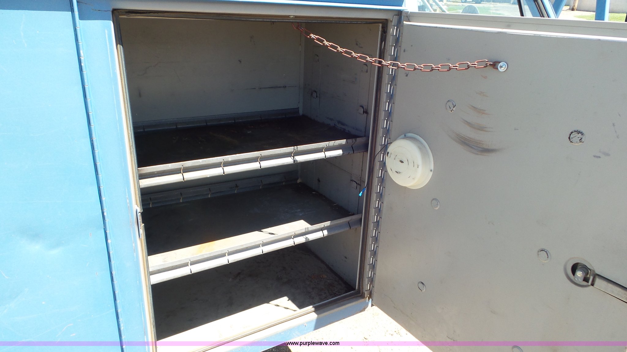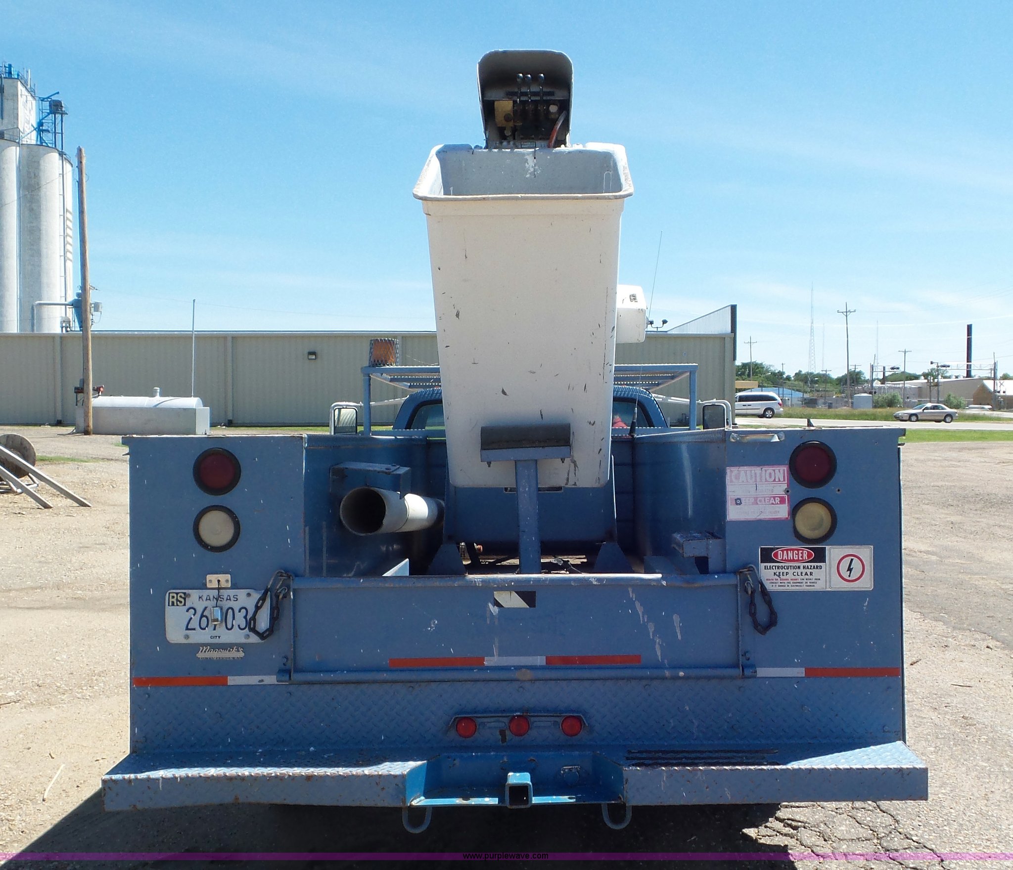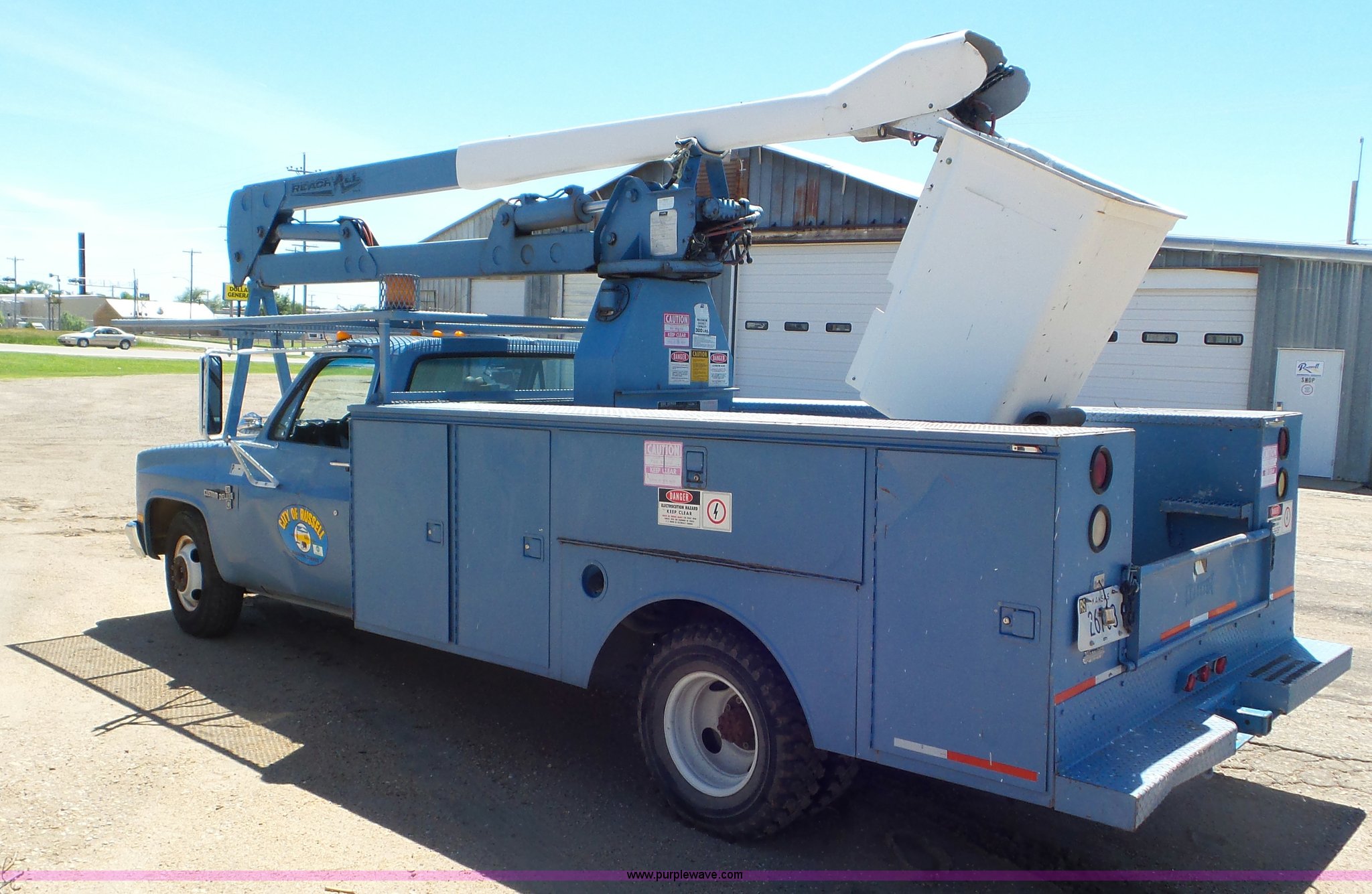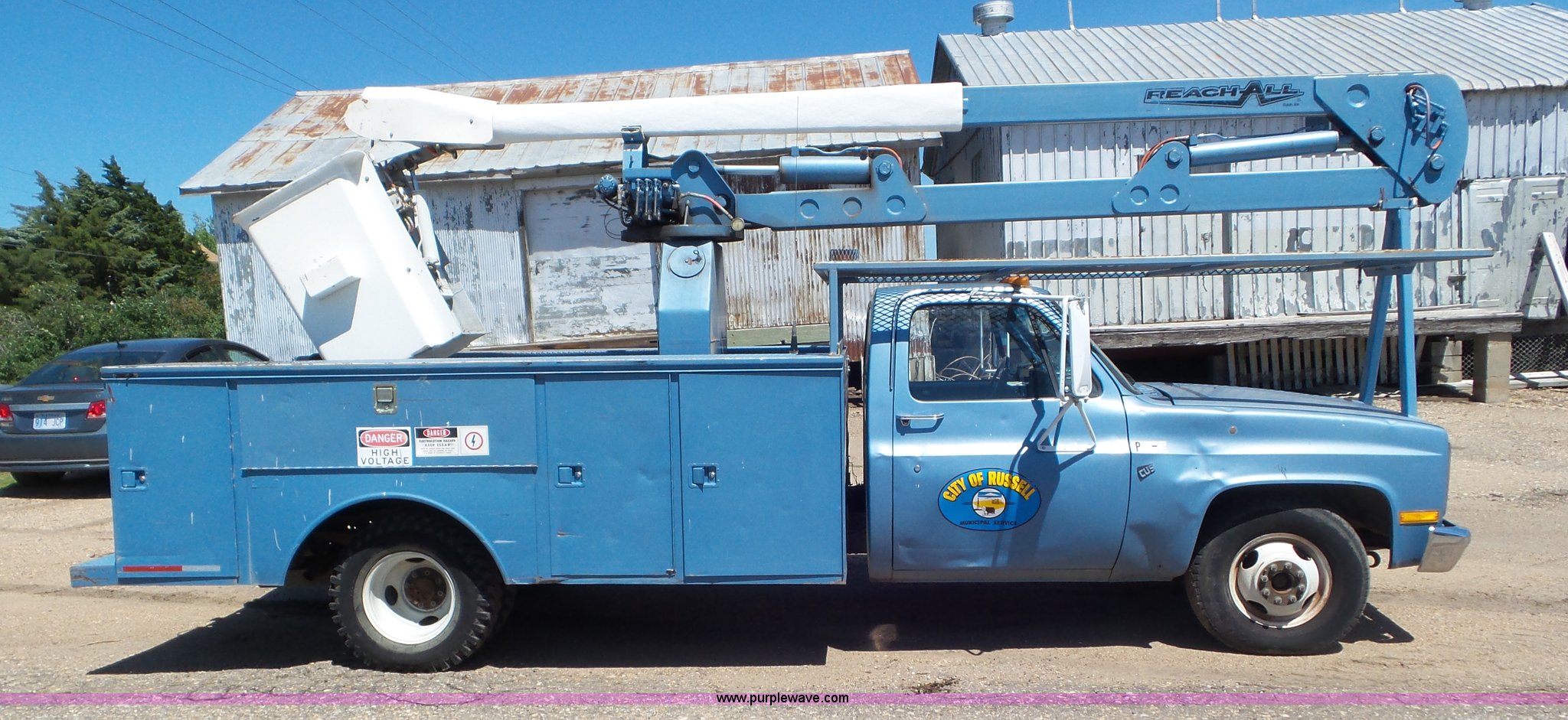 Purple Wave is selling a used Bucket Truck in Kansas. This item is a 1986 Chevrolet C30 bucket truck with the following: 23,127 miles on odometer, 5.7L V8 OHV gas engine, Three speed manual transmission, Heat, Manual windows and locks, Vinyl interior, Front tow hooks, PTO, Knapheide utility bed, 11'L x 89"W, Reach-All 5000 boom, Ground and bucket controls, Non-operational bucket tilt, 300 lbs capacity, 32' max lift,, 235/85R16 tires, Boom manual