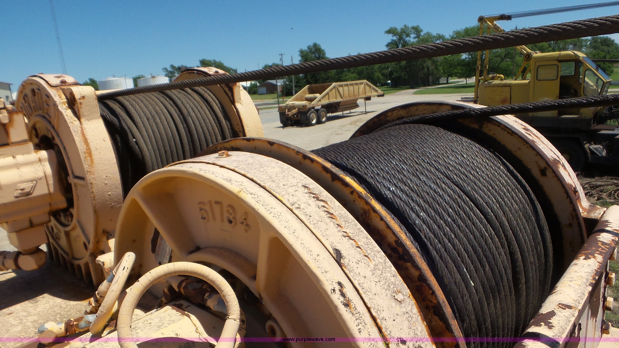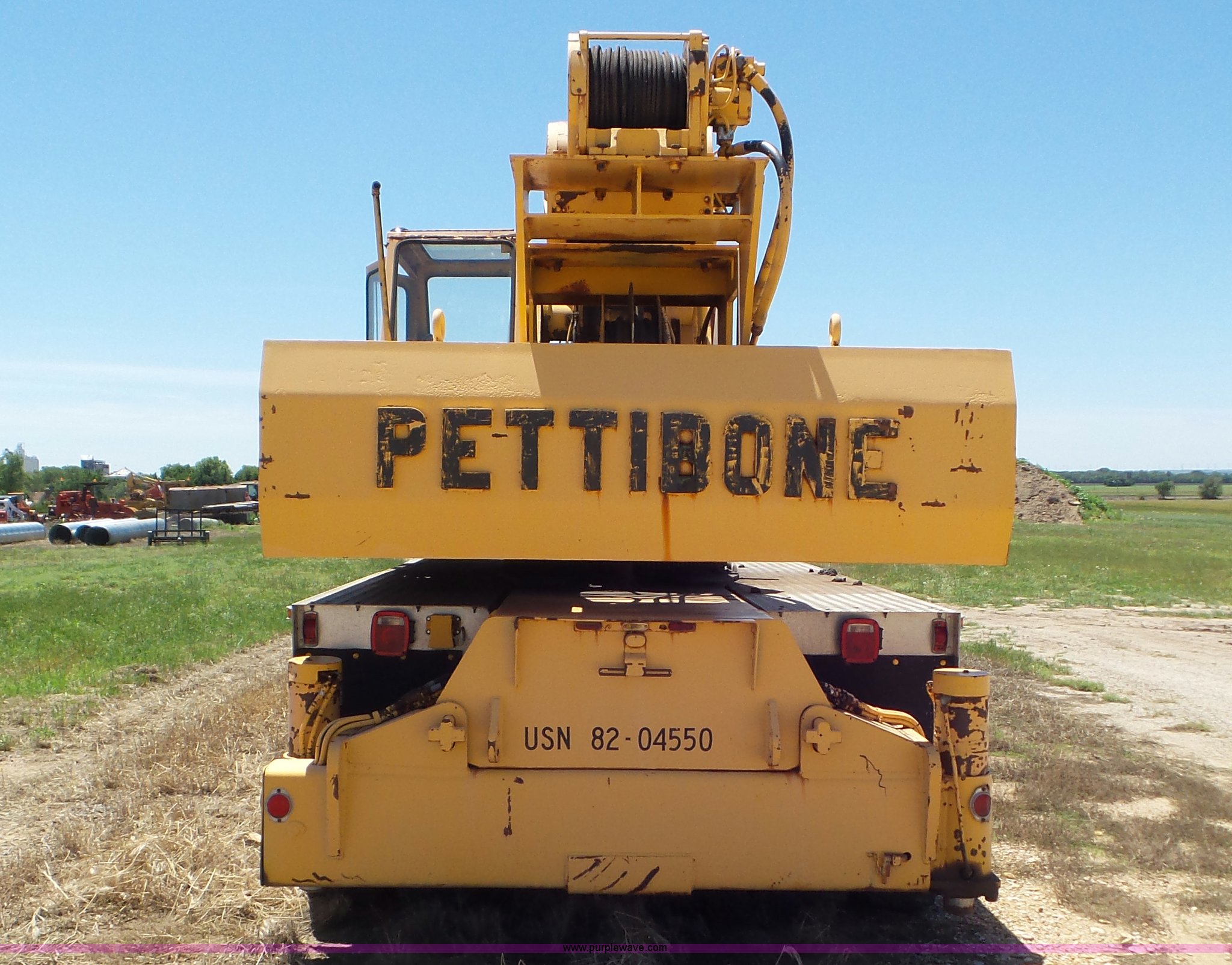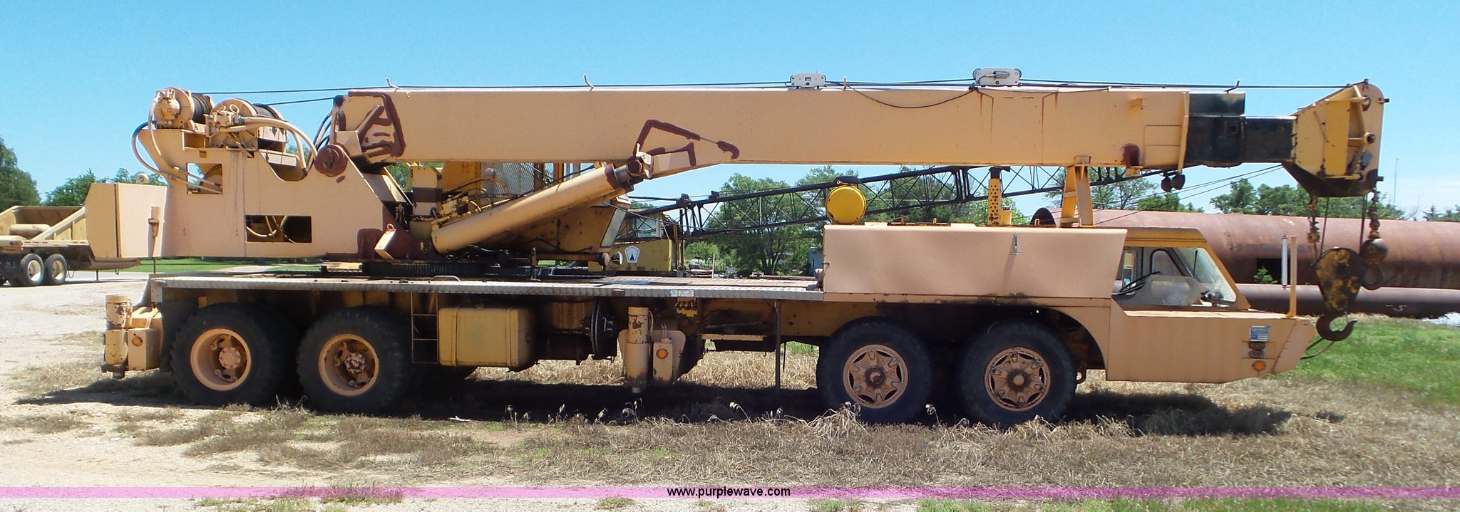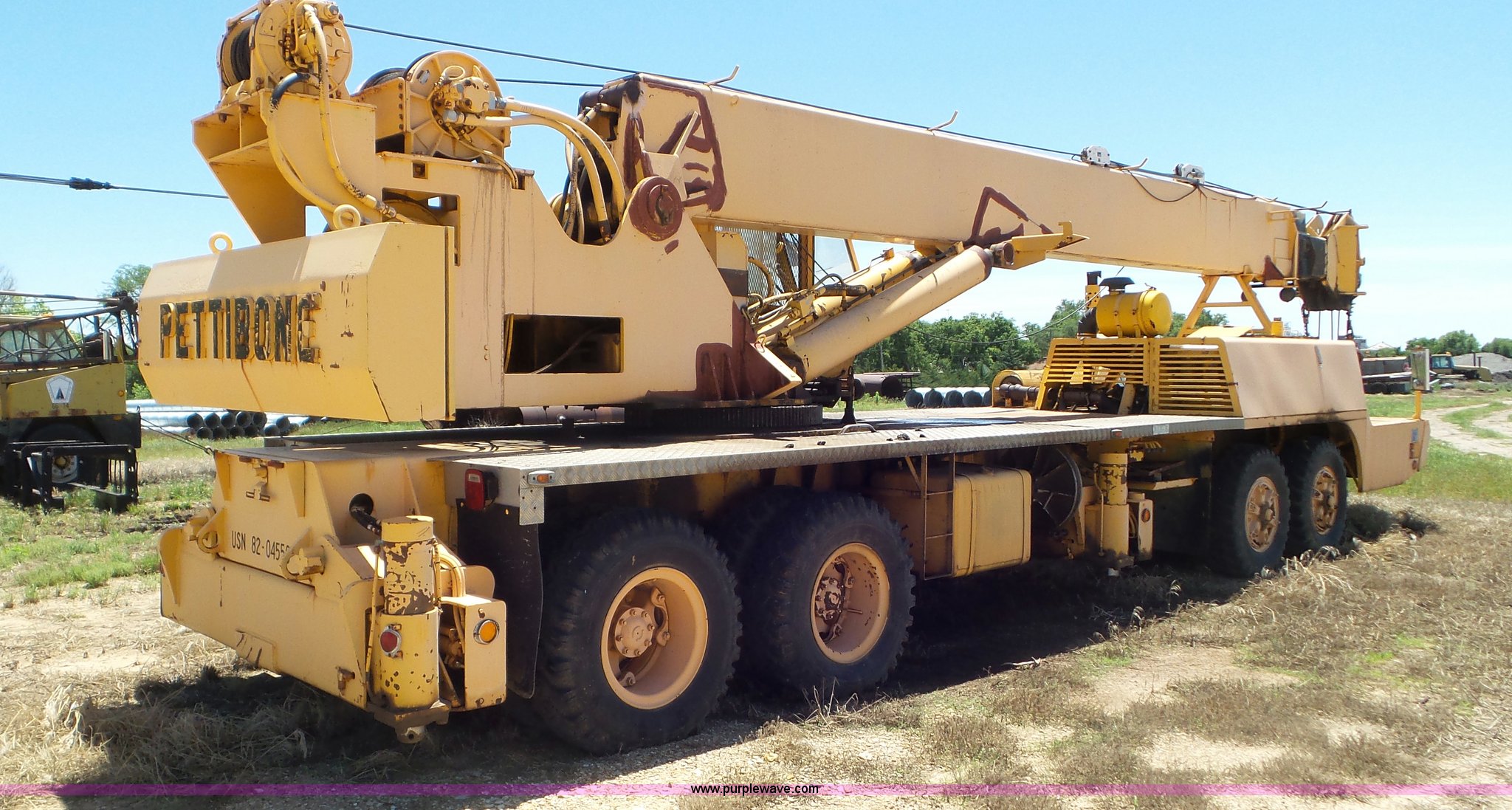 Purple Wave is selling a used Truck Crane in Kansas. This item is a 1979 Pettibone 8430 LS truck crane with the following: 2,730 miles on odometer, 240 hours on meter, Detroit Diesel six cylinder diesel engine, Lower interior, Suspension seat, Stick crane controls, Eaton Fuller RT613 13 speed manual transmission, Tandem axle, Upper interior, Suspension seat, Stick crane controls, Hydraulic telescopic boom, 75' boom length, 30 ton max lift capacity, (2) winches, In-cab boom controls, Crane block, (3) sheaves, 30 ton capacity, Crane ball and hook, (4) stabilizers, Spring suspension, Air brakes, 274" wheelbase, 11.00-26 tires, Glass broken, Serial 1166