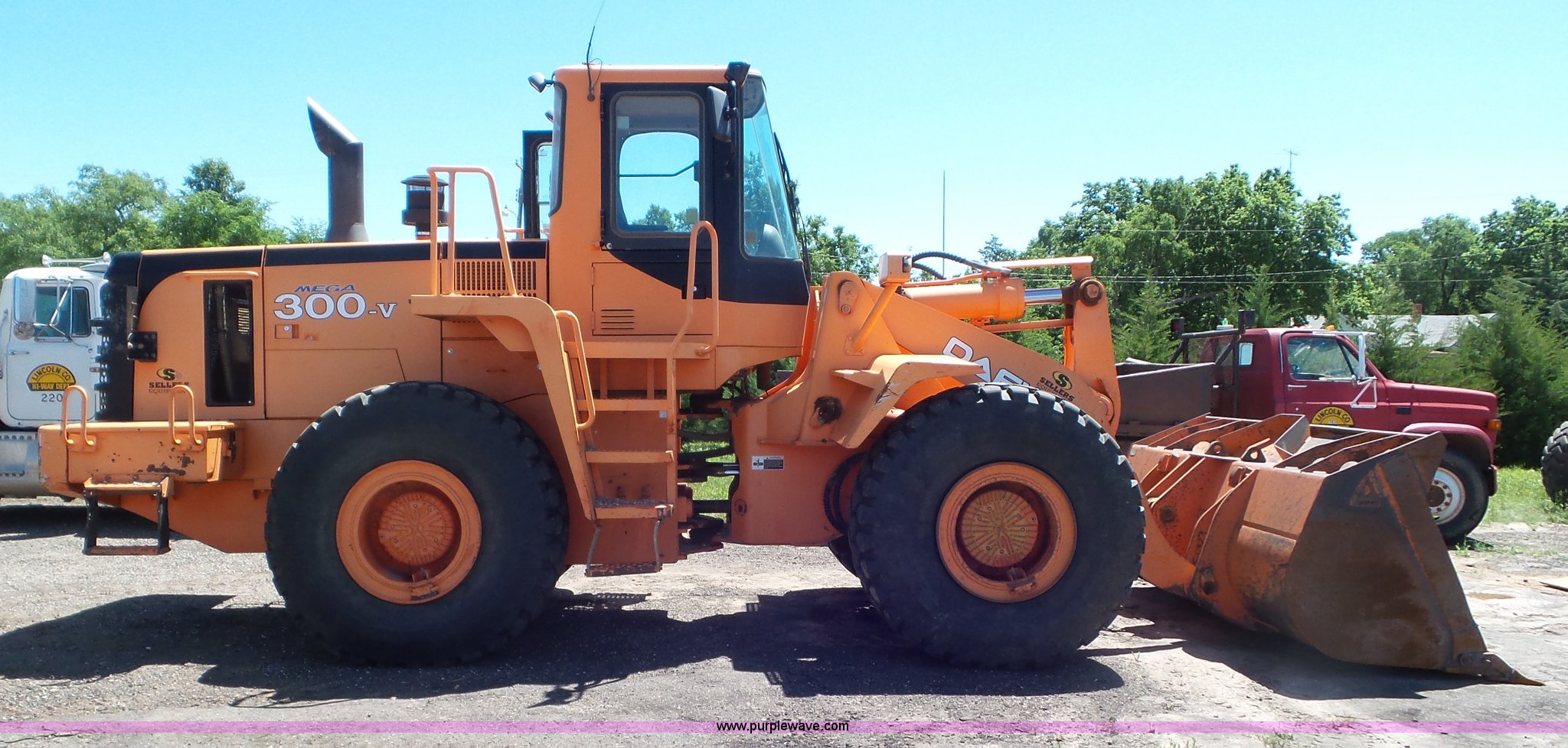 Daewoo MG300V wheel loader. 8,086 hours on meter, Six cylinder turbo diesel engine, Powershift transmission 3F-3R gears, Differential lock, Enclosed cab AC and heat, Tilt steering wheel, AM/FM, Air suspension seat, Joystick bucket controls, Wipers, Backup alarm, Front and rear work lights, Dymax 114"W bucket Bolt-on cutting edge, (8) teeth, 23.5R25 tires, Manuals, Serial 2030. Lincoln County. Lincoln, KS 67455