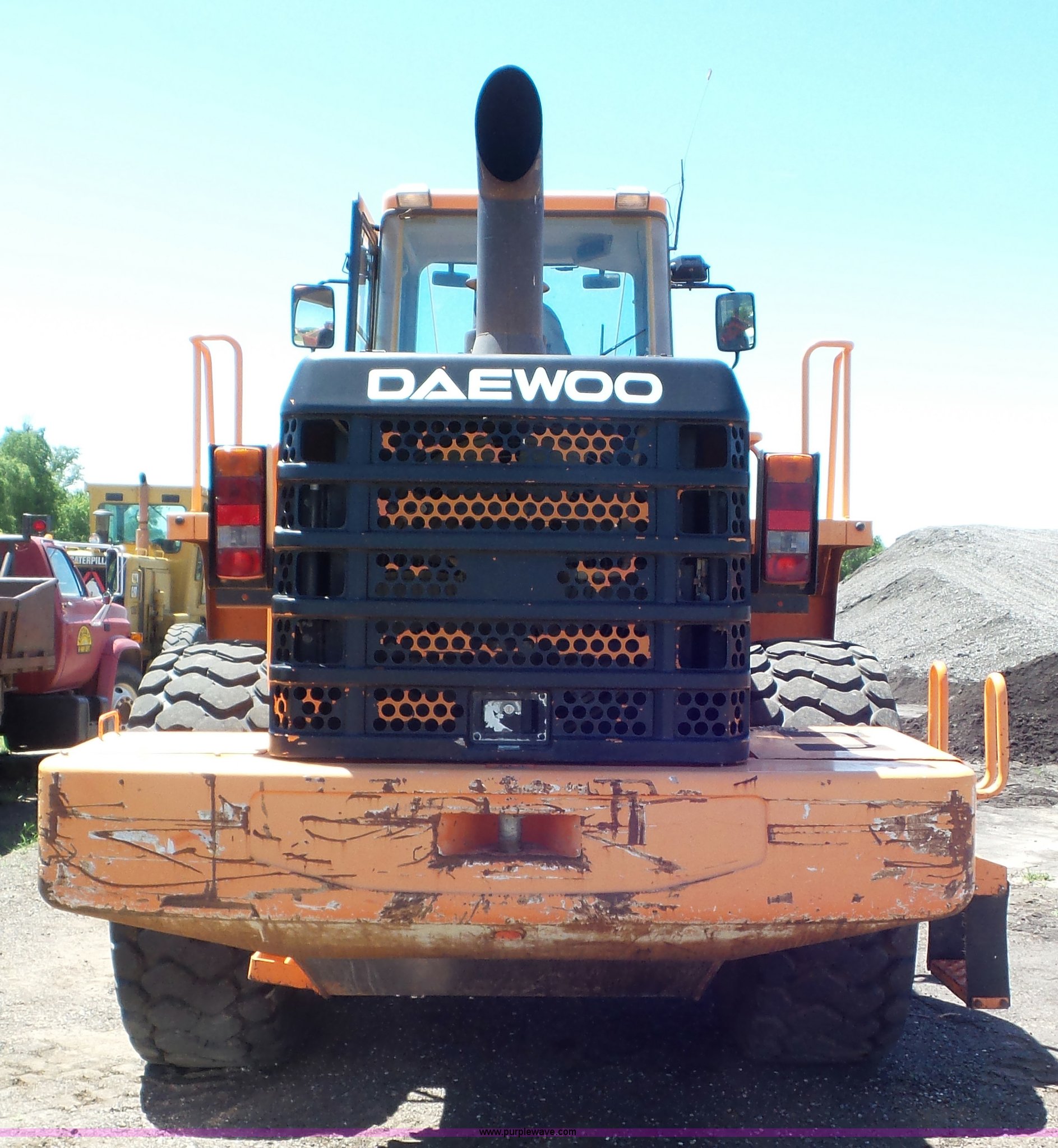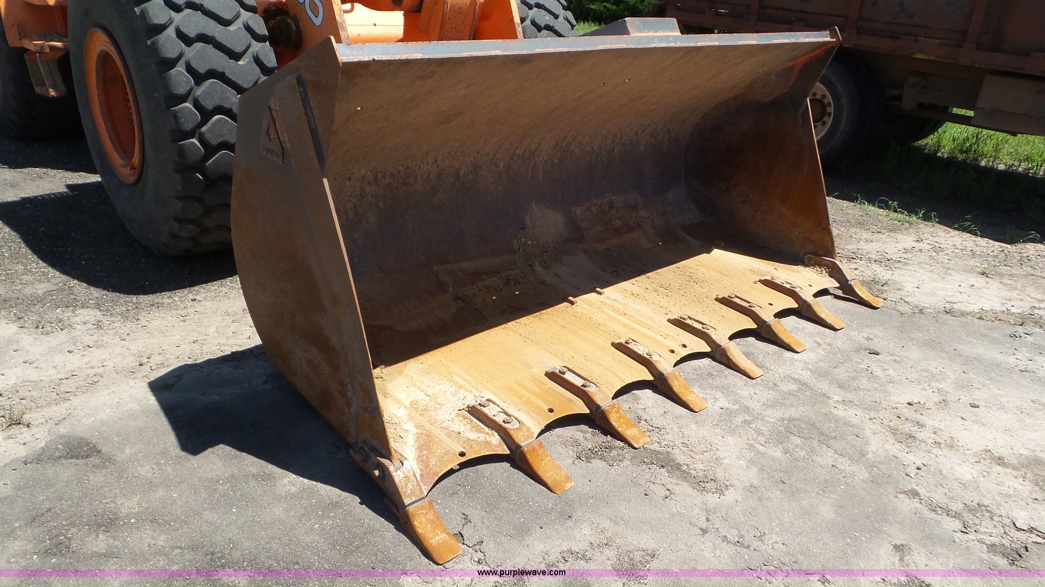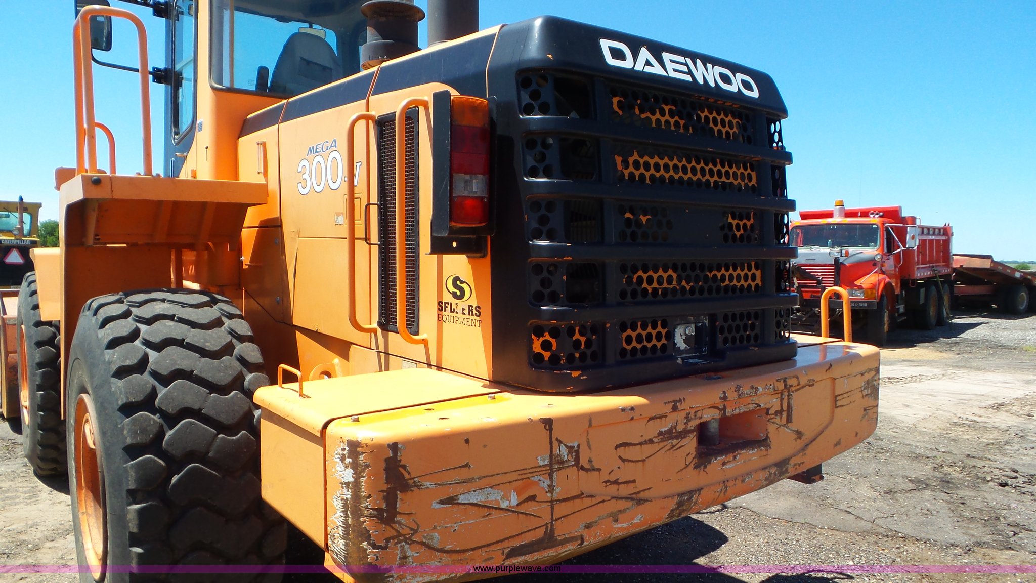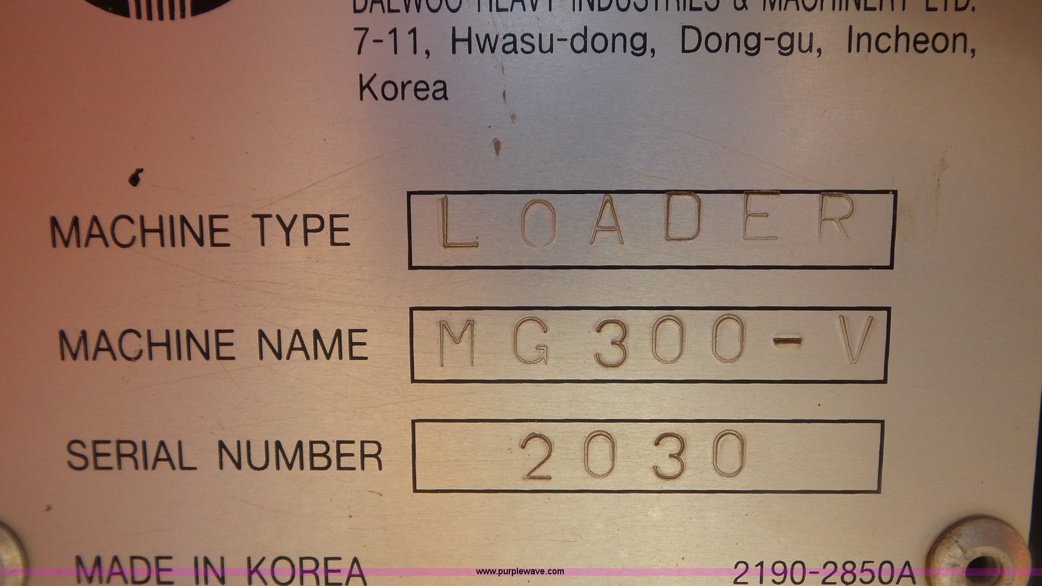 Purple Wave is selling a used Wheel Loader in Kansas. This item is a Daewoo MG300V wheel loader with the following: 8,086 hours on meter, Six cylinder turbo diesel engine, Powershift transmission, 3F-3R gears, Differential lock, Enclosed cab, AC and heat, Tilt steering wheel, AM/FM, Air suspension seat, Joystick bucket controls, Wipers, Backup alarm, Front and rear work lights, Dymax 114"W bucket, Bolt-on cutting edge, (8) teeth, 23.5R25 tires, Manuals, Serial 2030