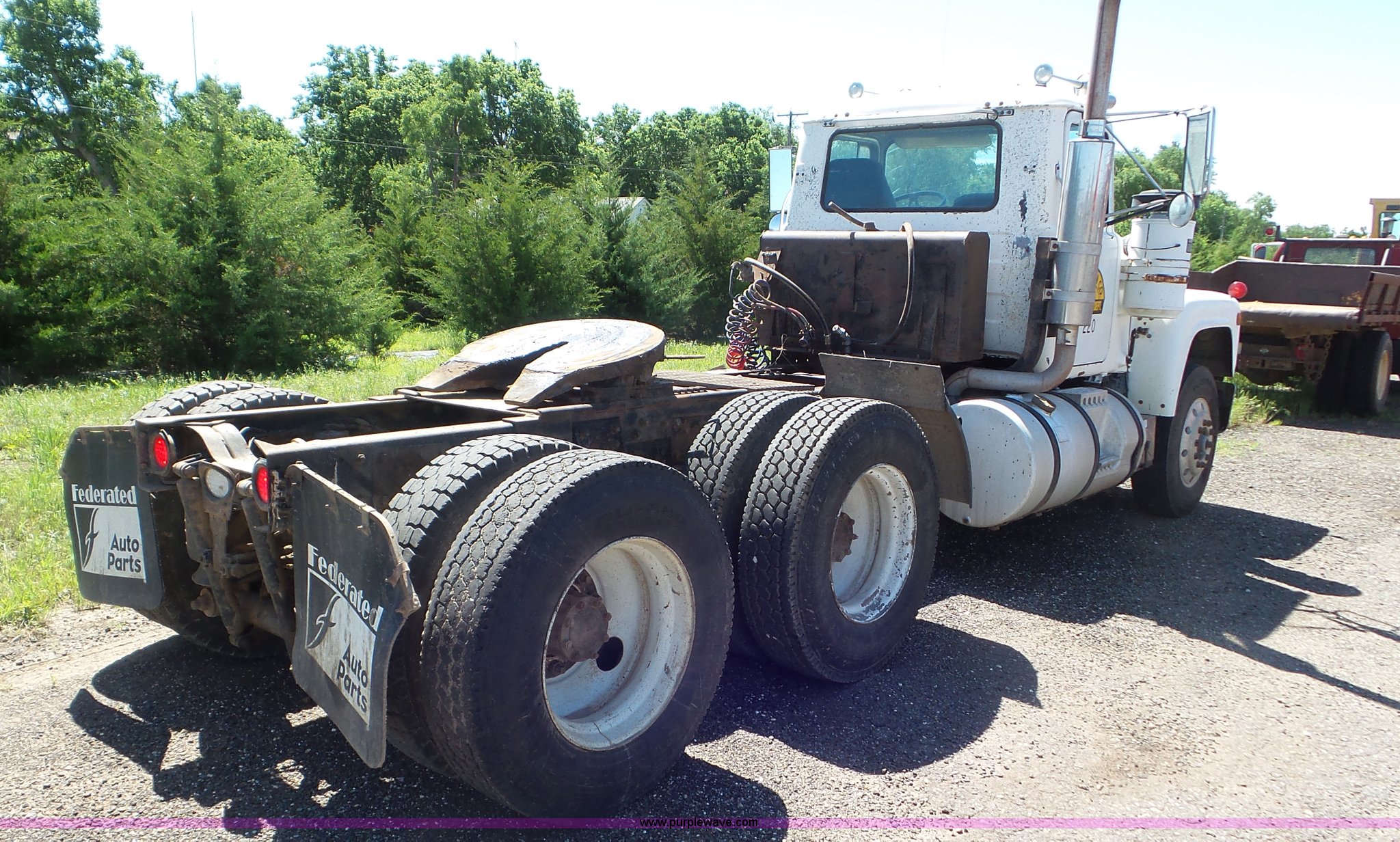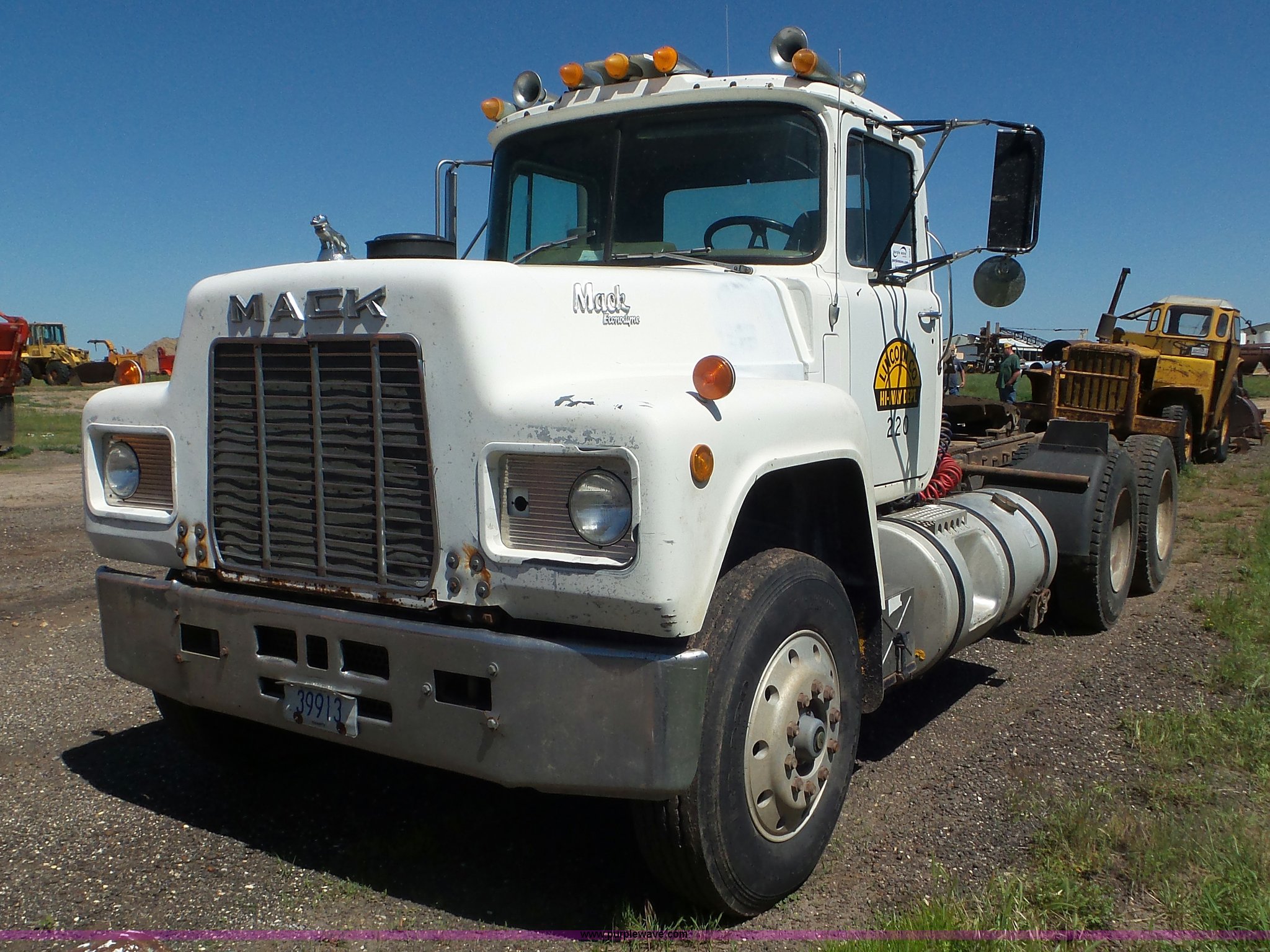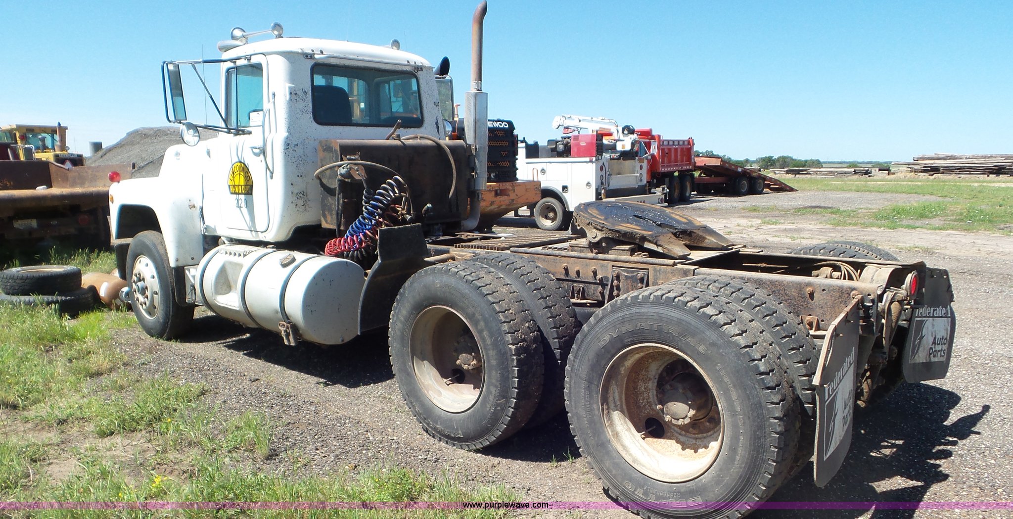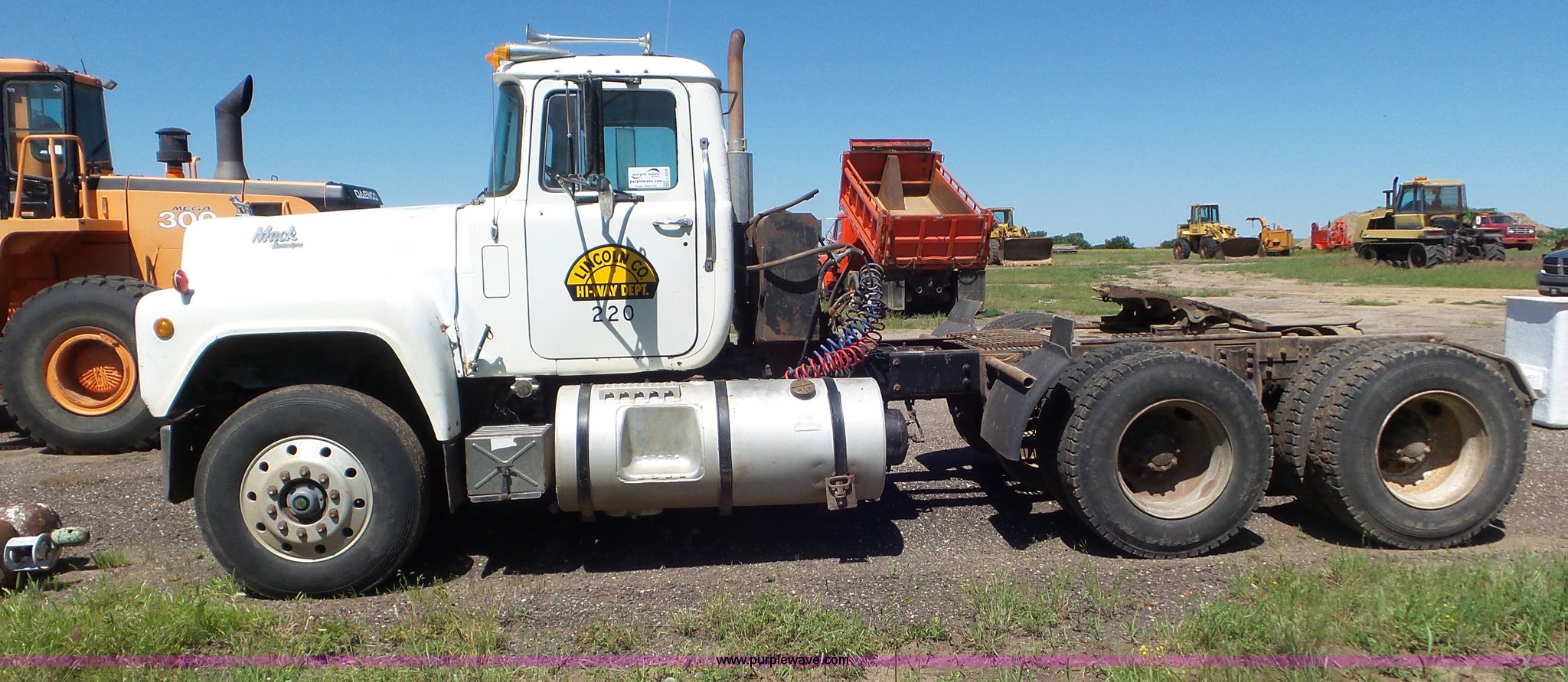 Purple Wave is selling a used Truck Tractor in Kansas. This item is a 1986 Mack R688ST semi truck with the following: 44,364 miles on odometer, Actual mileage unknown, 3,190 hours on meter, Odometer and hour meter have been replacede, Mack 11.0L six cylinder turbo diesel engine, Nine speed manual transmission, Tandem axle, Heat, AM/FM, Air suspension seat, Heated mirrors, Brake controller, PTO, Wet kit, Front tow hooks, Single rear exhaust stack, Sliding fifth wheel plate, Chrome bumper, Dual fuel tanks, Air suspension, Air brakes, 169" wheelbase, 11R22.5 tires, Service records available upon request