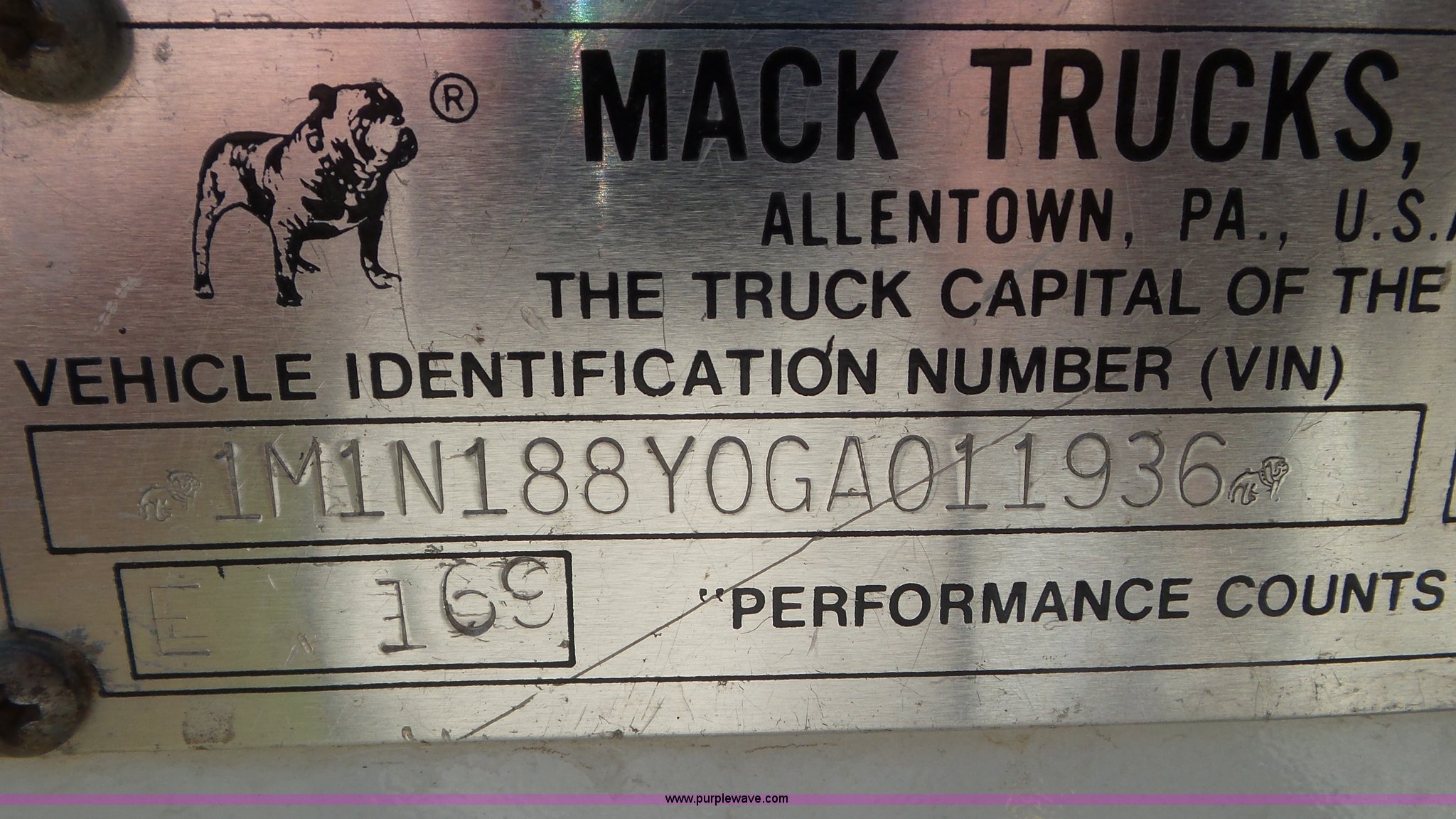 1986 Mack R688ST semi truck. 44,364 miles on odometer Actual mileage unknown, 3,190 hours on meter Odometer and hour meter have been replacede, Mack 11.0L six cylinder turbo diesel engine, Nine speed manual transmission, Tandem axle, Heat, AM/FM, Air suspension seat, Heated mirrors, Brake controller, PTO, Wet kit, Front tow hooks, Single rear exhaust stack, Sliding fifth wheel plate, Chrome bumper, Dual fuel tanks, Air suspension, Air brakes, 169" wheelbase, 11R22.5 tires, Service records available upon request. Kansas title. Seller is a government entity who will be assigning and distributing the title. Please contact the seller for distribution questions. 1M1N188Y0GA011936. Lincoln County. Lincoln, KS 67455